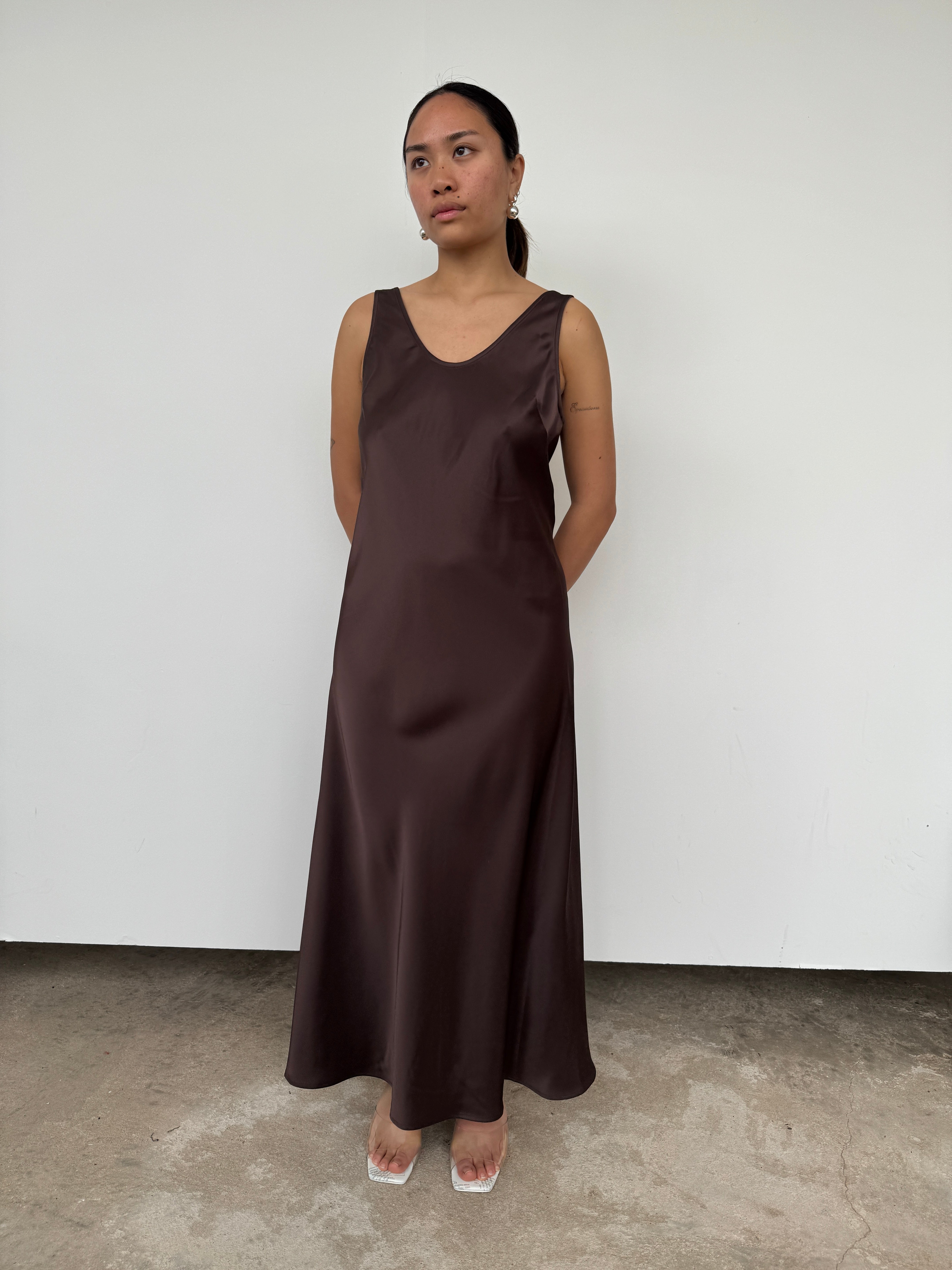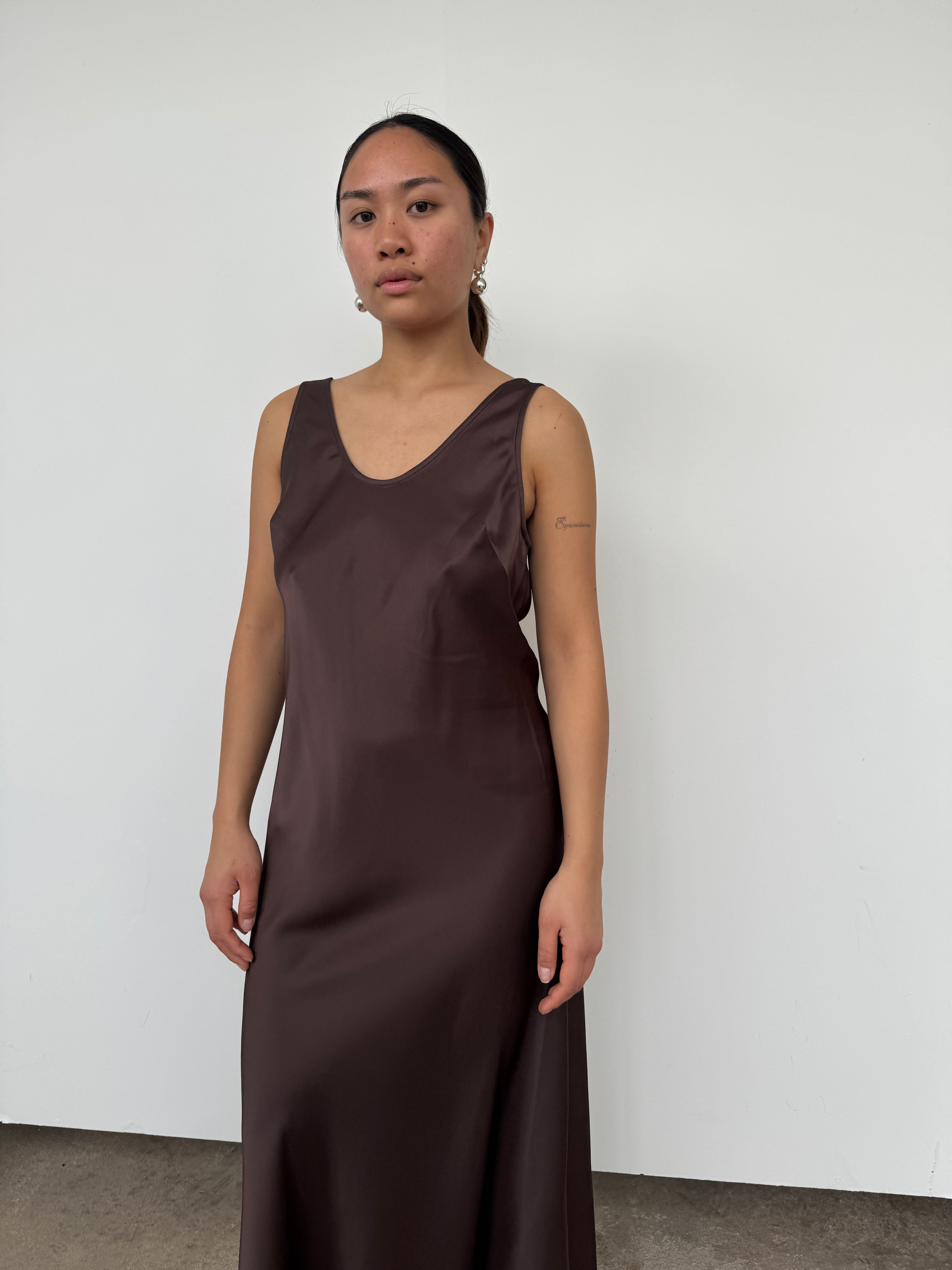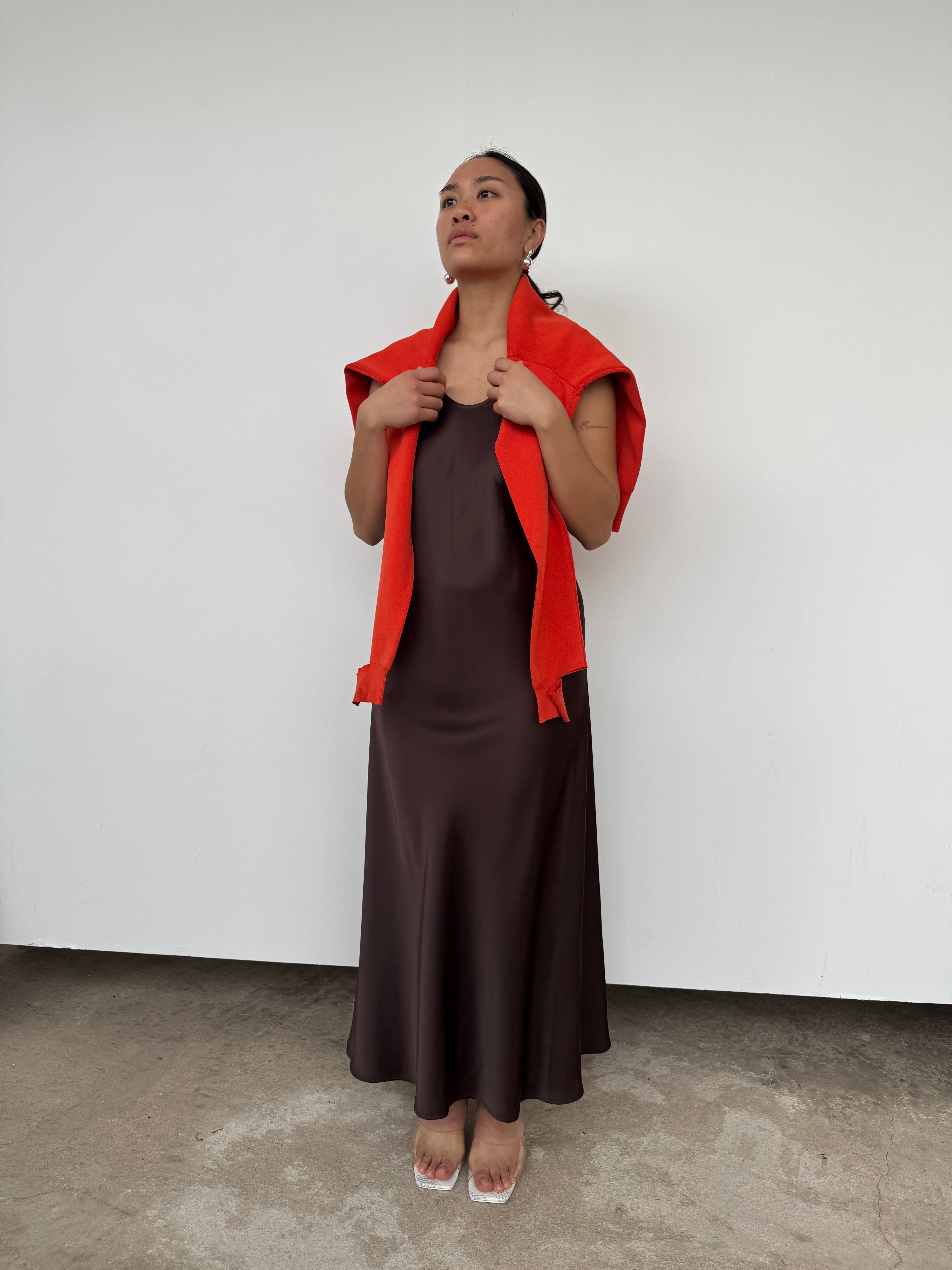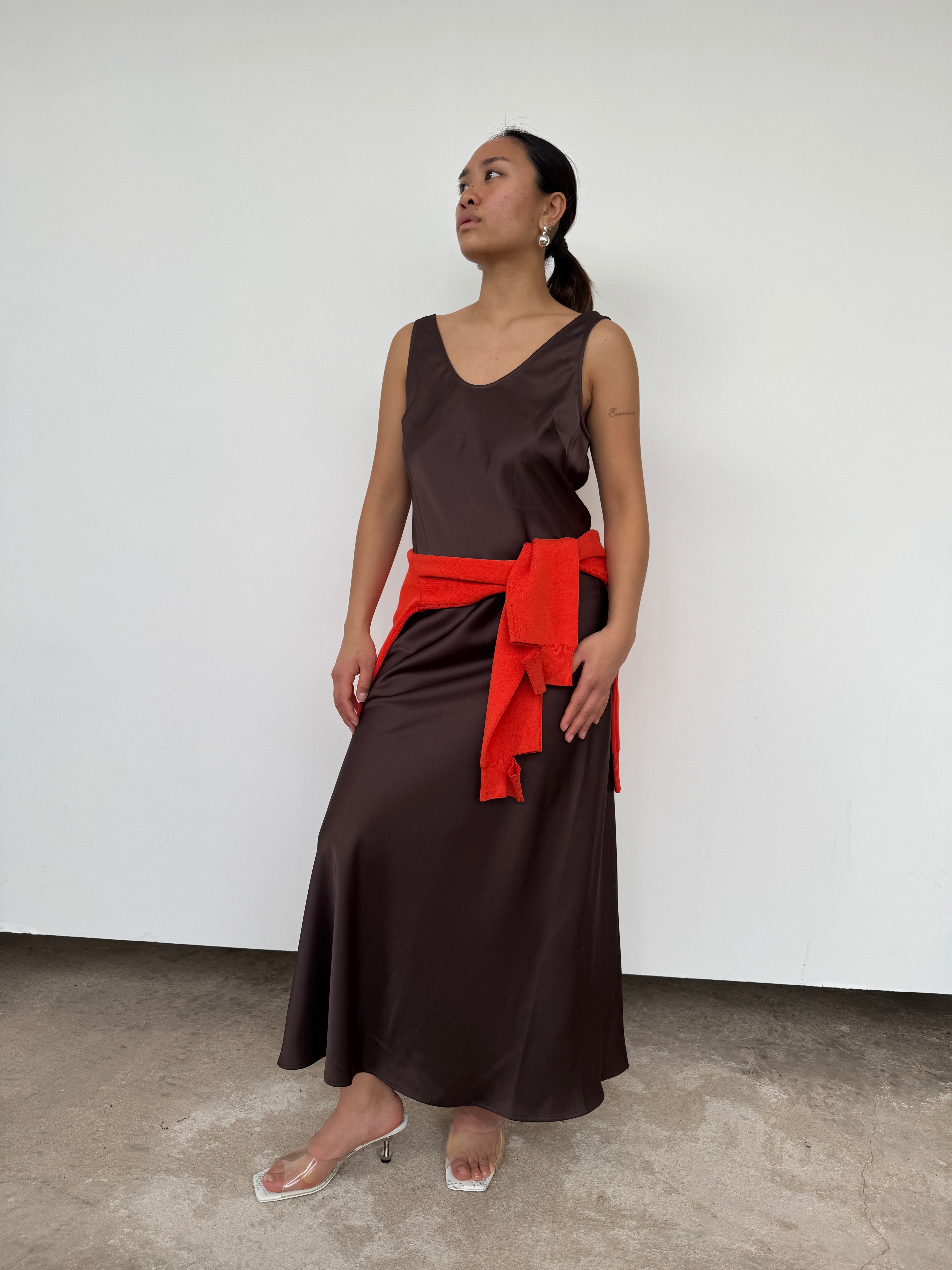 The Esther Dress is a sleek, sleeveless midi dress with a minimalist silhouette, crafted from Japanese triacetate. Ideal for elegant, understated styling.
