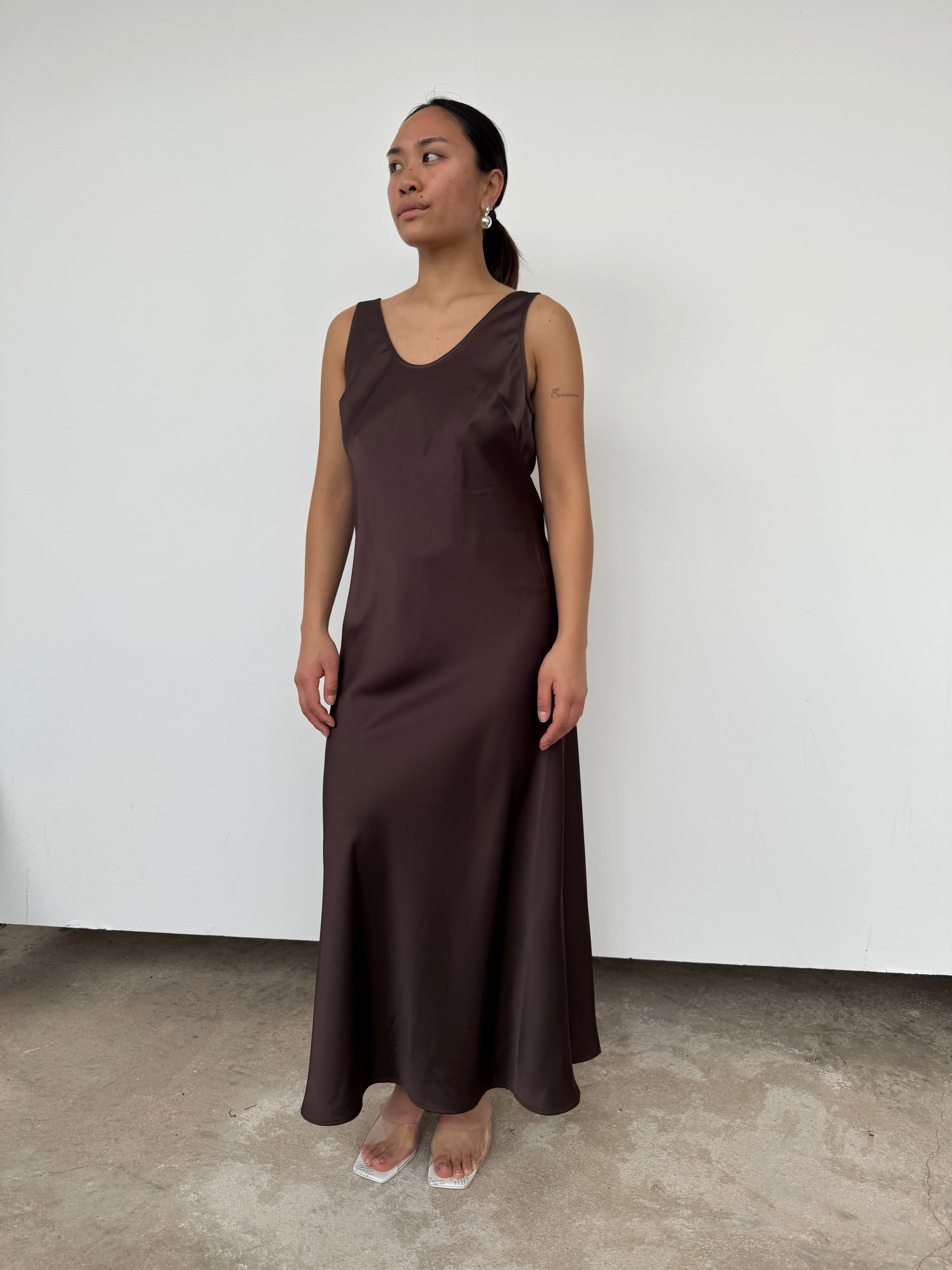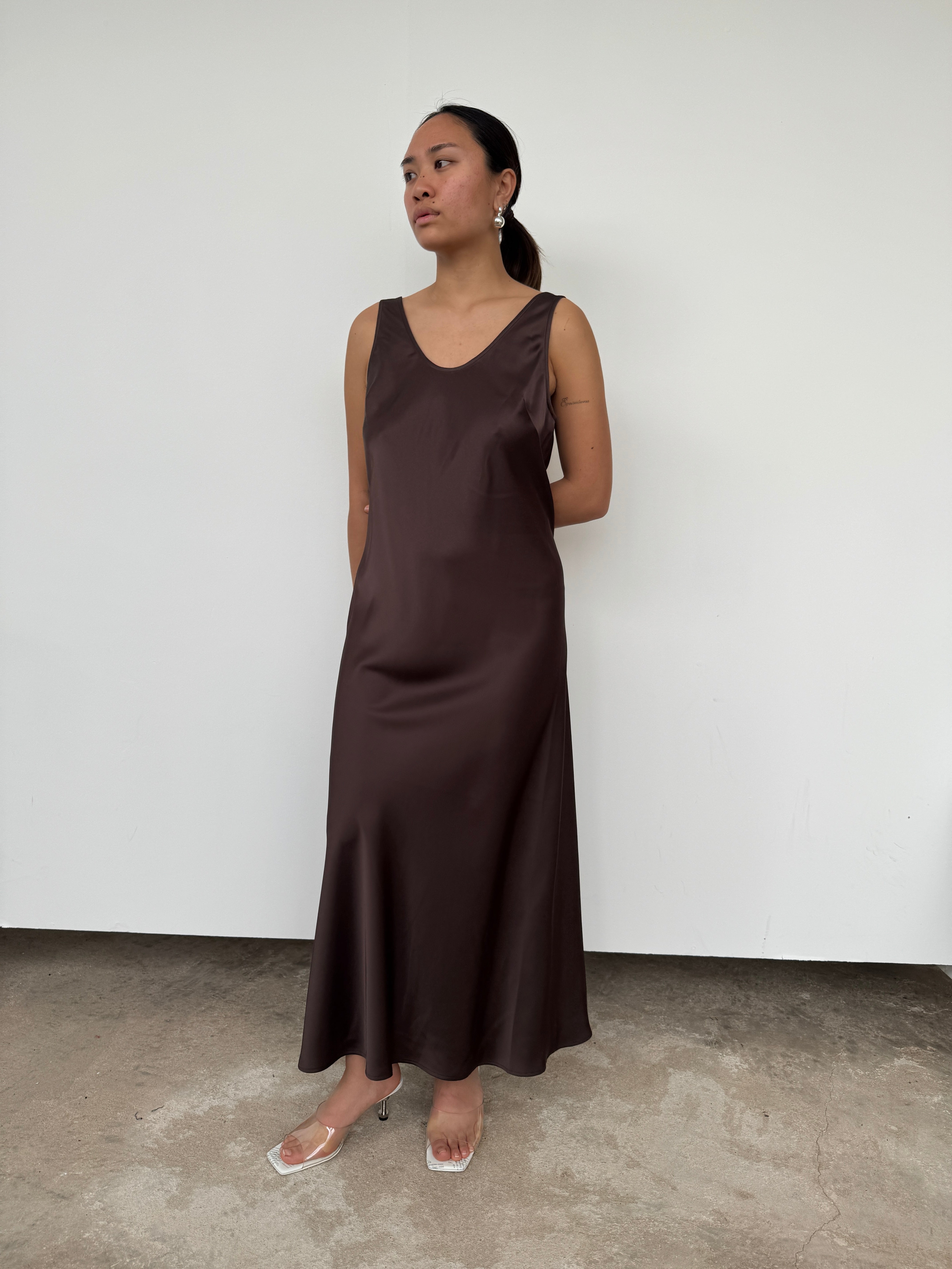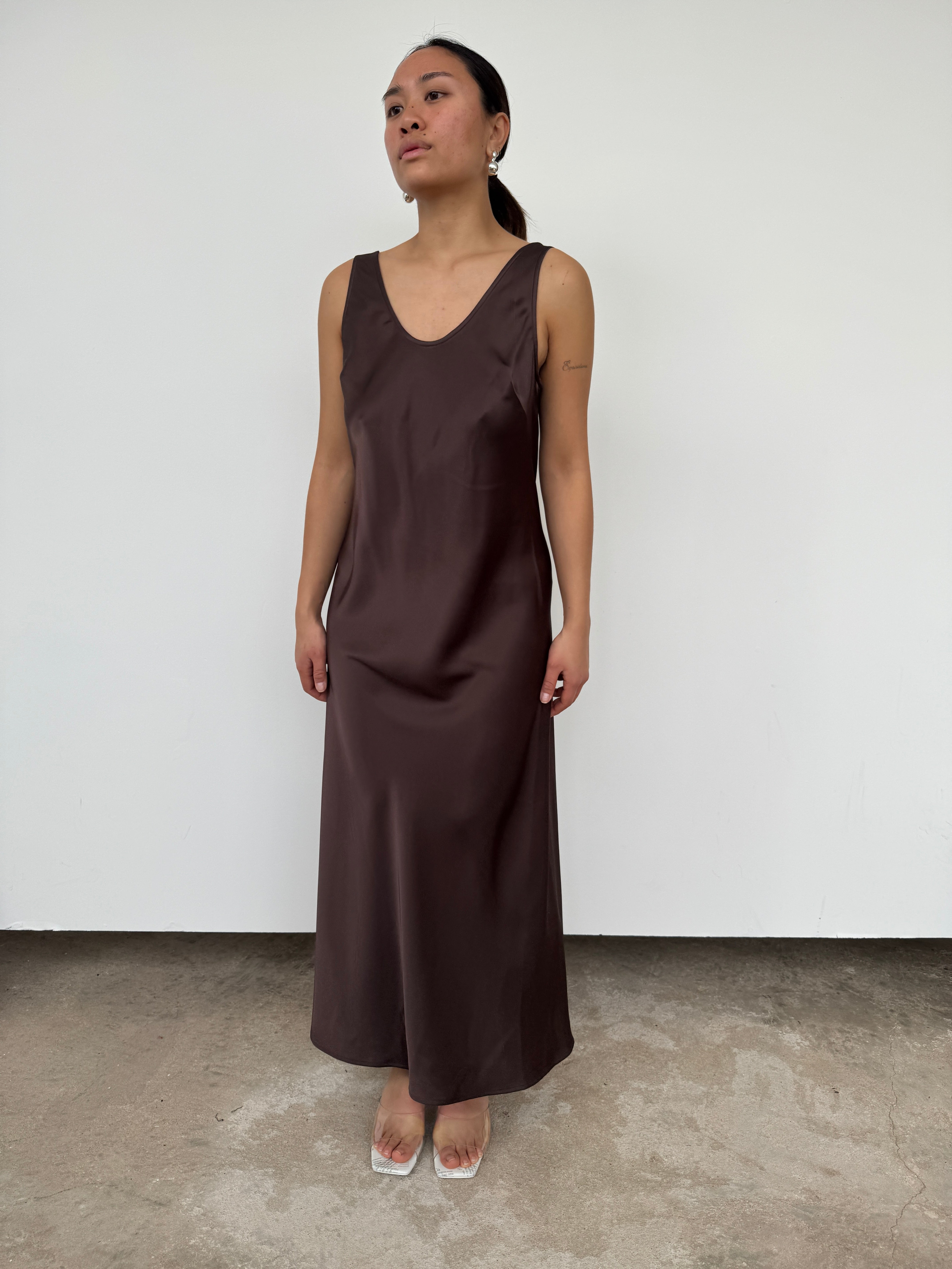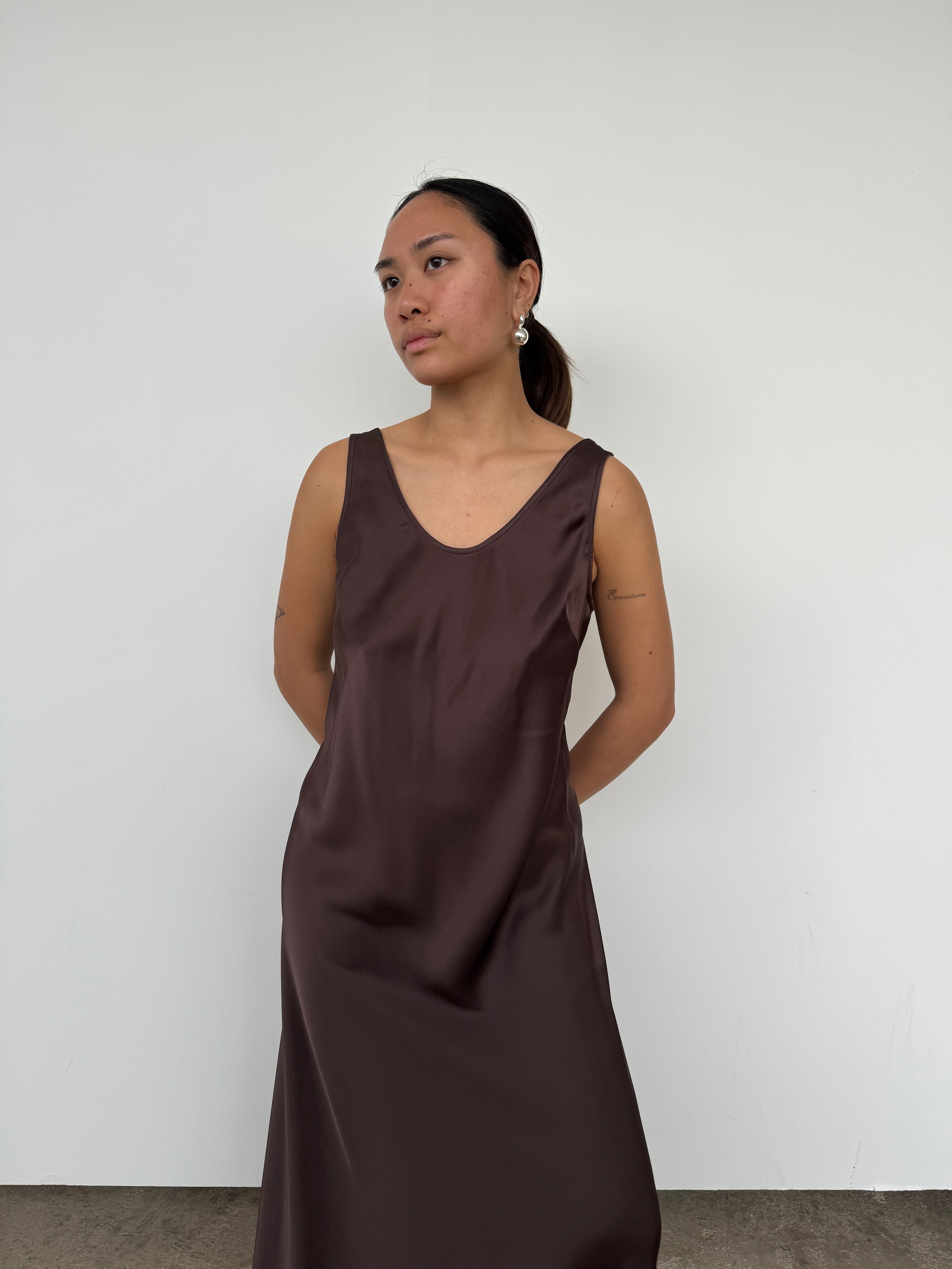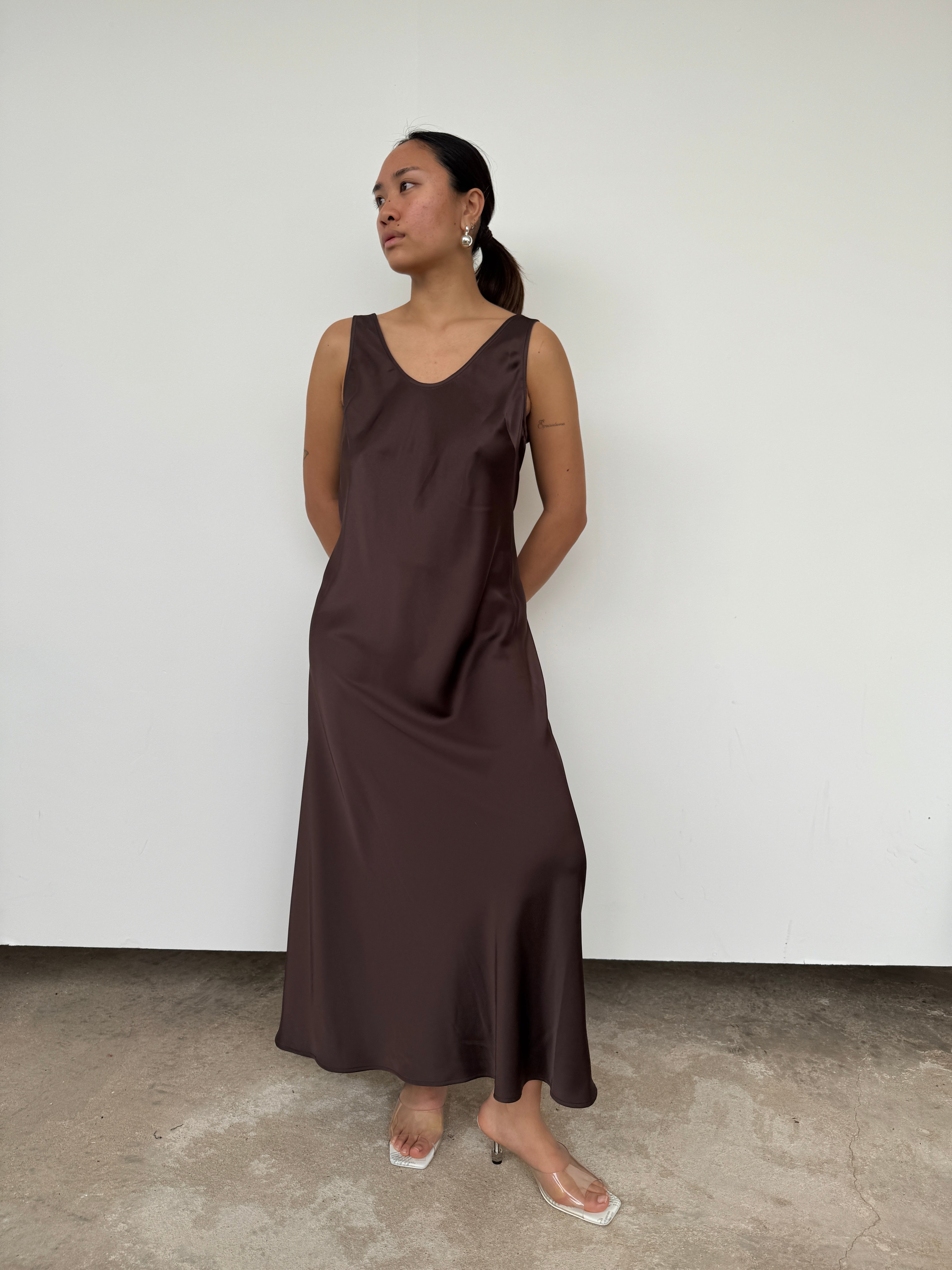 The Esther Dress is a sleek, sleeveless midi dress with a minimalist silhouette, crafted from Japanese triacetate. Ideal for elegant, understated styling.