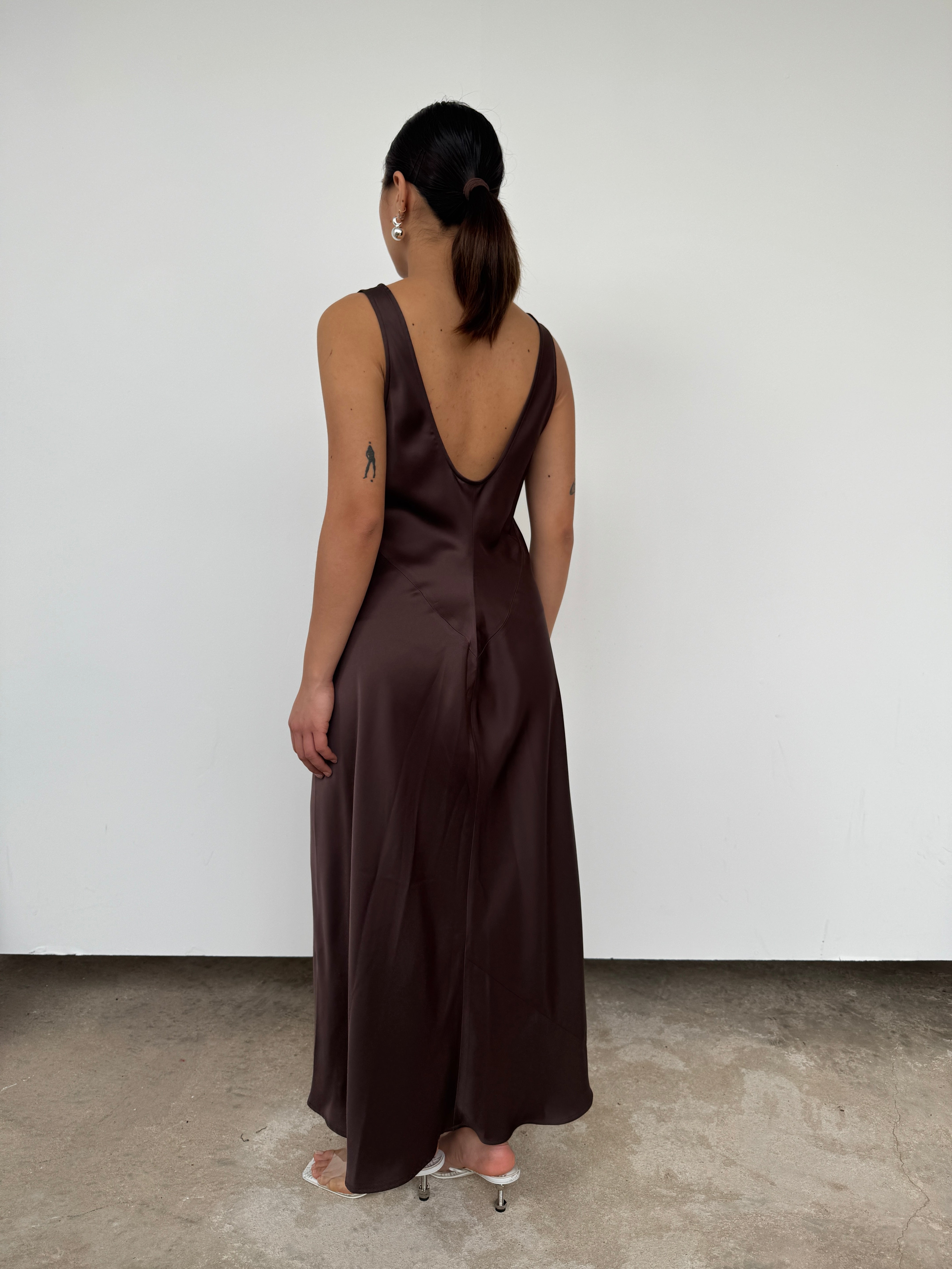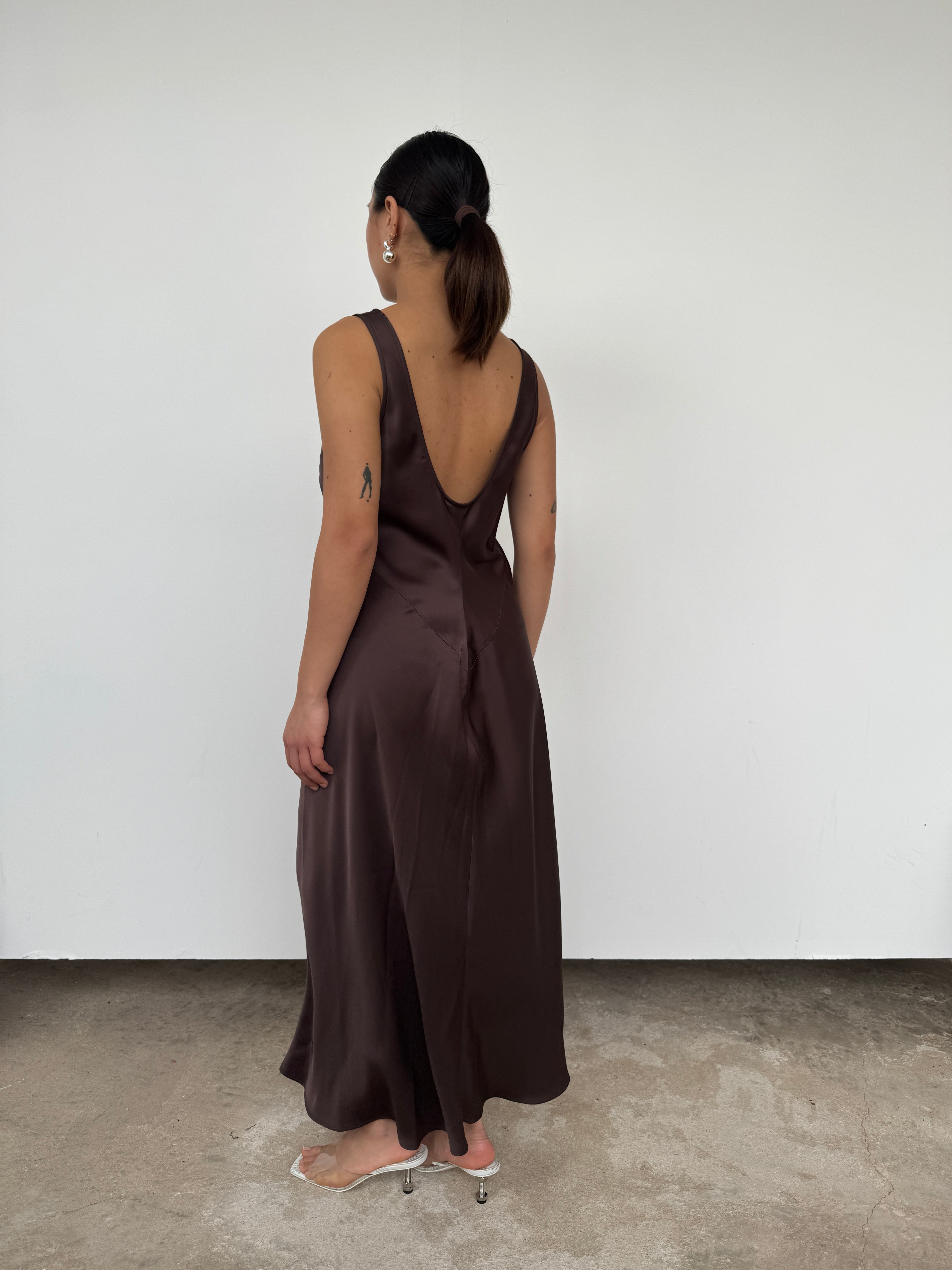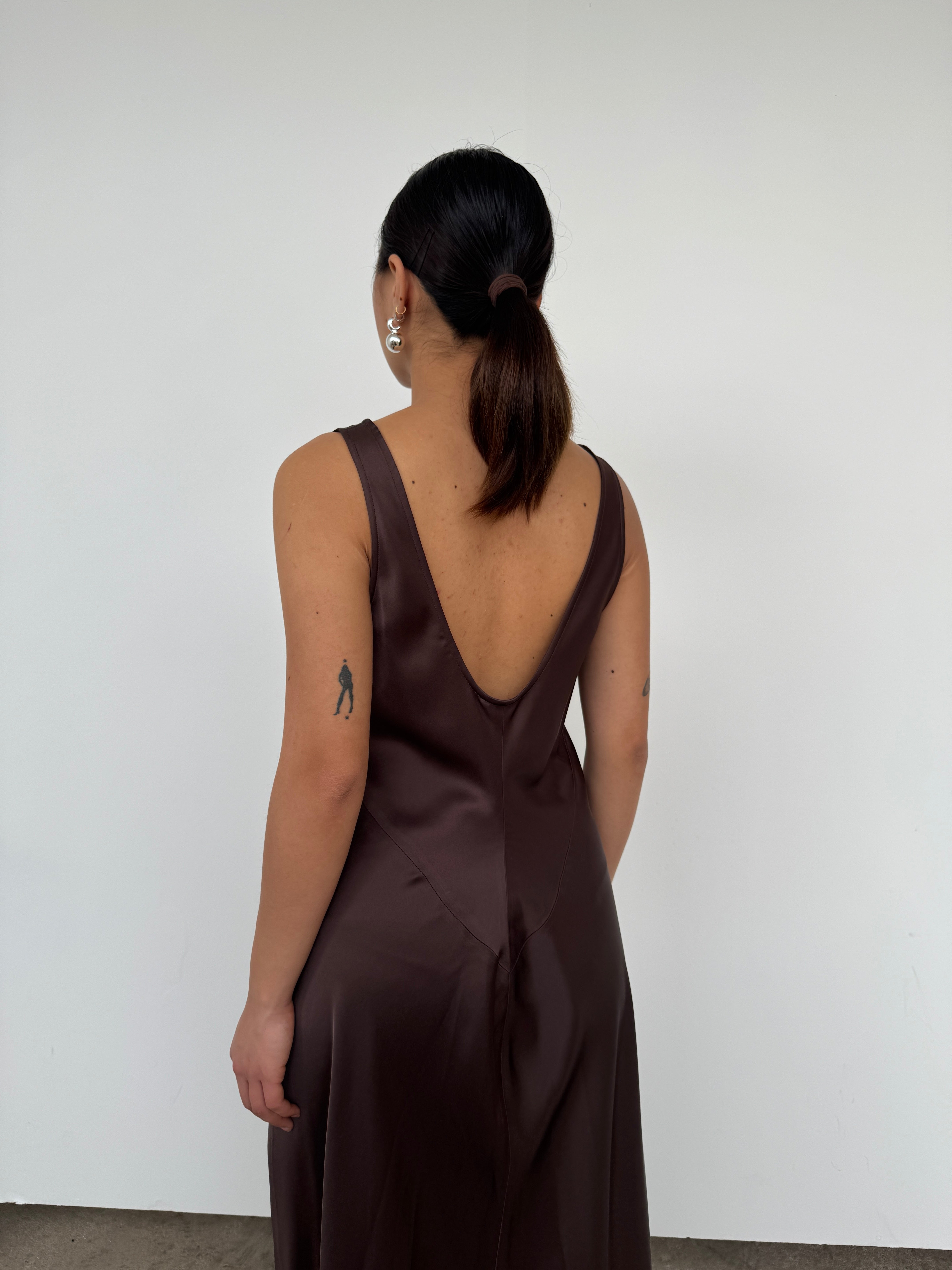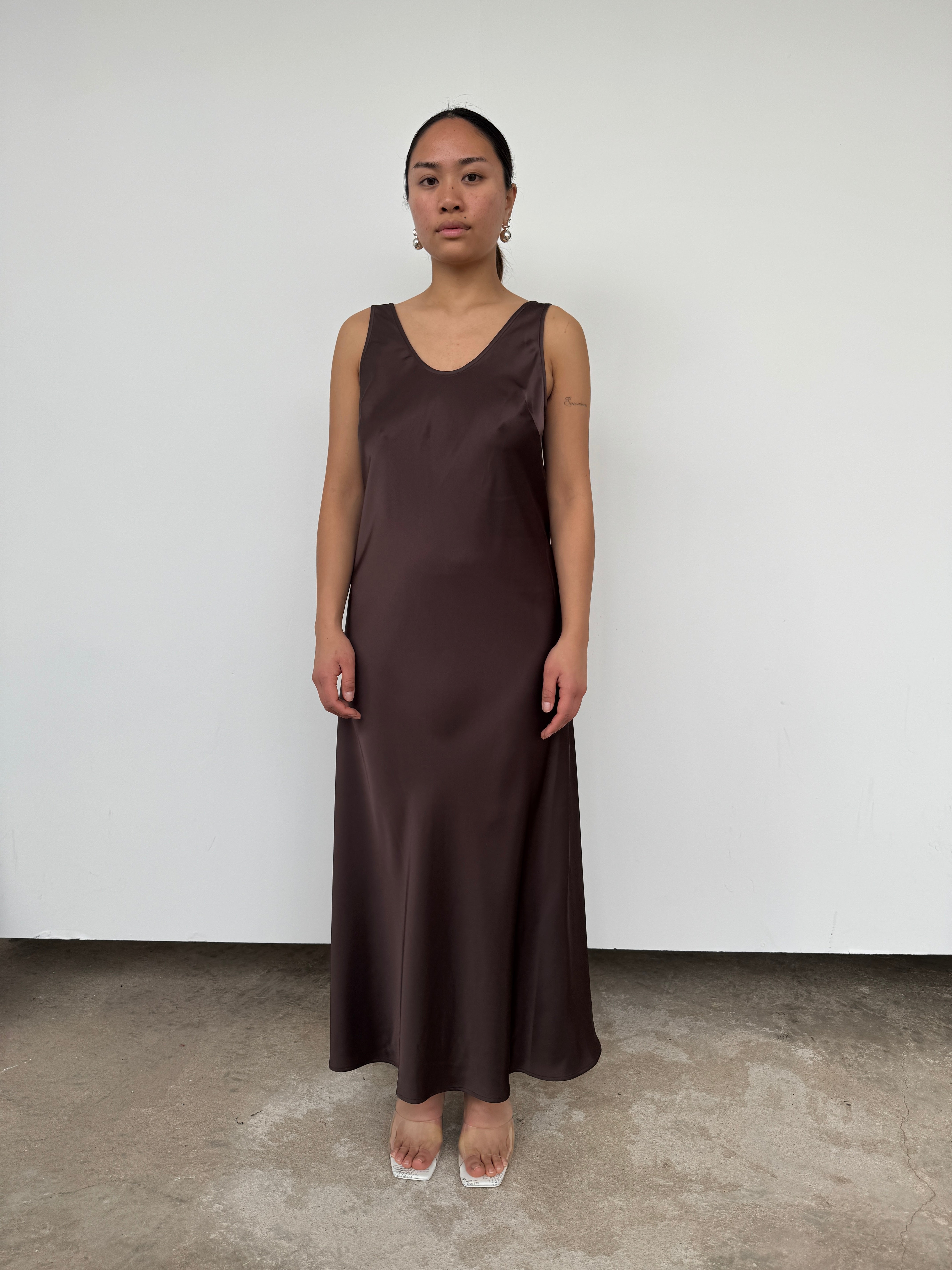 The Esther Dress is a sleek, sleeveless midi dress with a minimalist silhouette, crafted from Japanese triacetate. Ideal for elegant, understated styling.