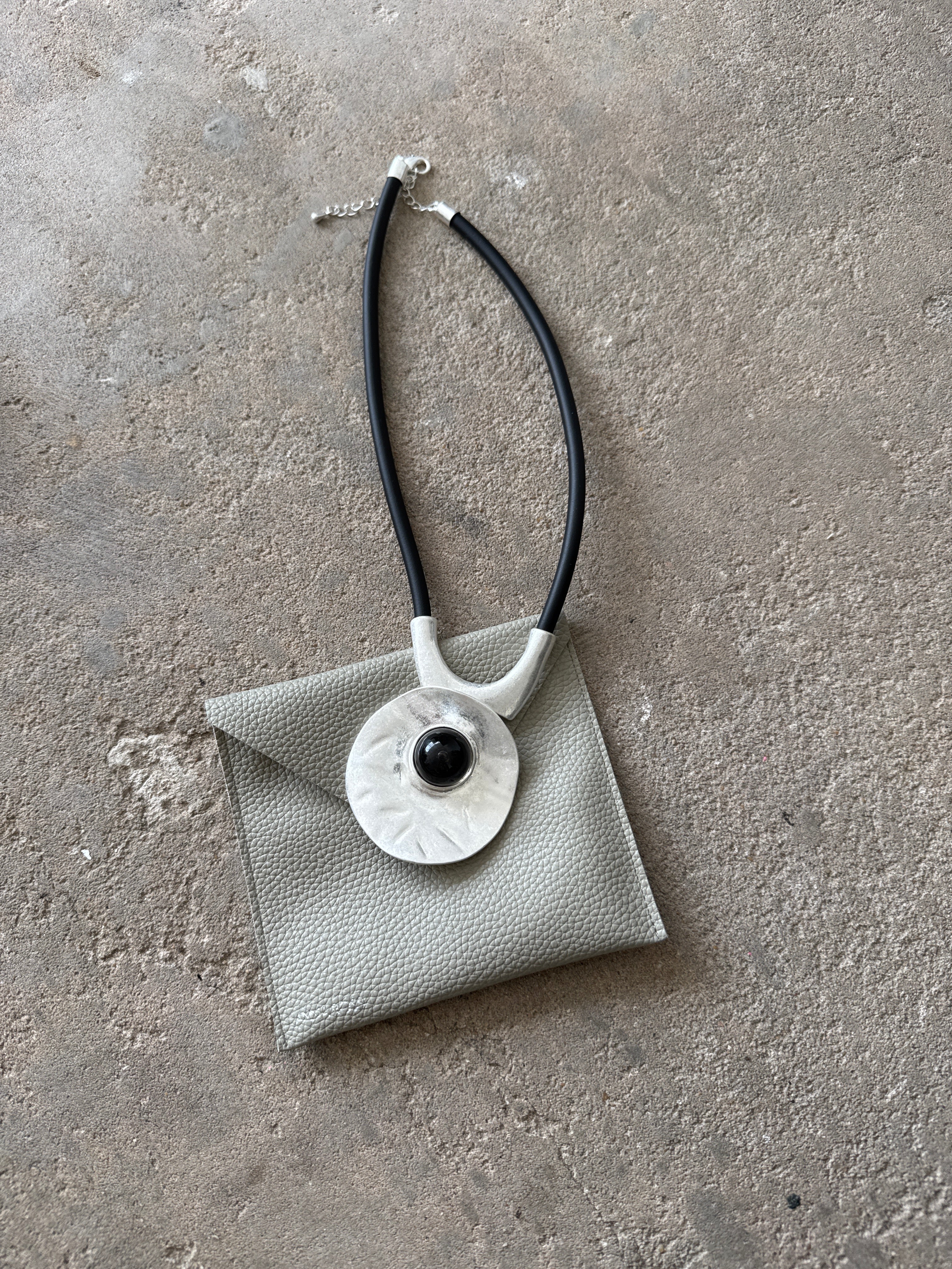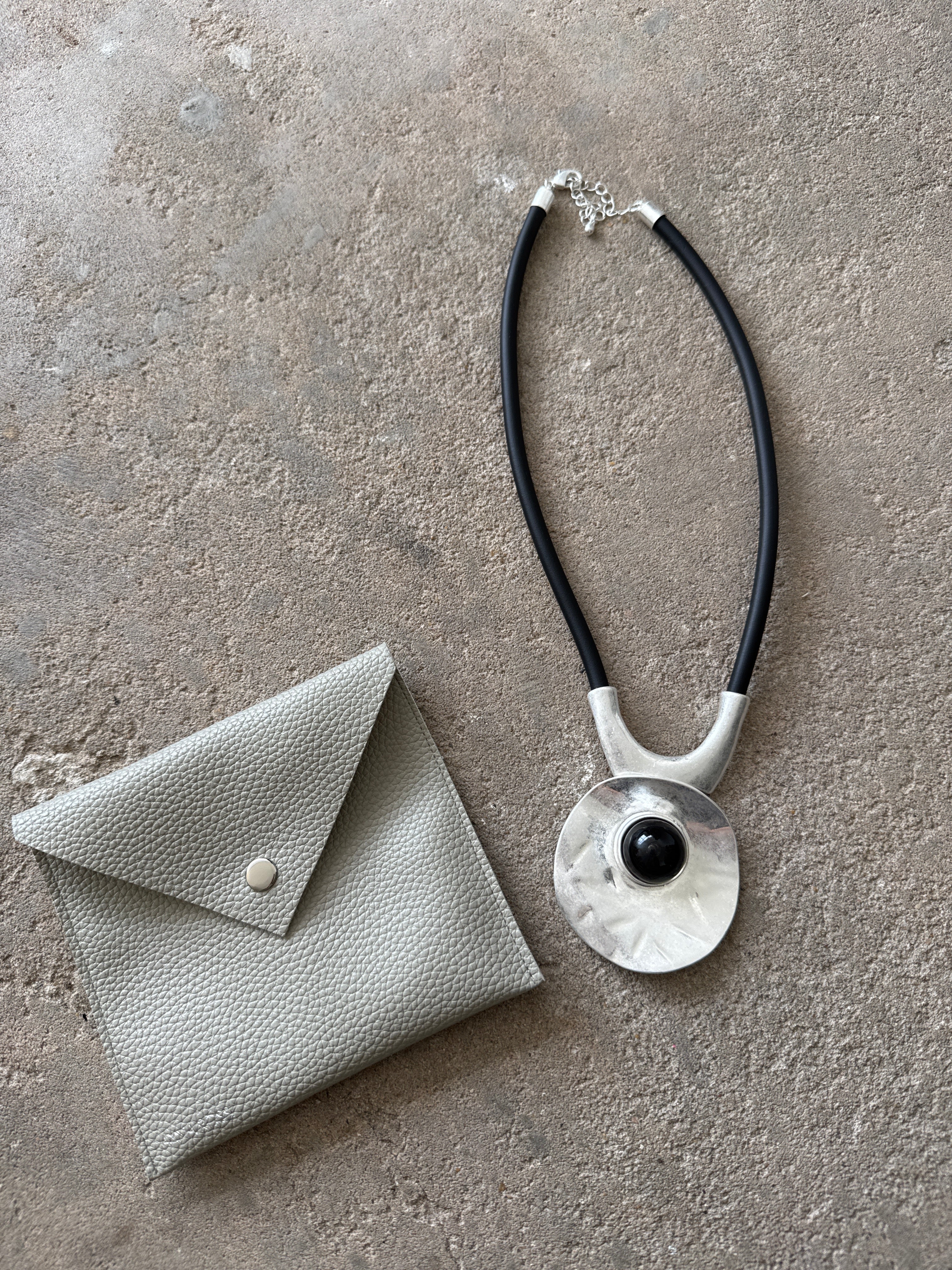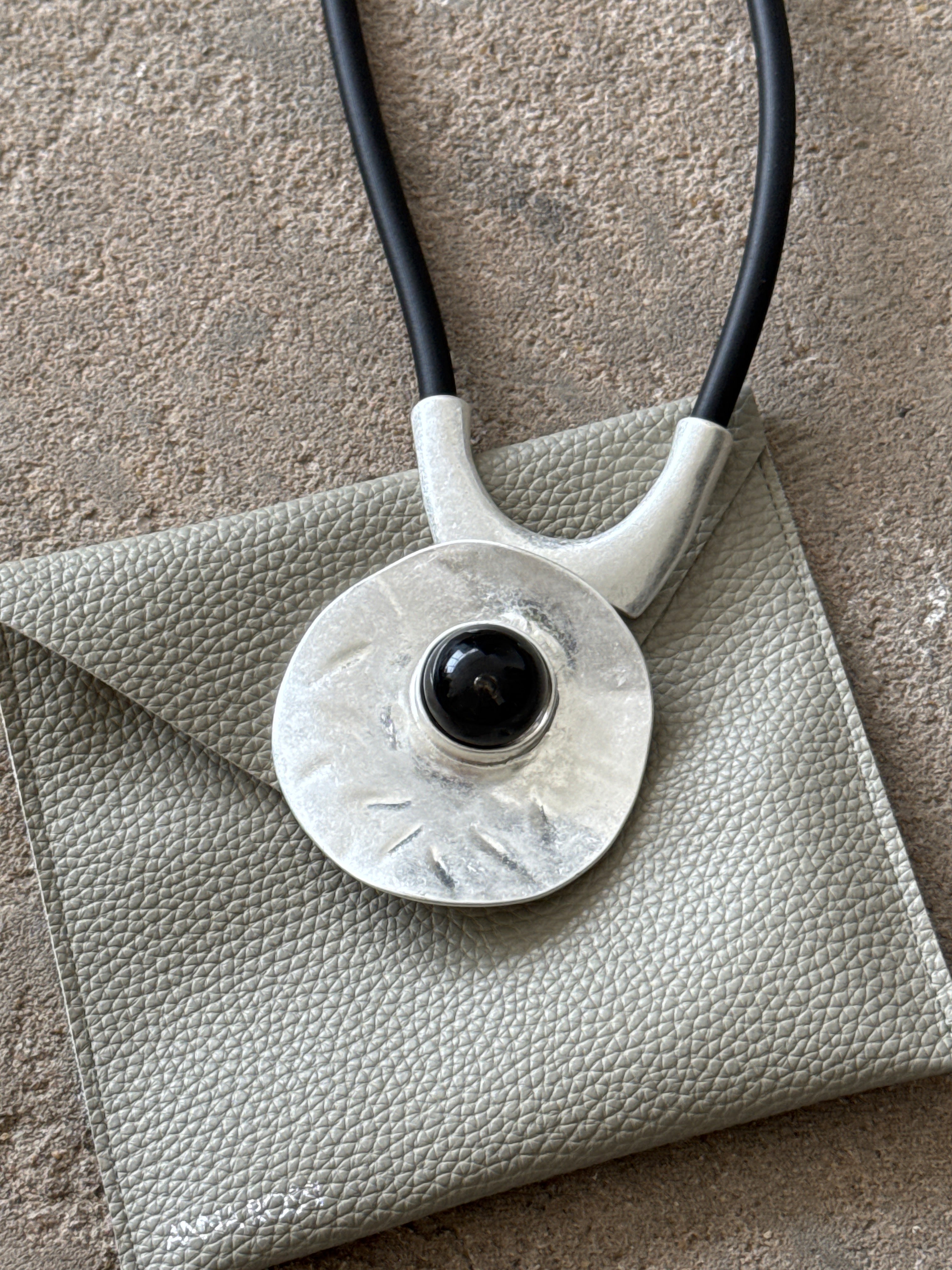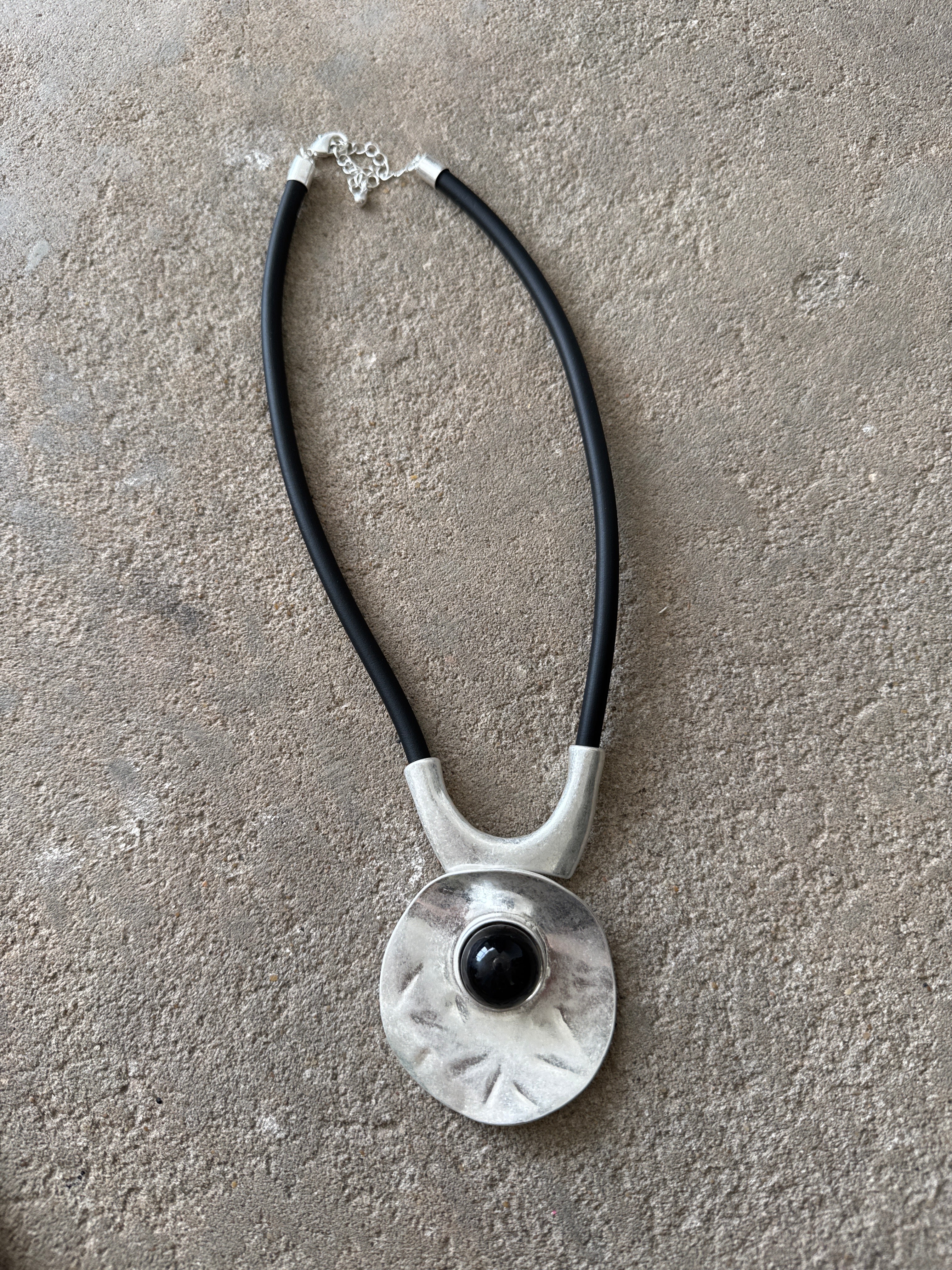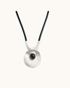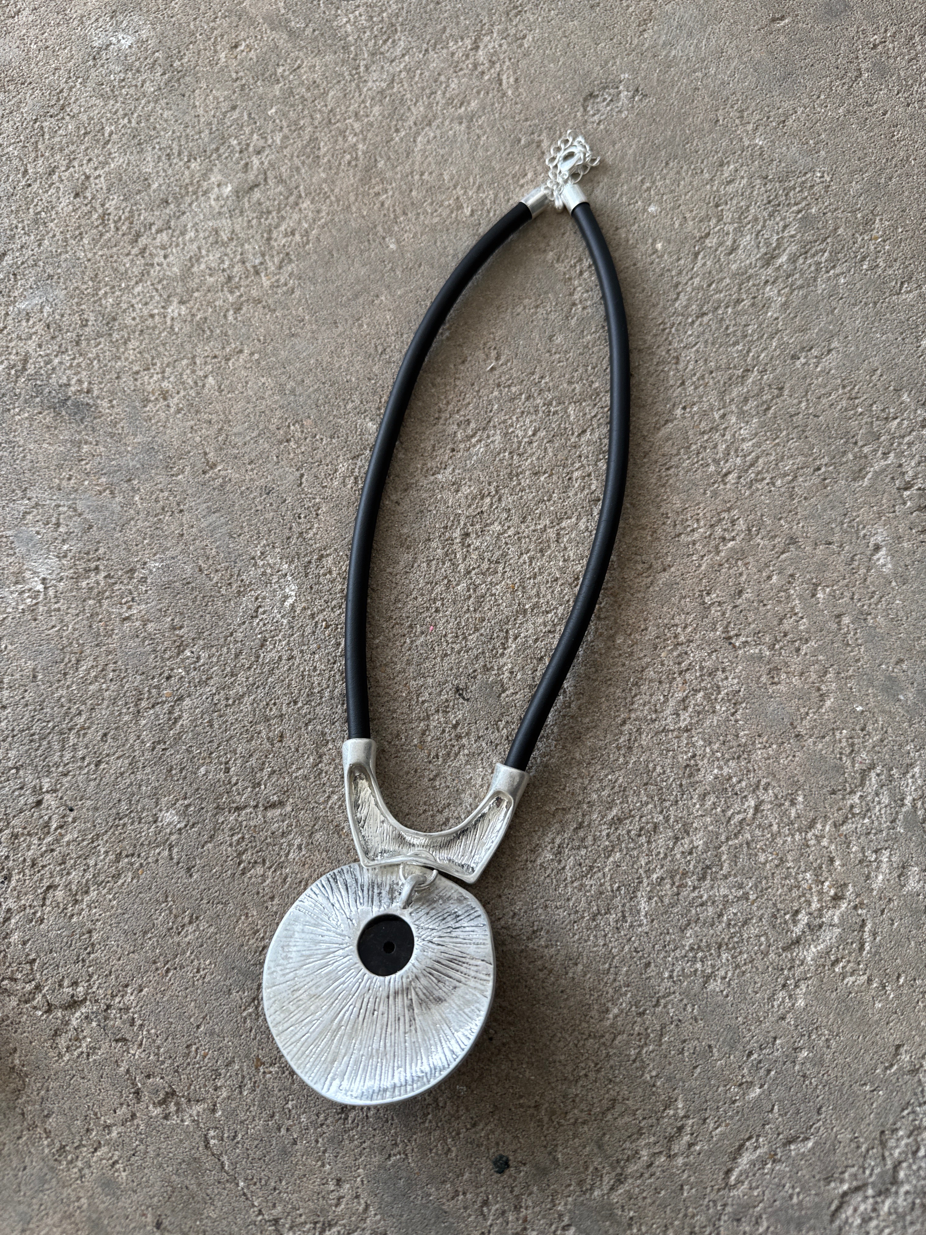 This necklace features a large hammered silver-tone disc pendant with a black orb center, it’s strung on a sleek black cord for a striking monochrome effect. Designed to sit comfortably around the neckline, this necklace adds modern edge and depth to minimal silhouettes.