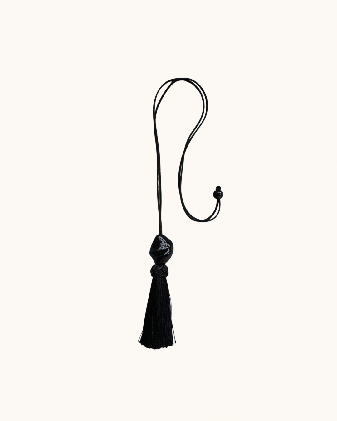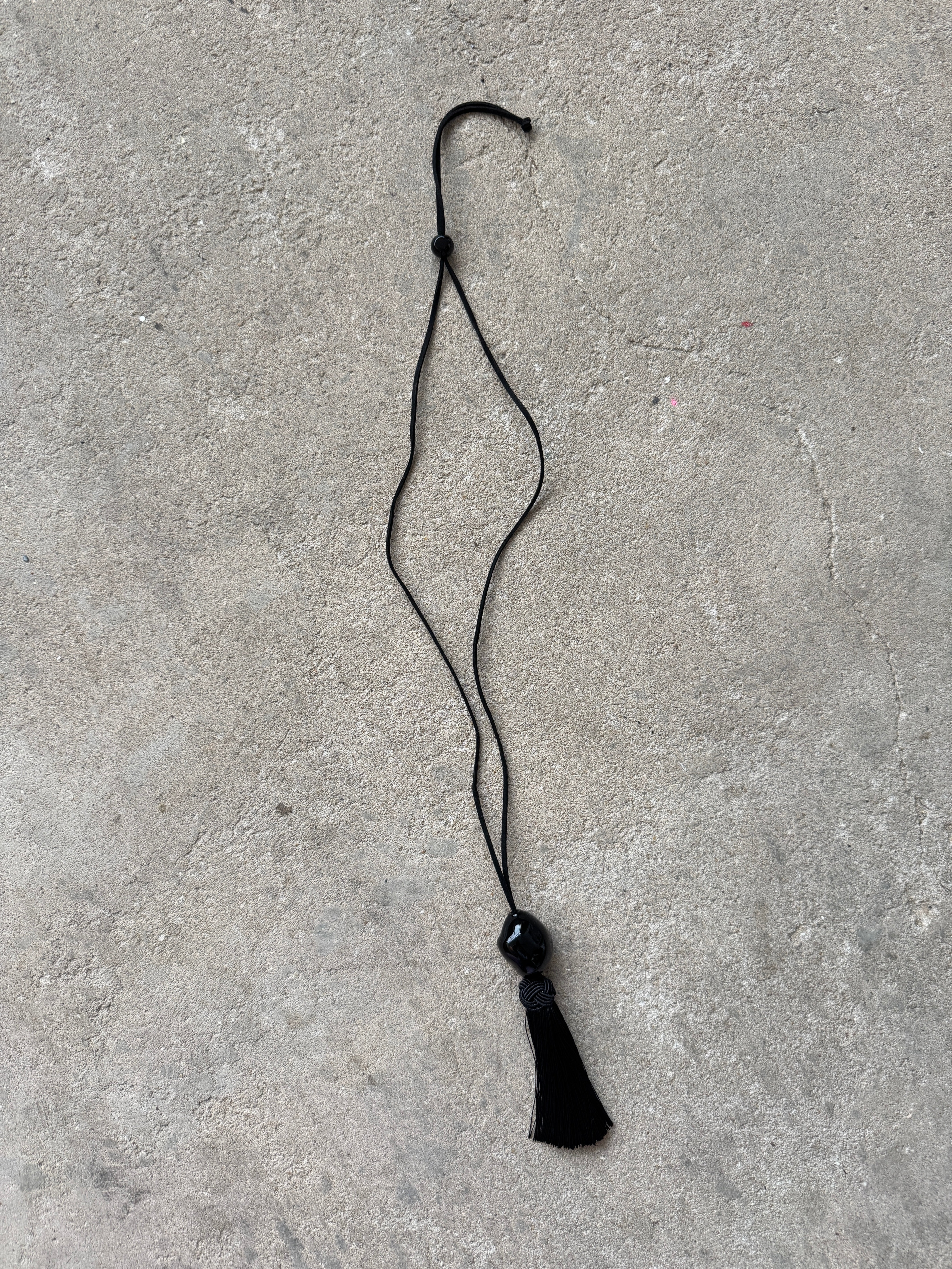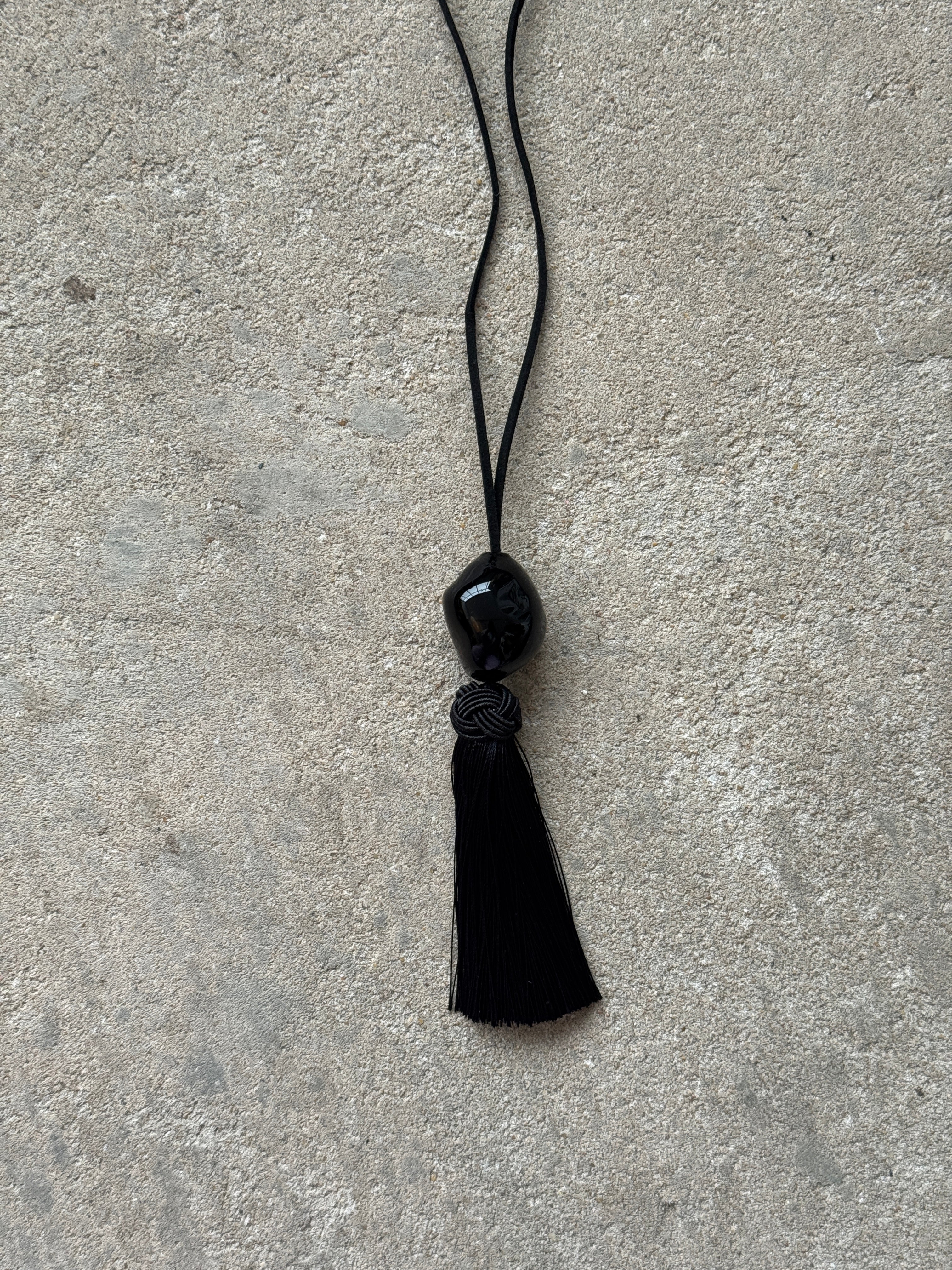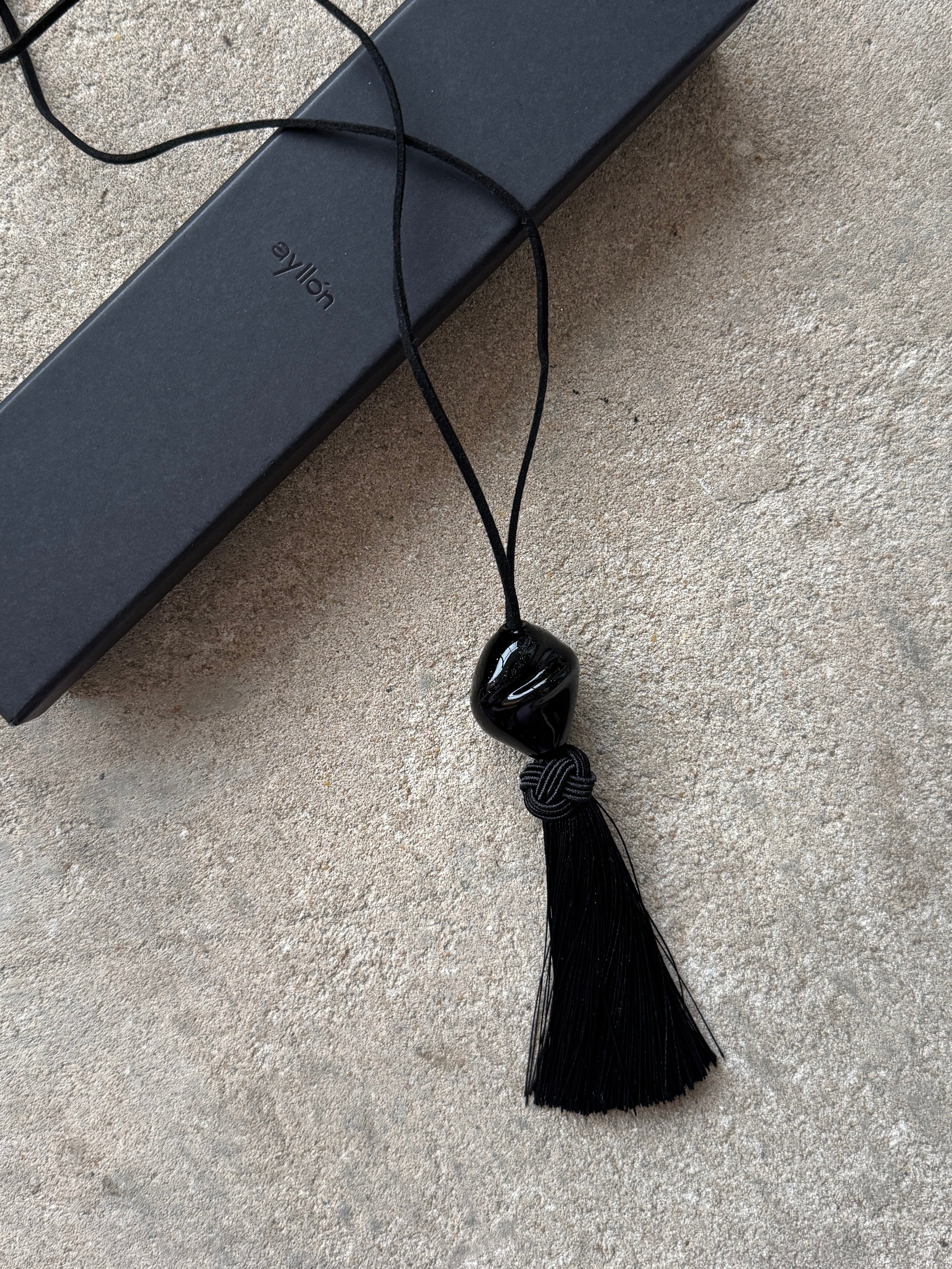 "Long necklace featuring an irregular black pendant and a tassel. Its centrepiece is a handblown glass bead supported by a suedette strap, adorned with an ice silk tassel at the end."