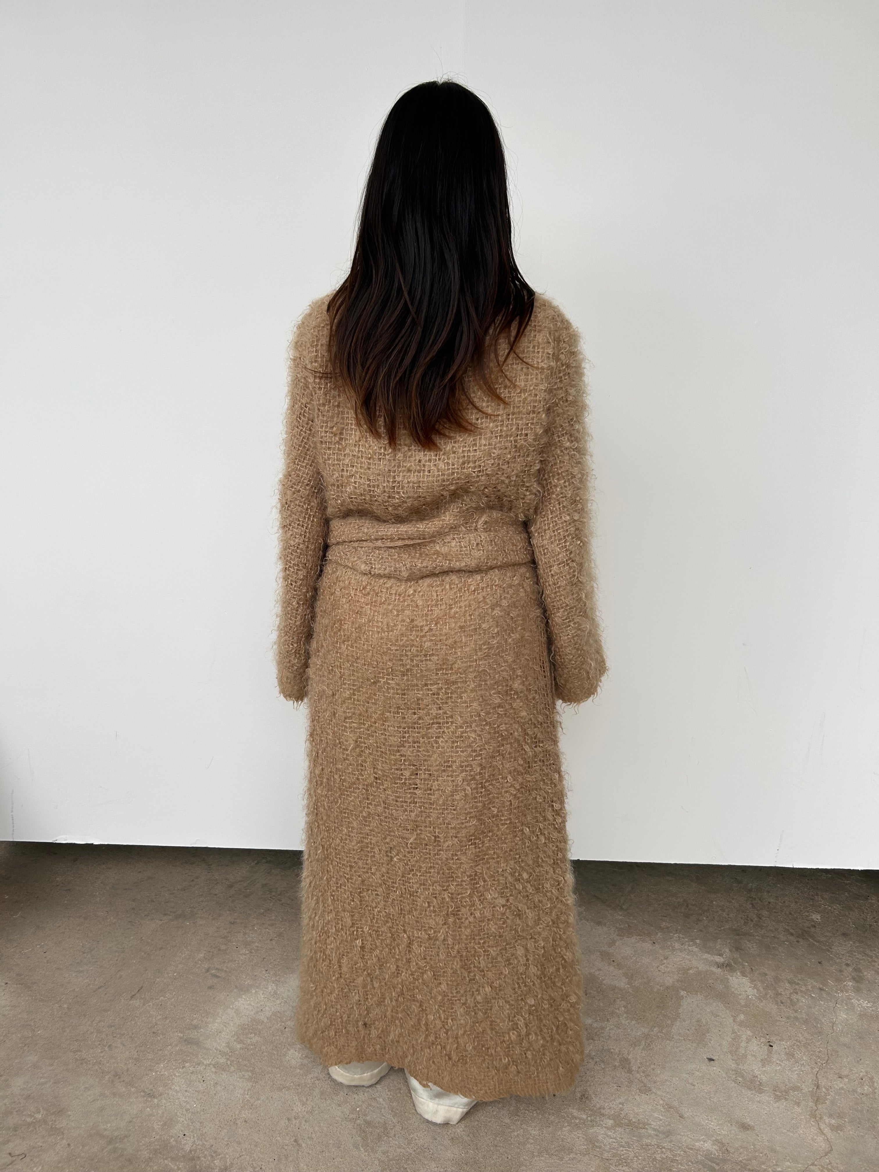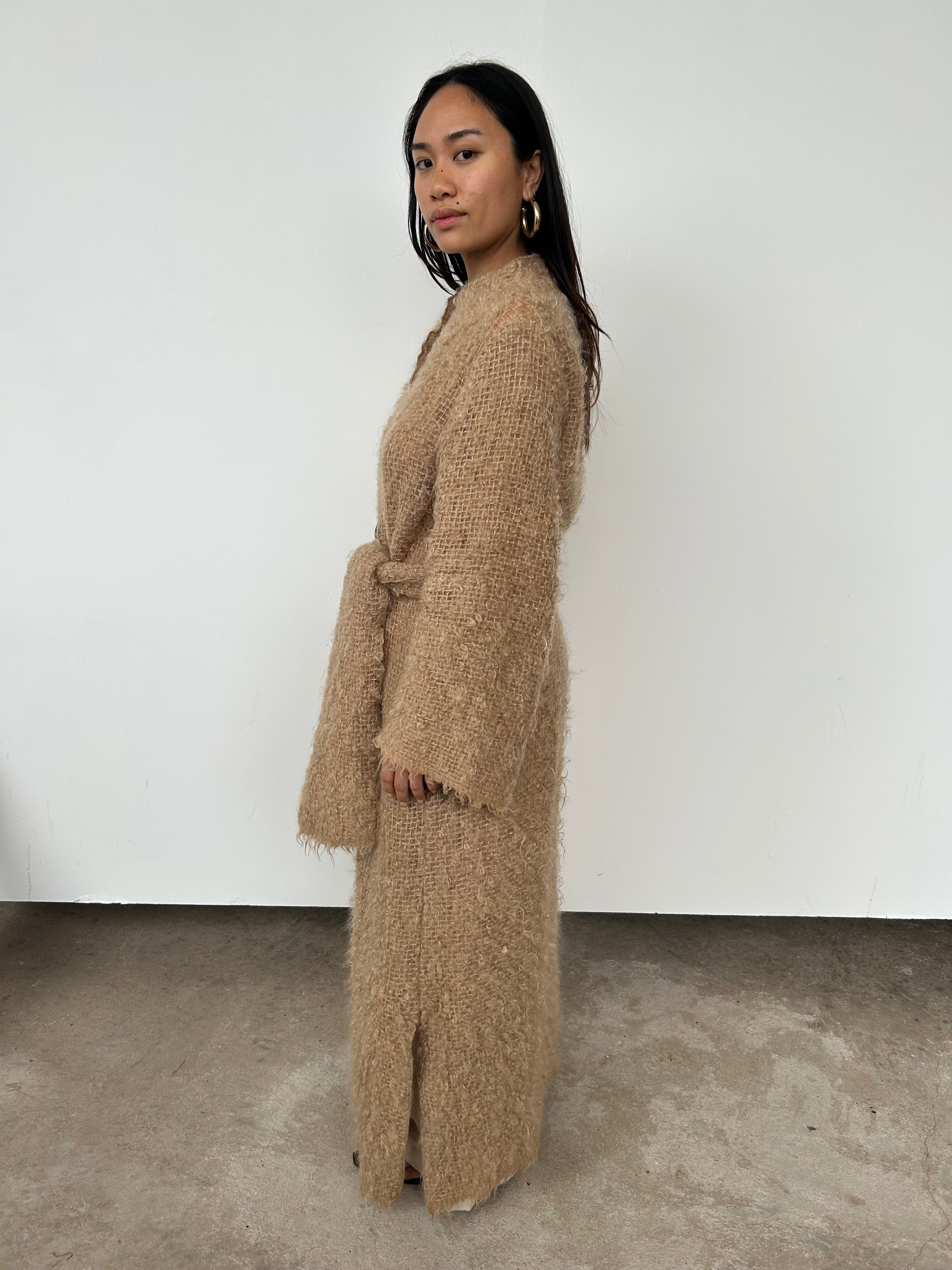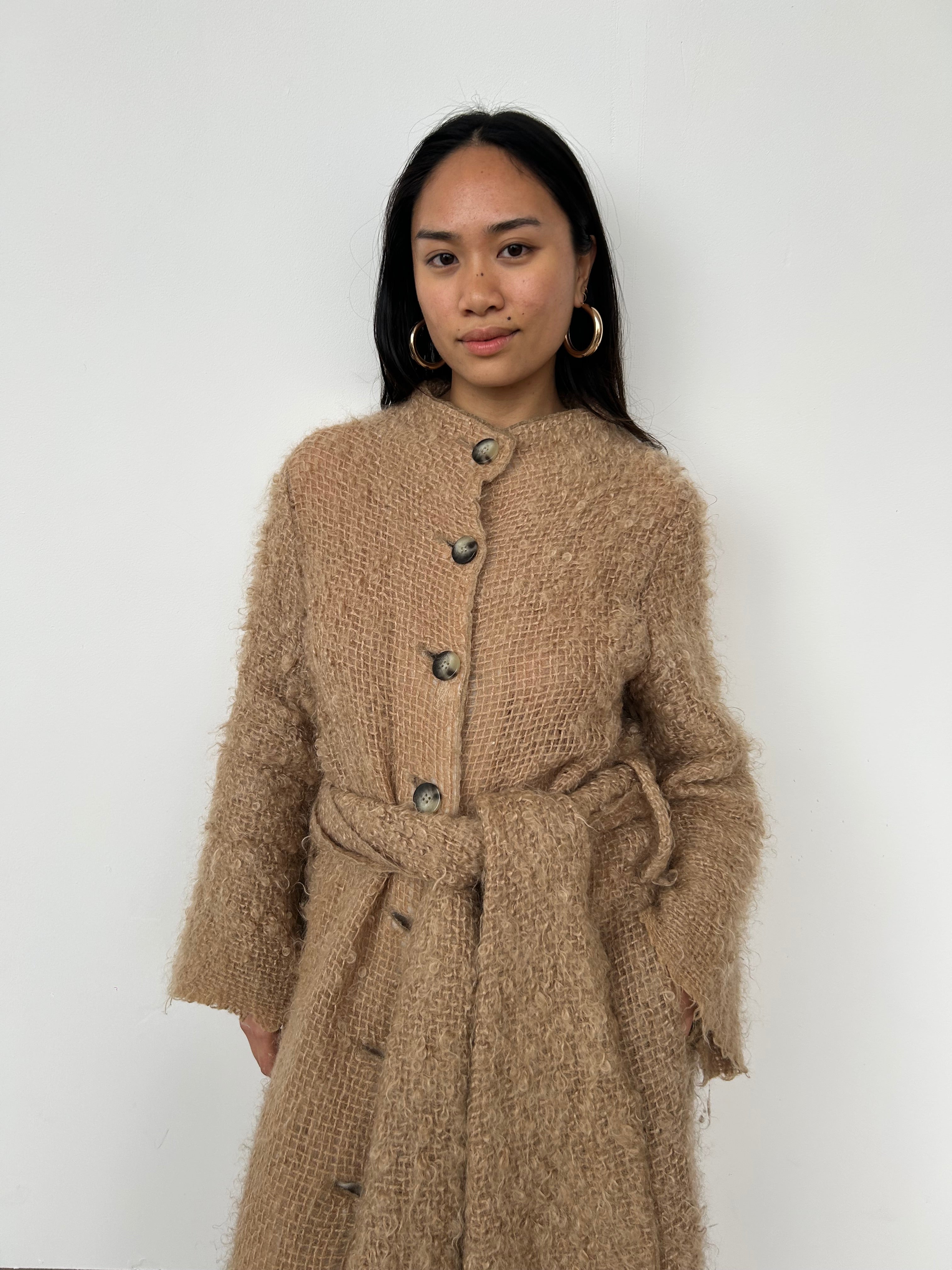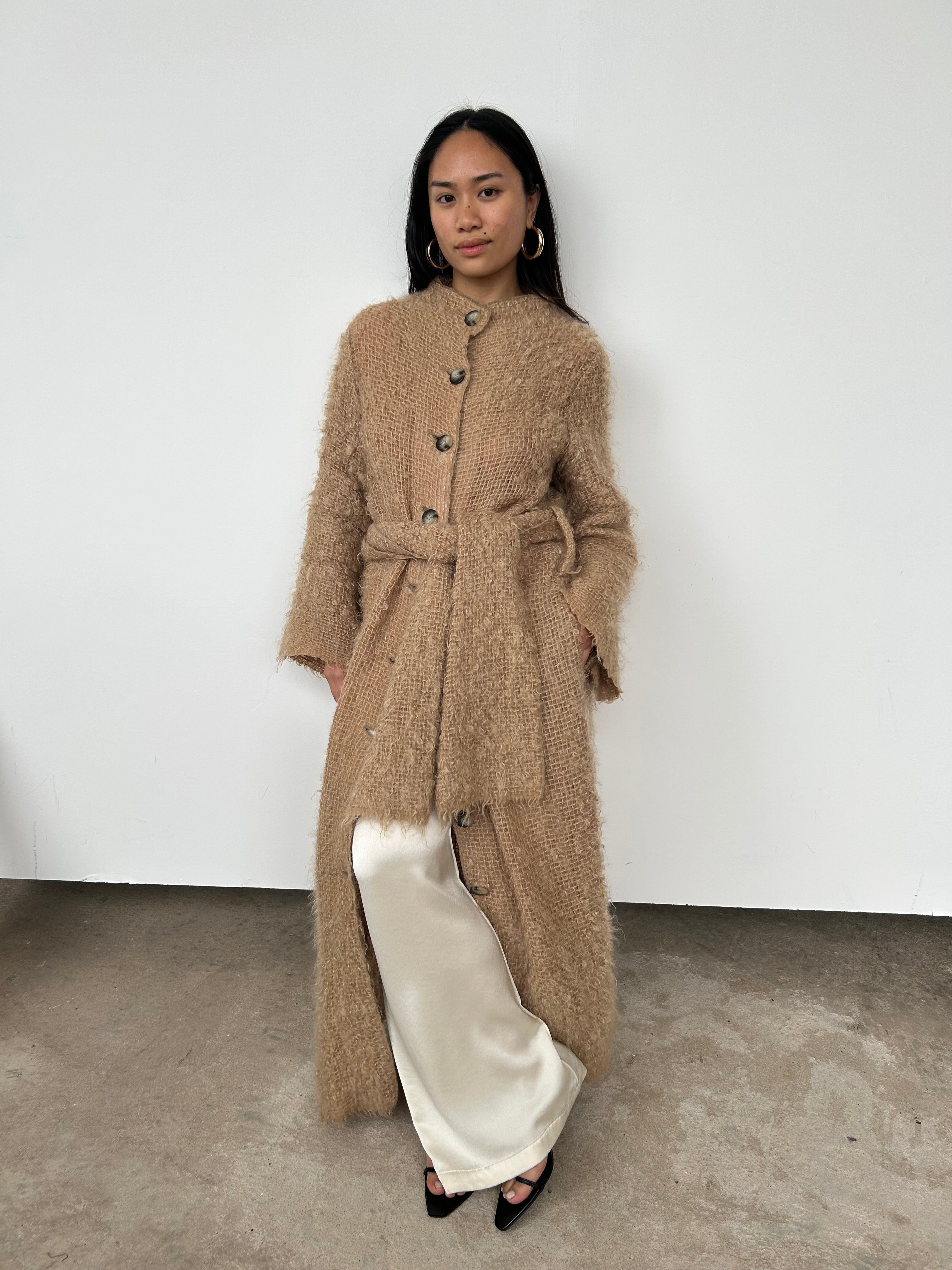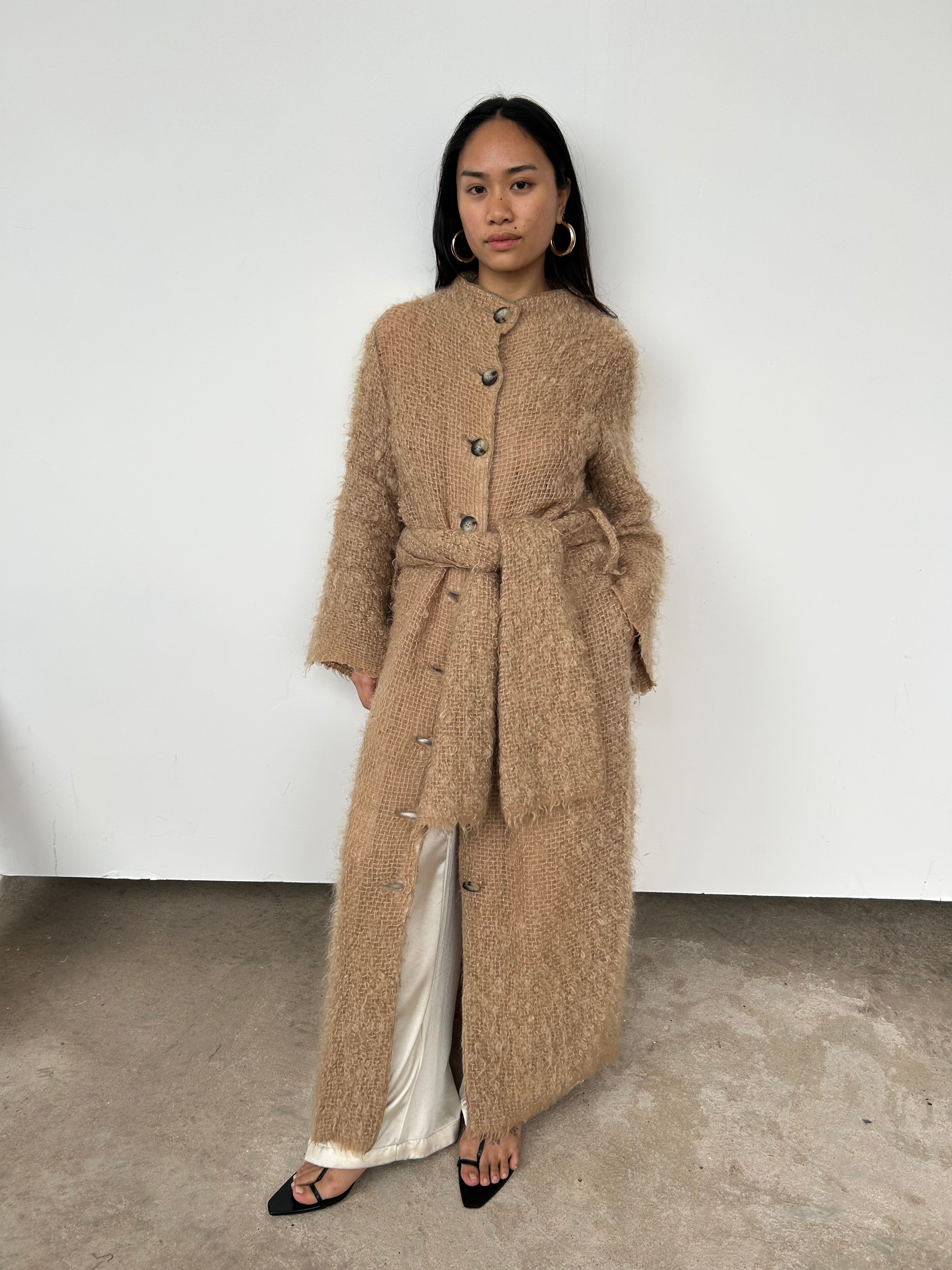A brushed, open knit mohair and wool-blend coat. Featuring a mock neck and button closure. Use the detachable belt to cinch the waist if desired. We love the raw edge to cuffs and hem.