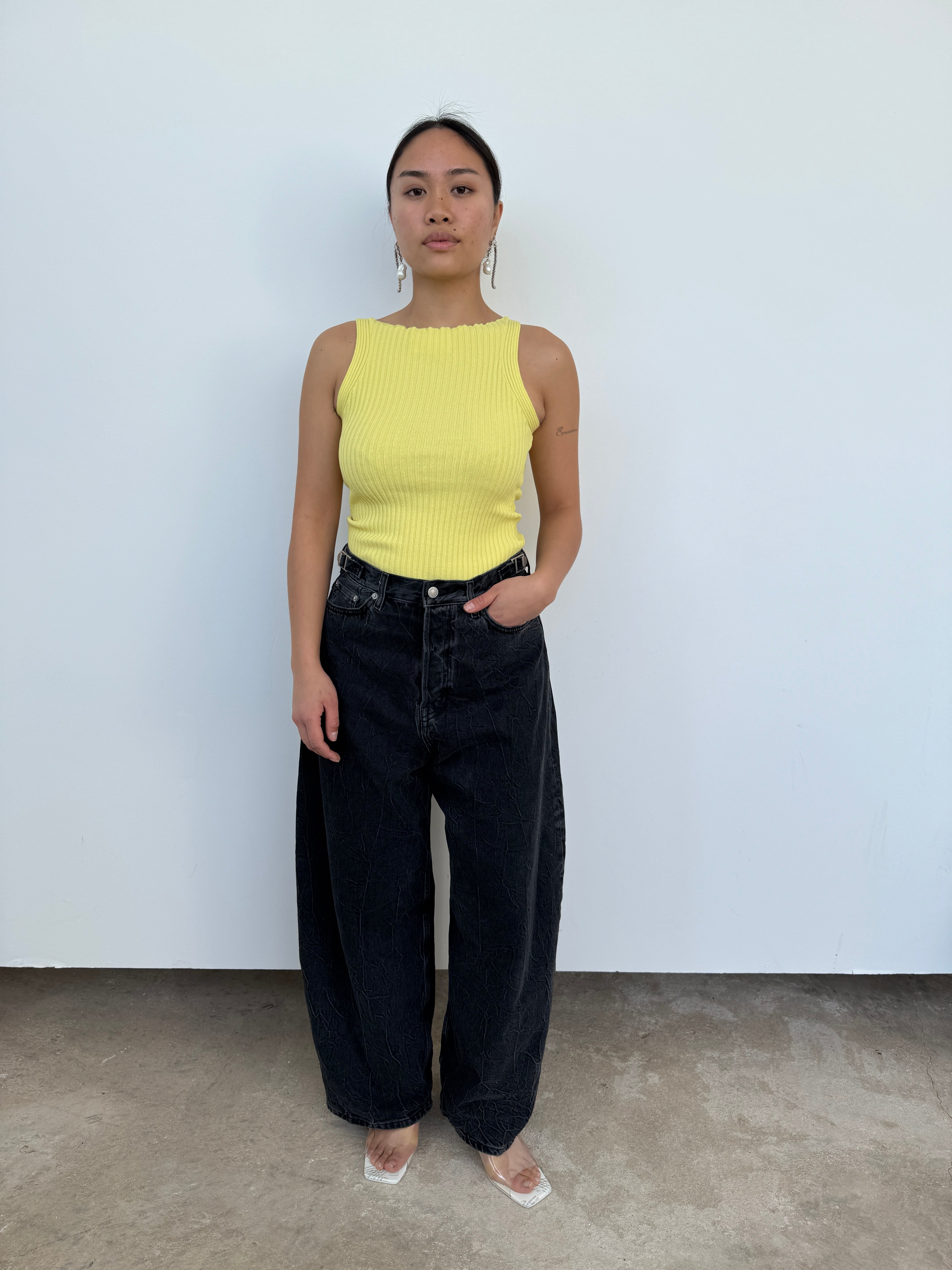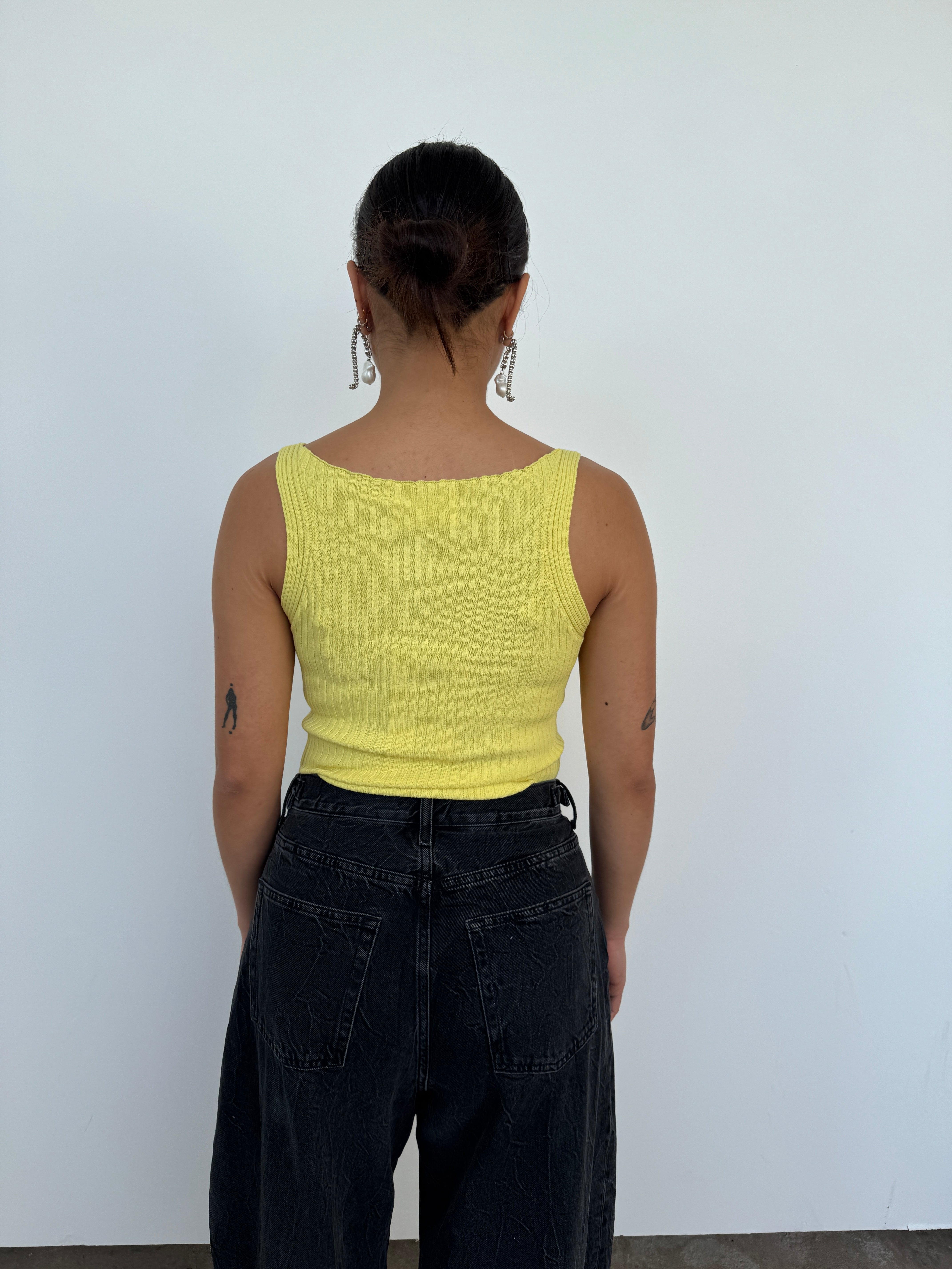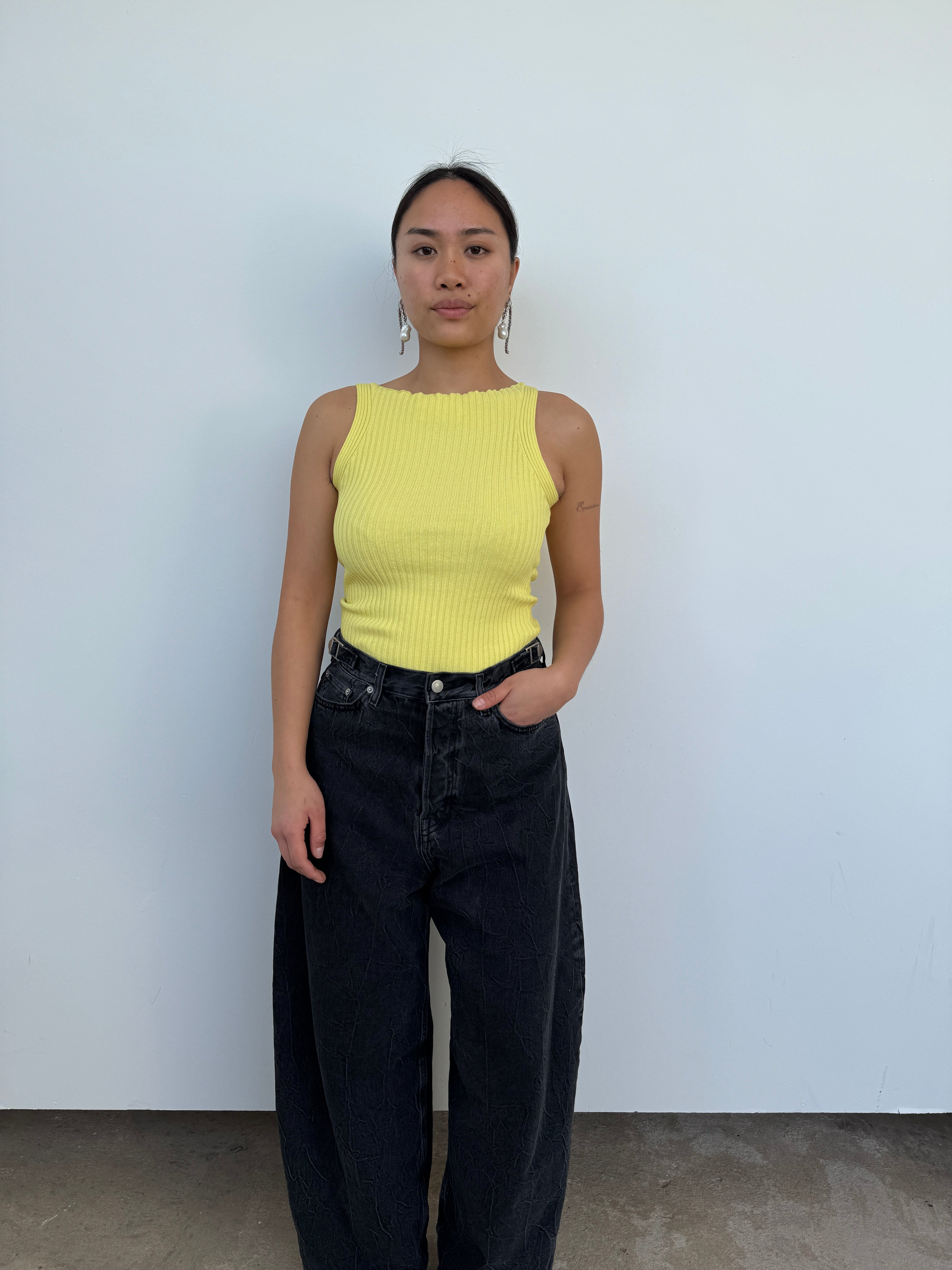 Woven with a light, EcoVero™ blend yarn, this singlet boasts a low scoop neck and rib detailing that highlights and flatters curves. Versatile and stylish, it can be worn in multiple ways, as demonstrated by our model Ingrid.