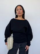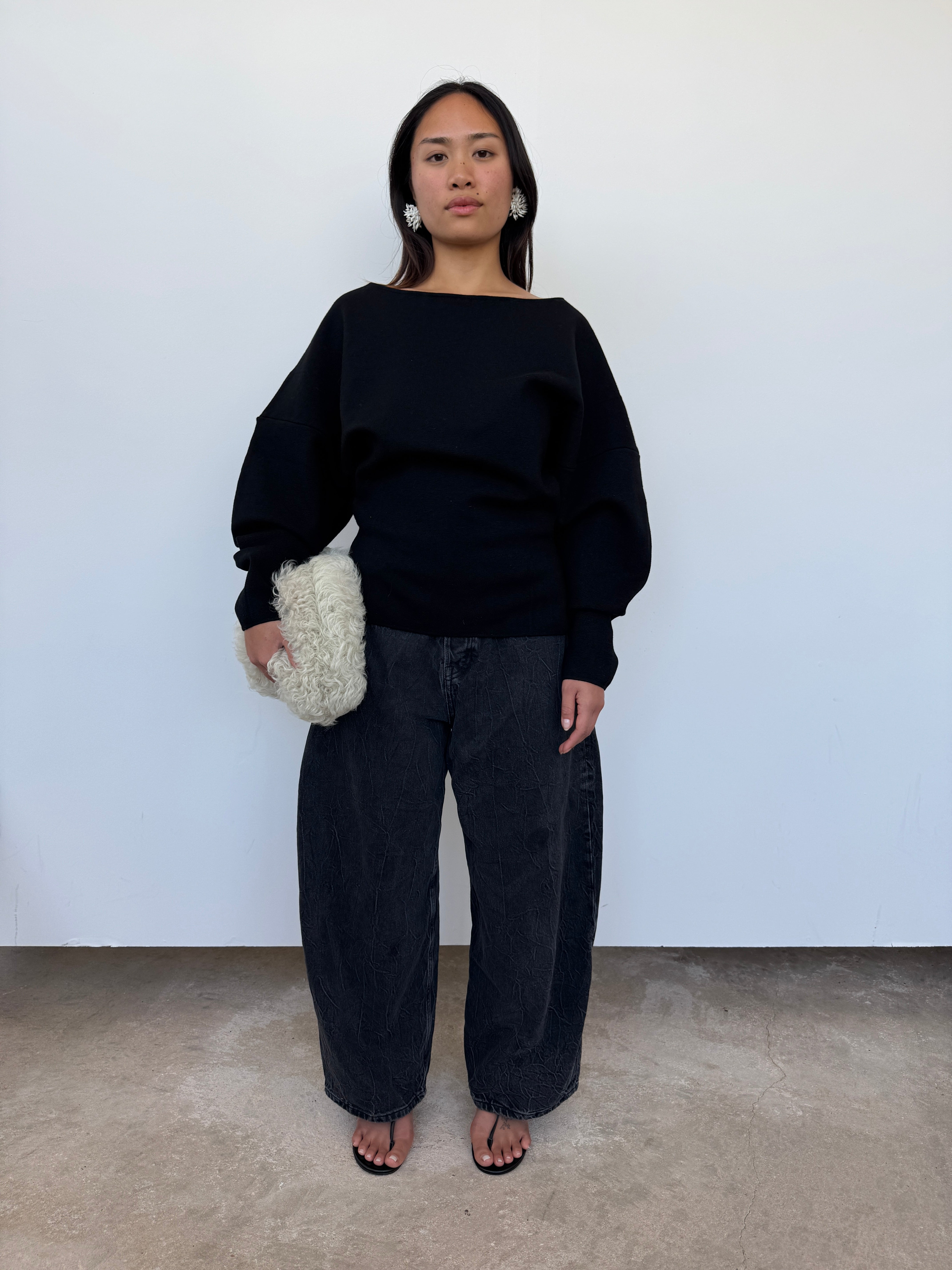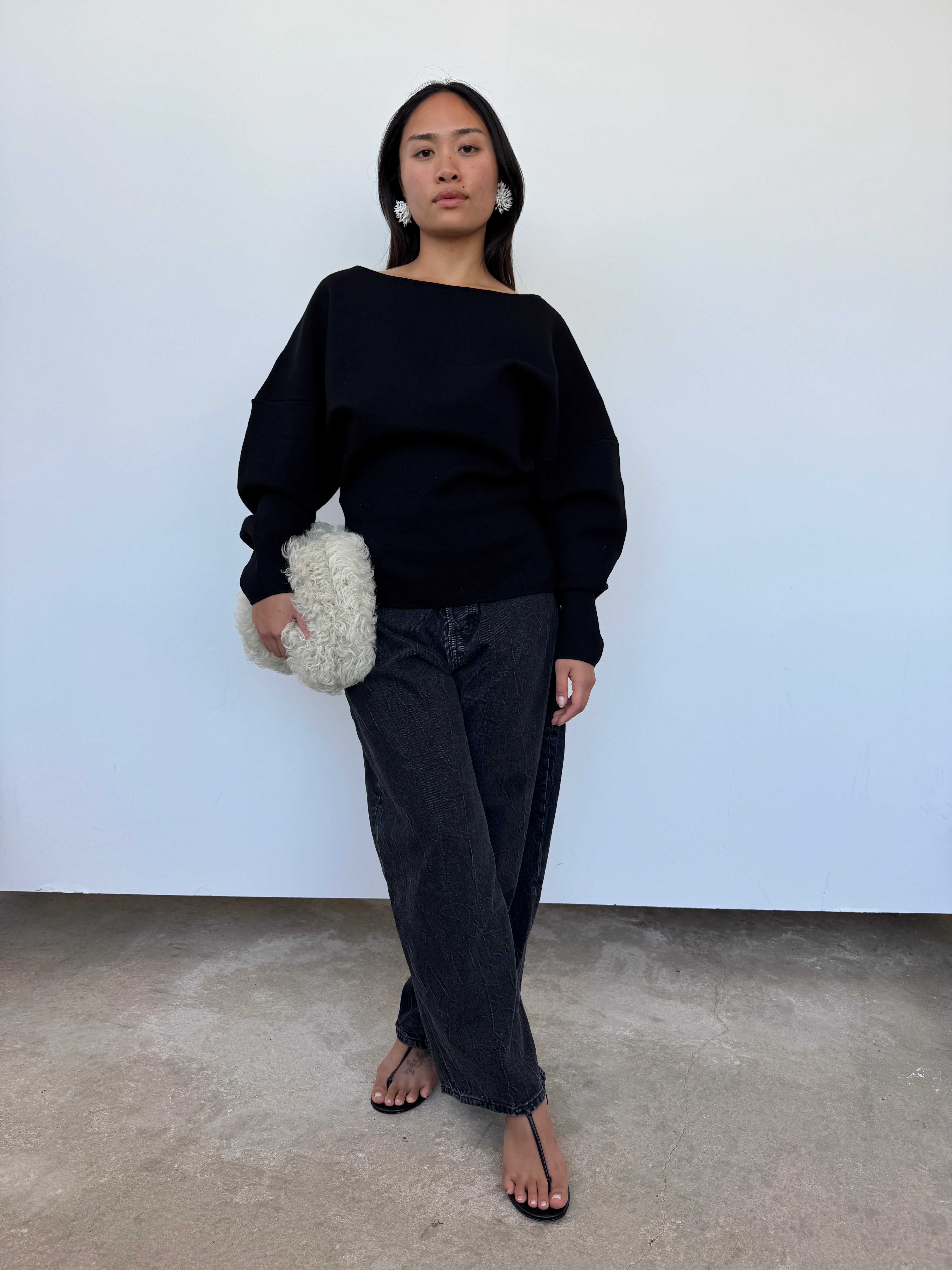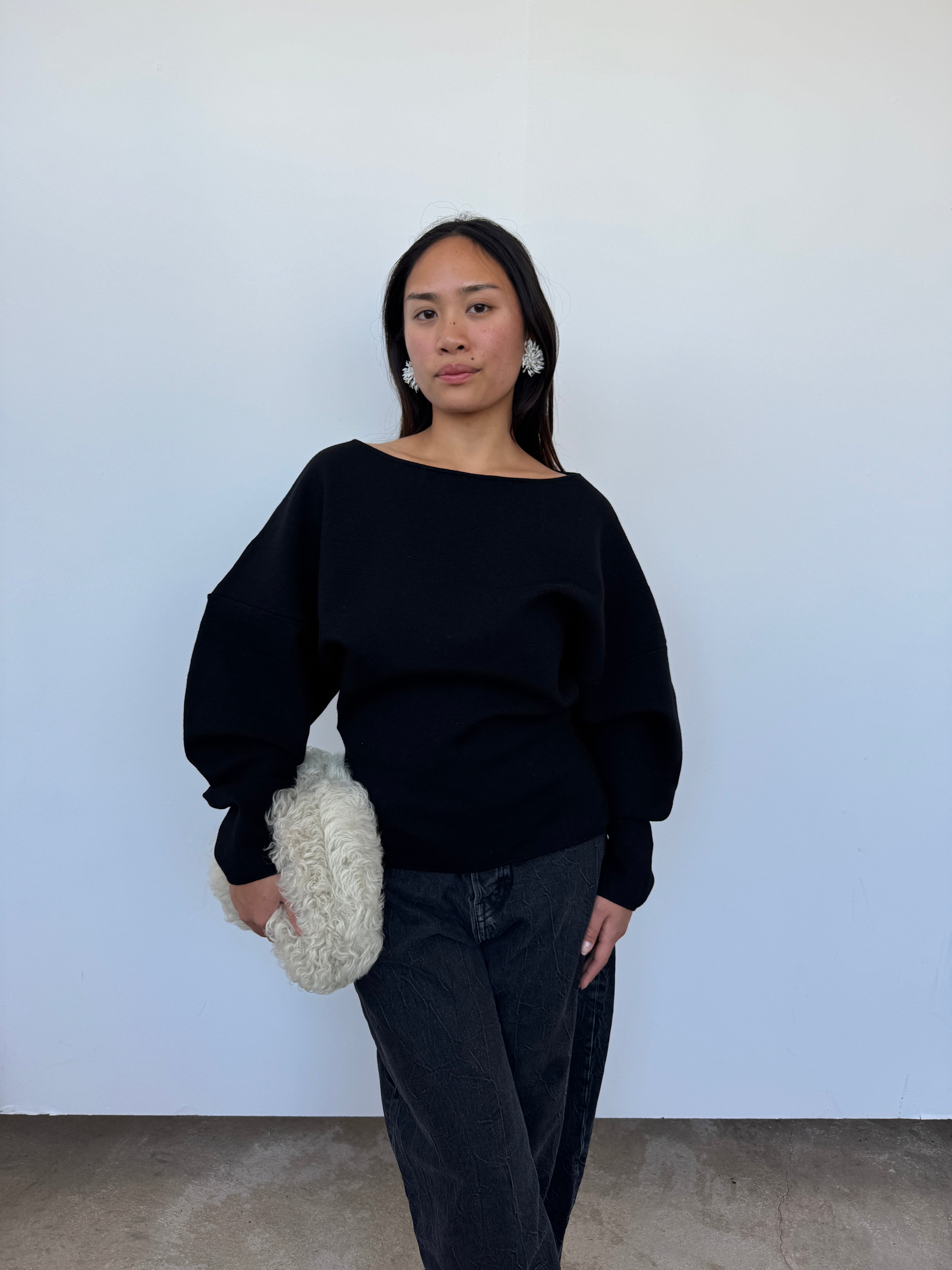 A sculptural silhouette, crafted from 100% extrafine merino wool with added Lycra for structure. Made in Italy, this sweater features a clean boat neckline, panel detailing, and voluminous sleeves that taper at the wrist. A contemporary essential with a soft yet sculpted drape.