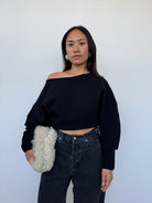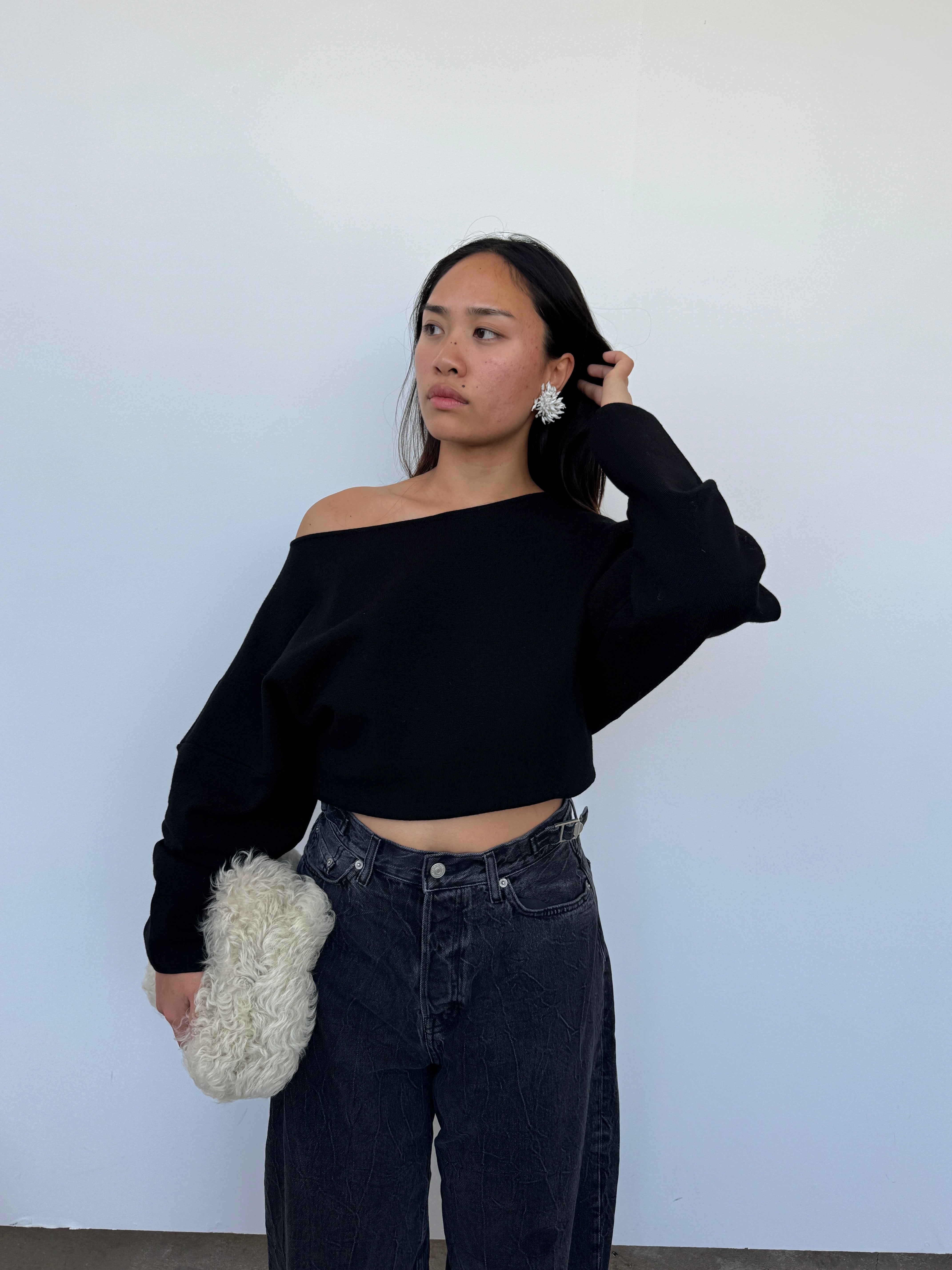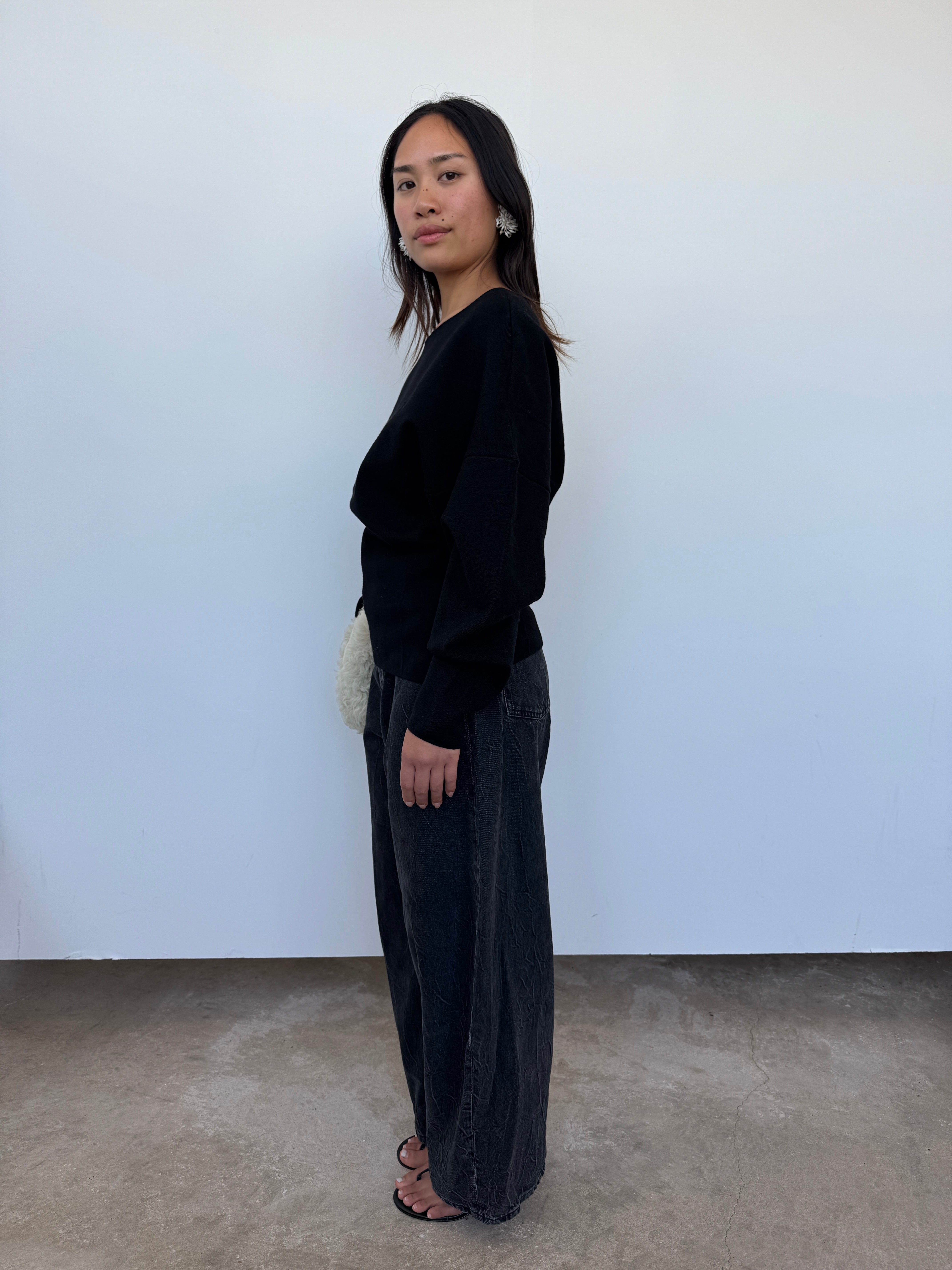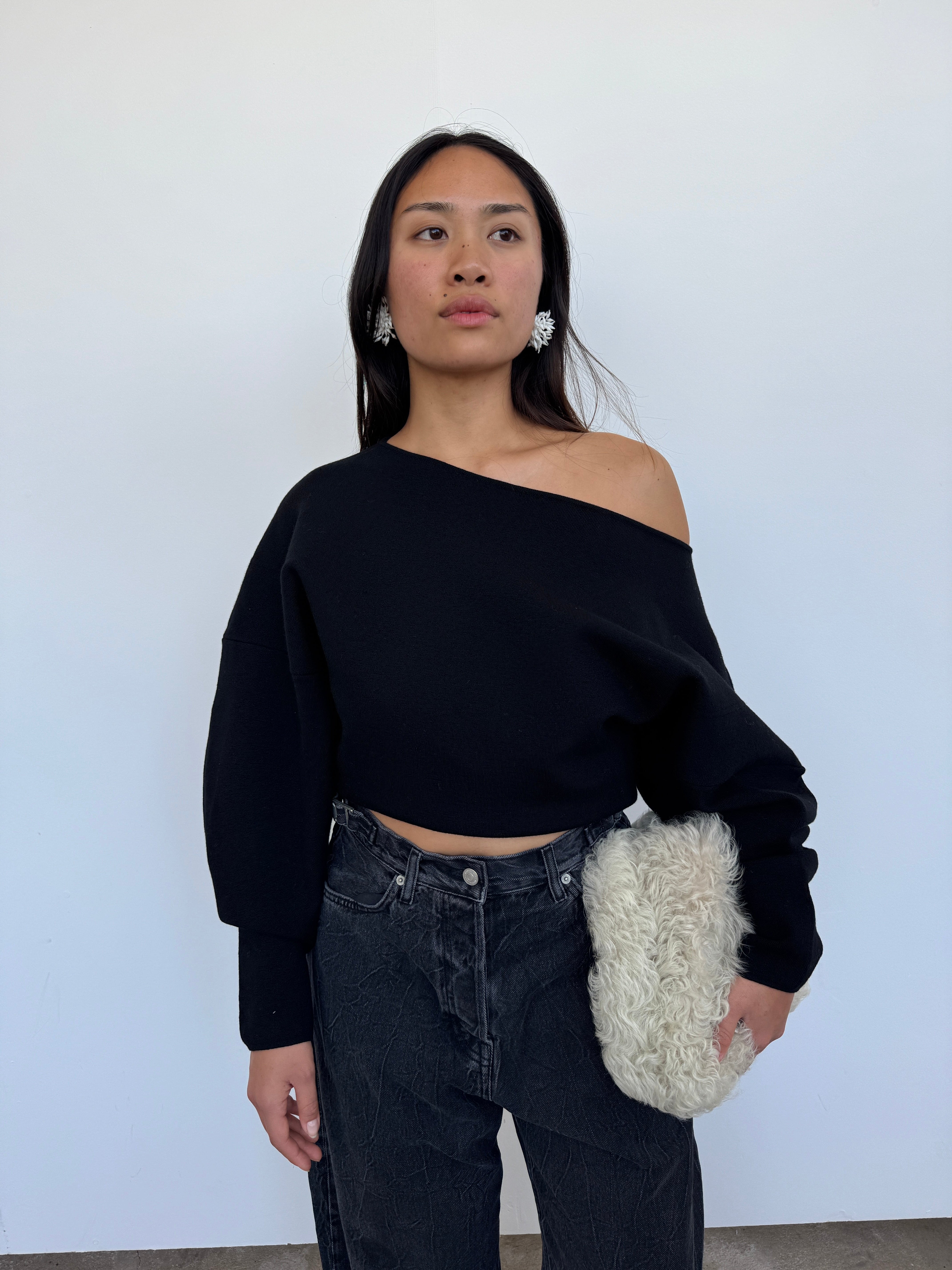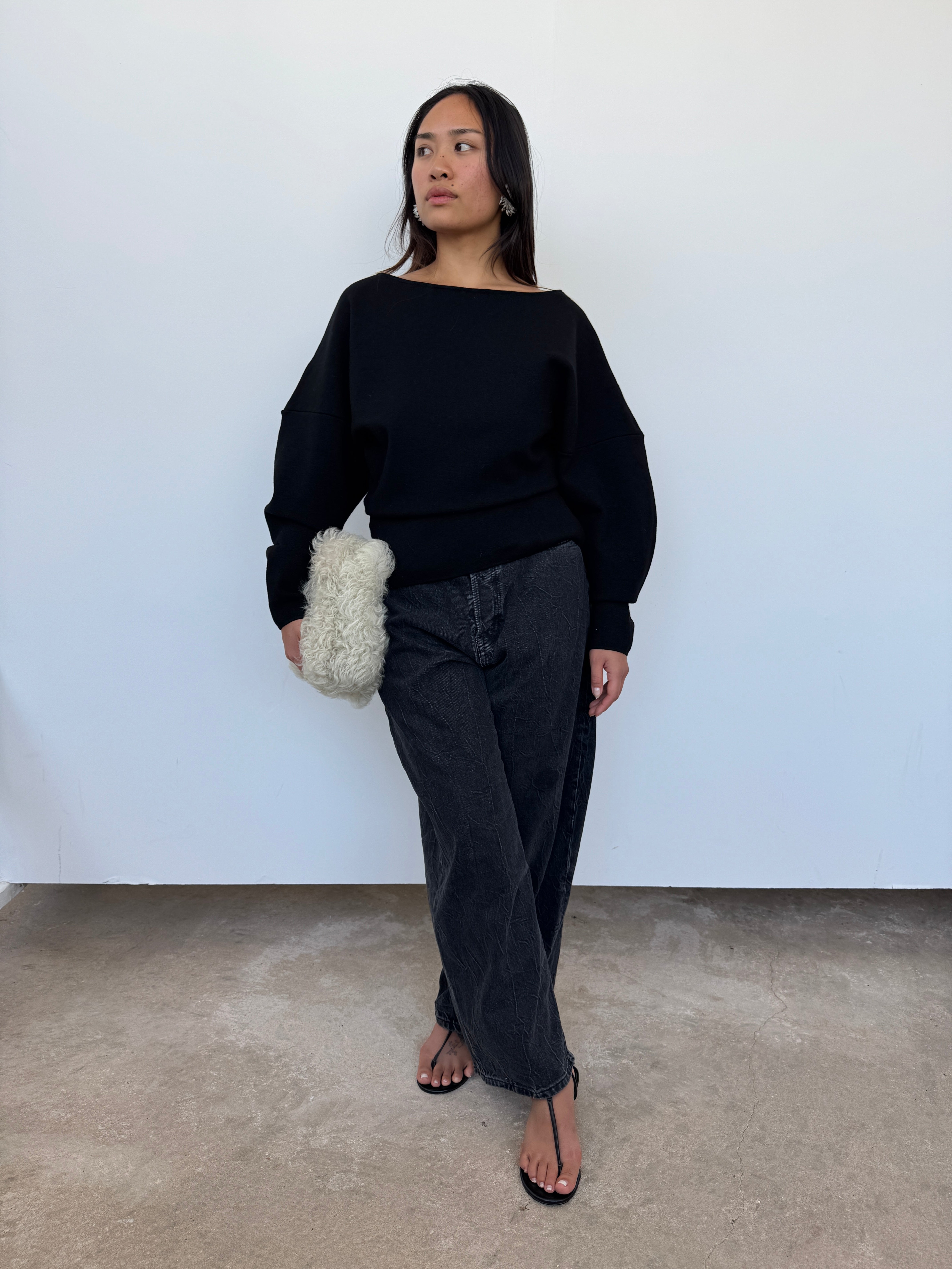 A sculptural silhouette, crafted from 100% extrafine merino wool with added Lycra for structure. Made in Italy, this sweater features a clean boat neckline, panel detailing, and voluminous sleeves that taper at the wrist. A contemporary essential with a soft yet sculpted drape.