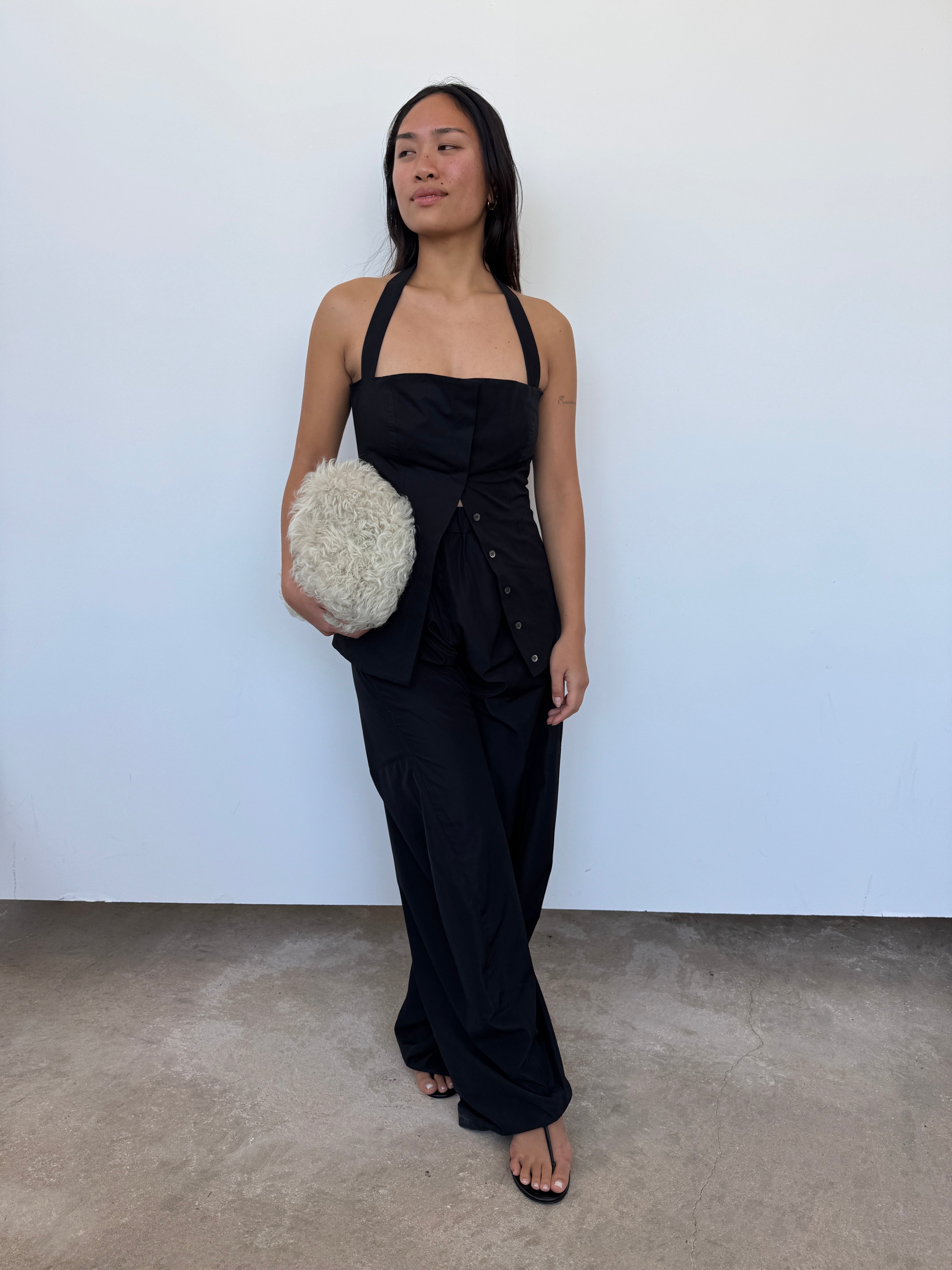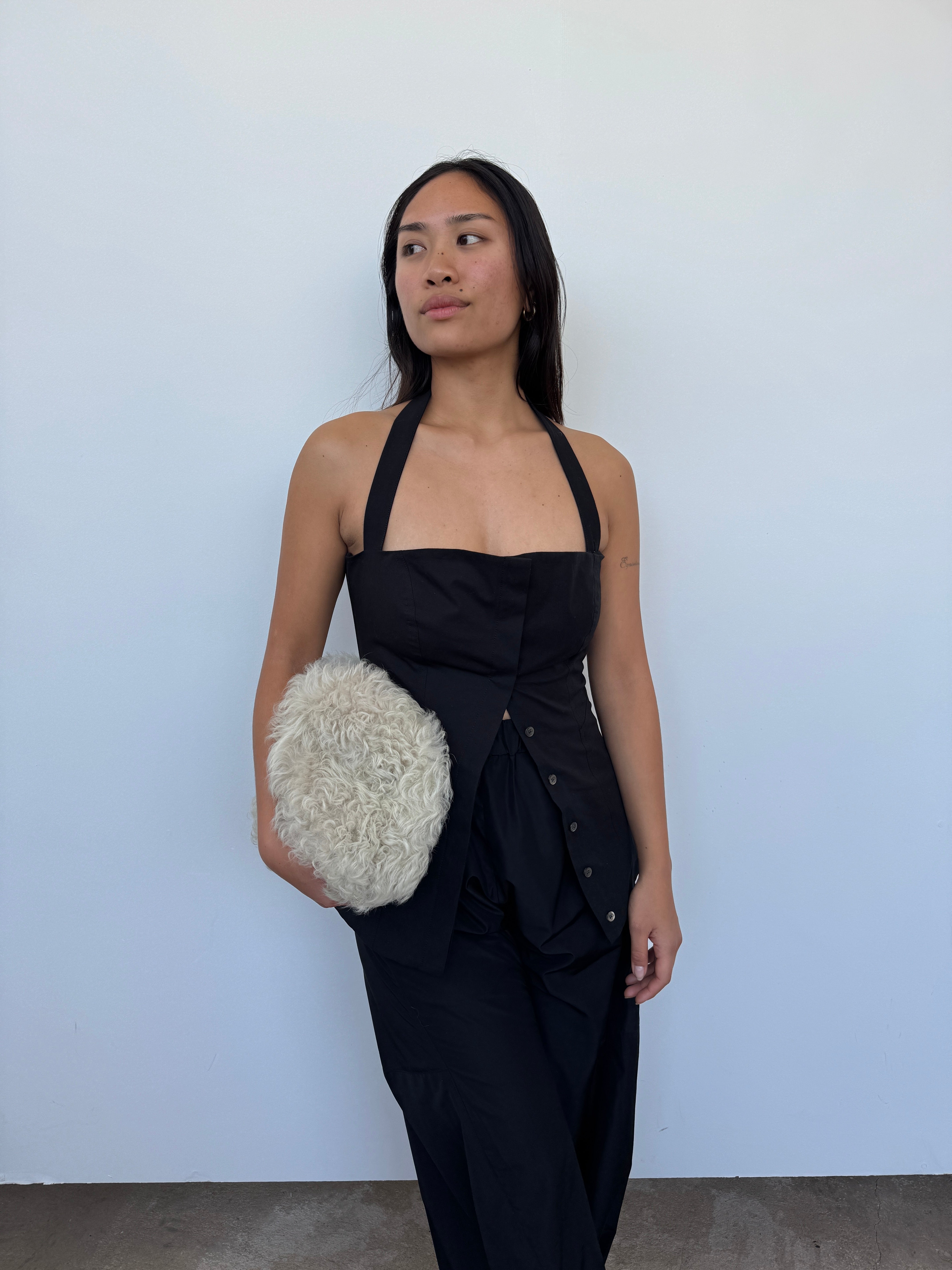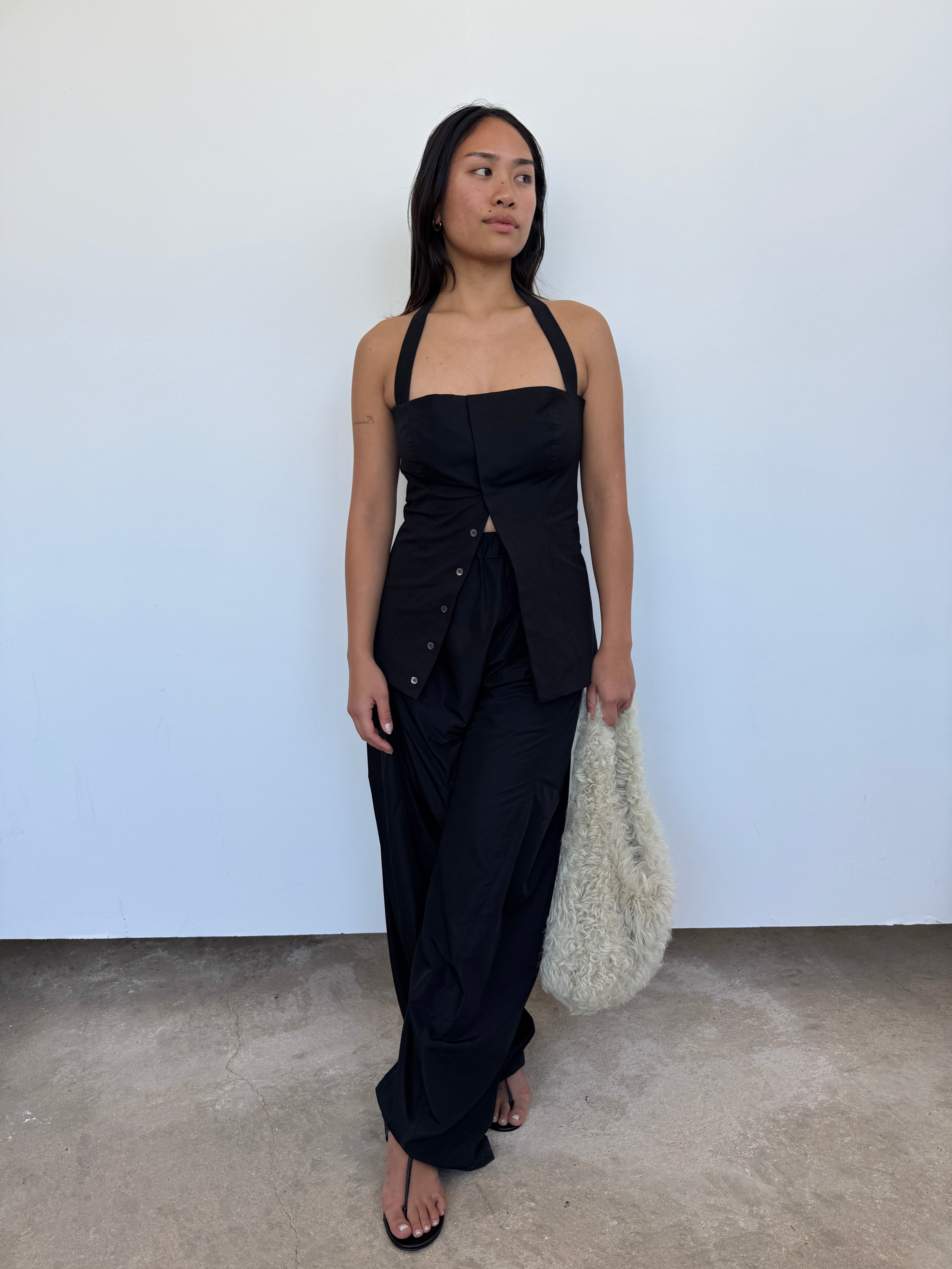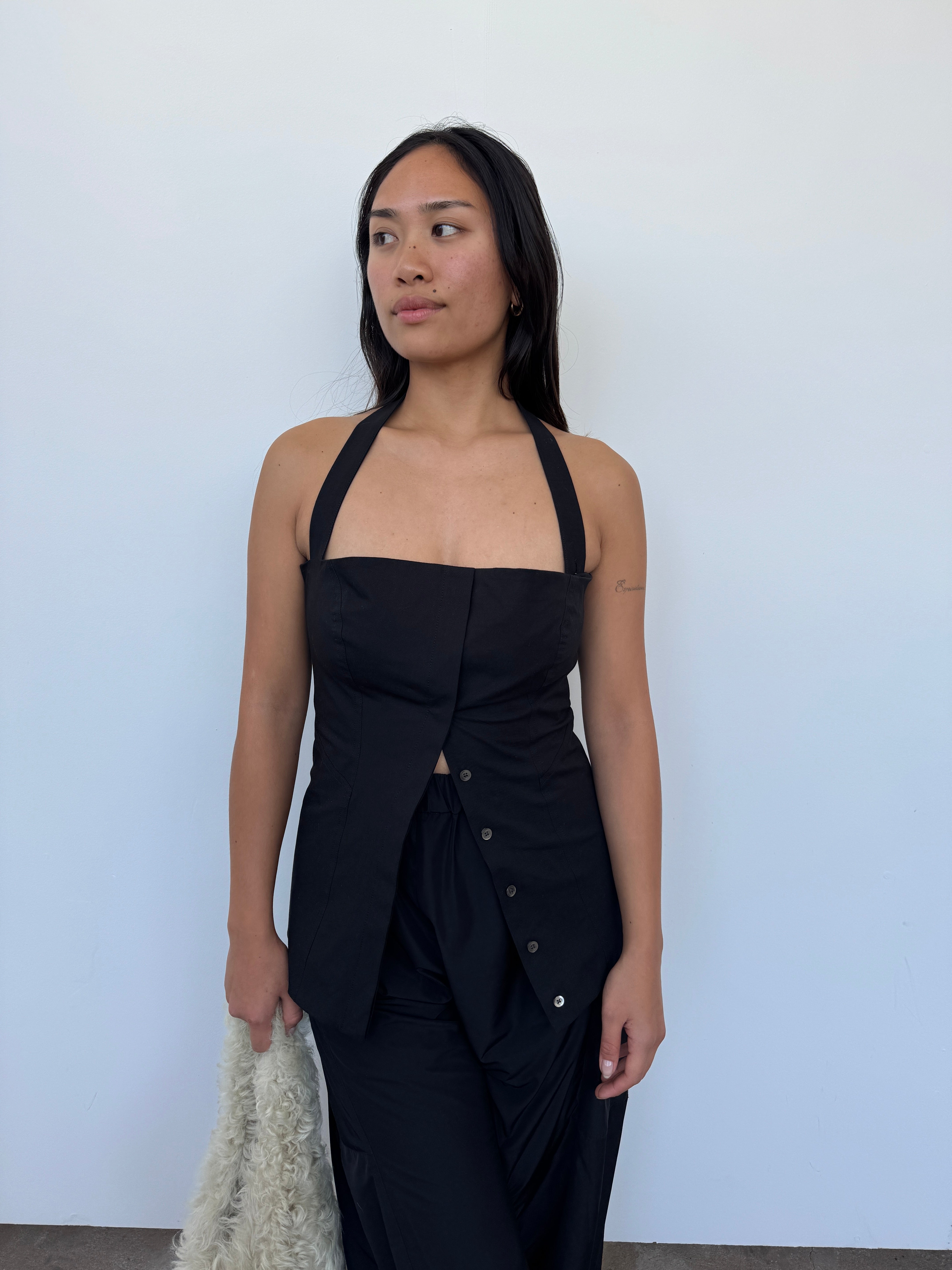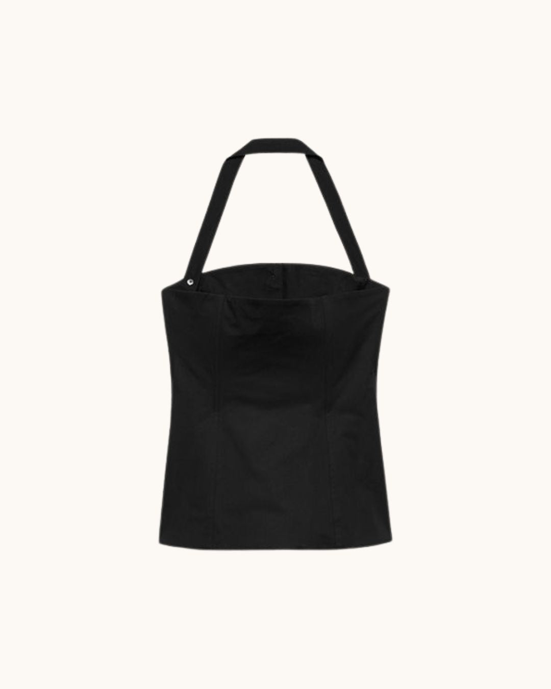 A modern take on structured tailoring, this corset-inspired top is crafted from a crisp cotton blend with added stretch for shape and comfort. Designed with a halter neckline and a fitted bodice, it features a concealed button closure at the front and boning for a sculpted fit. The halter strap is size adjustable and attaches with buttons.