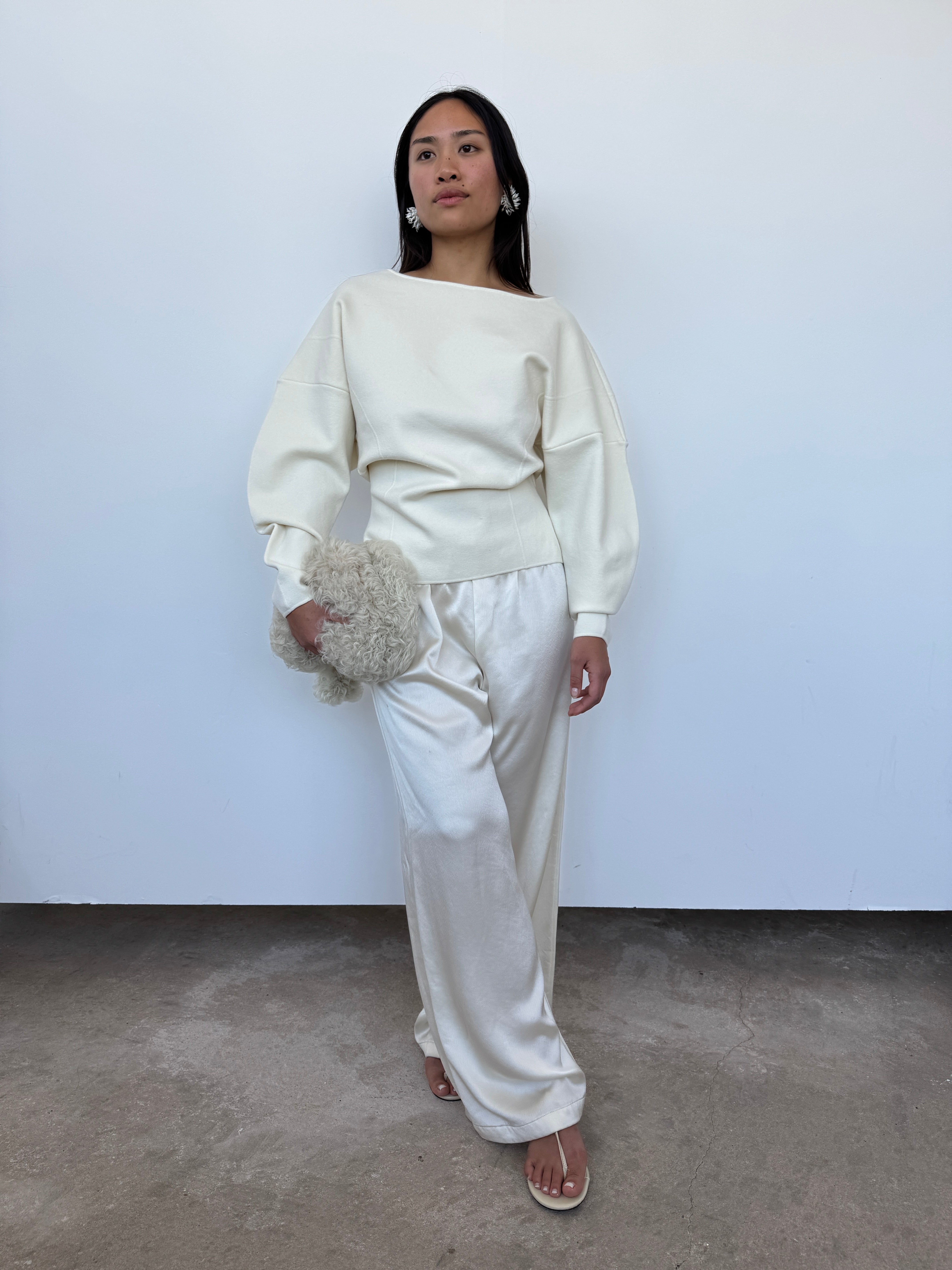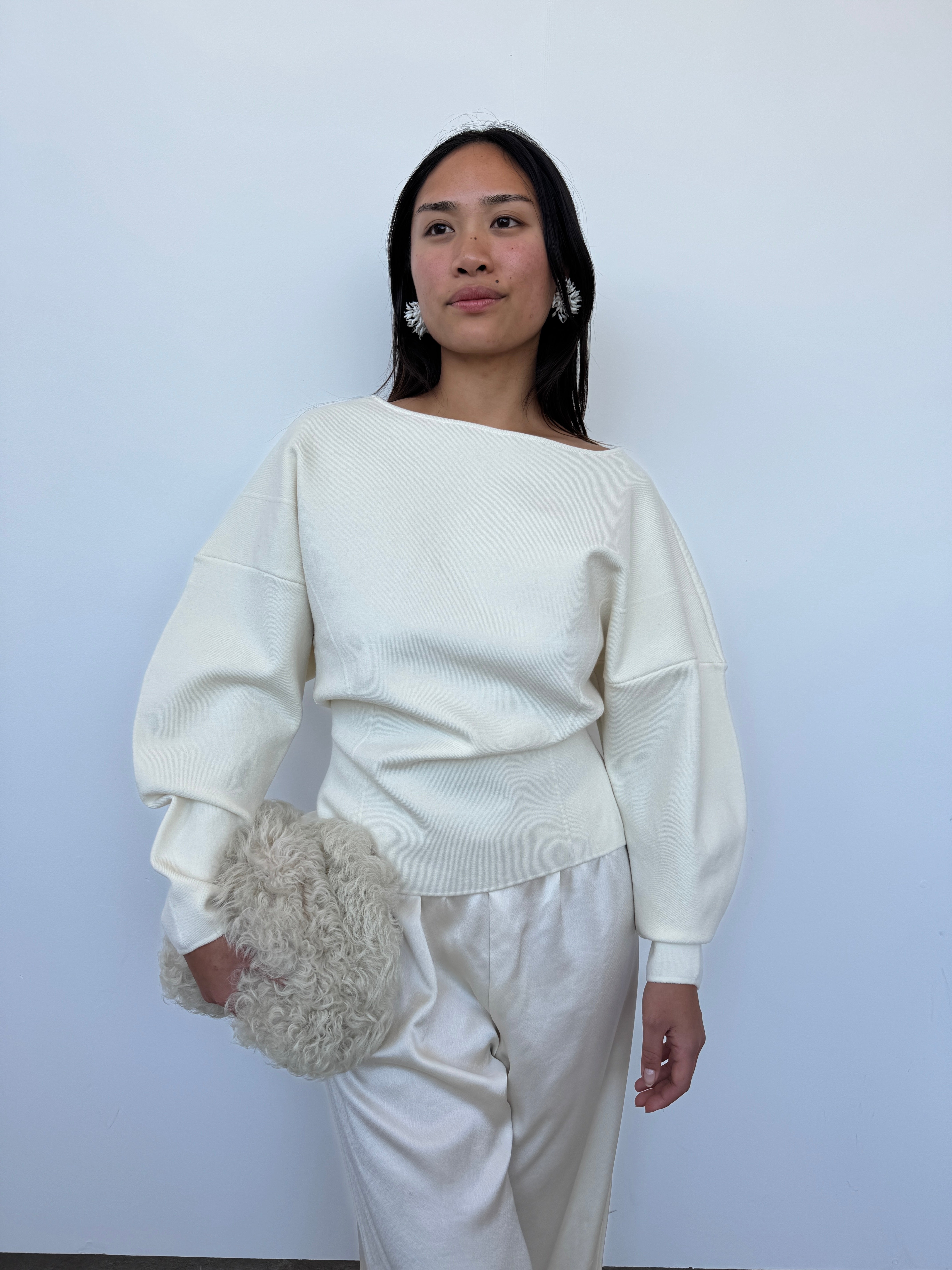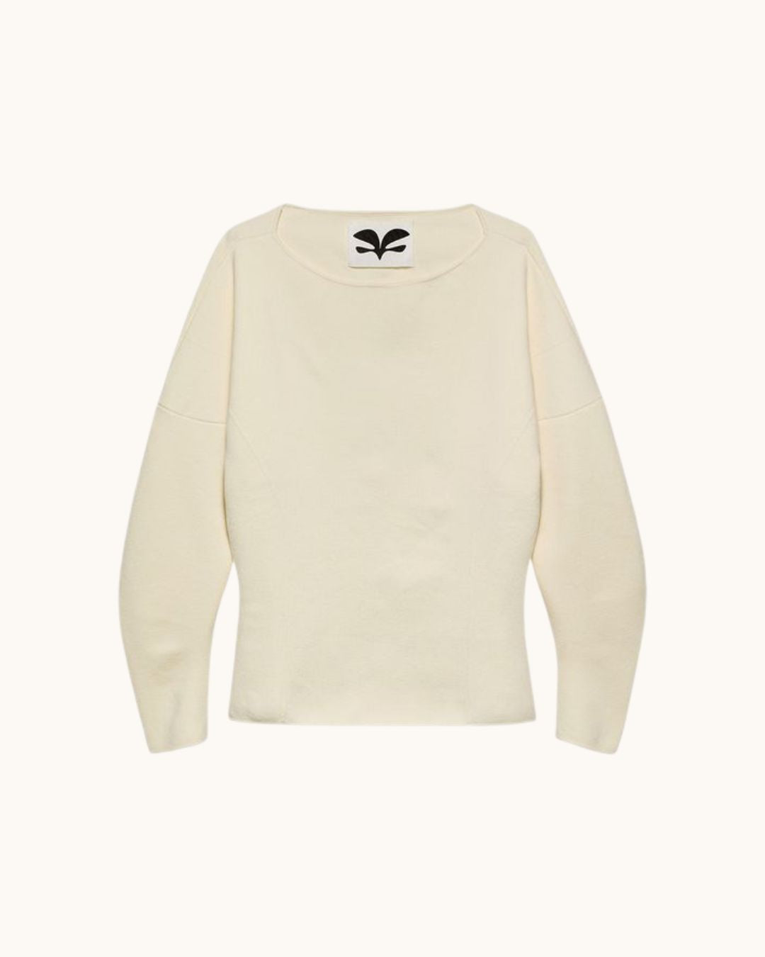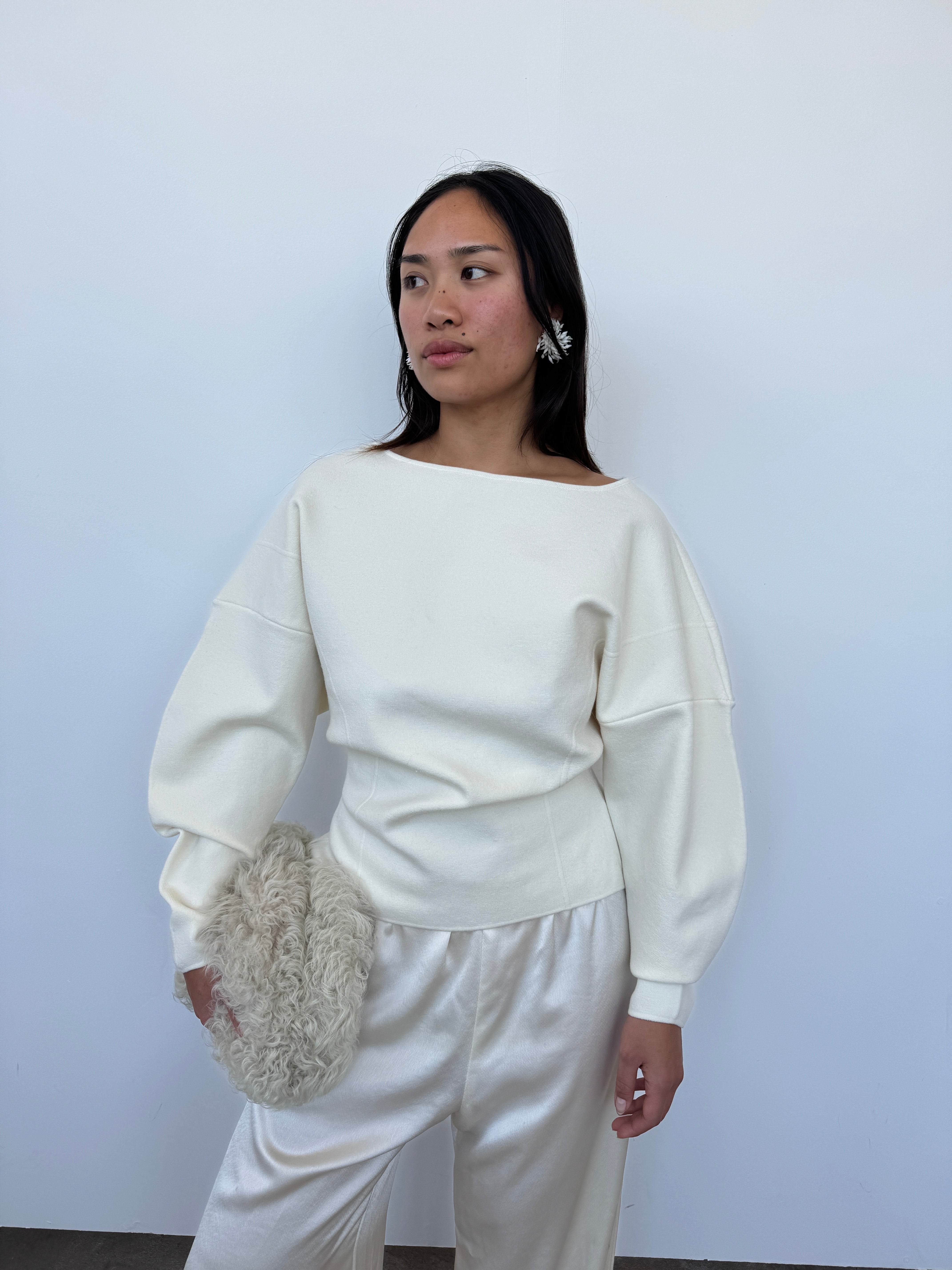 A sculptural silhouette, crafted from 100% extrafine merino wool with added Lycra for structure. Made in Italy, this sweater features a clean boat neckline, panel detailing, and voluminous sleeves that taper at the wrist. A contemporary essential with a soft yet sculpted drape.