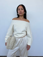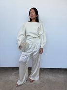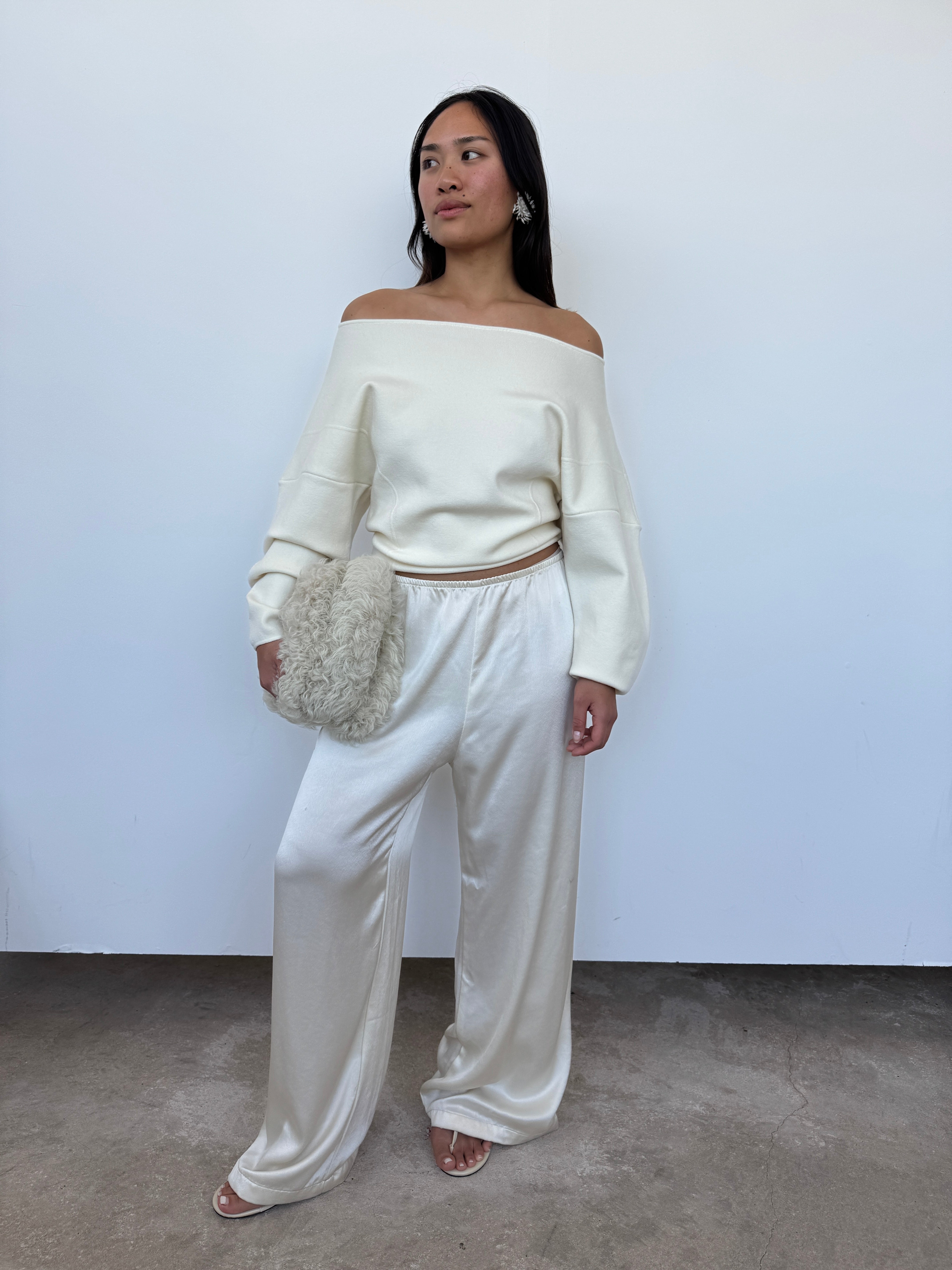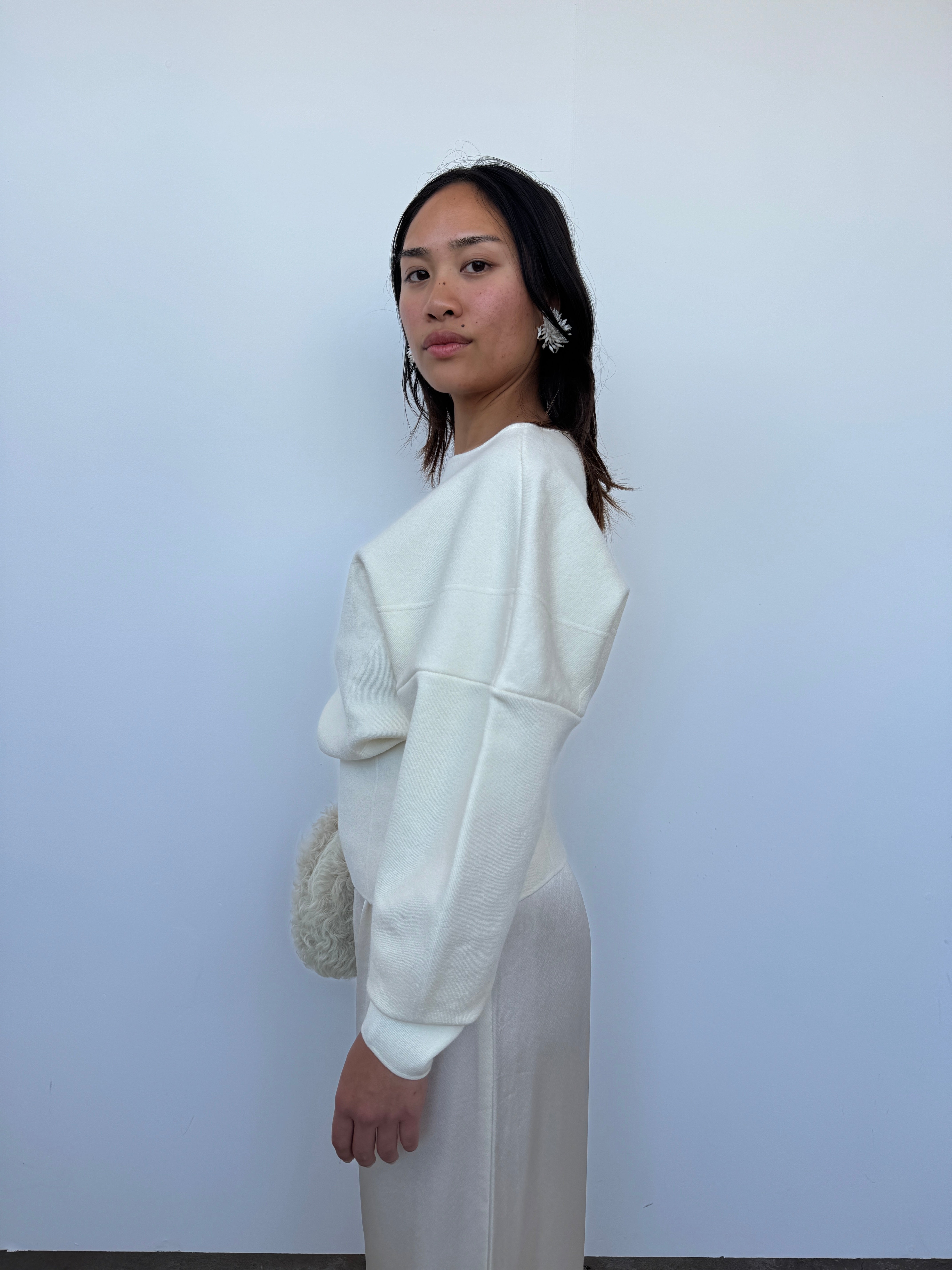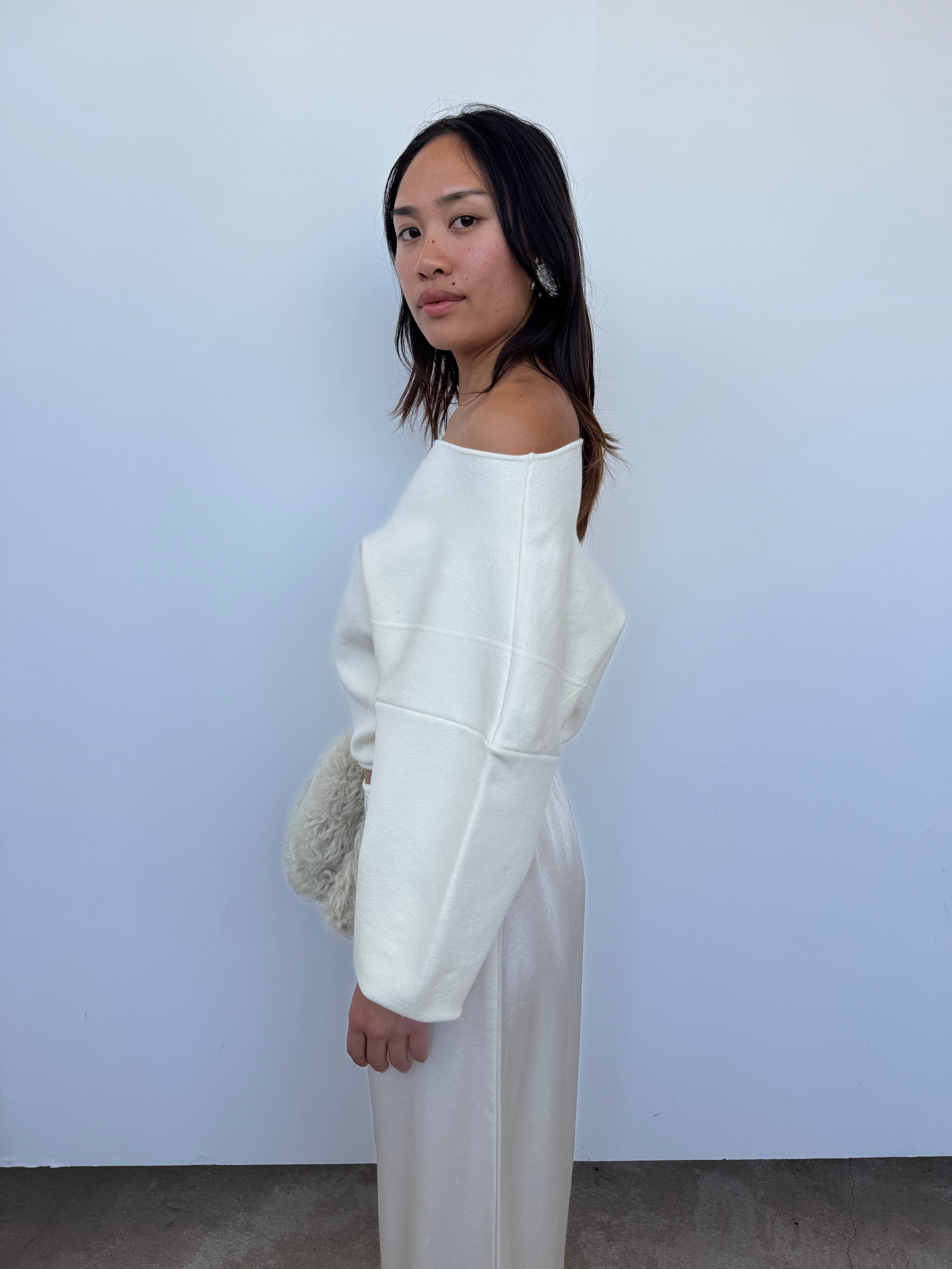 A sculptural silhouette, crafted from 100% extrafine merino wool with added Lycra for structure. Made in Italy, this sweater features a clean boat neckline, panel detailing, and voluminous sleeves that taper at the wrist. A contemporary essential with a soft yet sculpted drape.