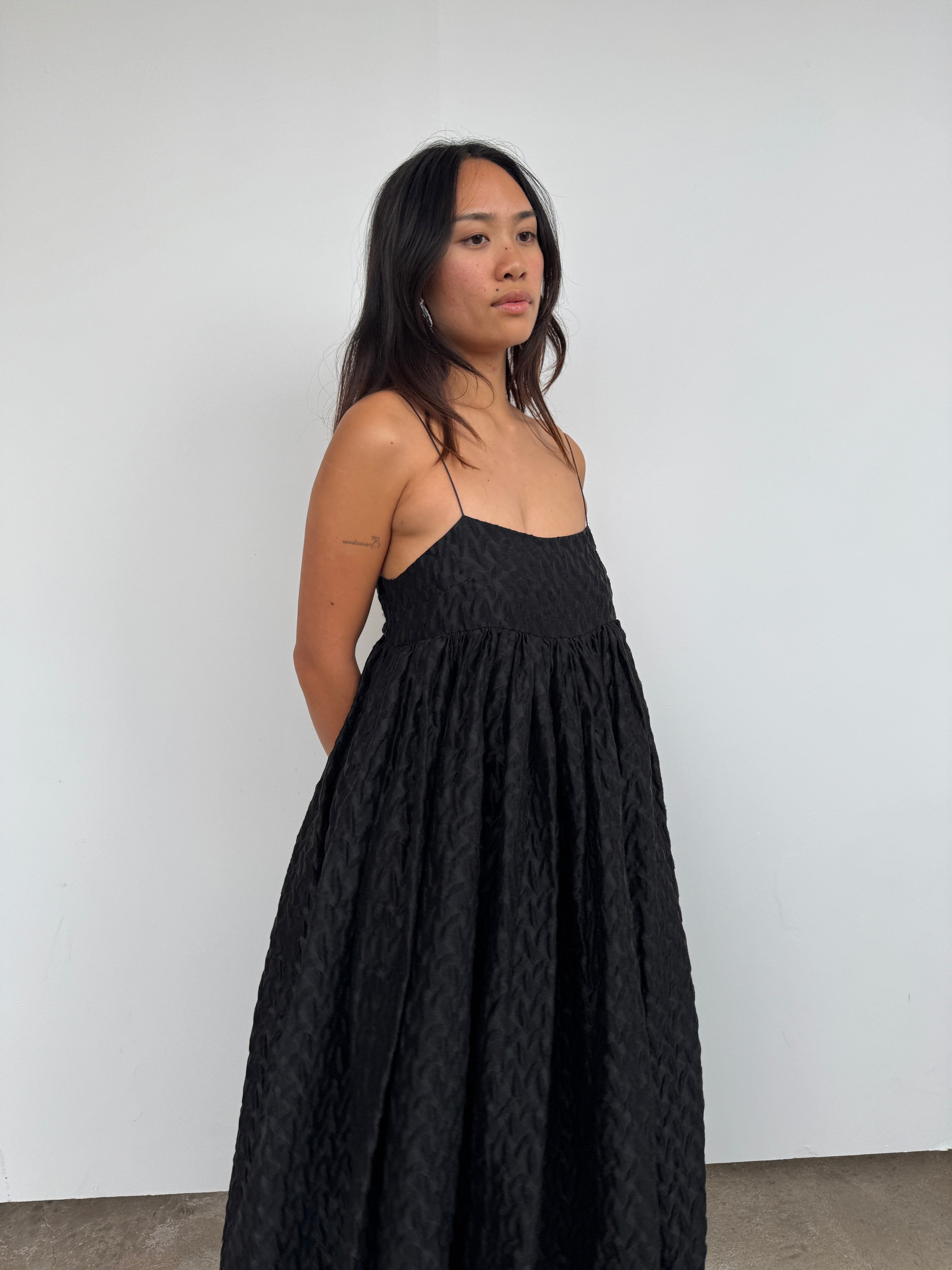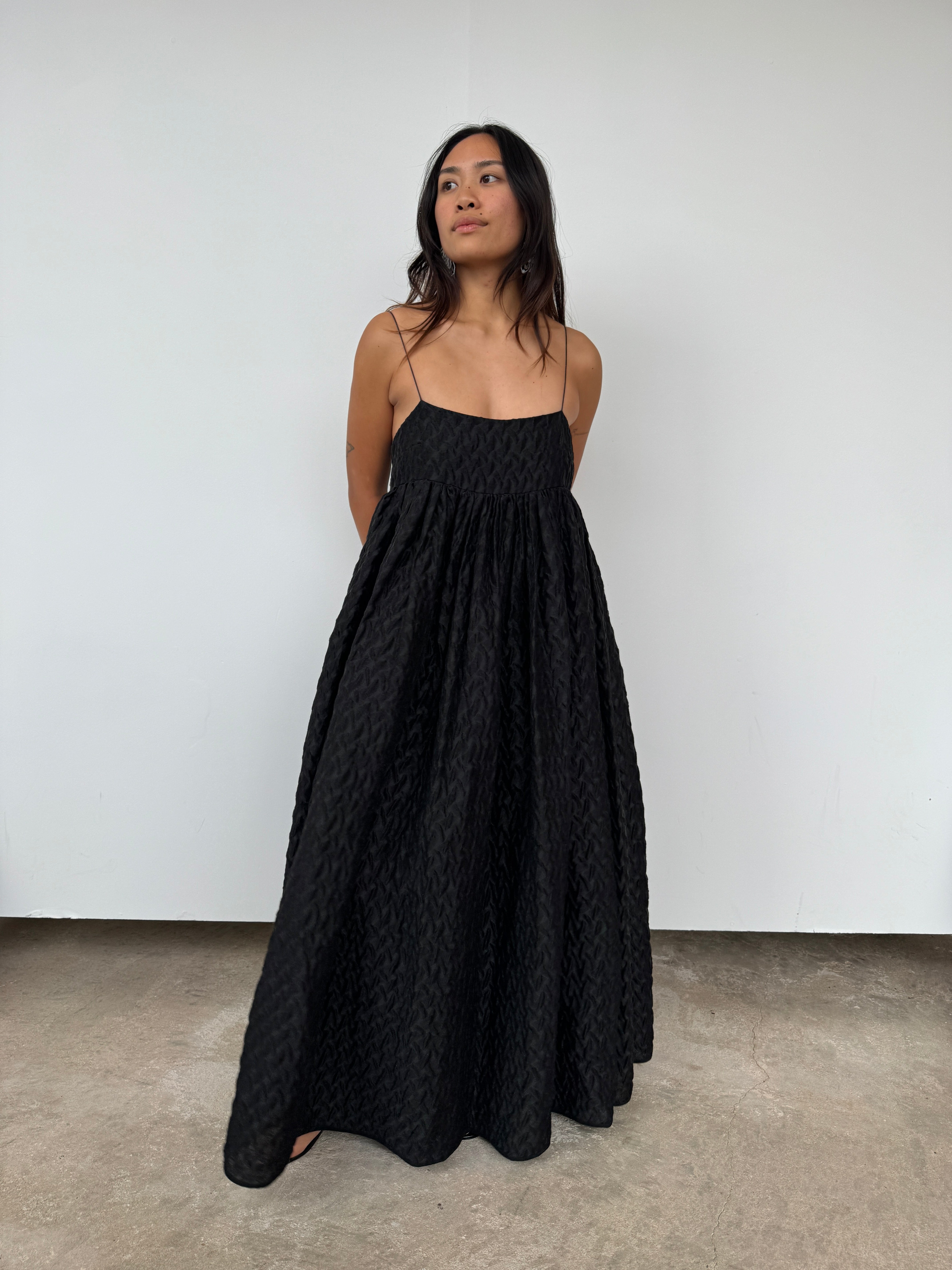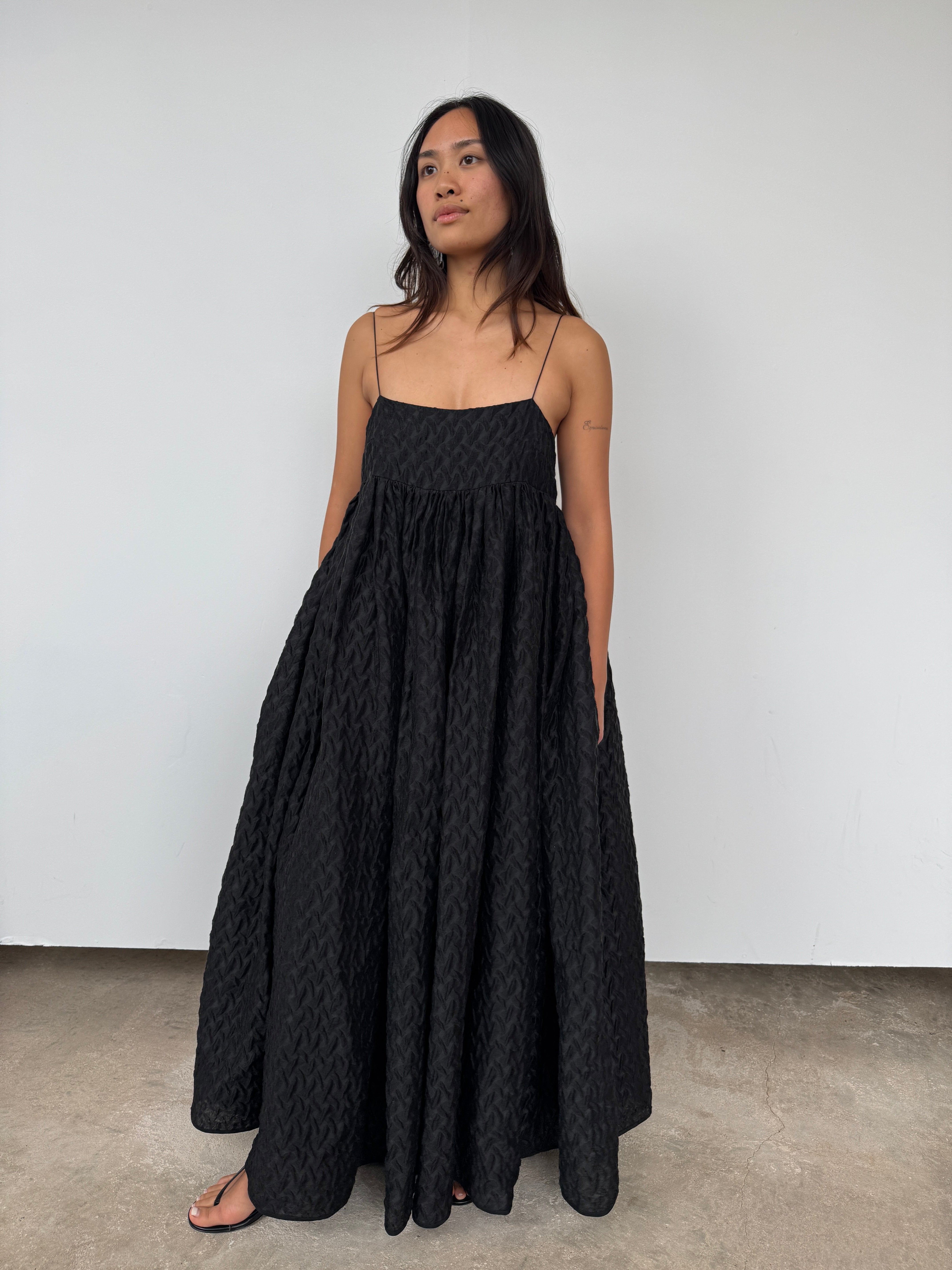 "Expressing Cecile Bahnsens appreciation for couture fabric, the Beth is crafted from an ethereal linen plissé in black. The minimalist silhouette balances a narrow bandeau with a voluminous skirt that falls to the ankle." - The perfect black dress.