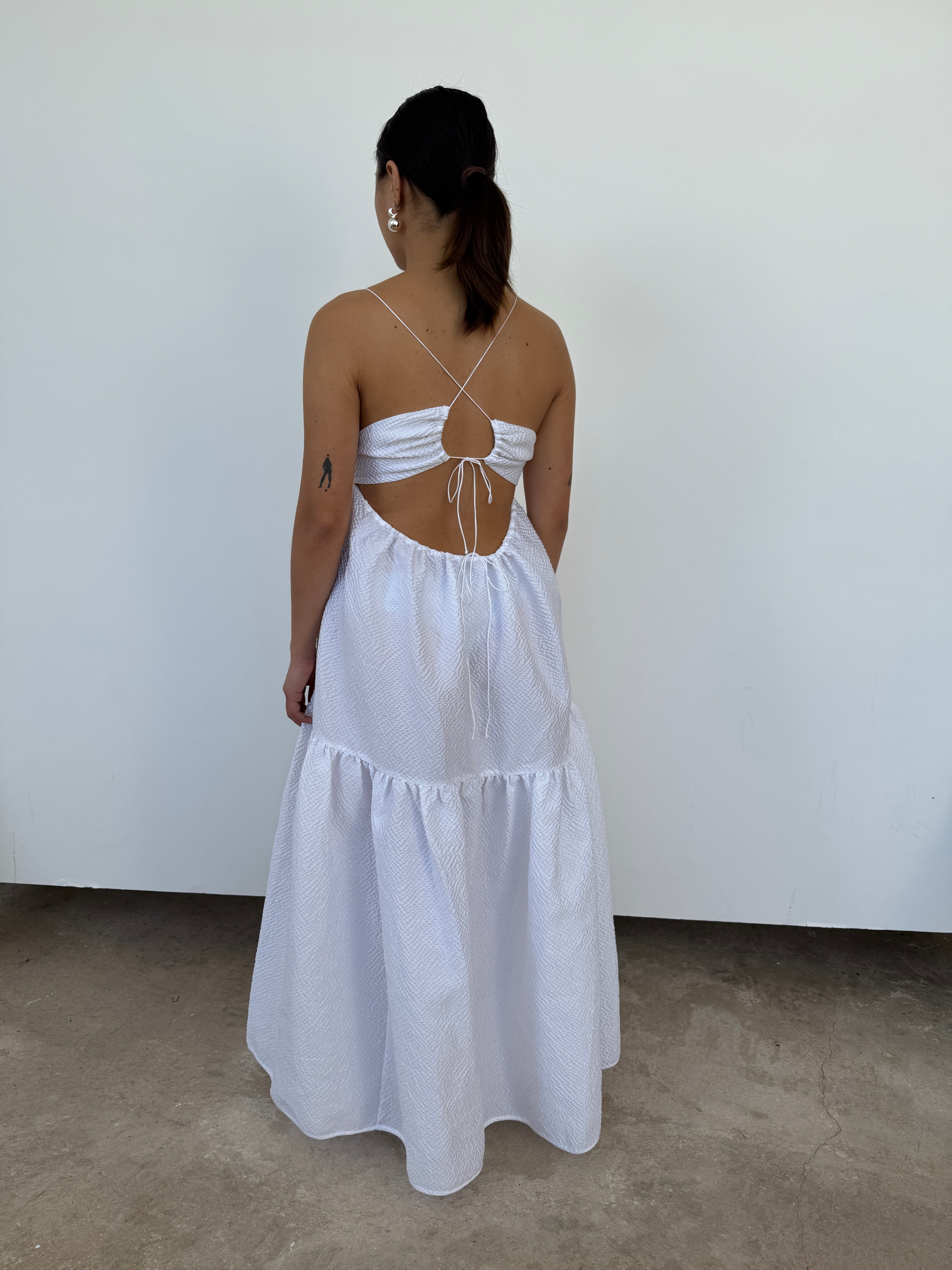 Straight-across the neckline, with spaghetti shoulder straps, all-over texture, flared skirt, and an exposed self-tie fastening at the back.
