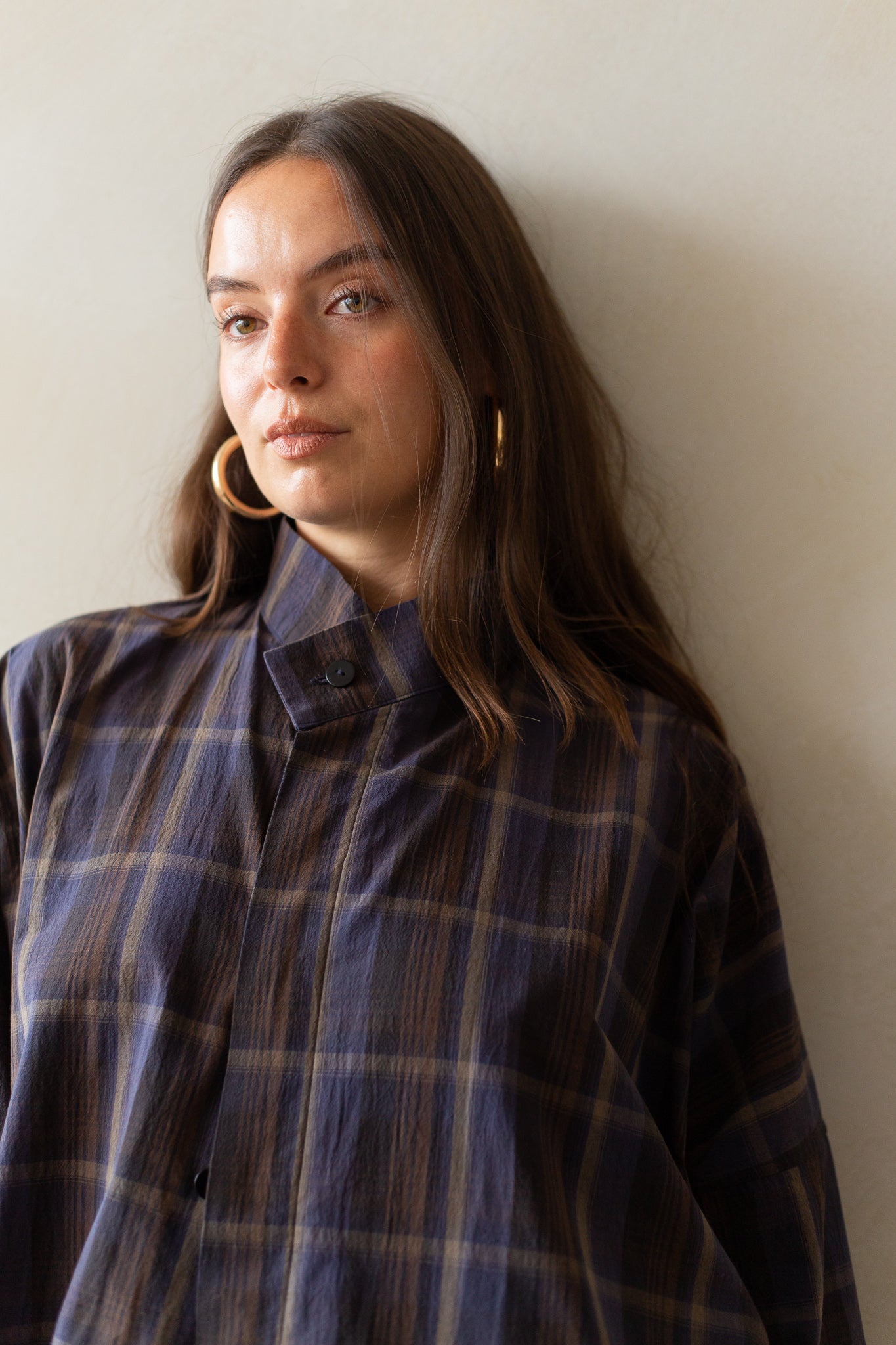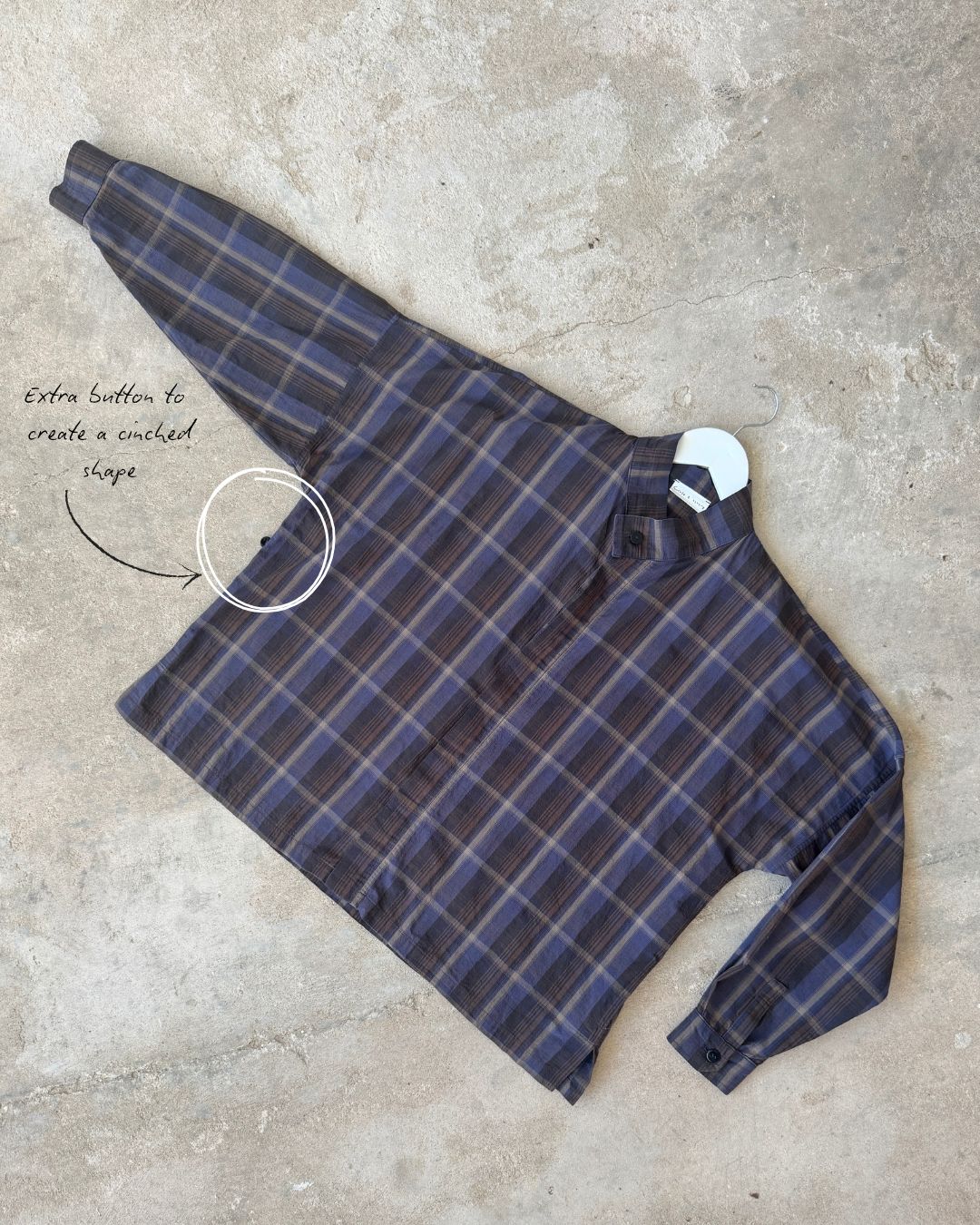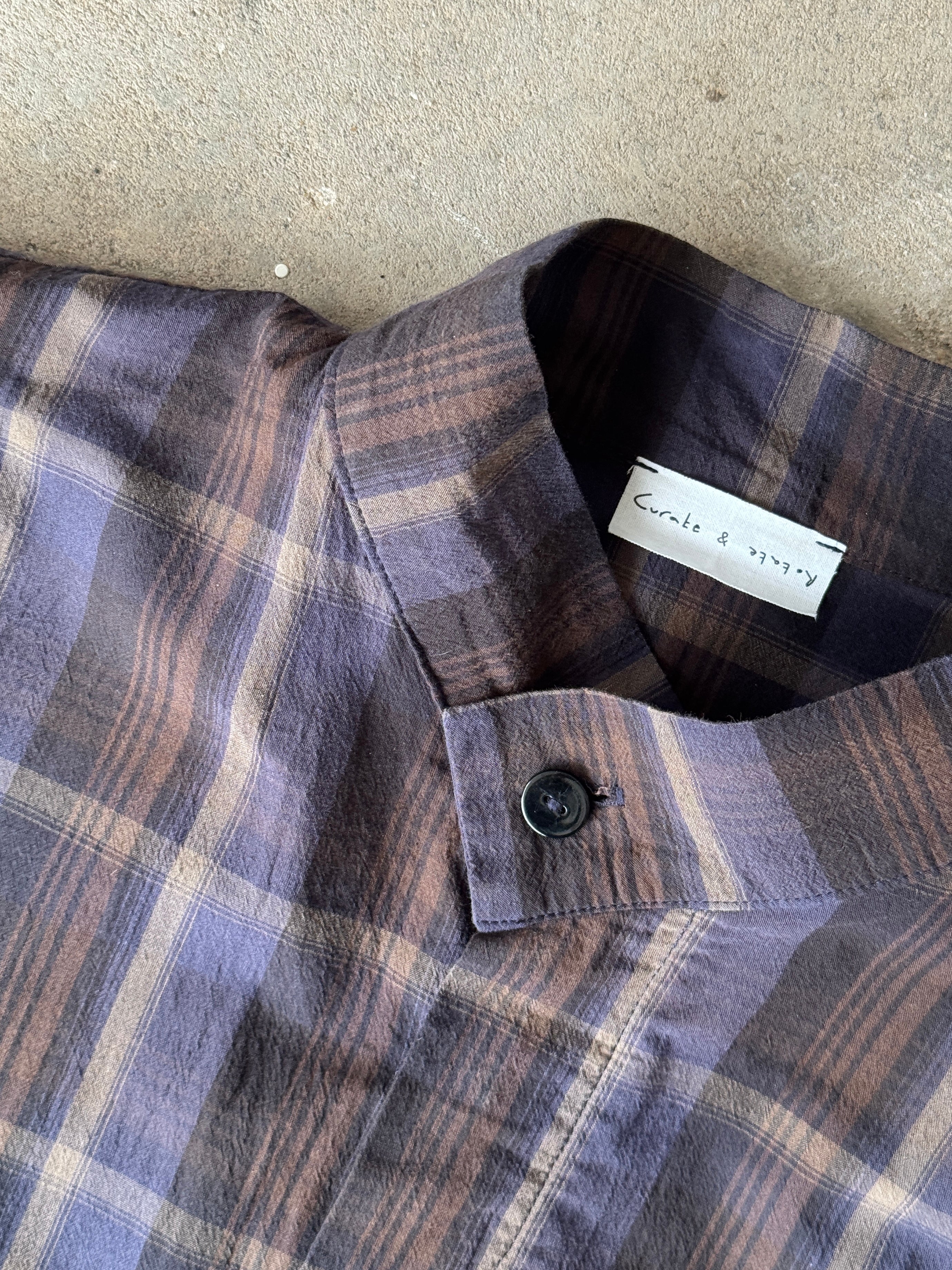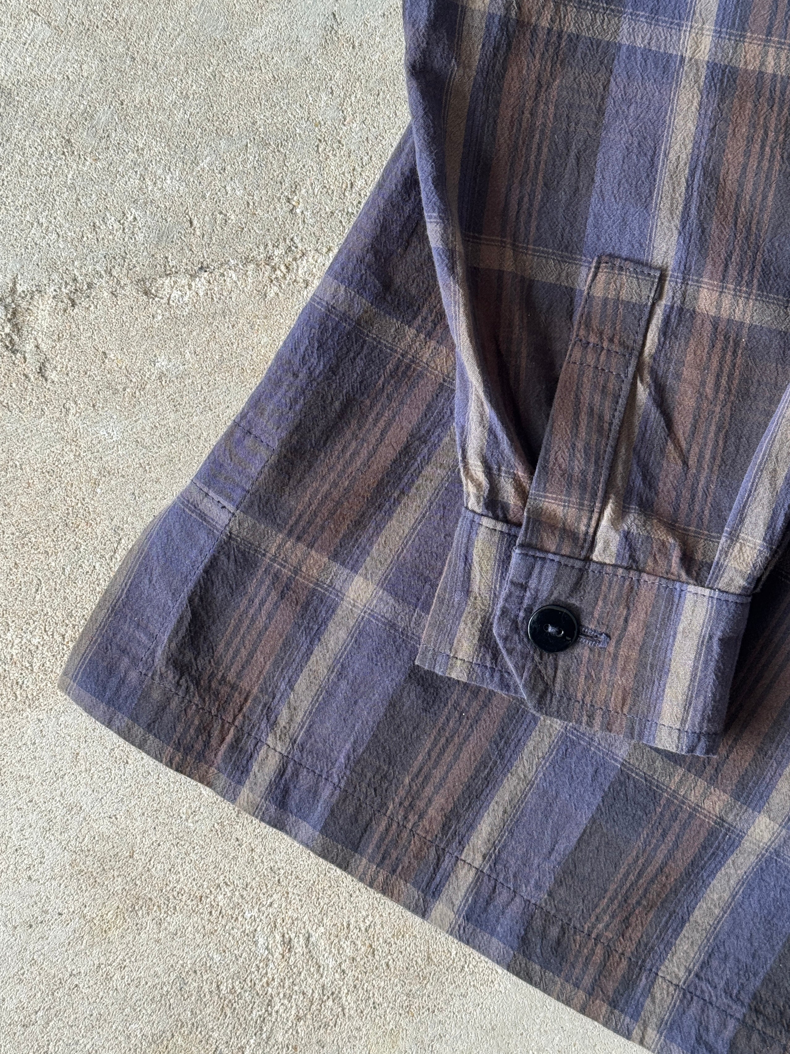 Crafted from end-of-roll Japanese cotton in a subtle check of violet blue, navy, and warm brown tones. The fabric is pre-washed at the mill, giving it a crinkled texture that adds structure and character to the shirt.
