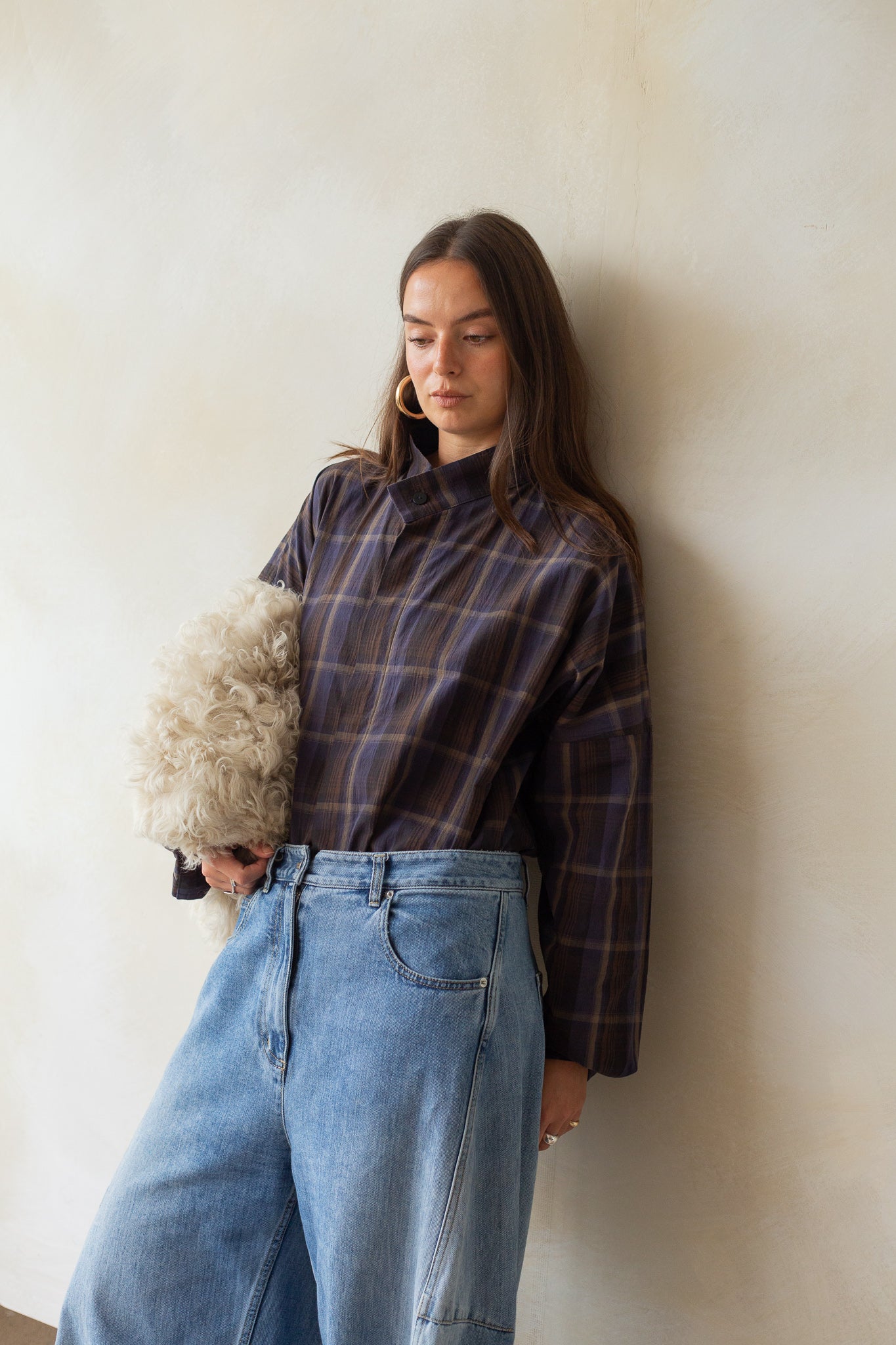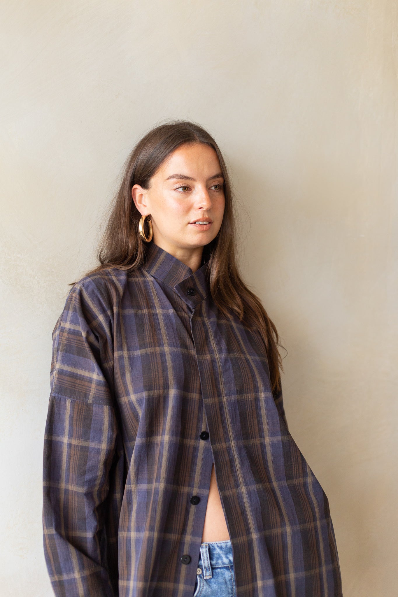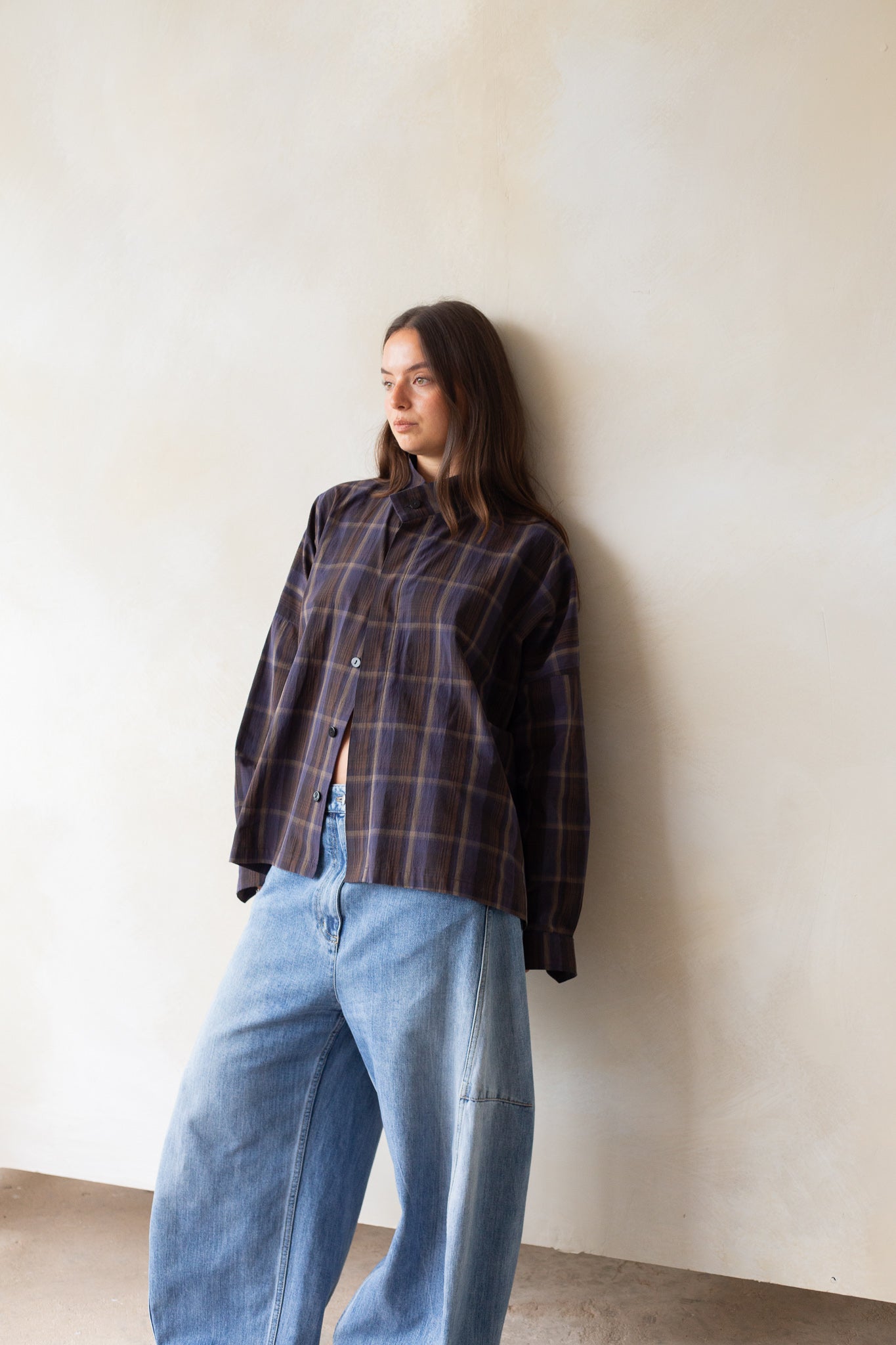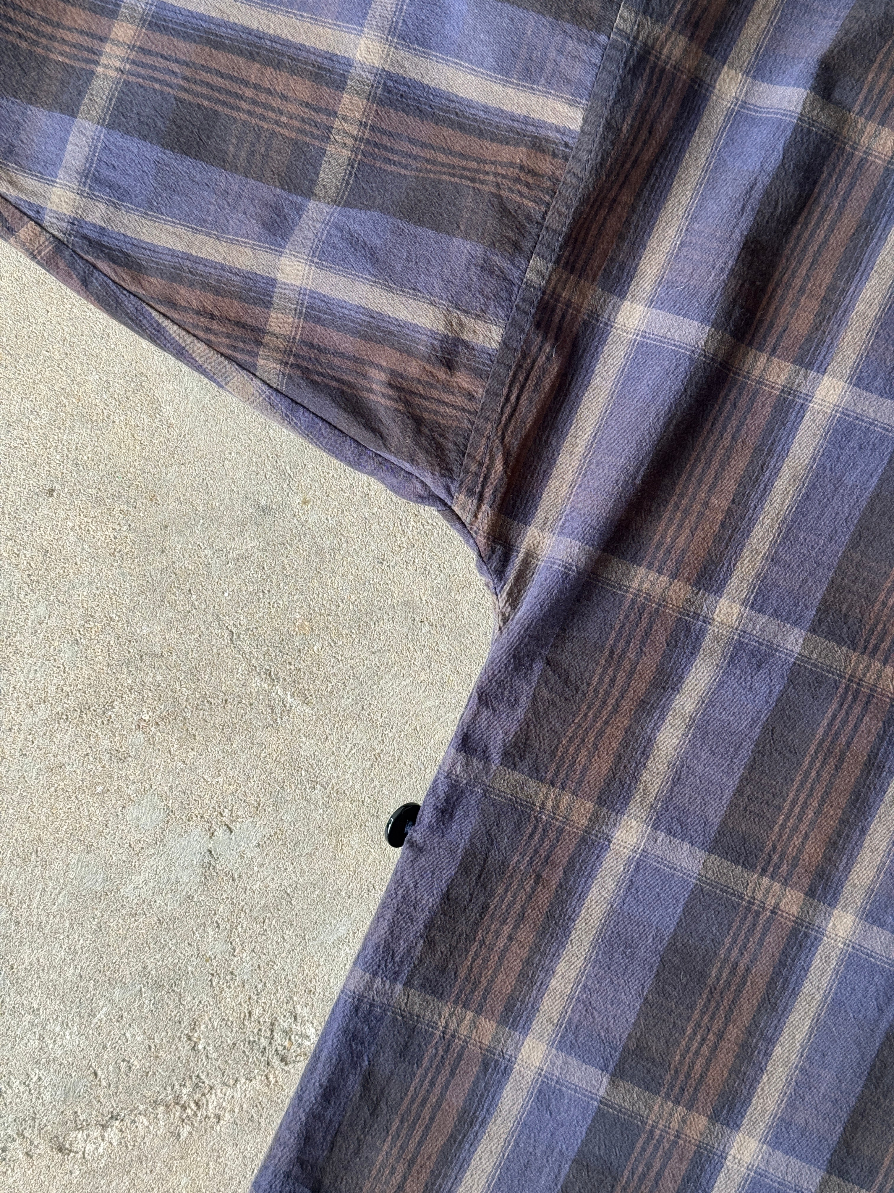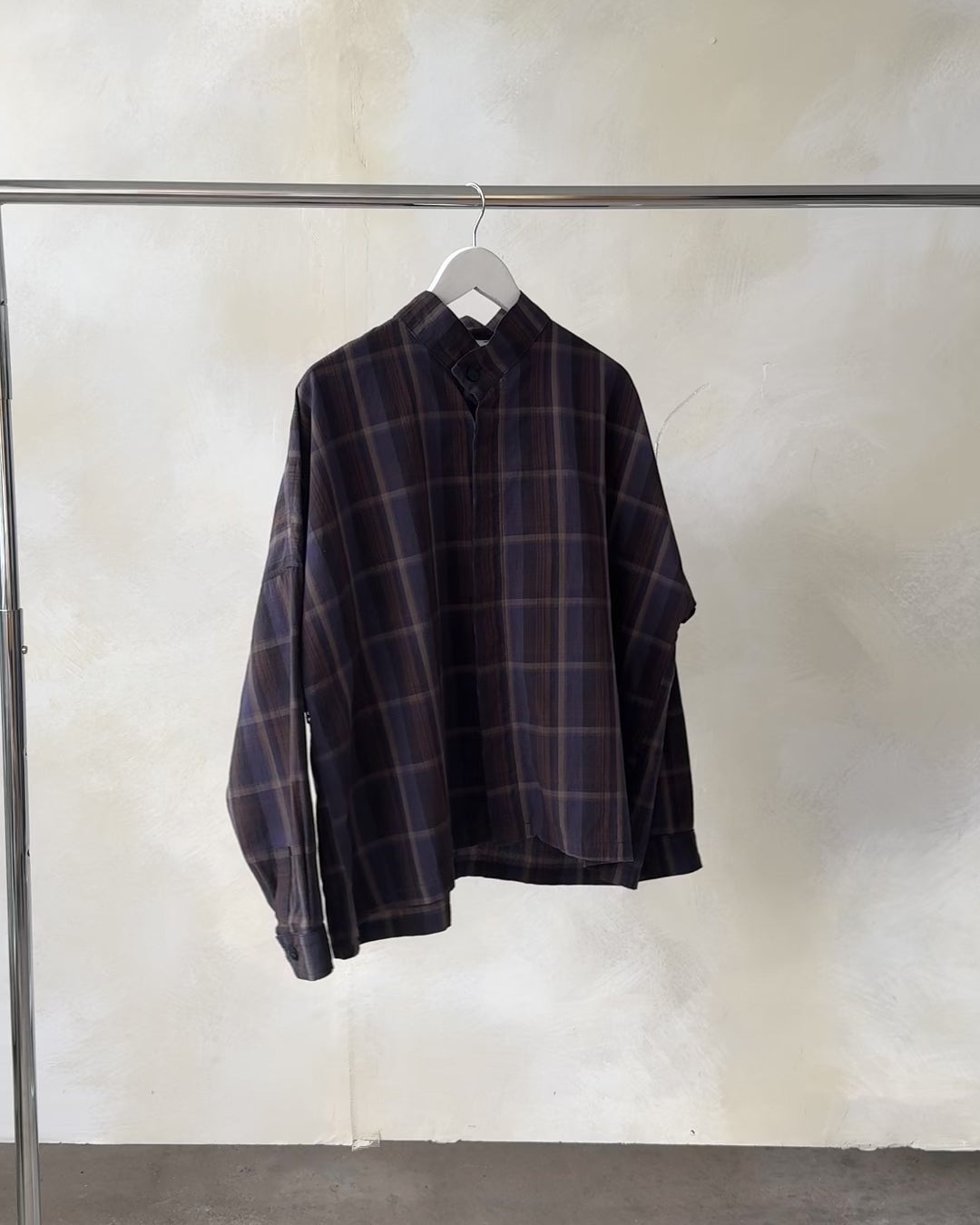 Crafted from end-of-roll Japanese cotton in a subtle check of violet blue, navy, and warm brown tones. The fabric is pre-washed at the mill, giving it a crinkled texture that adds structure and character to the shirt.