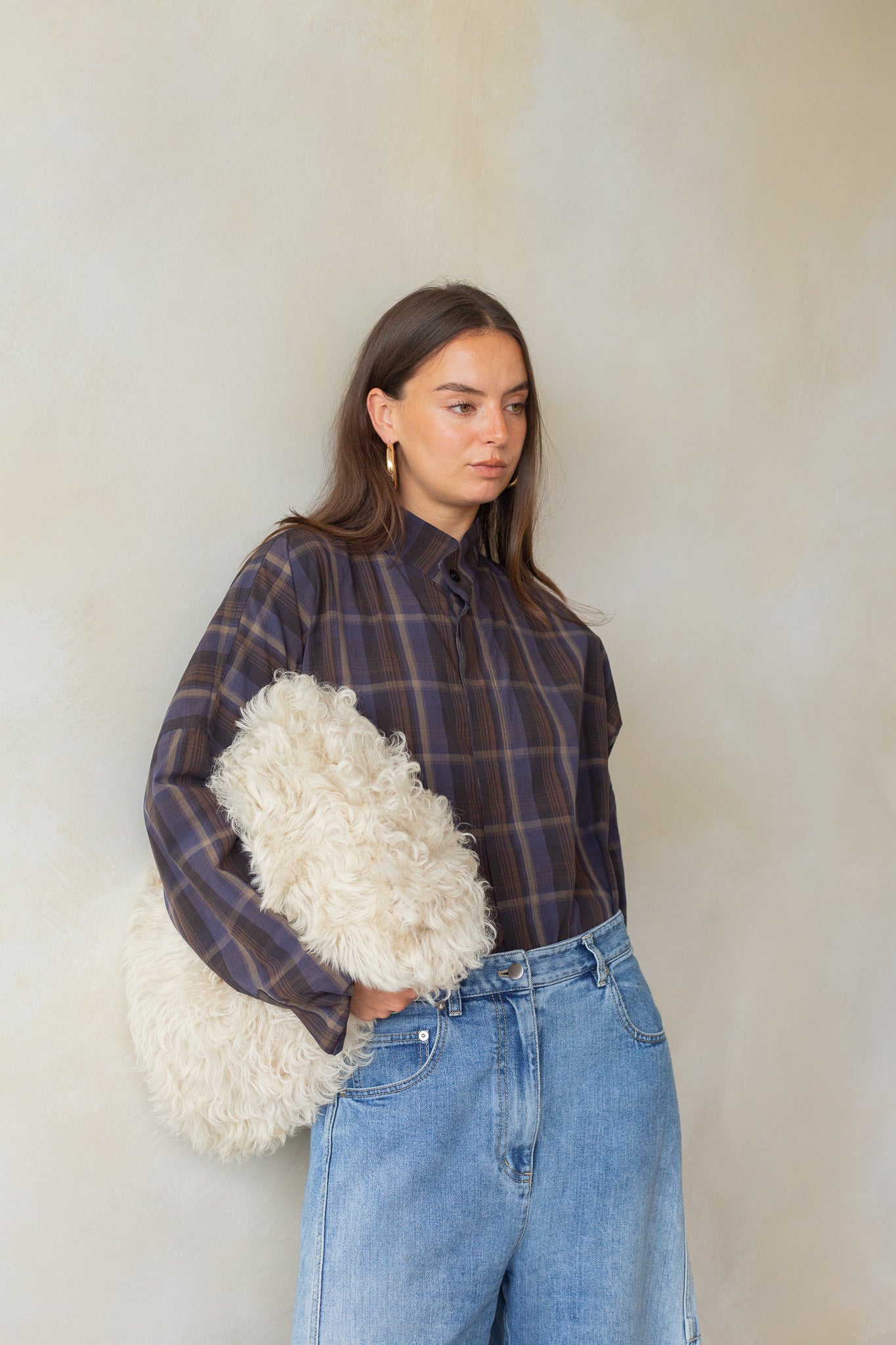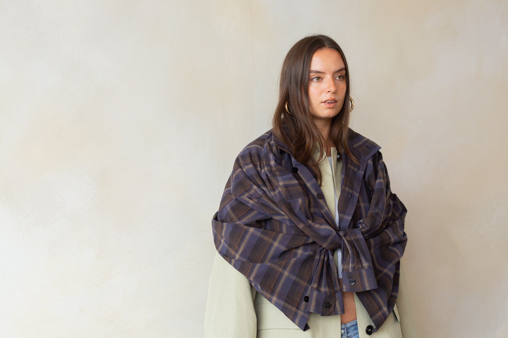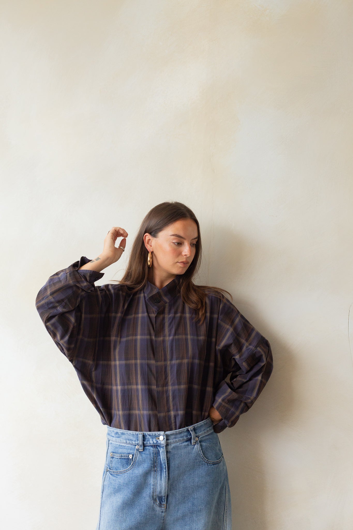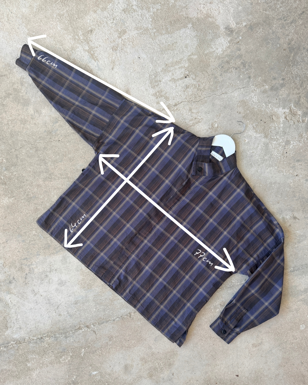 Crafted from end-of-roll Japanese cotton in a subtle check of violet blue, navy, and warm brown tones. The fabric is pre-washed at the mill, giving it a crinkled texture that adds structure and character to the shirt.