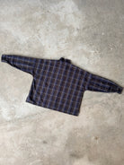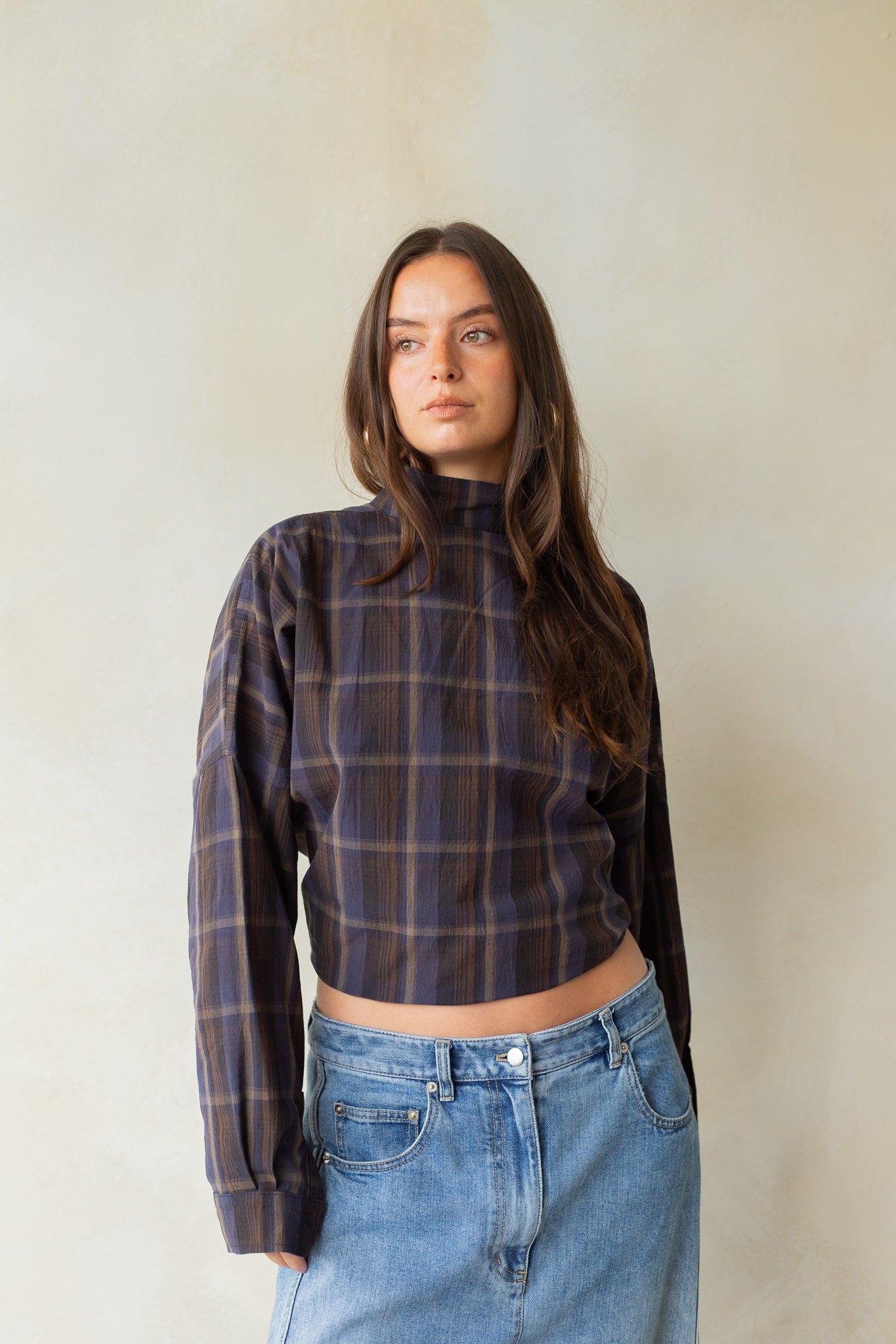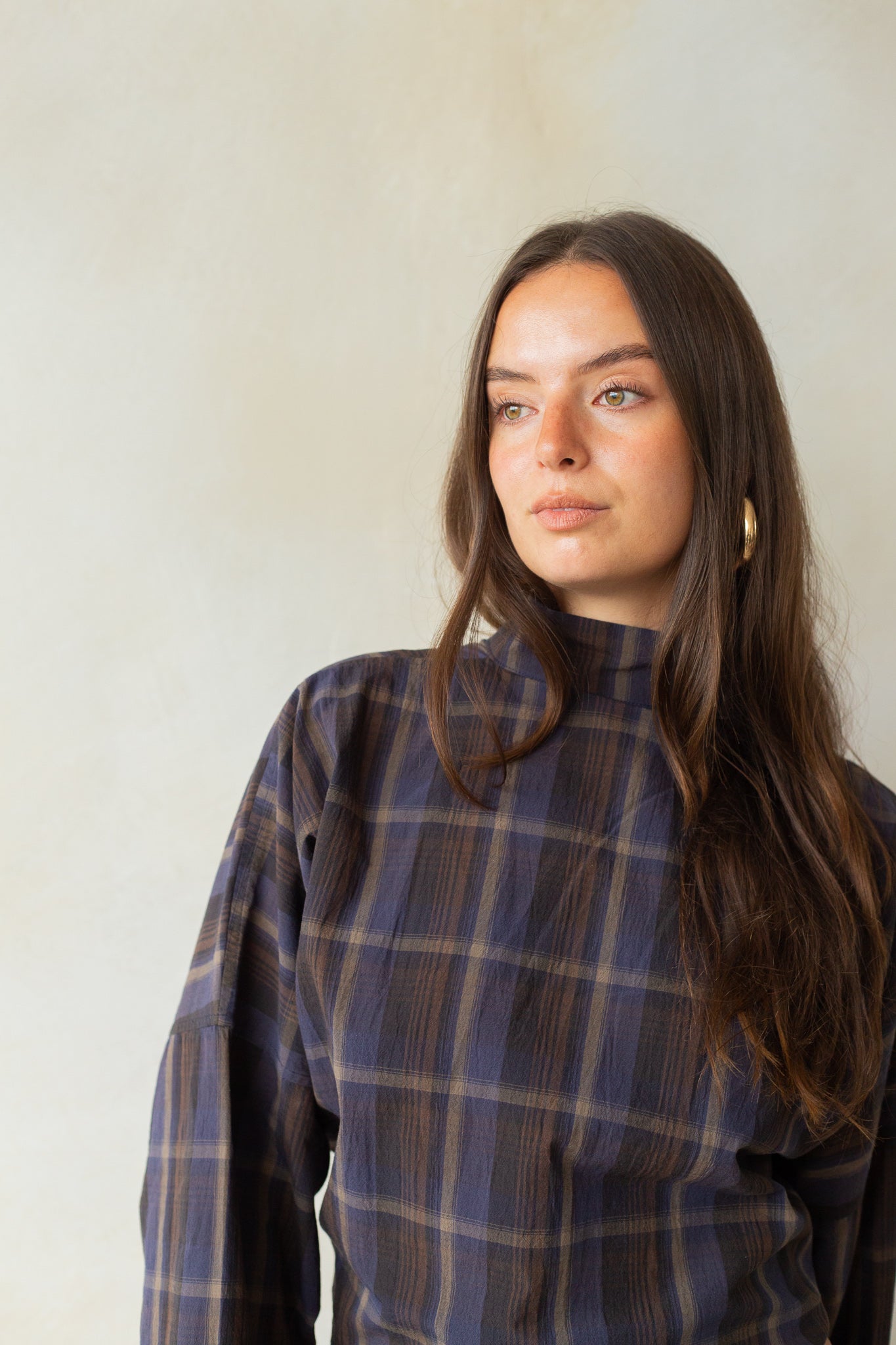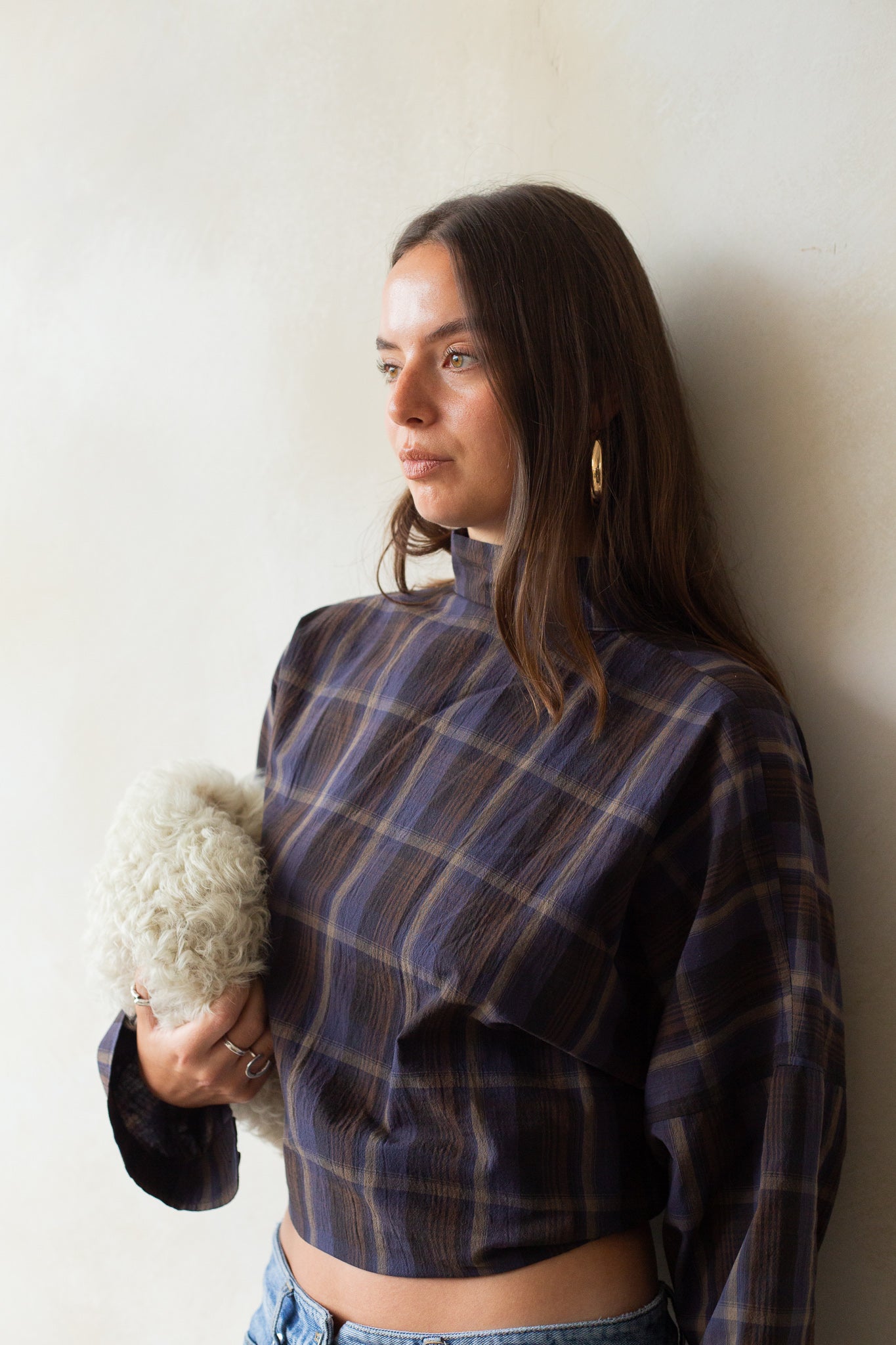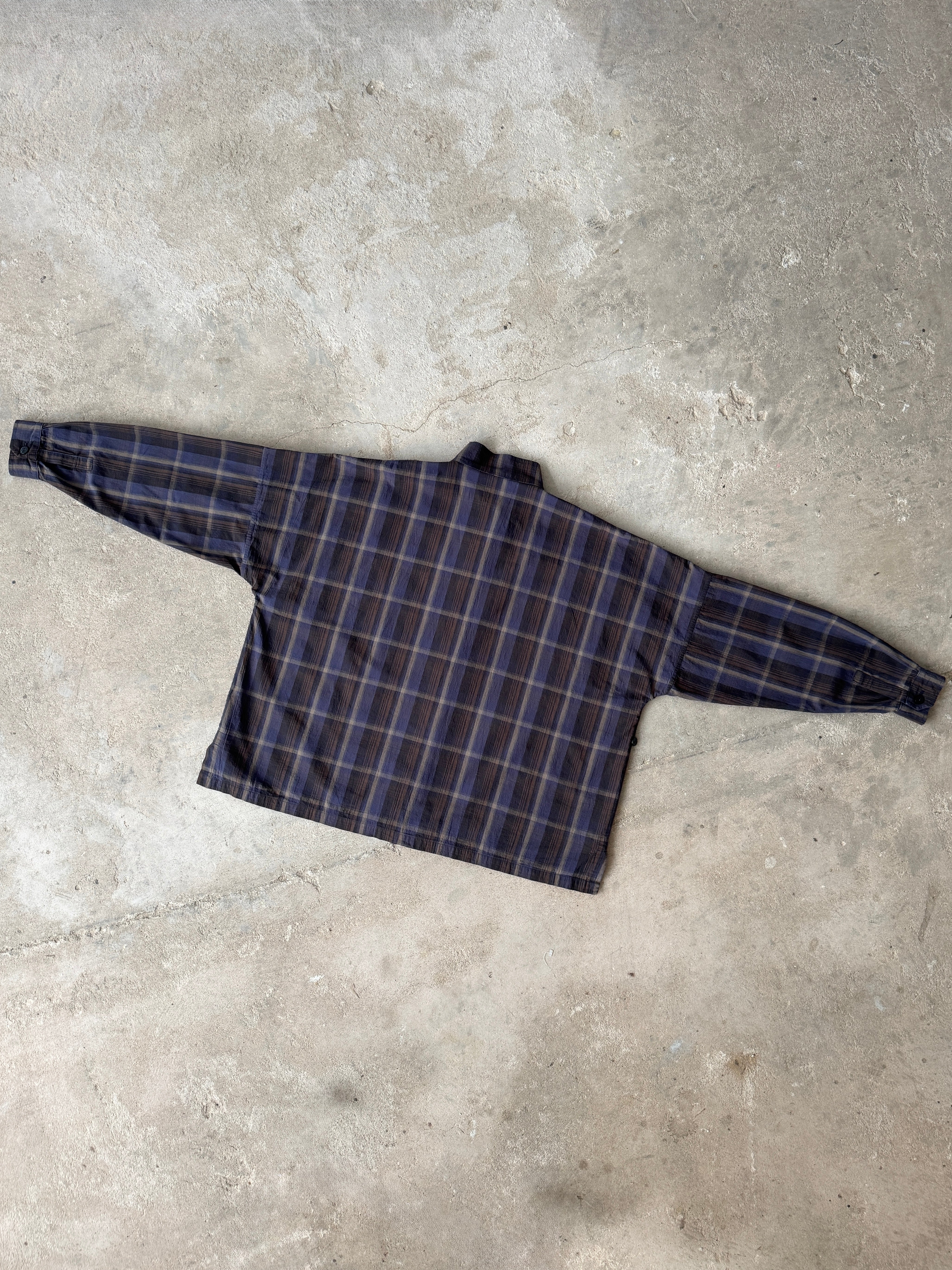 Crafted from end-of-roll Japanese cotton in a subtle check of violet blue, navy, and warm brown tones. The fabric is pre-washed at the mill, giving it a crinkled texture that adds structure and character to the shirt.