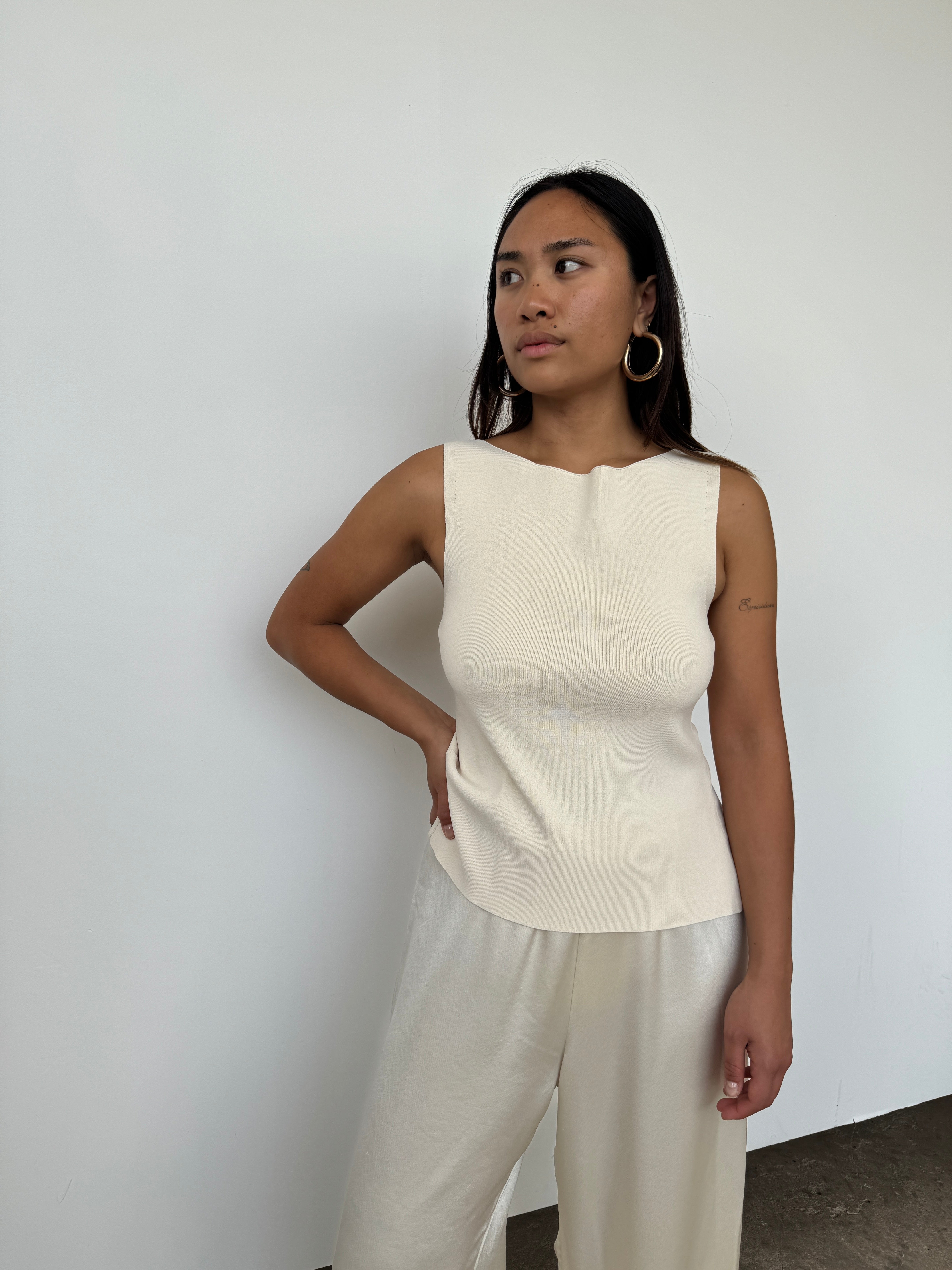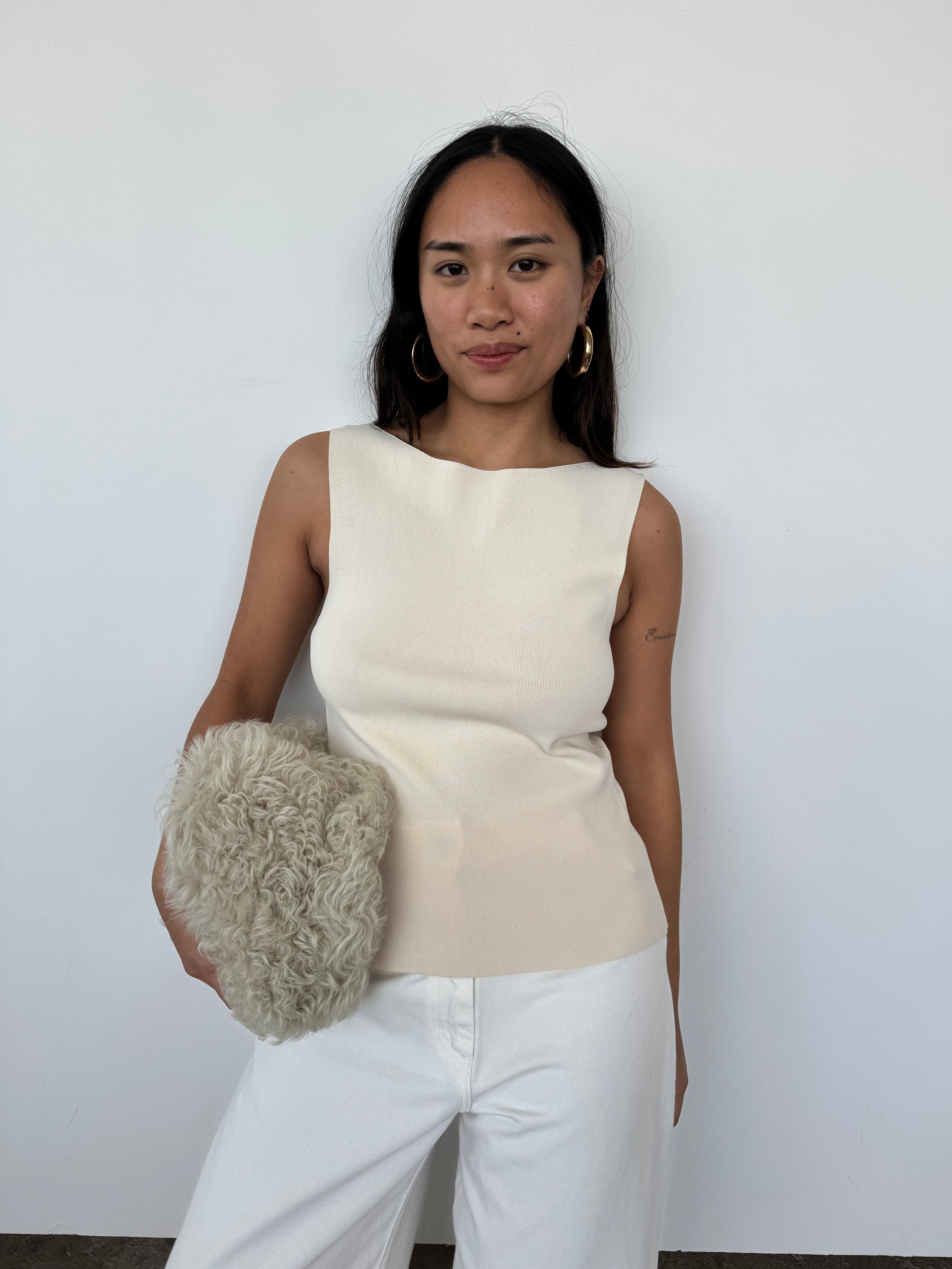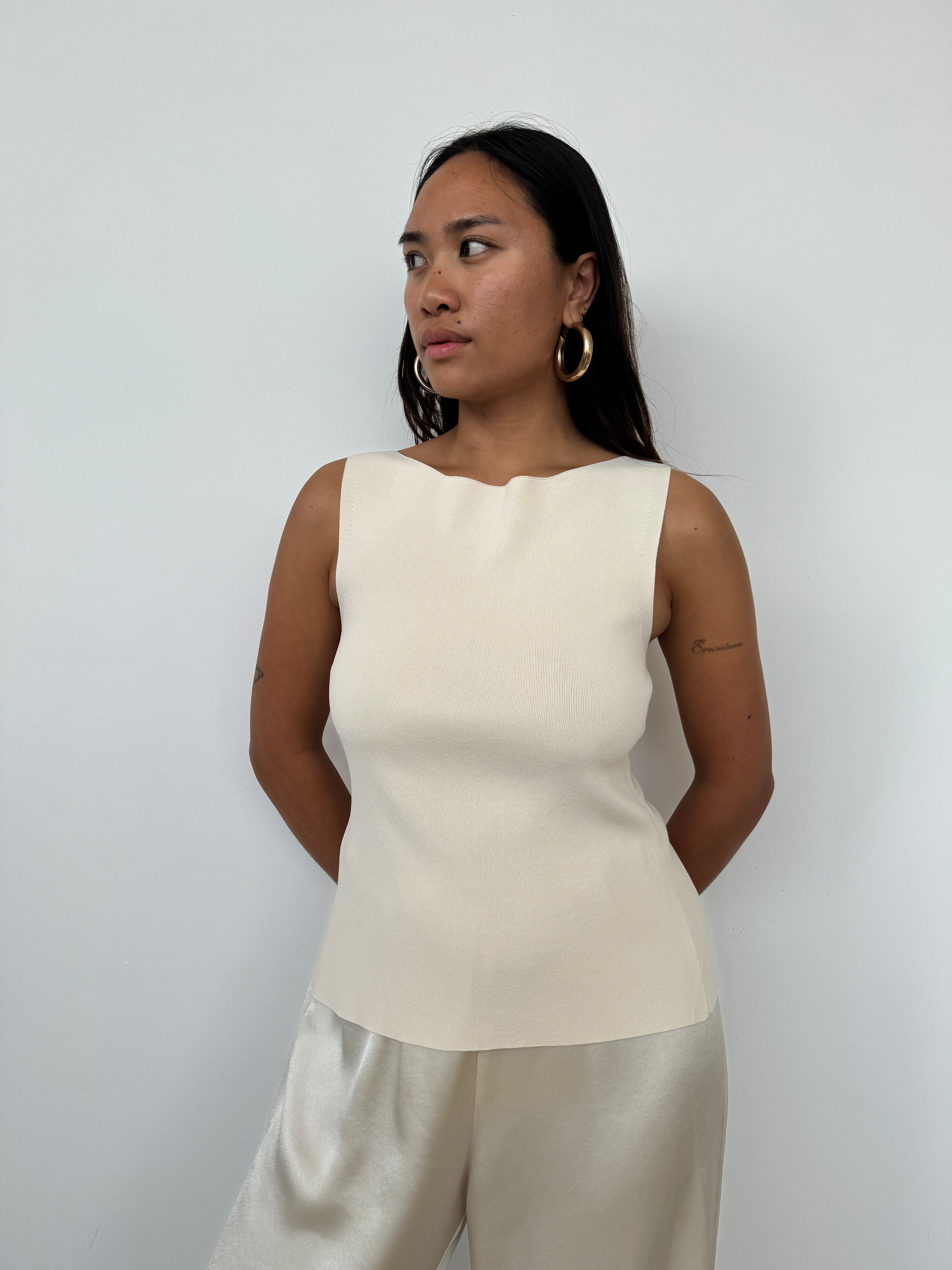 "Sleeveless top in a softly structured fine-knit rayon blend with a boat neck and slim-fitting frame. Characterized by cut-out detailing and ties at the back."