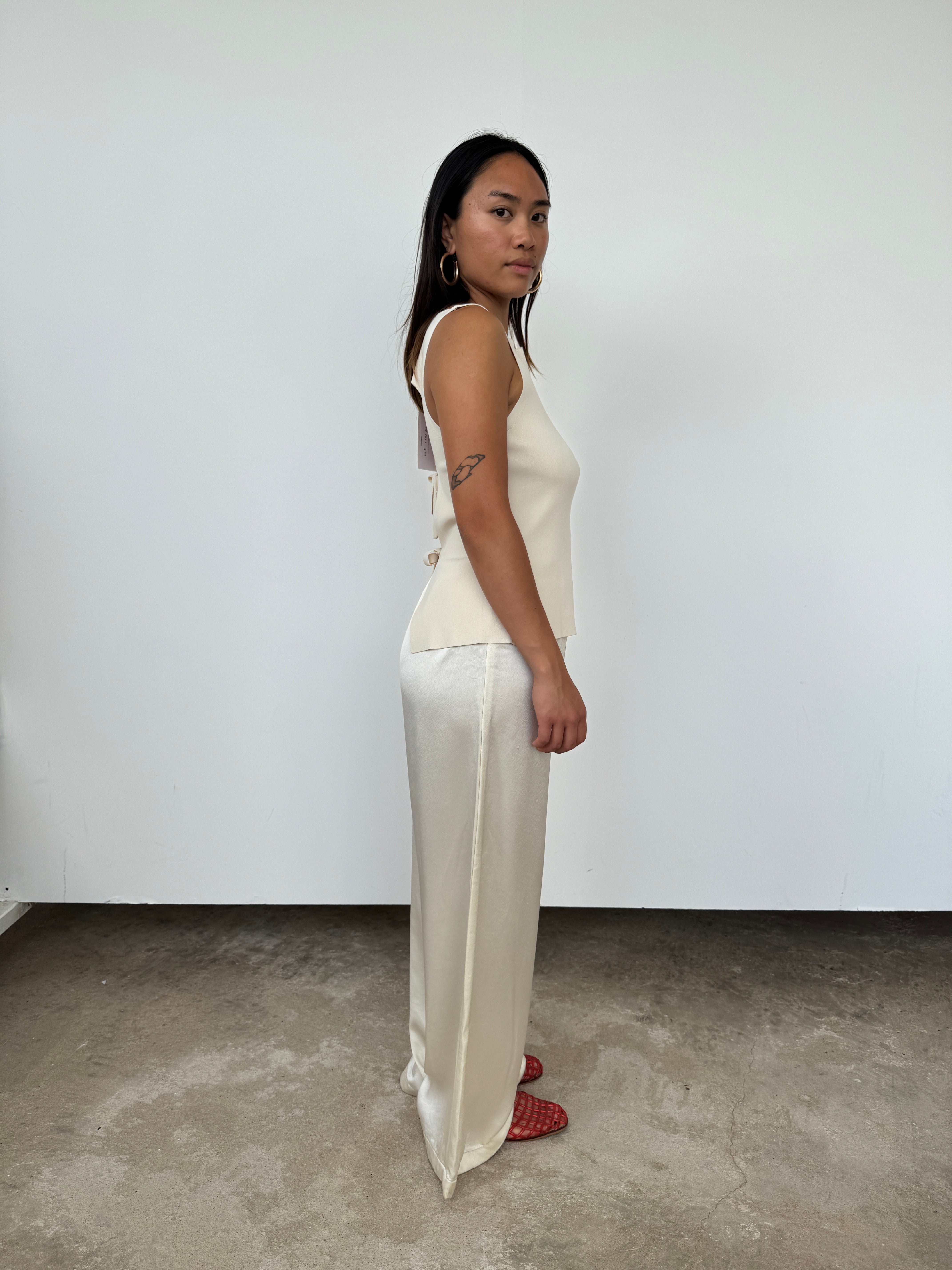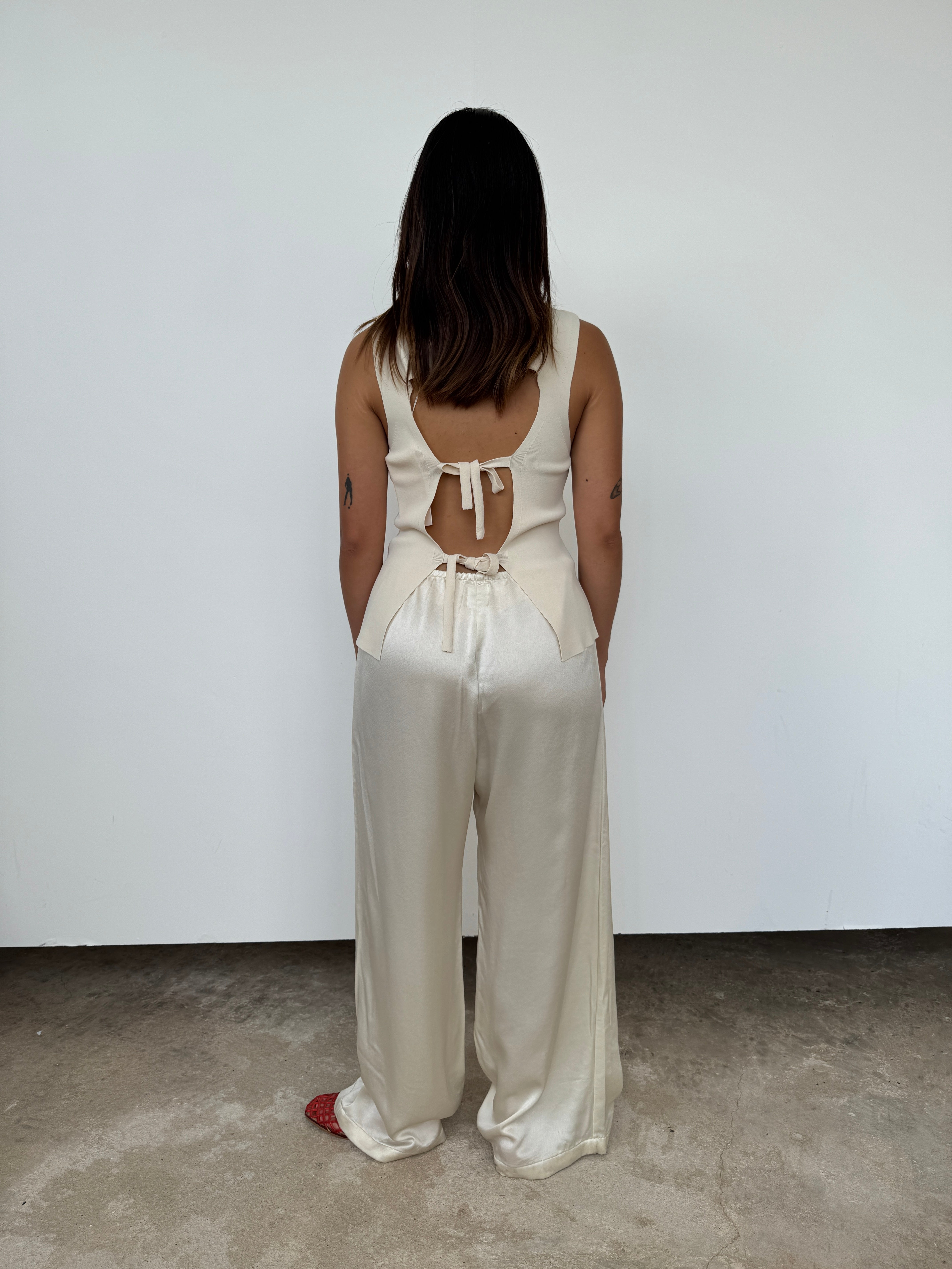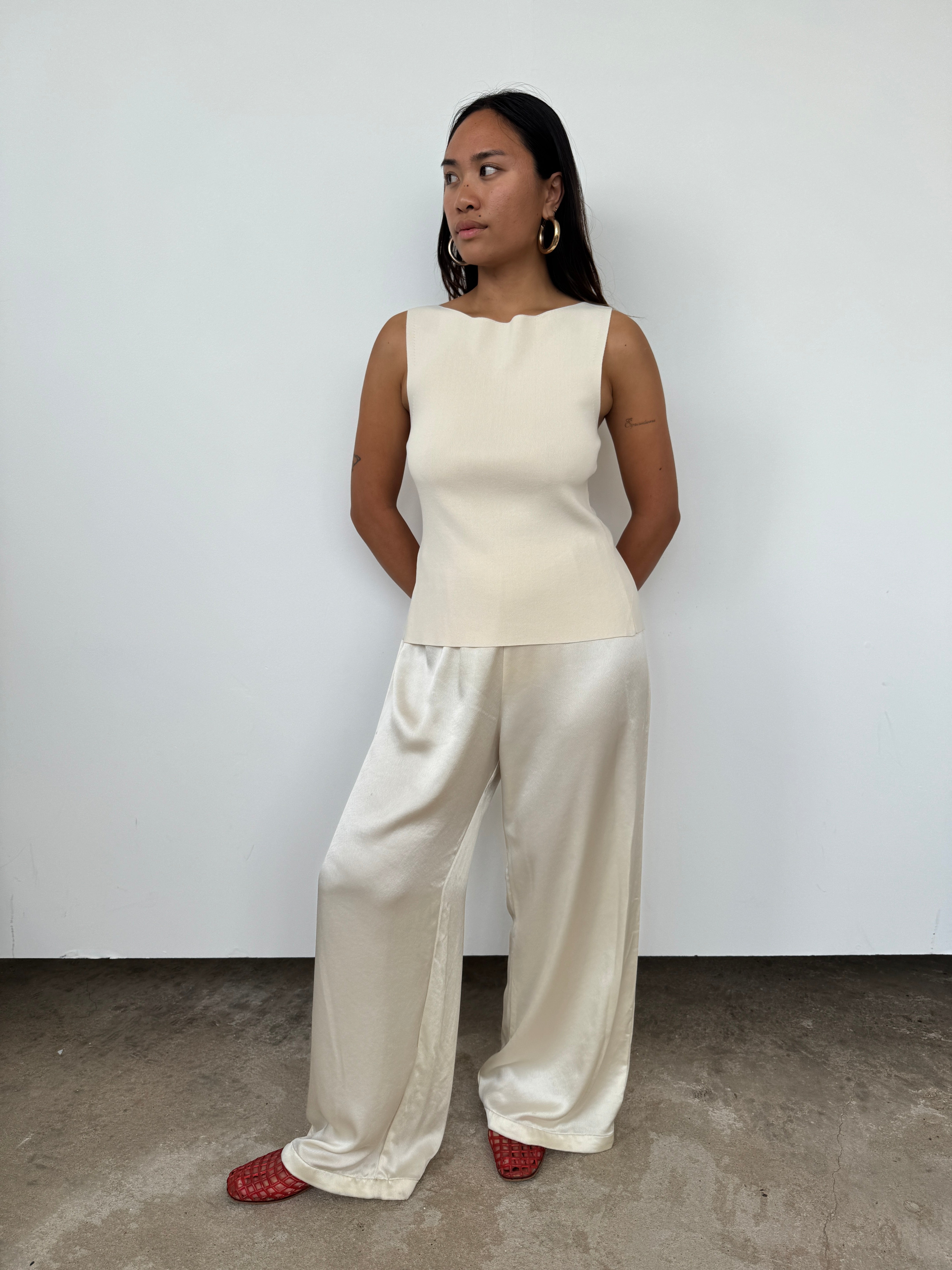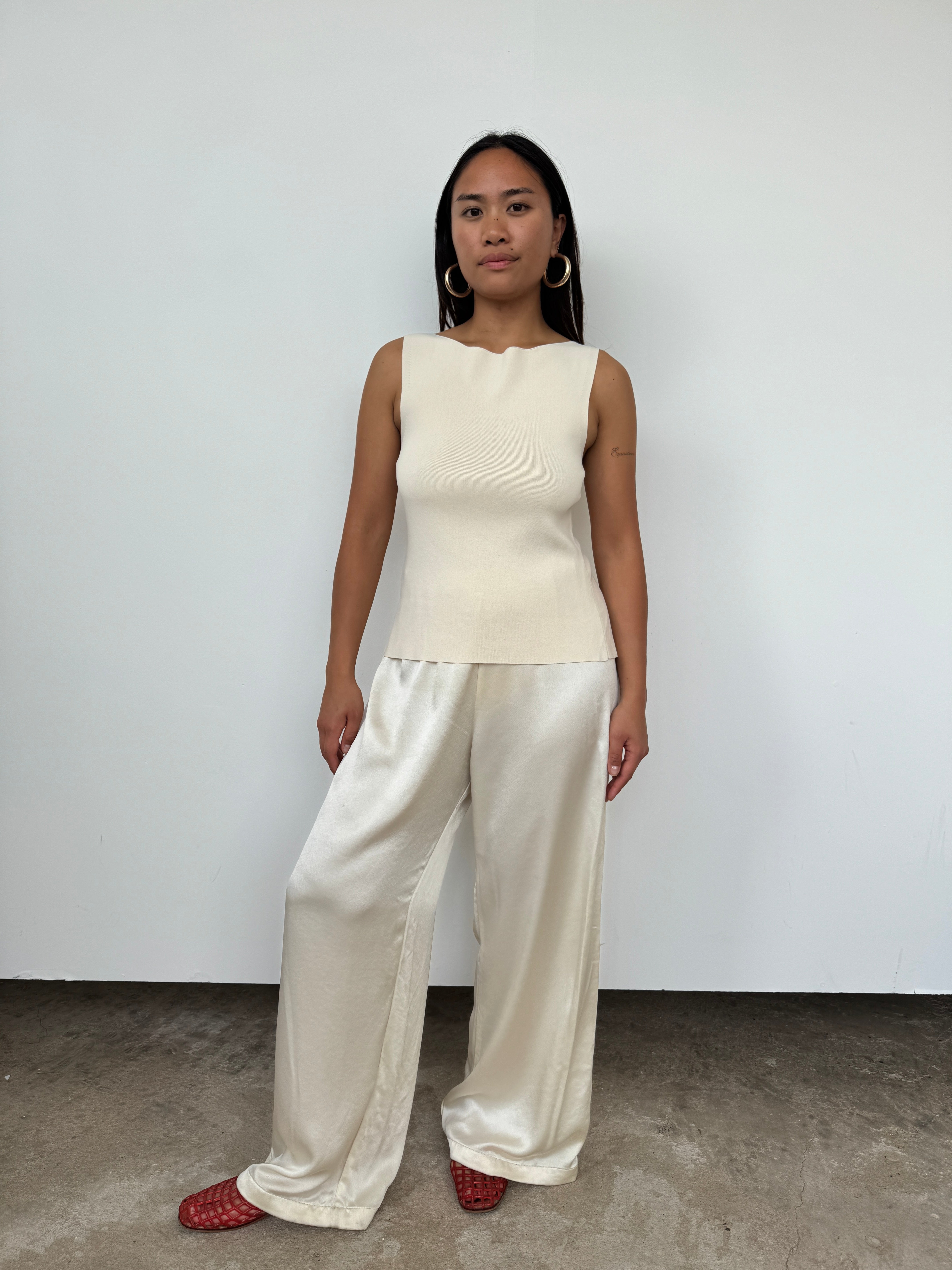 "Sleeveless top in a softly structured fine-knit rayon blend with a boat neck and slim-fitting frame. Characterized by cut-out detailing and ties at the back."