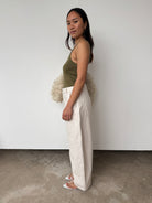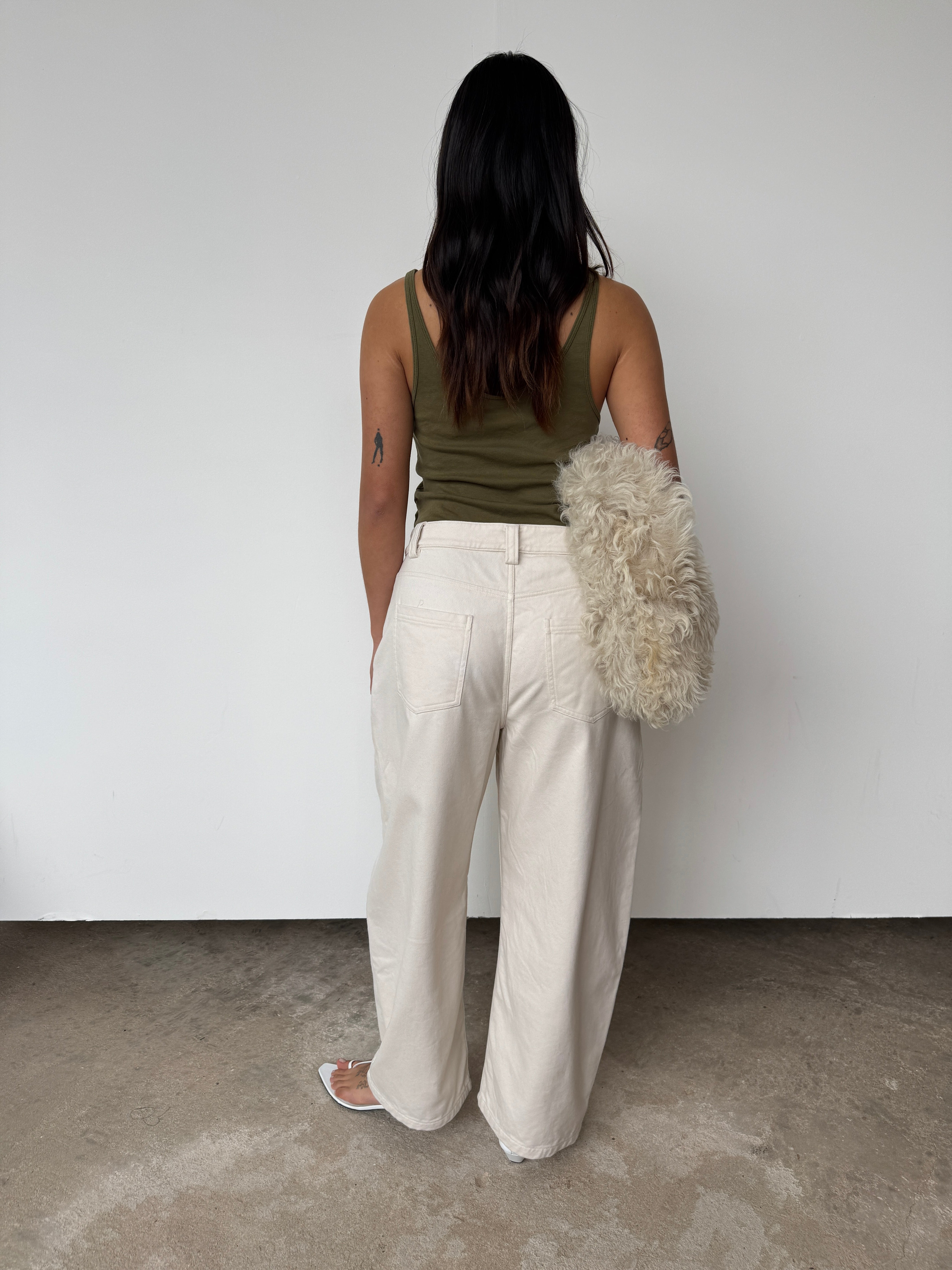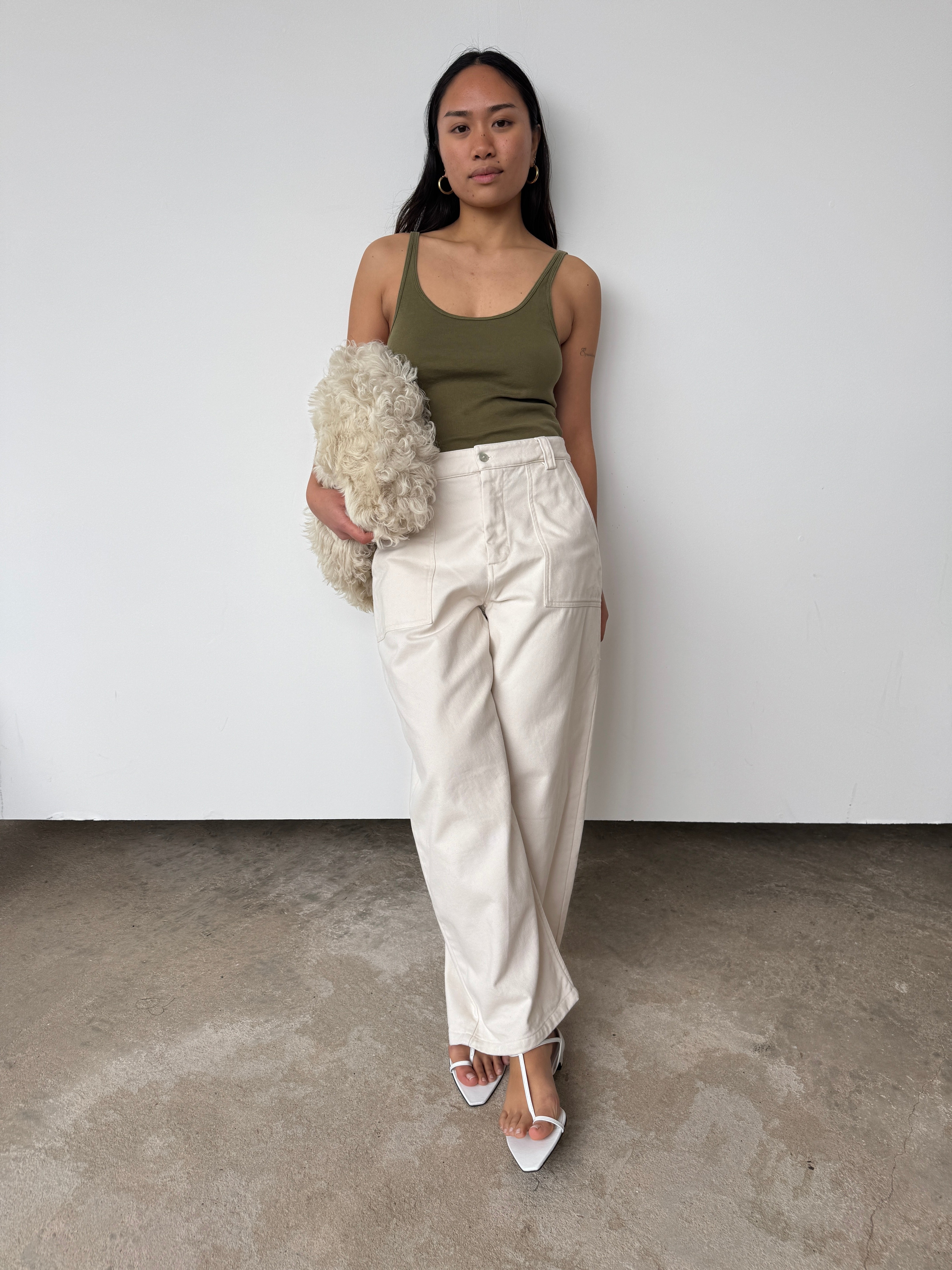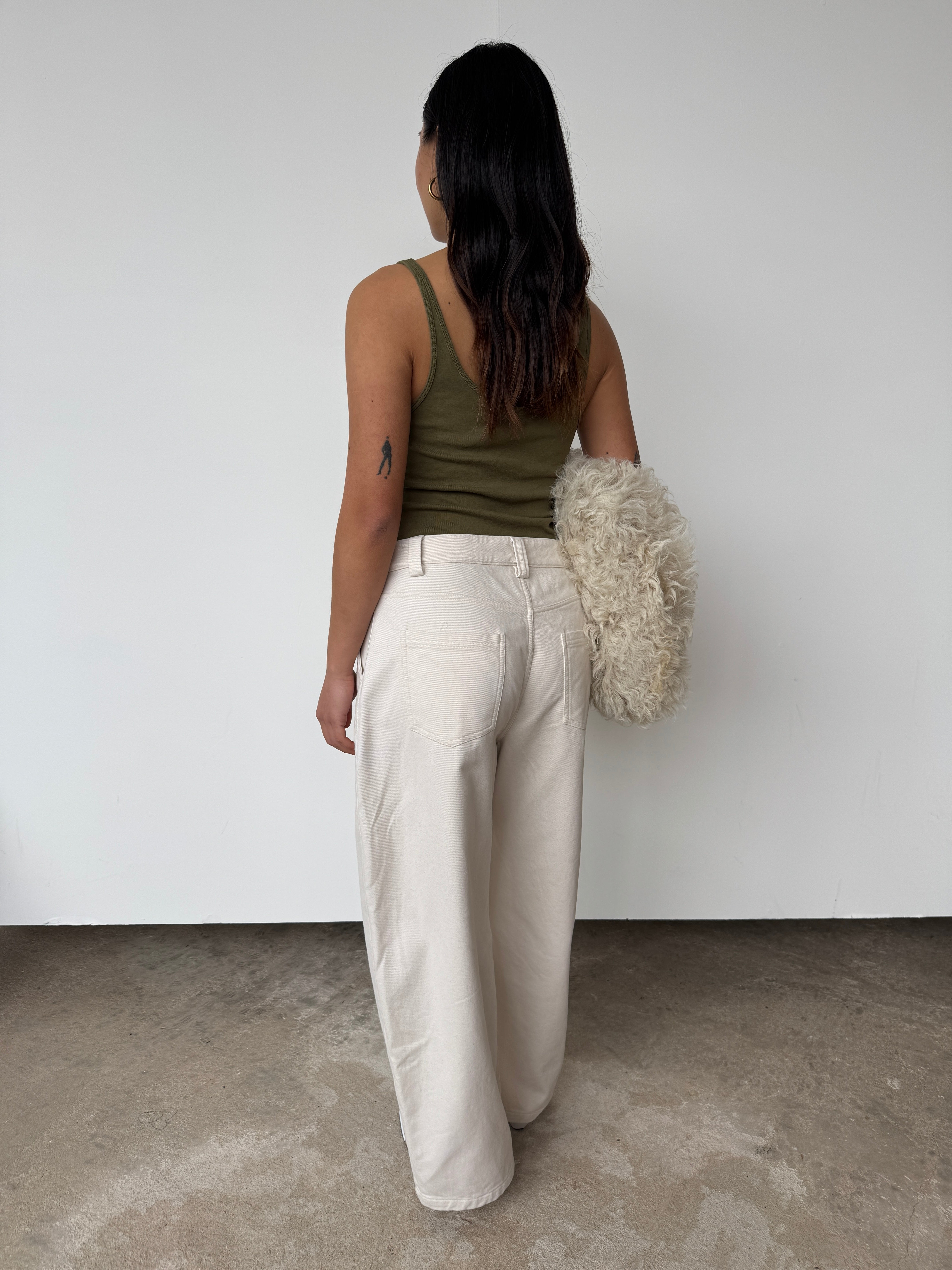 "The Chino Barrel Pant is crafted from 100% cotton, combining structure and ease. Designed with a high-rise waist, relaxed barrel leg, and a soft, brushed hand. Finished with functional side and back pockets for everyday wear."