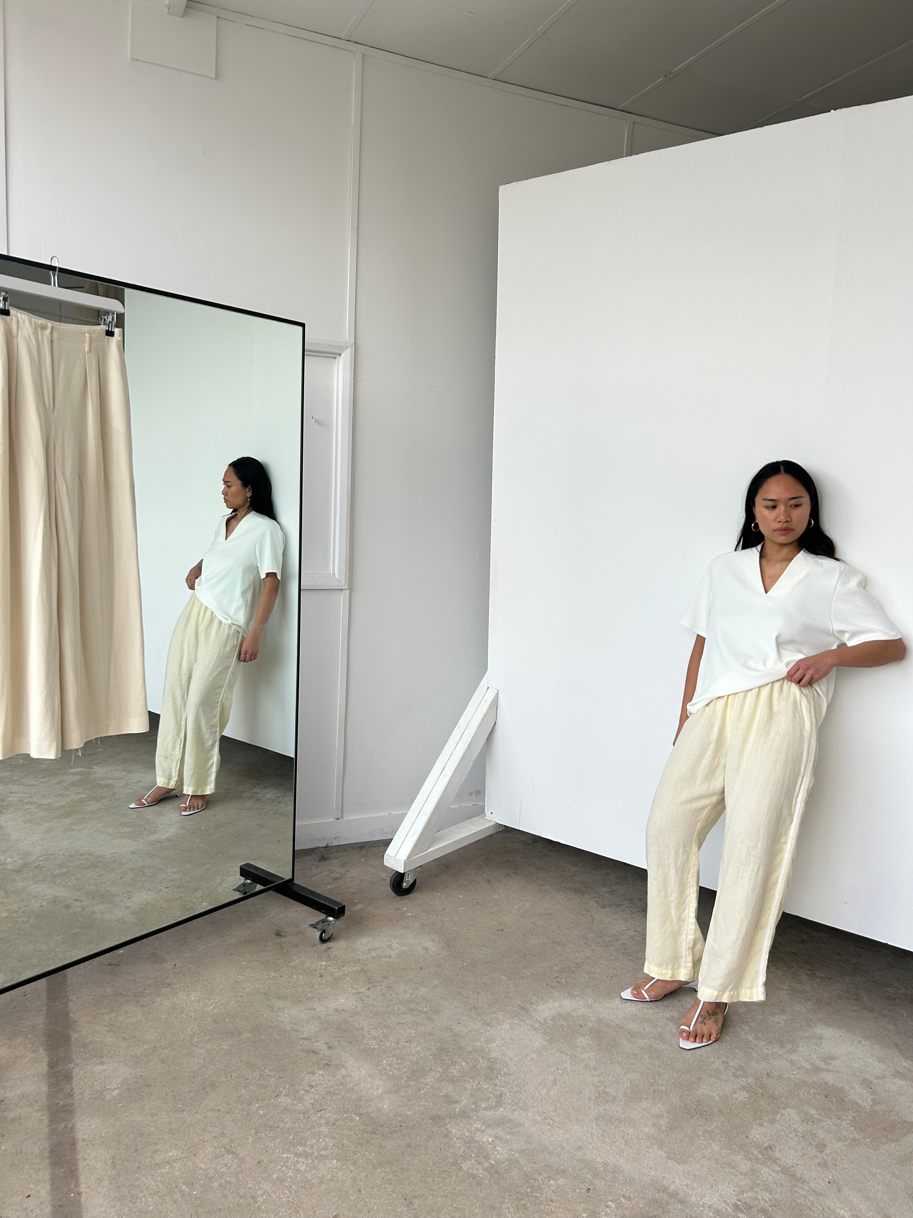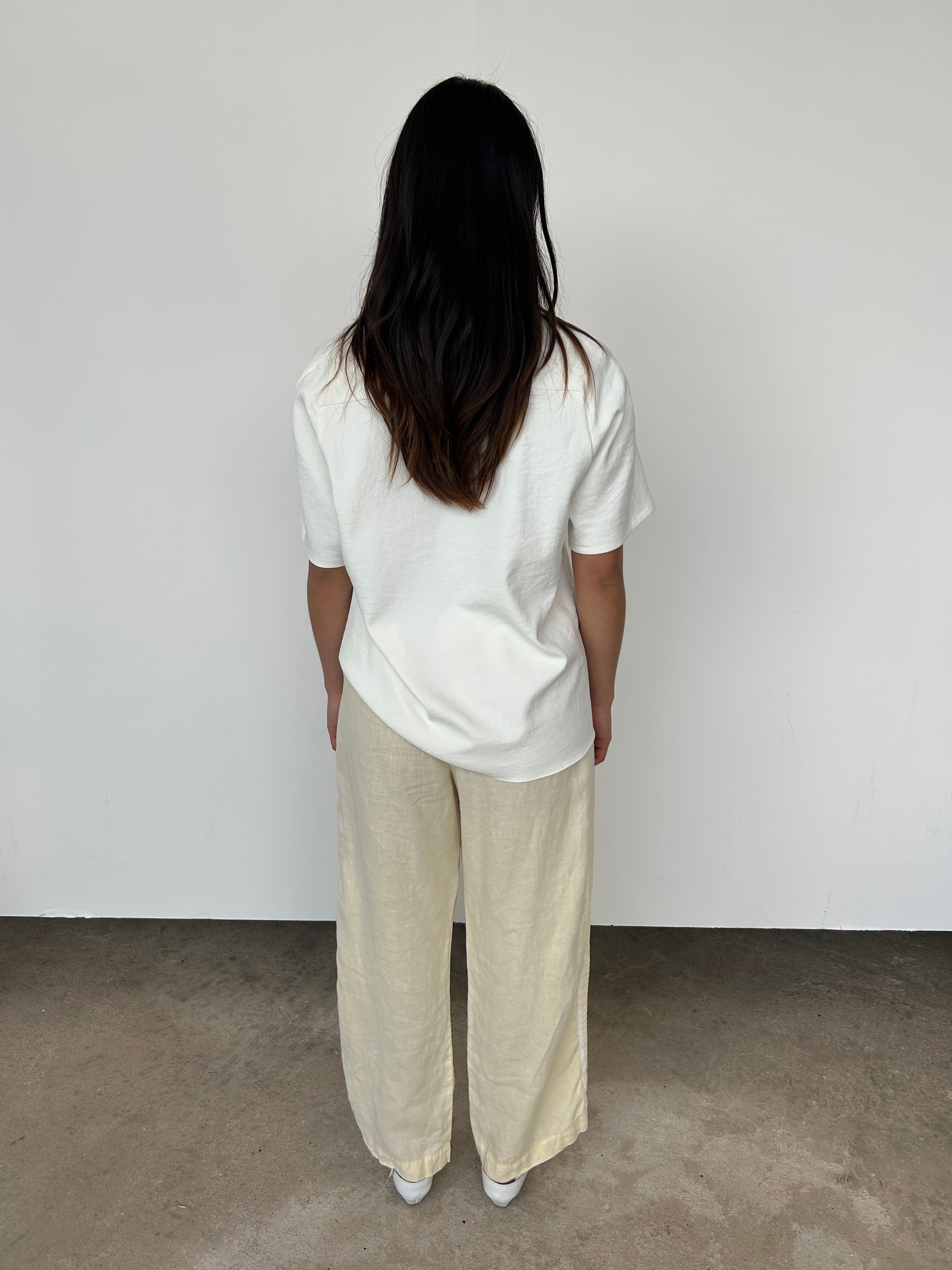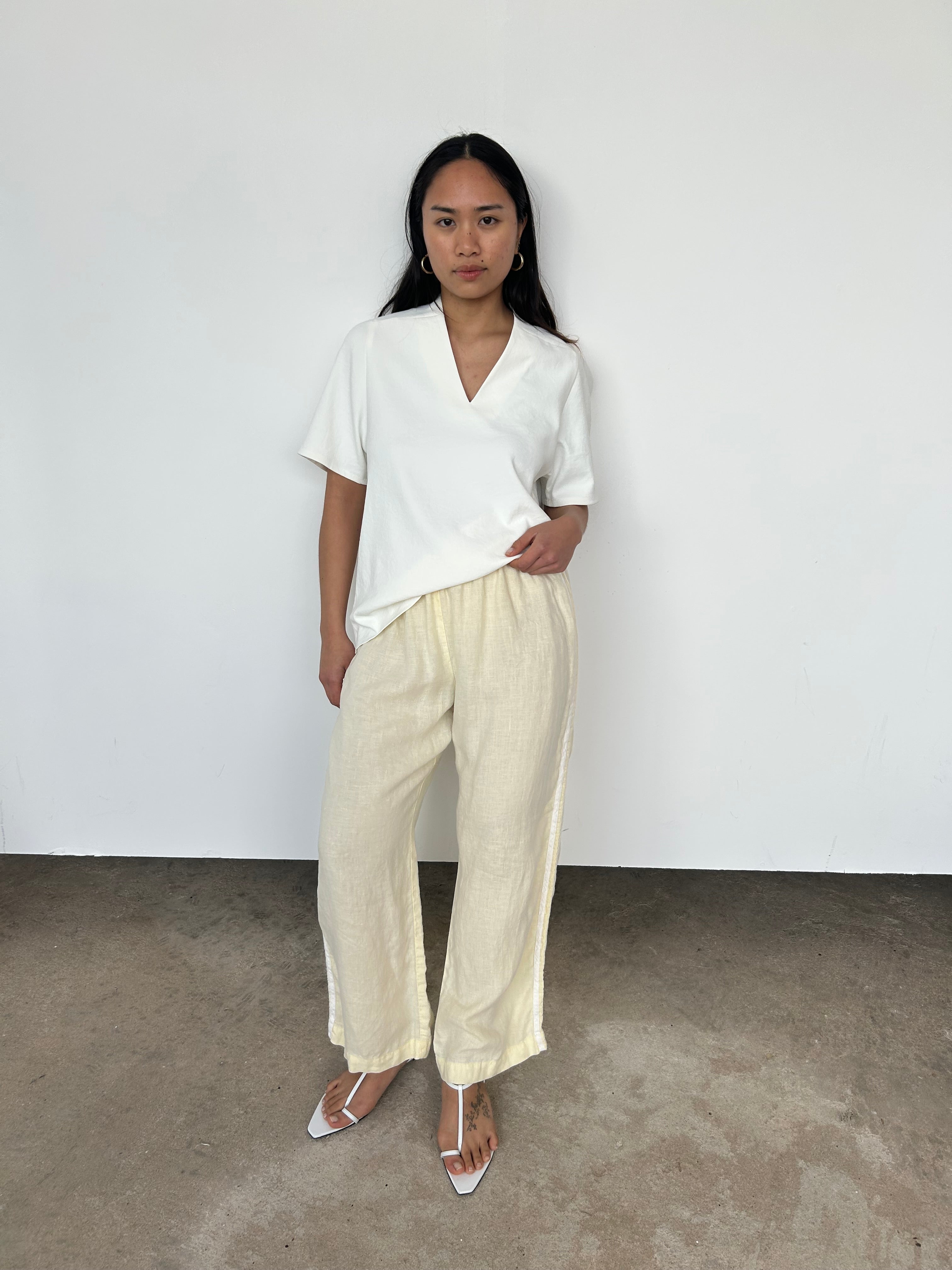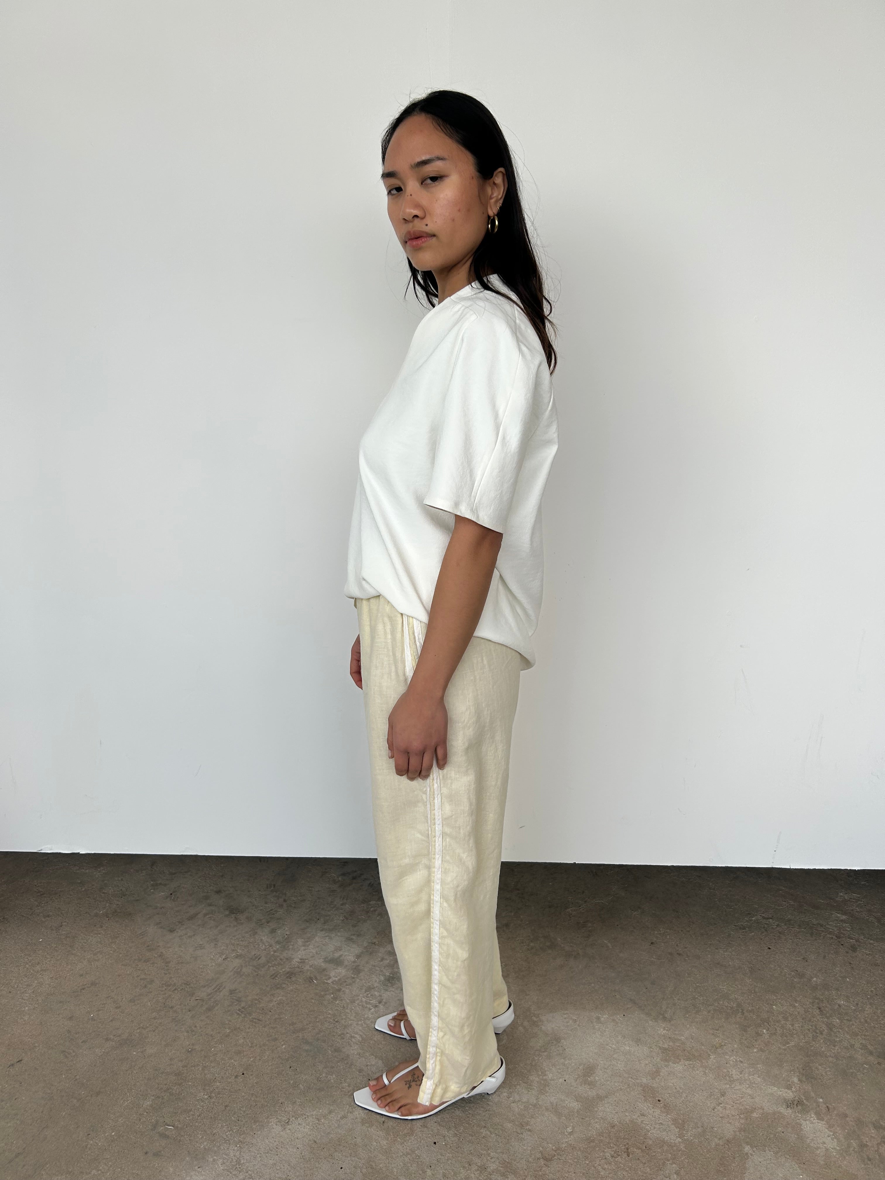 "Our best-selling silhouette, reimagined in our signature lightweight linen. Designed with a cropped fit, comfortable elastic waistband, straight-leg cut, and finished with racer stripes along each leg."