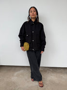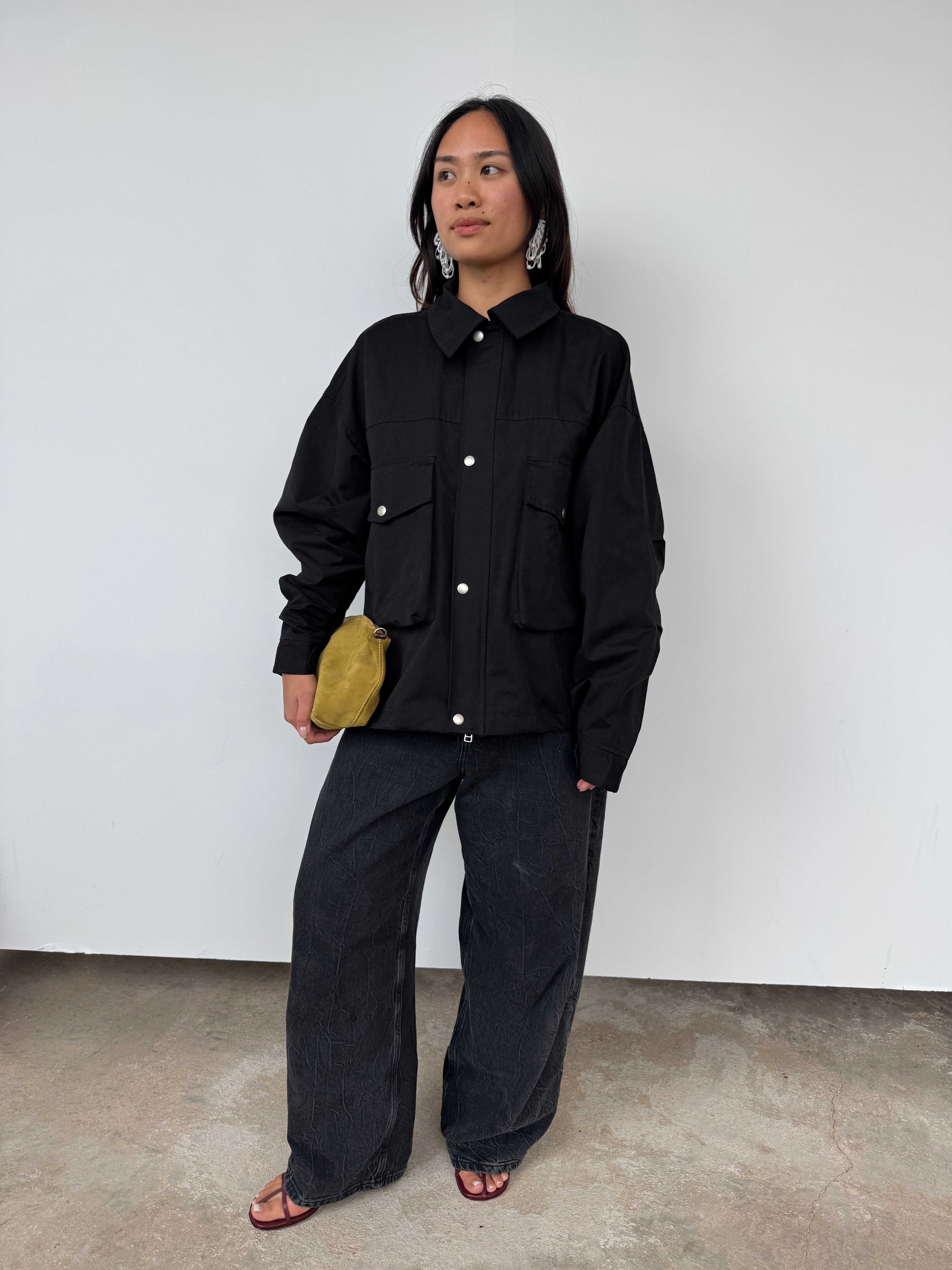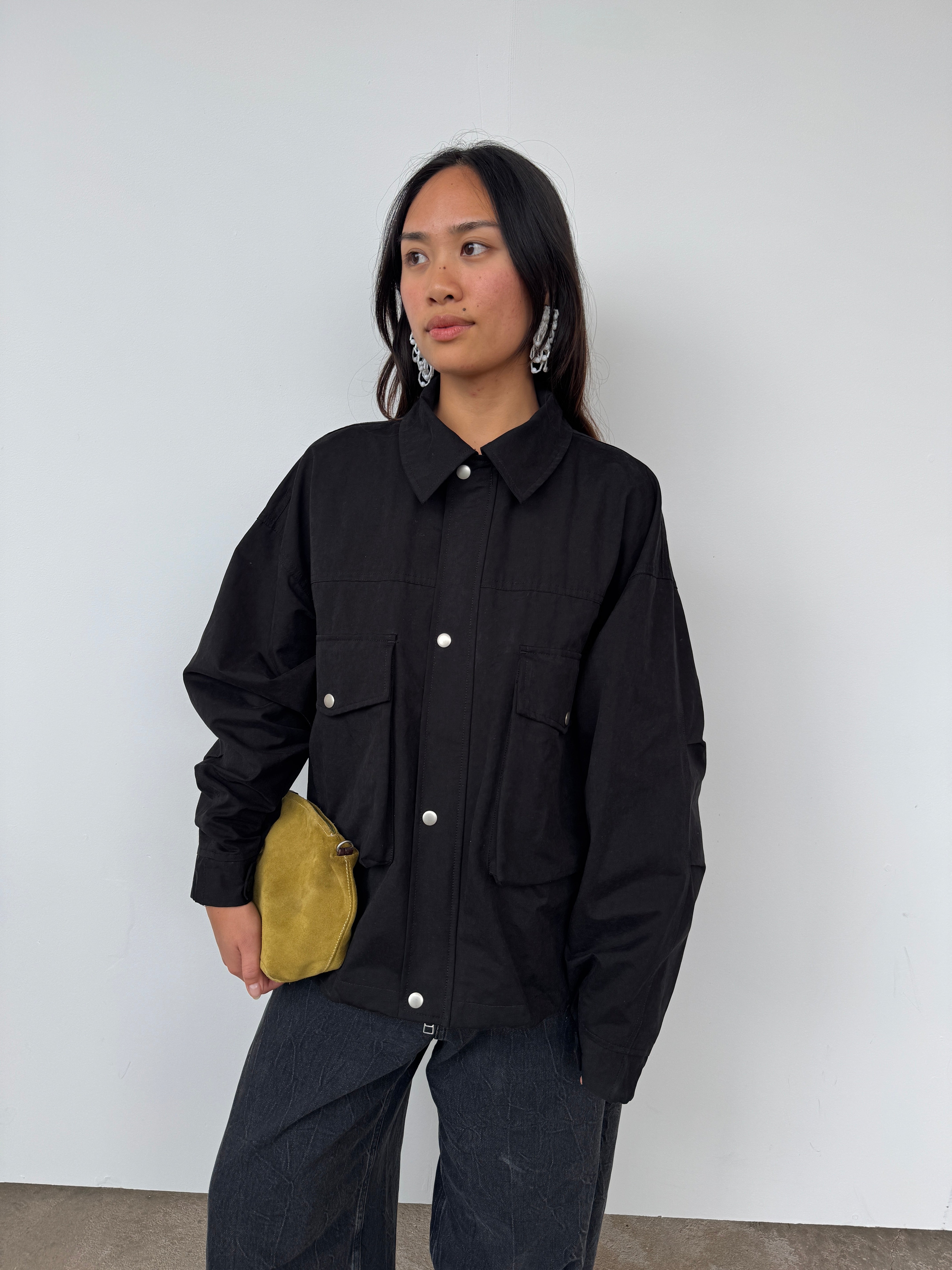 This black jacket has a wide fit ideal for layering. It features two oversized pockets at front inspired from classic army cargo shapes. Stand collar. Front button and zipper closure. Button cuffs for adjustment. It comes in two sizes.