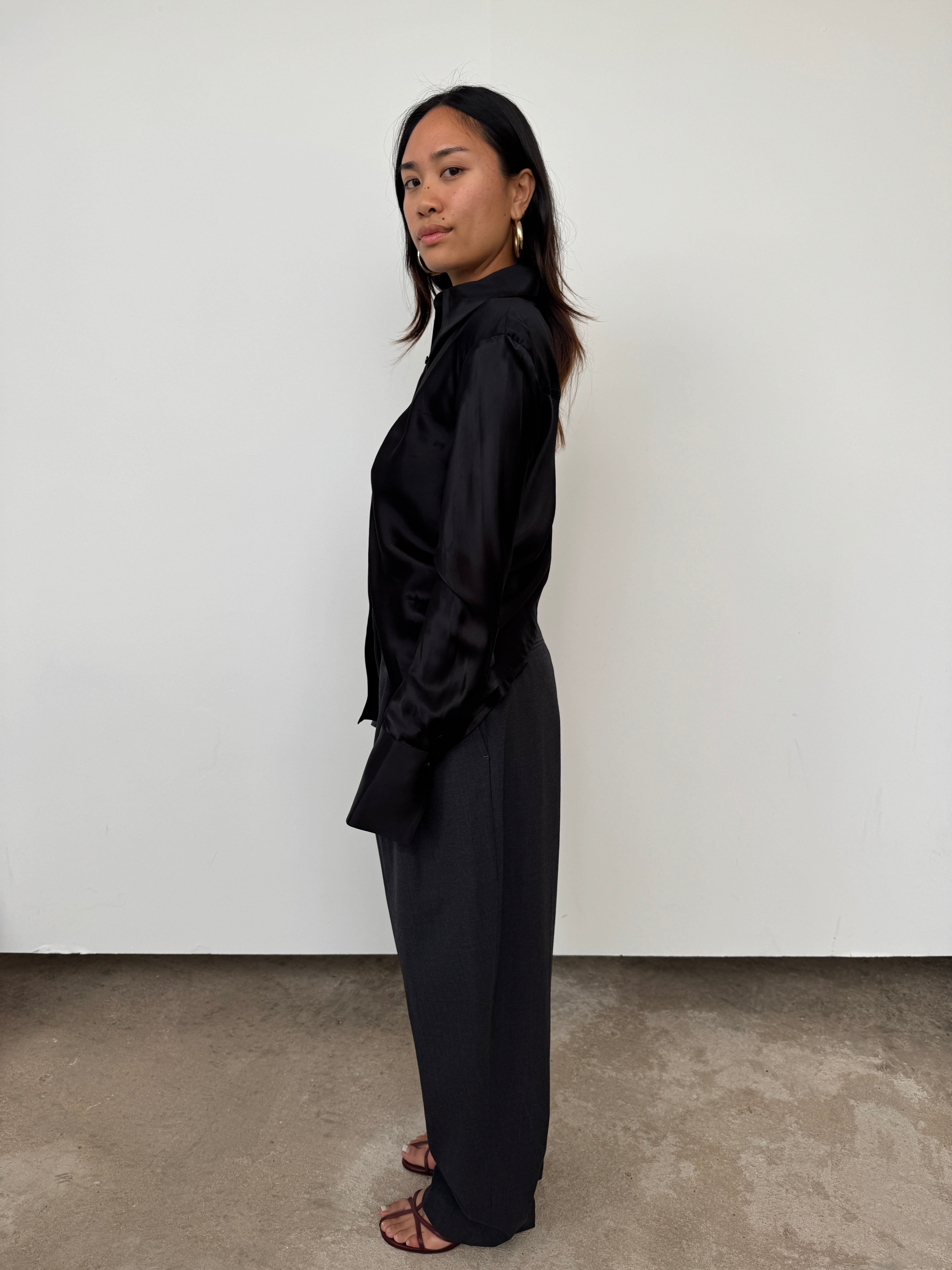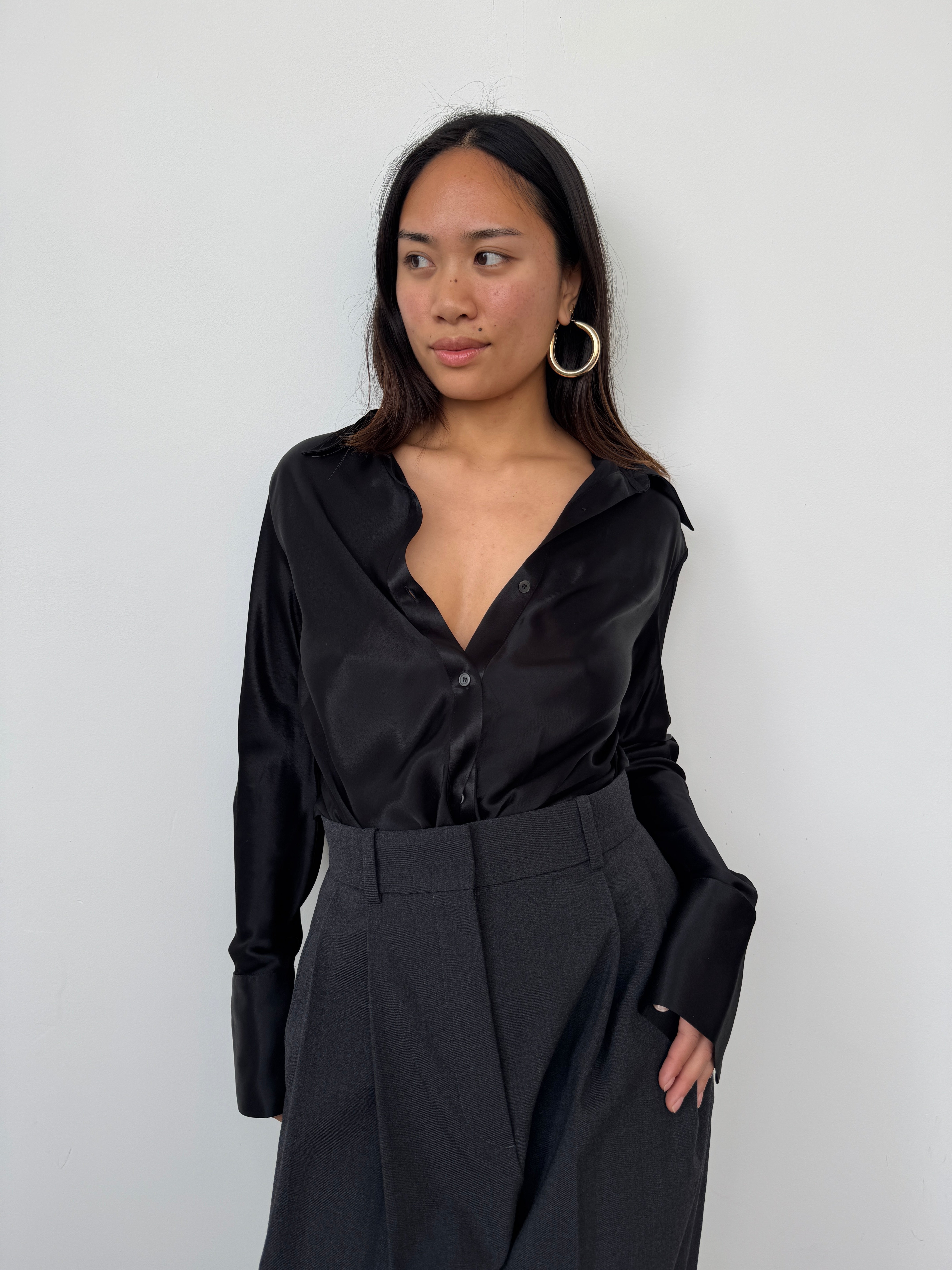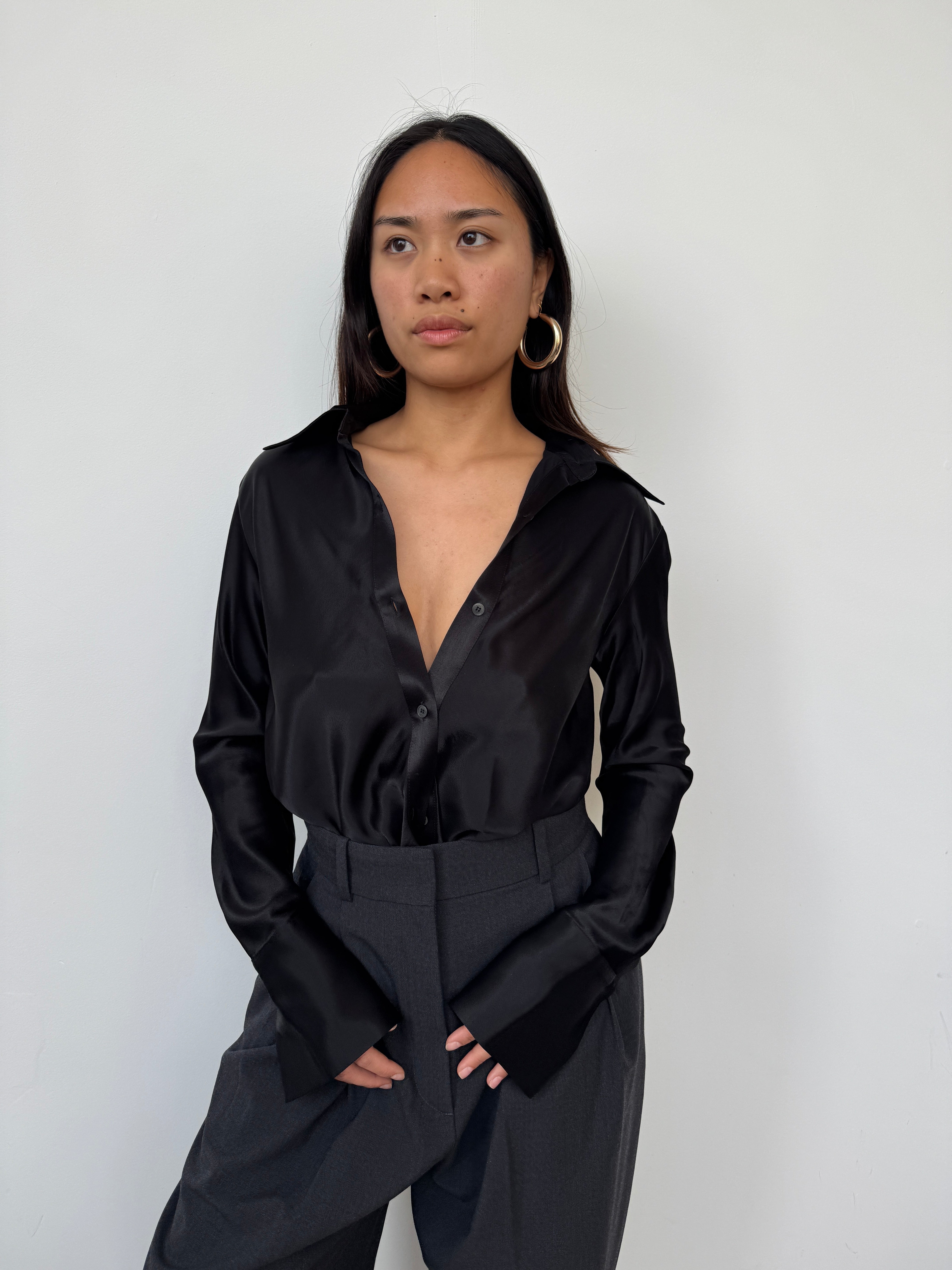 The Eudon Choi Serena shirt has been crafted from a luxurious viscose satin blend. The expertly tailored silhouette cinches gracefully at the waist, creating a flattering, feminine shape that transitions effortlessly from tucked to untucked styling. A versatile piece that elevates any wardrobe.