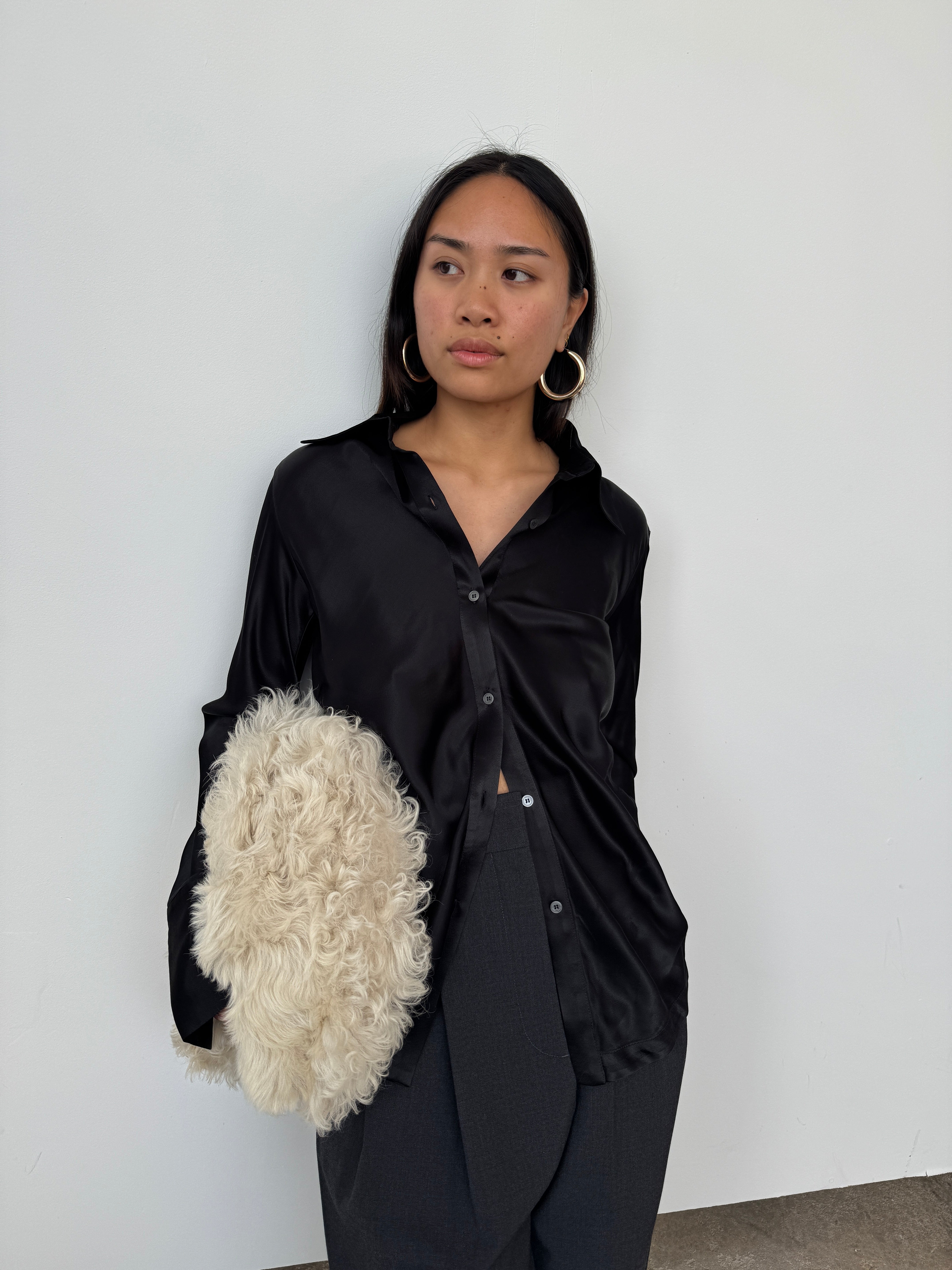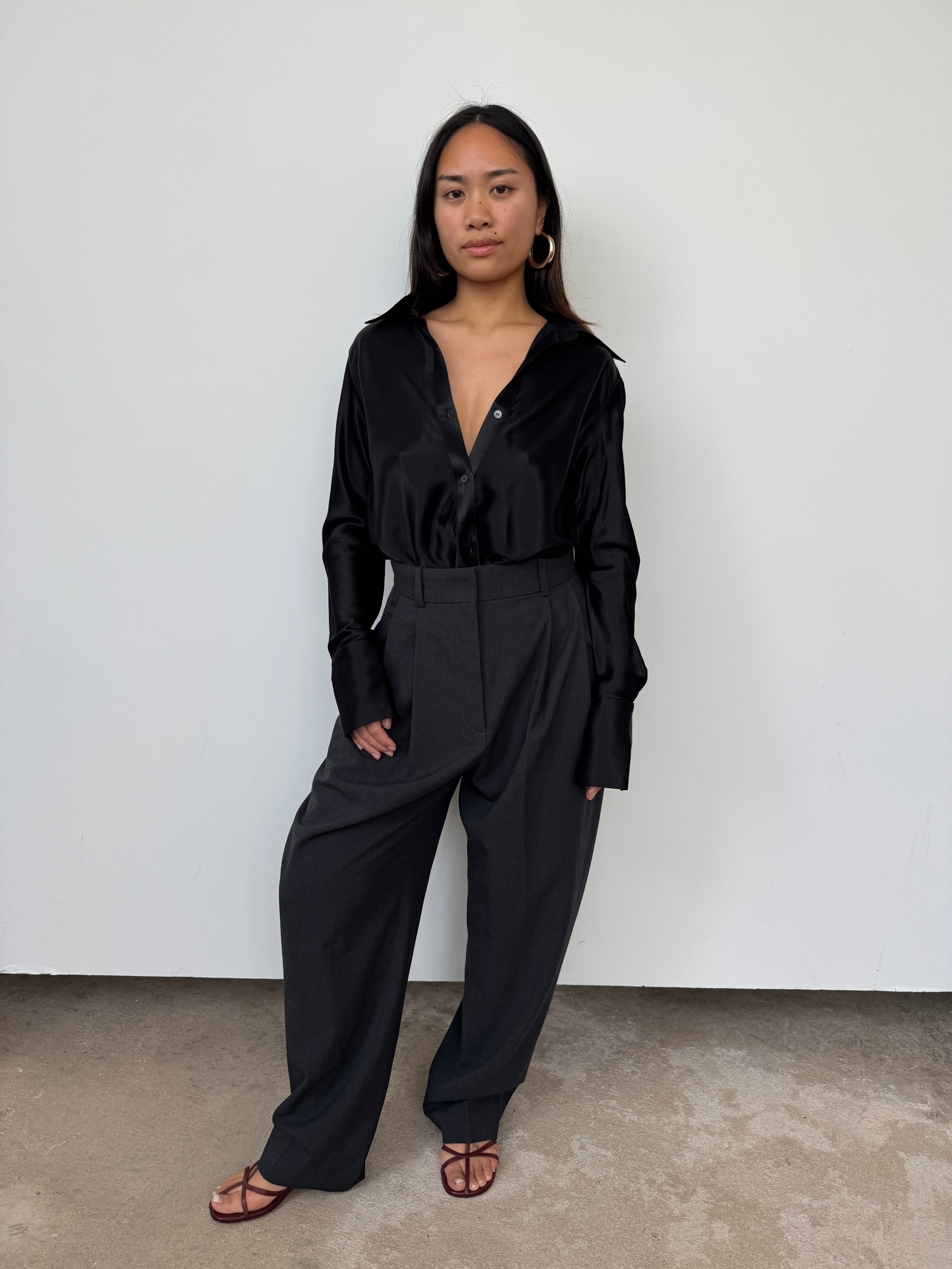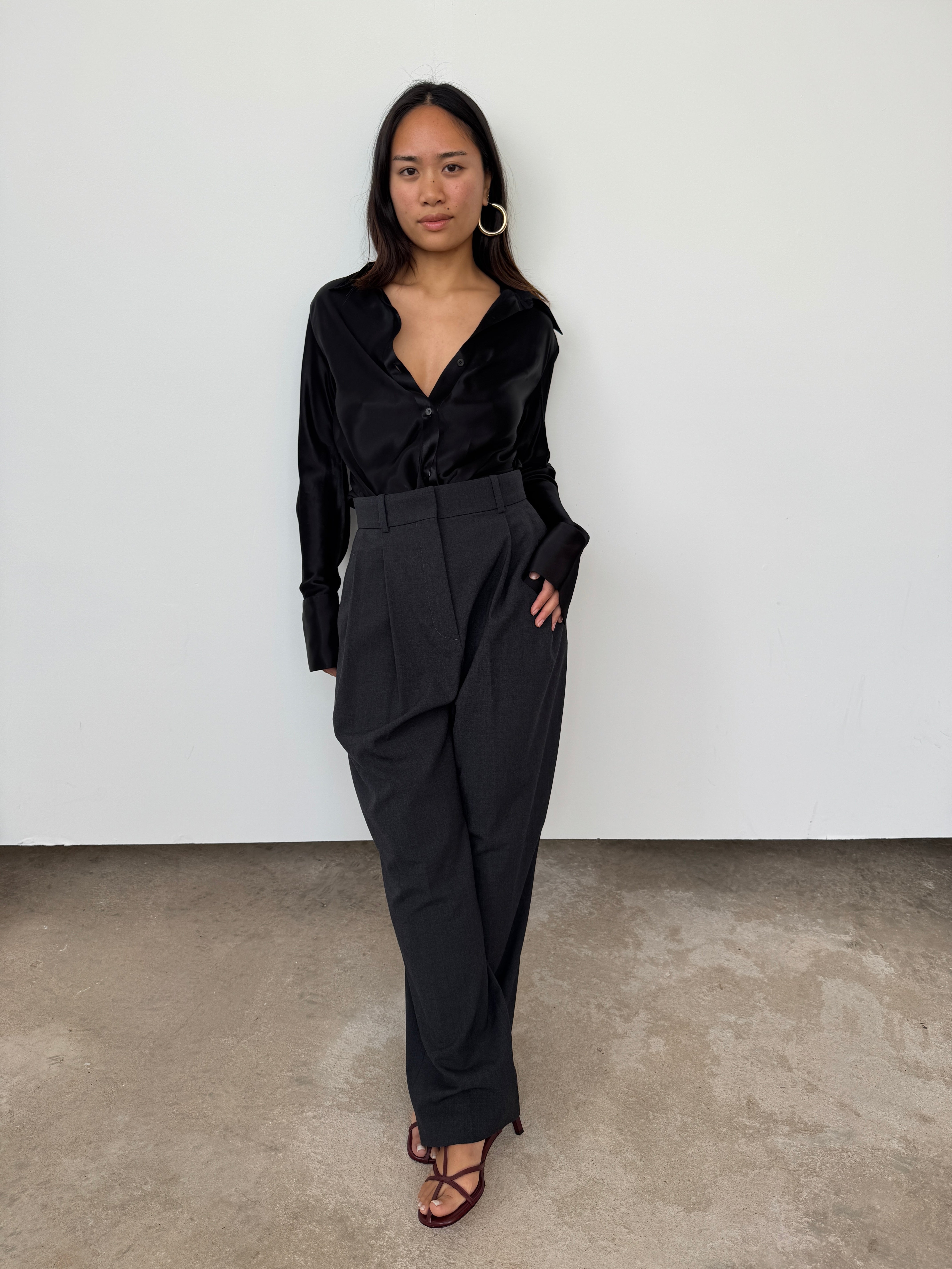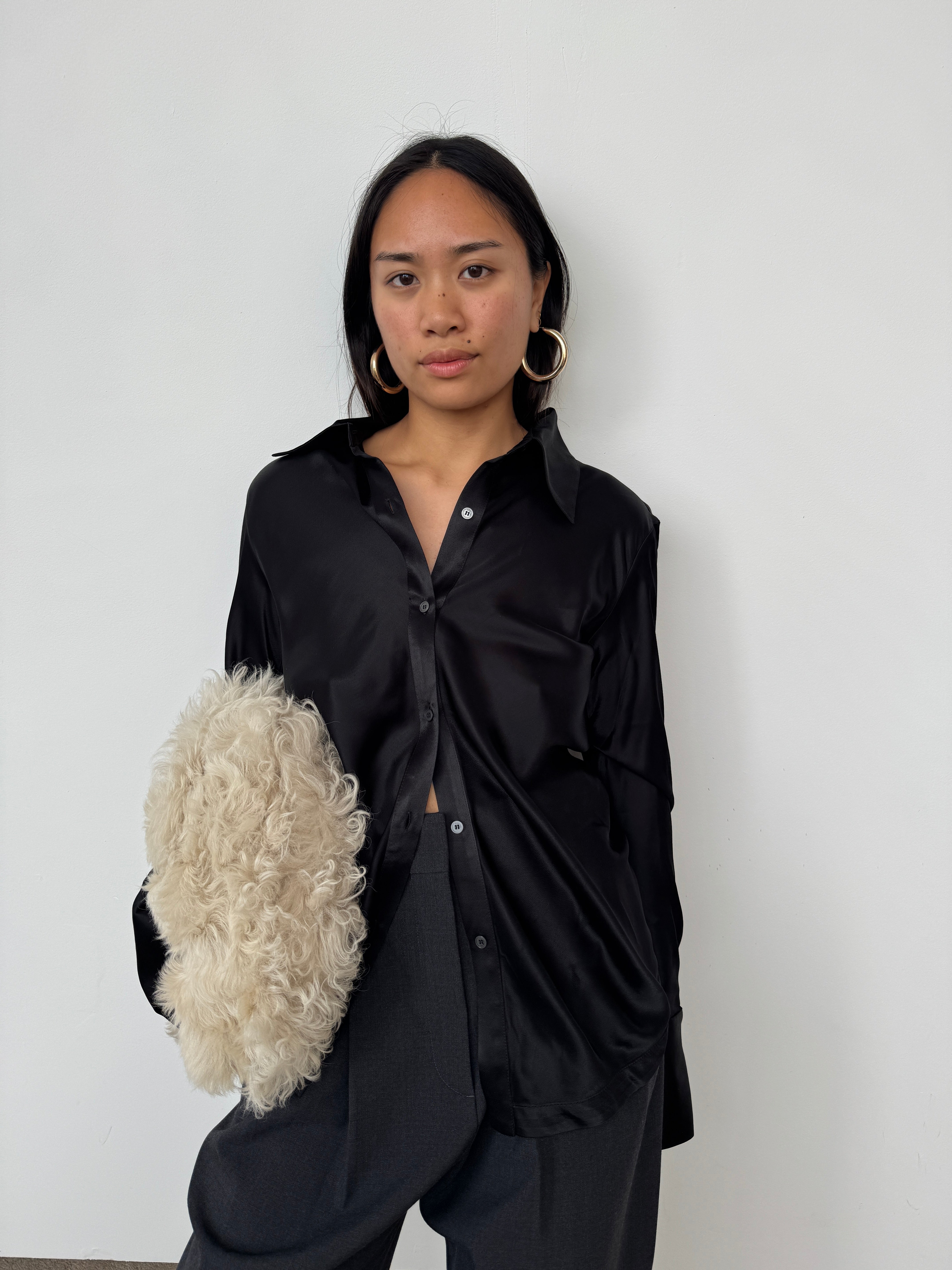 The Eudon Choi Serena shirt has been crafted from a luxurious viscose satin blend. The expertly tailored silhouette cinches gracefully at the waist, creating a flattering, feminine shape that transitions effortlessly from tucked to untucked styling. A versatile piece that elevates any wardrobe.