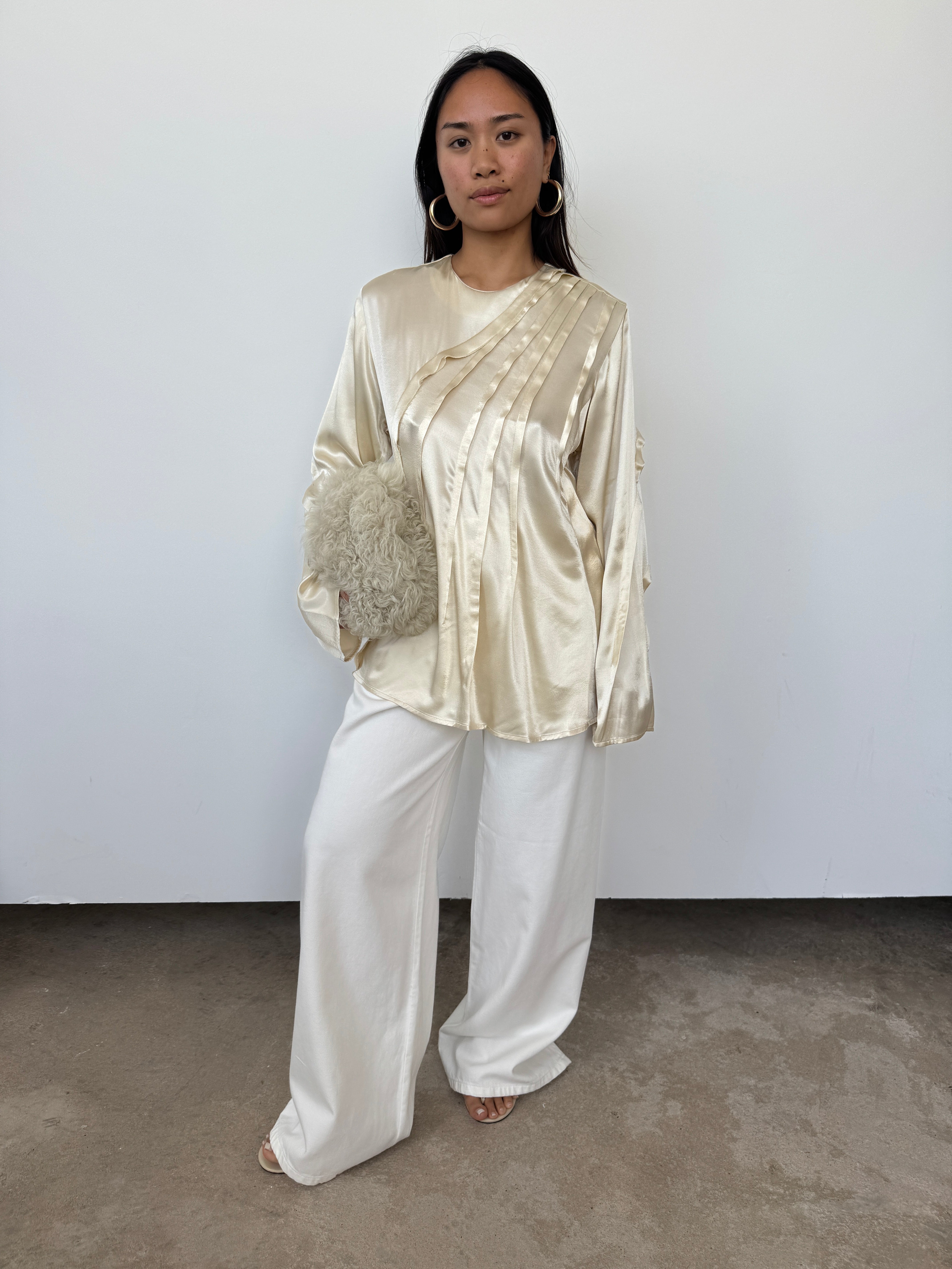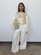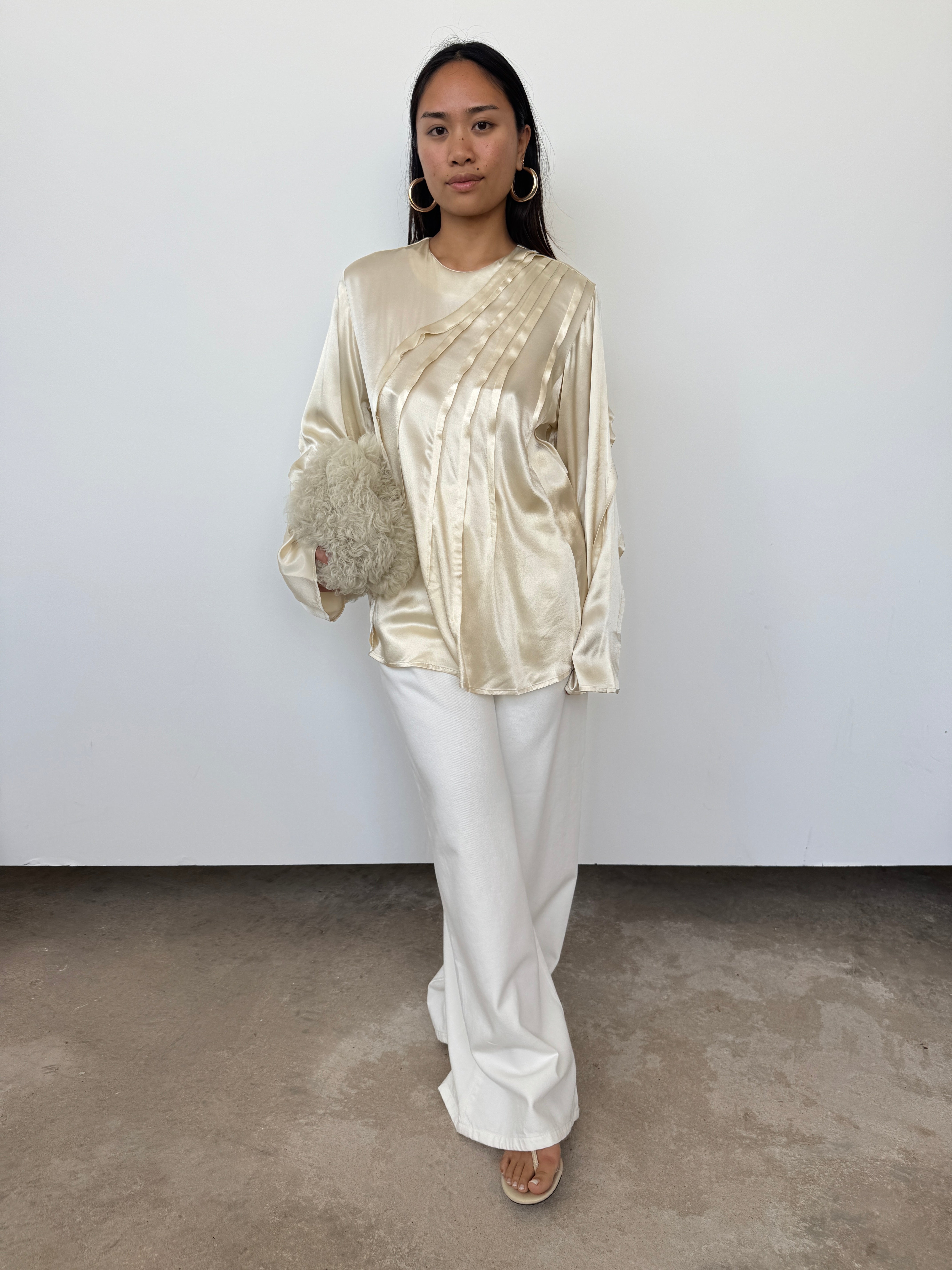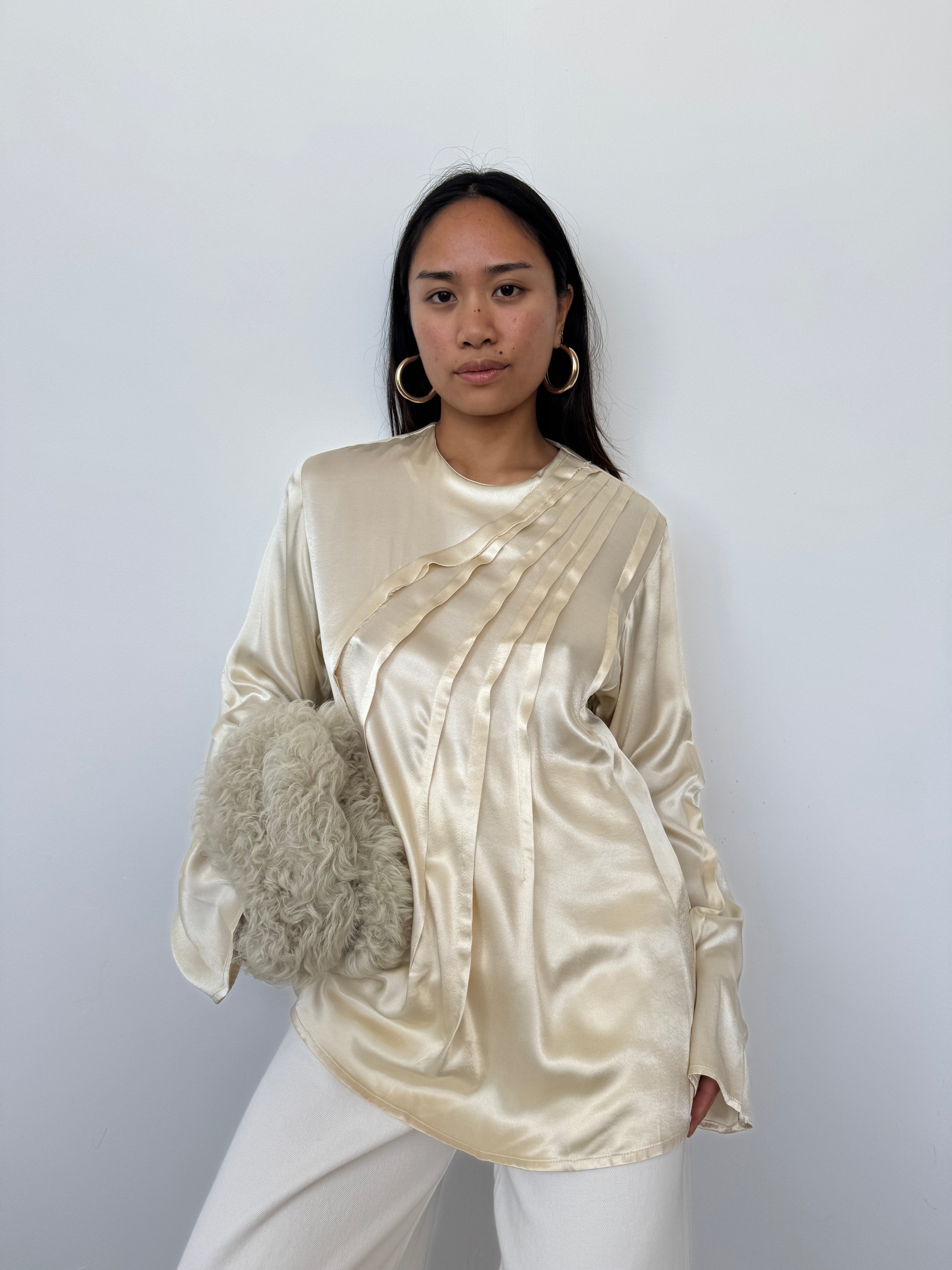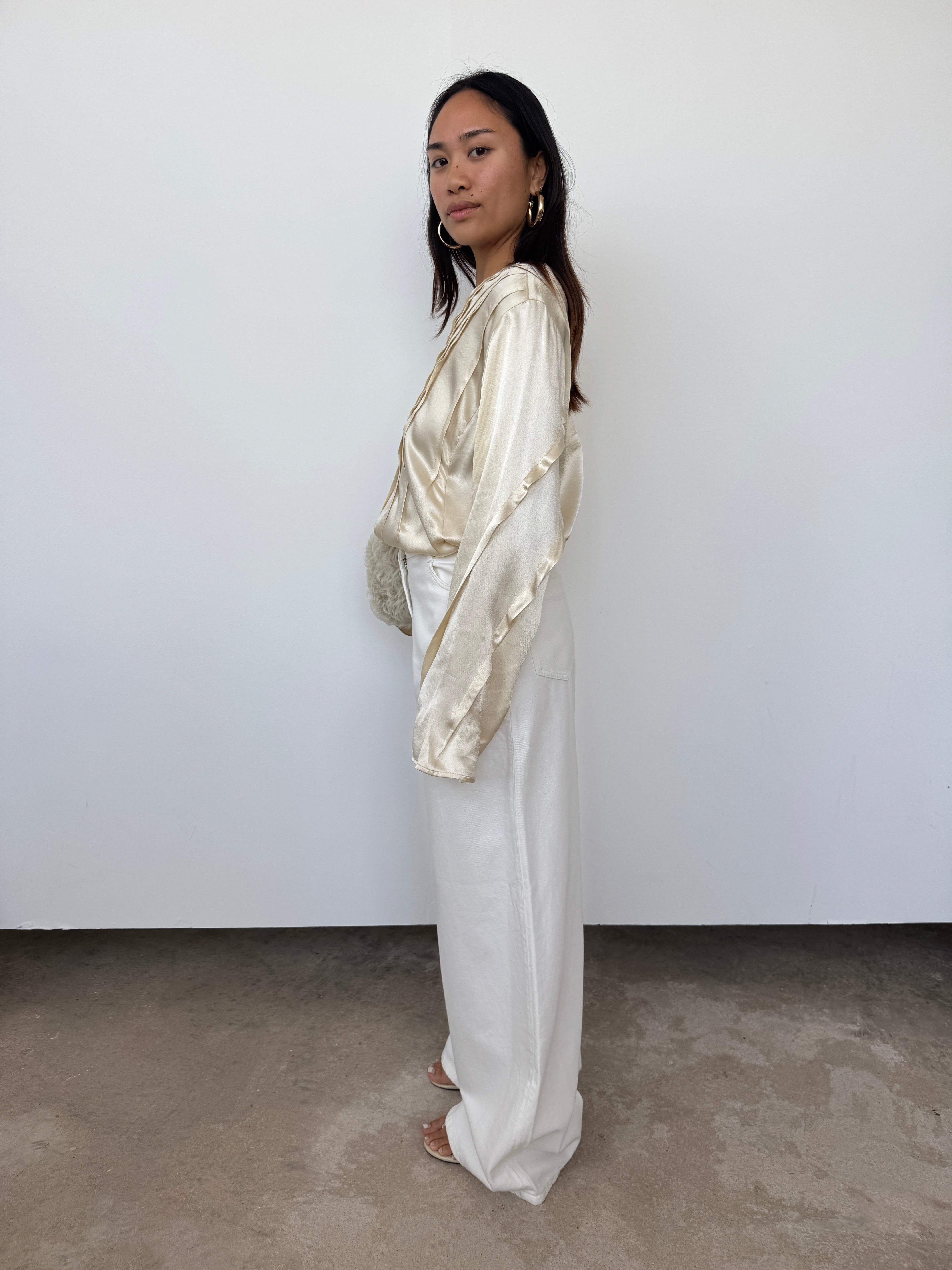 This Eudon Choi top comes in a beautiful butter tone. Crafted from a viscose satin blend, the 'Renza' top combines refined elegance with contemporary ease. The panelled crew neck design features striking raw edge detailing that adds an artful, modern edge, whilst the loose, flowy silhouette ensures effortless comfort and movement.