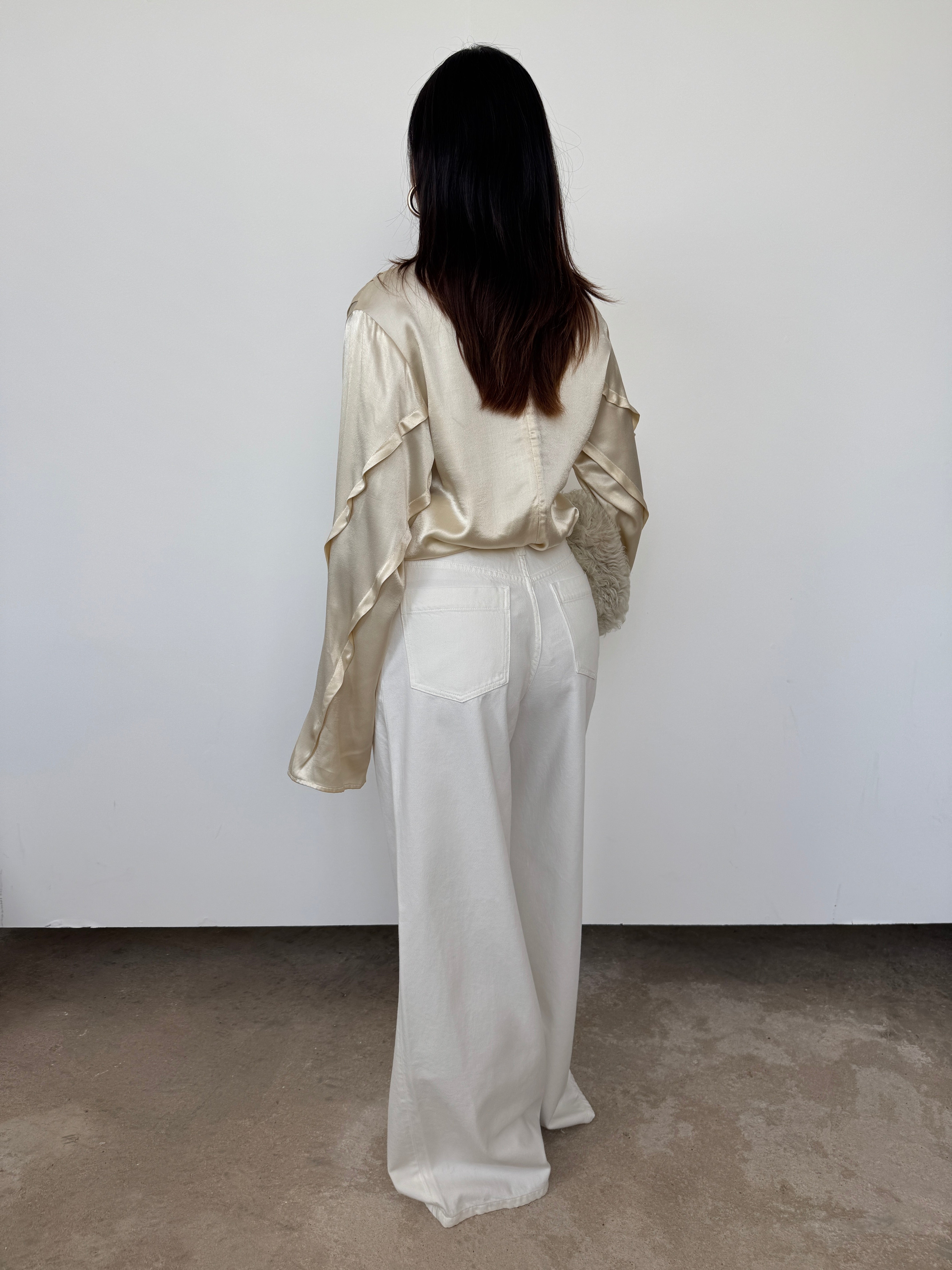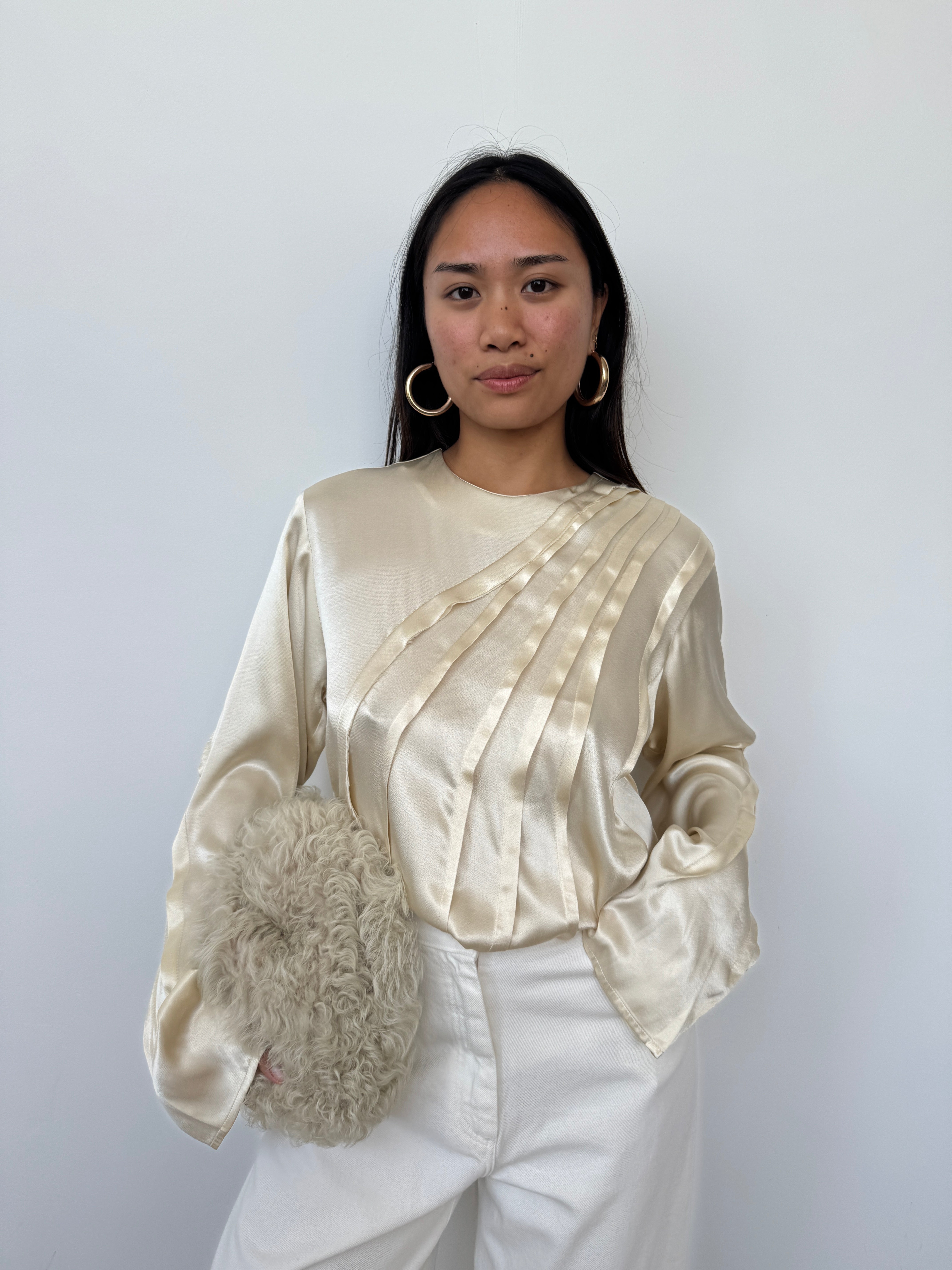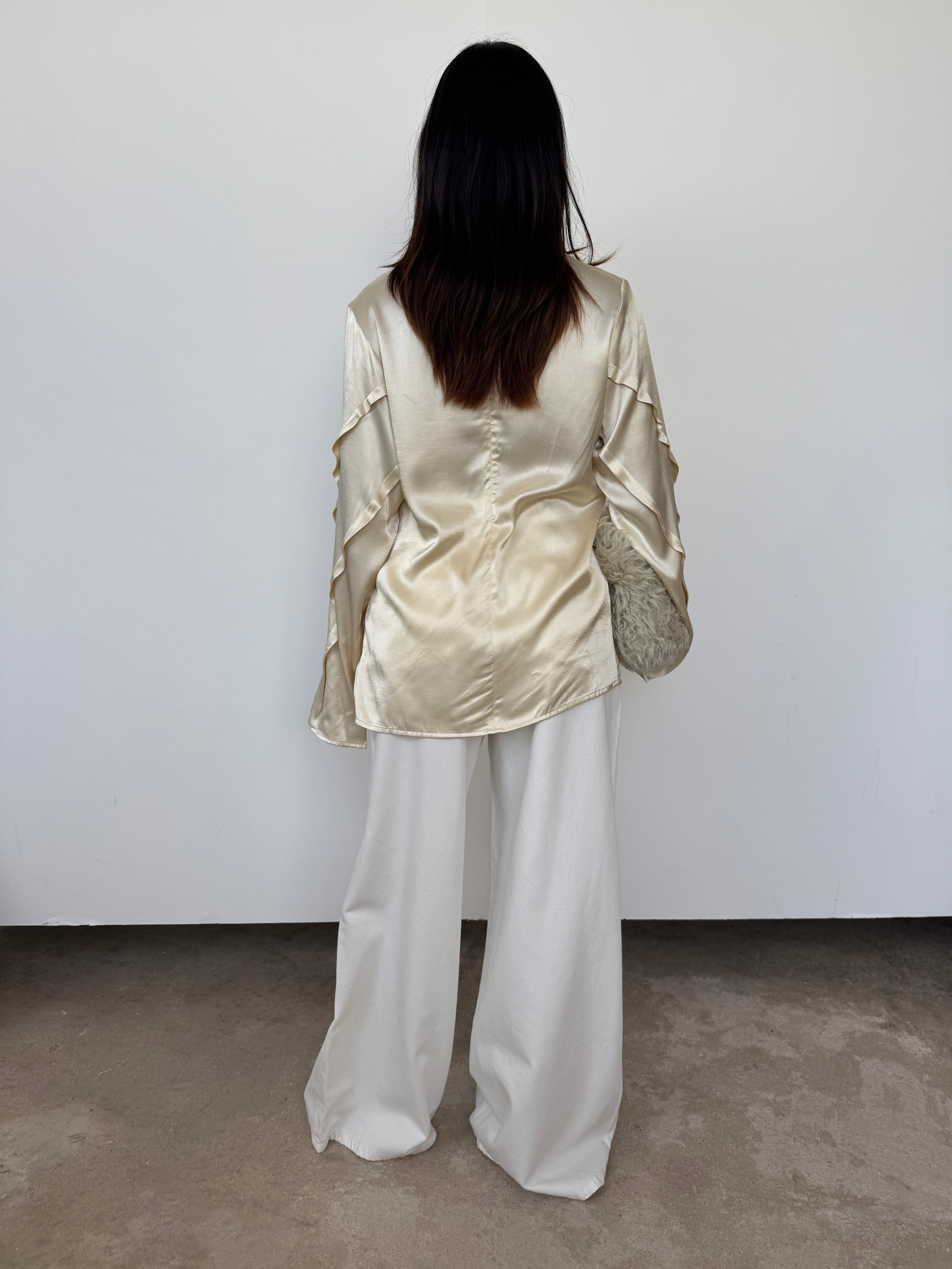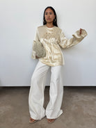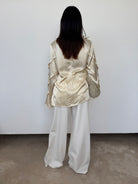 This Eudon Choi top comes in a beautiful butter tone. Crafted from a viscose satin blend, the 'Renza' top combines refined elegance with contemporary ease. The panelled crew neck design features striking raw edge detailing that adds an artful, modern edge, whilst the loose, flowy silhouette ensures effortless comfort and movement.