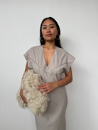 Eudon Choi's Misty Grey Capri dress exemplifies has a V-neckline and floor-length silhouette. The fabric falls with a luxurious drape, creating a flattering, fluid line from shoulder to hem. Thoughtfully detailed at the front, this sophisticated piece transitions effortlessly from evening occasions to refined daywear. Available in UK10 and UK12.