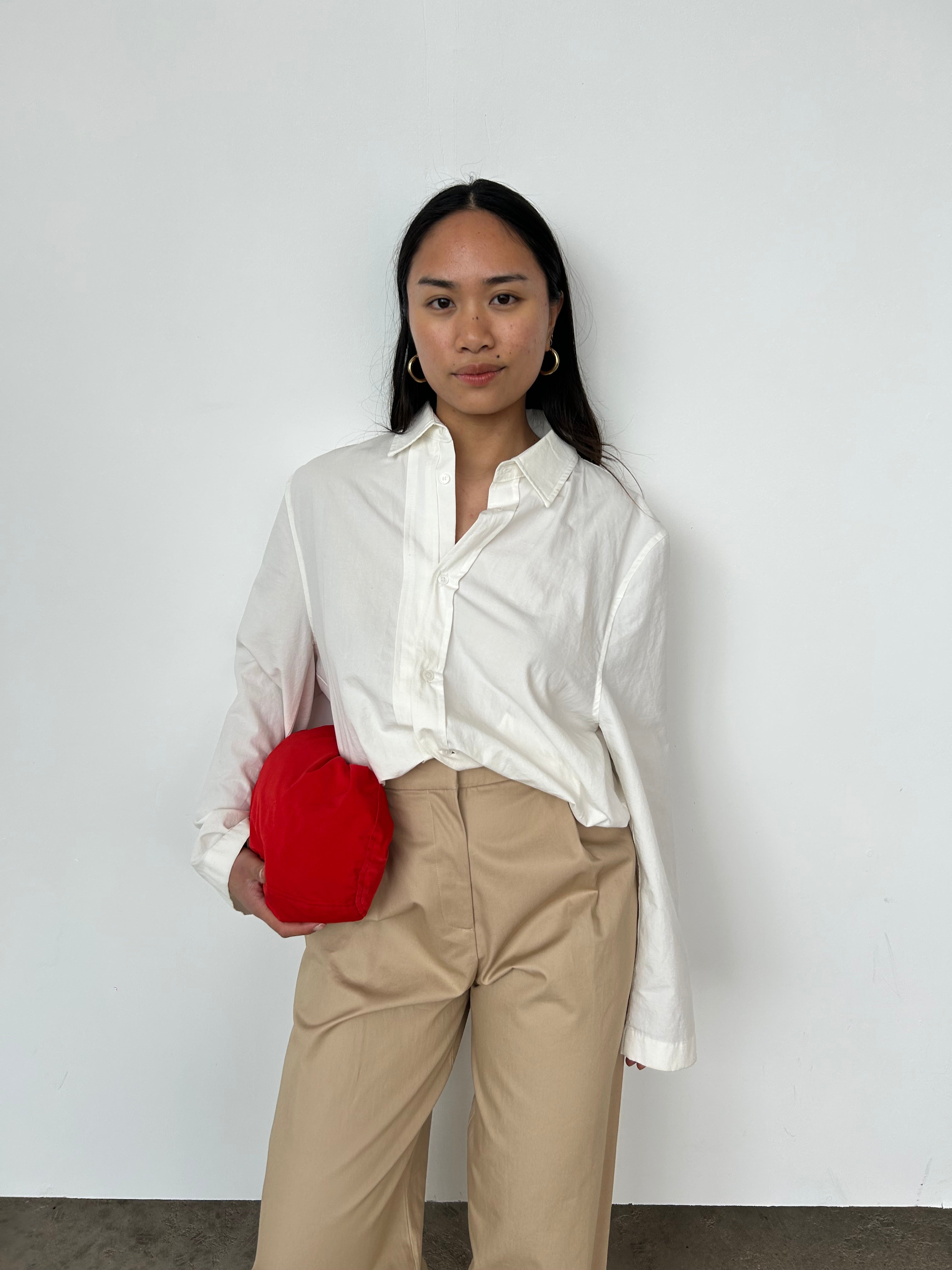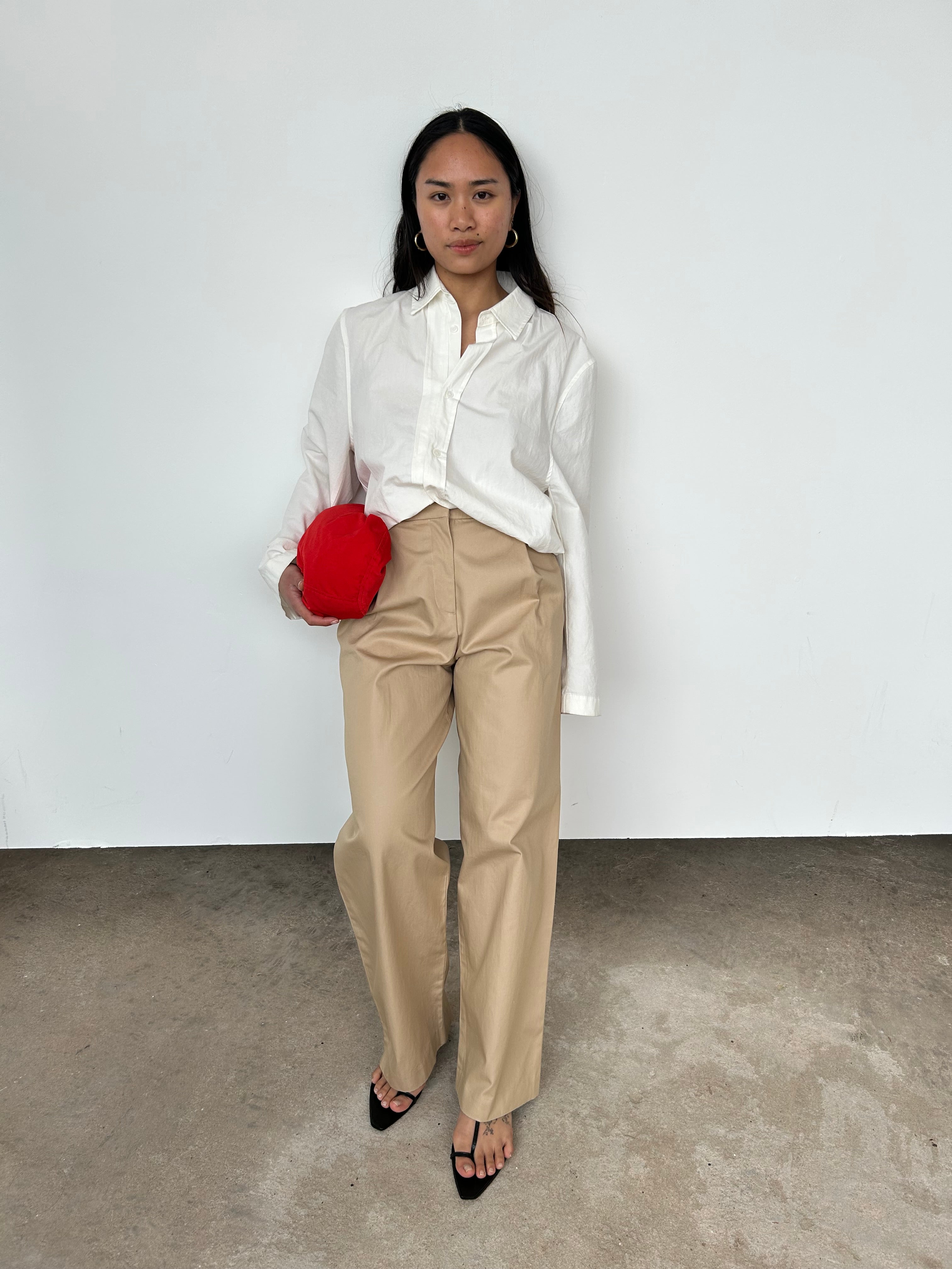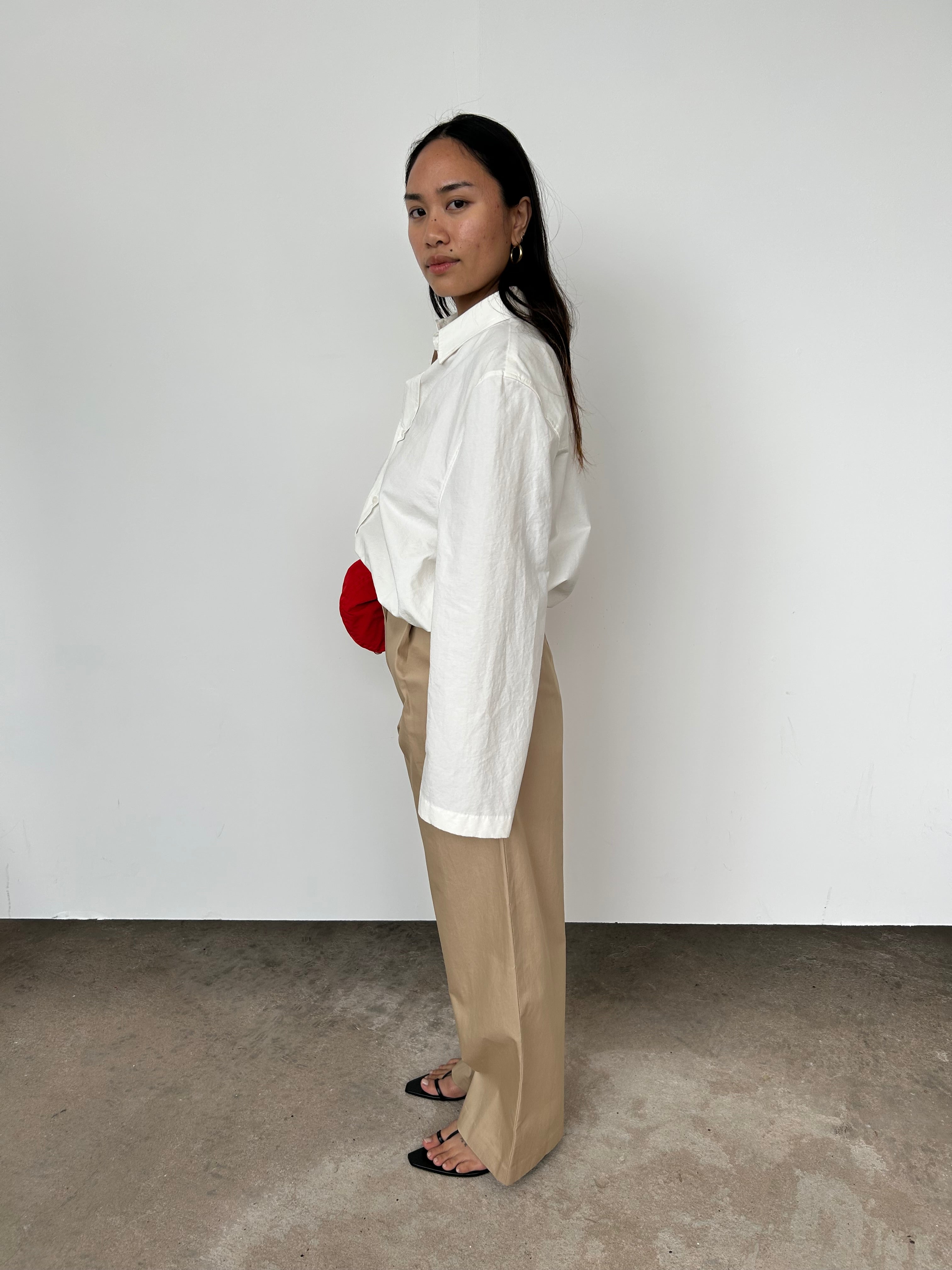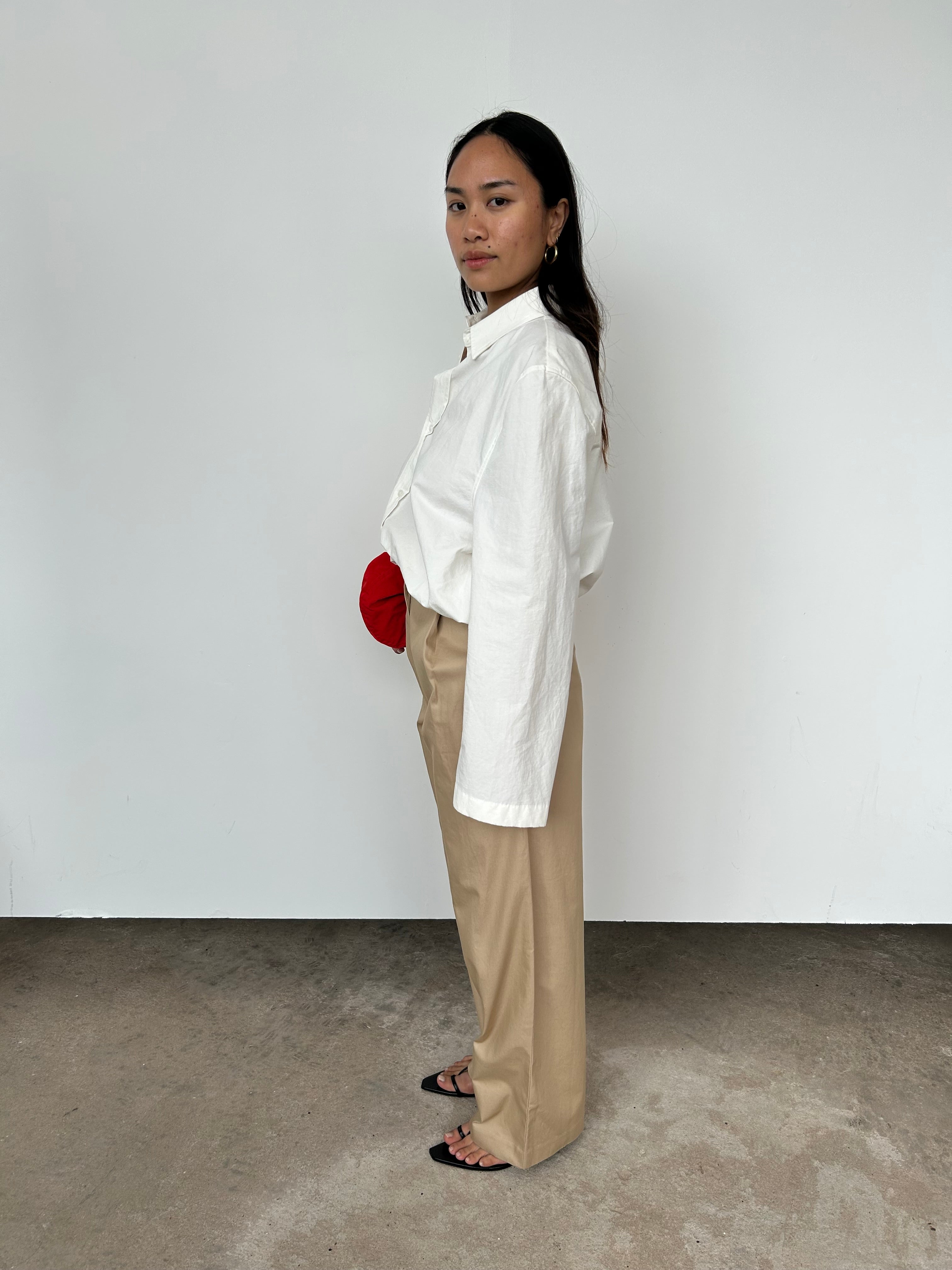 "A structured high-rise trouser with a front fly opening, belt loops around the waist and classic side pockets. Featuring a pleat through the front leg and a straight silhouette, that crops slightly short above the ankles. Designed from a crisp 100% cotton in a neutral hue."