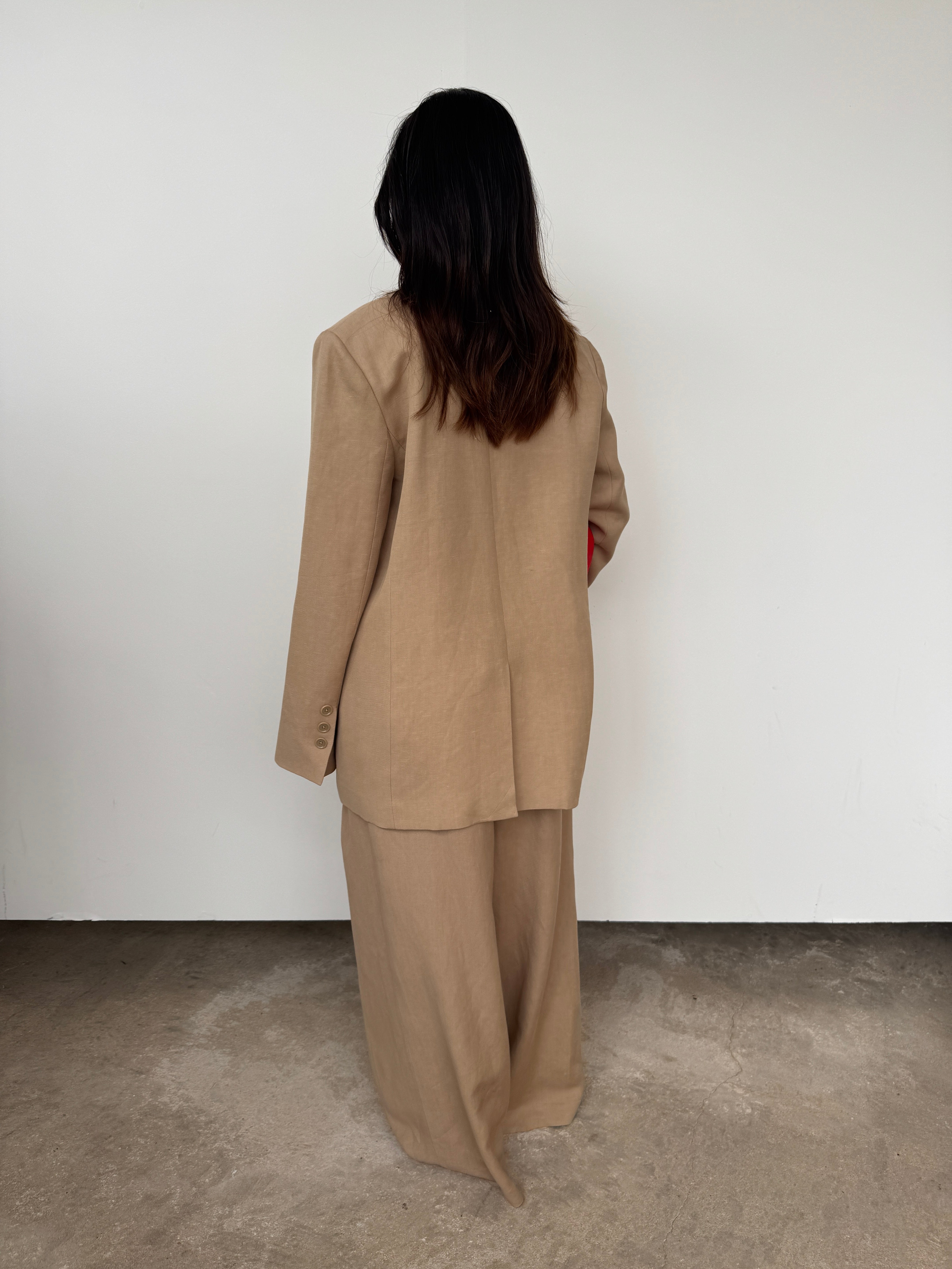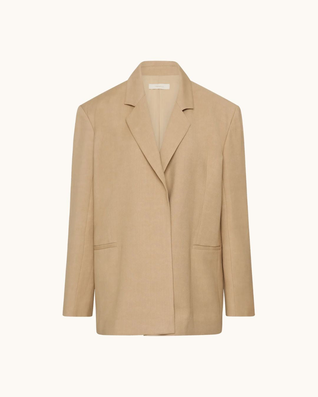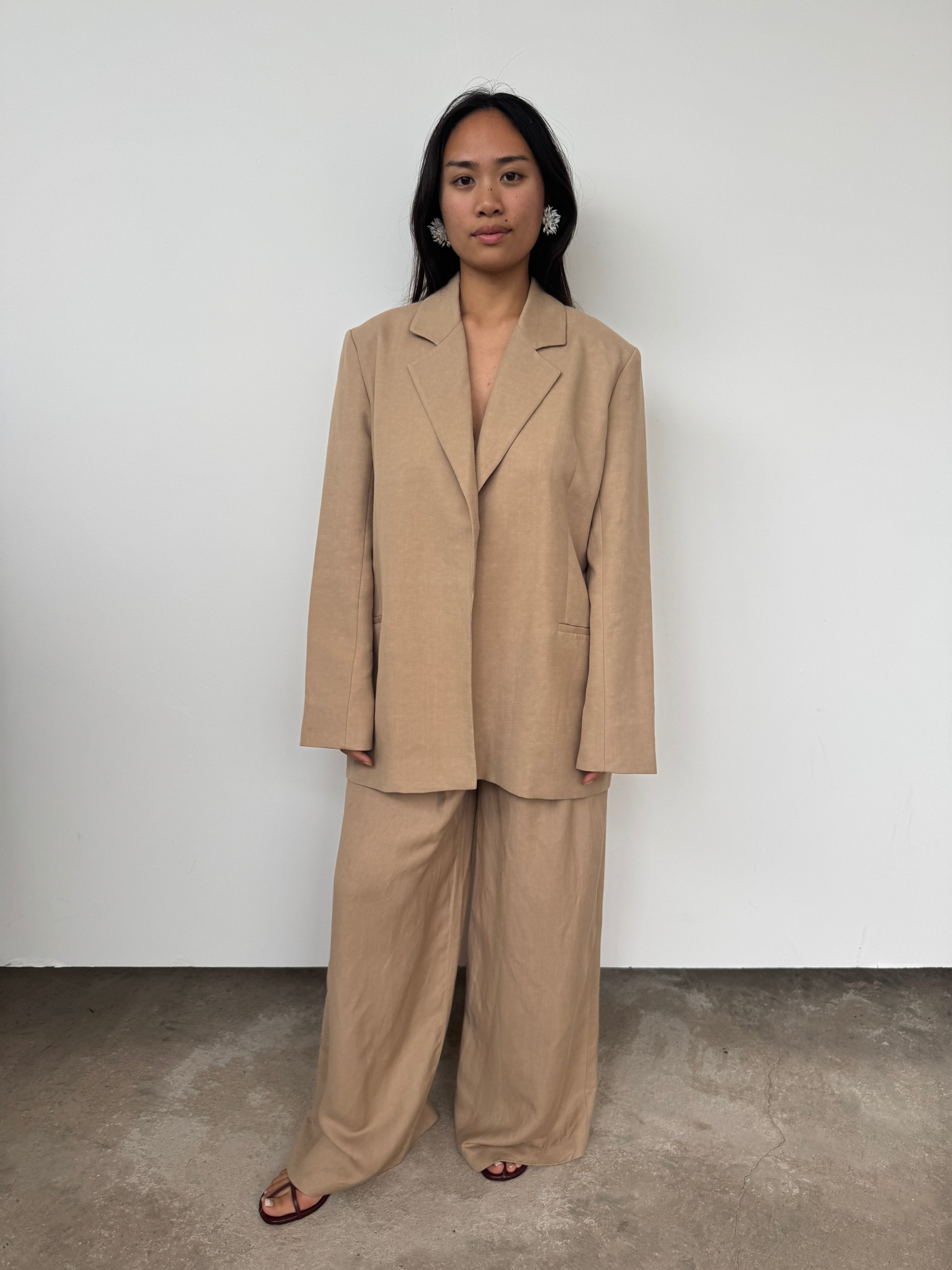 A relaxed yet refined boyfriend-style blazer with a classic V-neckline and lapel. Intended to be oversized for an effortless throw-on fit, it has long sleeves and side pockets as well as a straight silhouette that crops long on the body. Designed from an ultra soft blend of viscose, rayon and a signature 100% European Flax® linen fabrication in a warm desert shade.