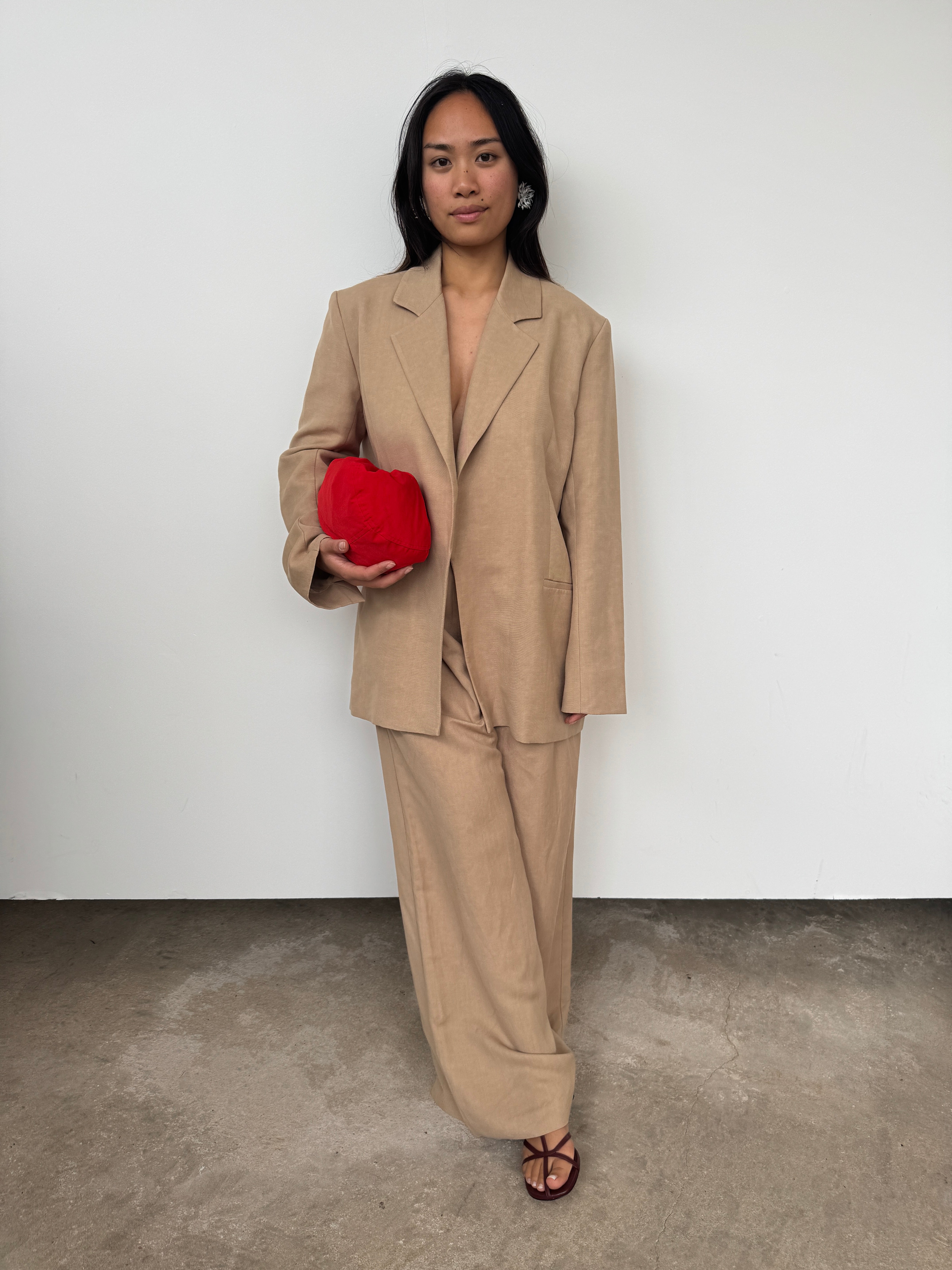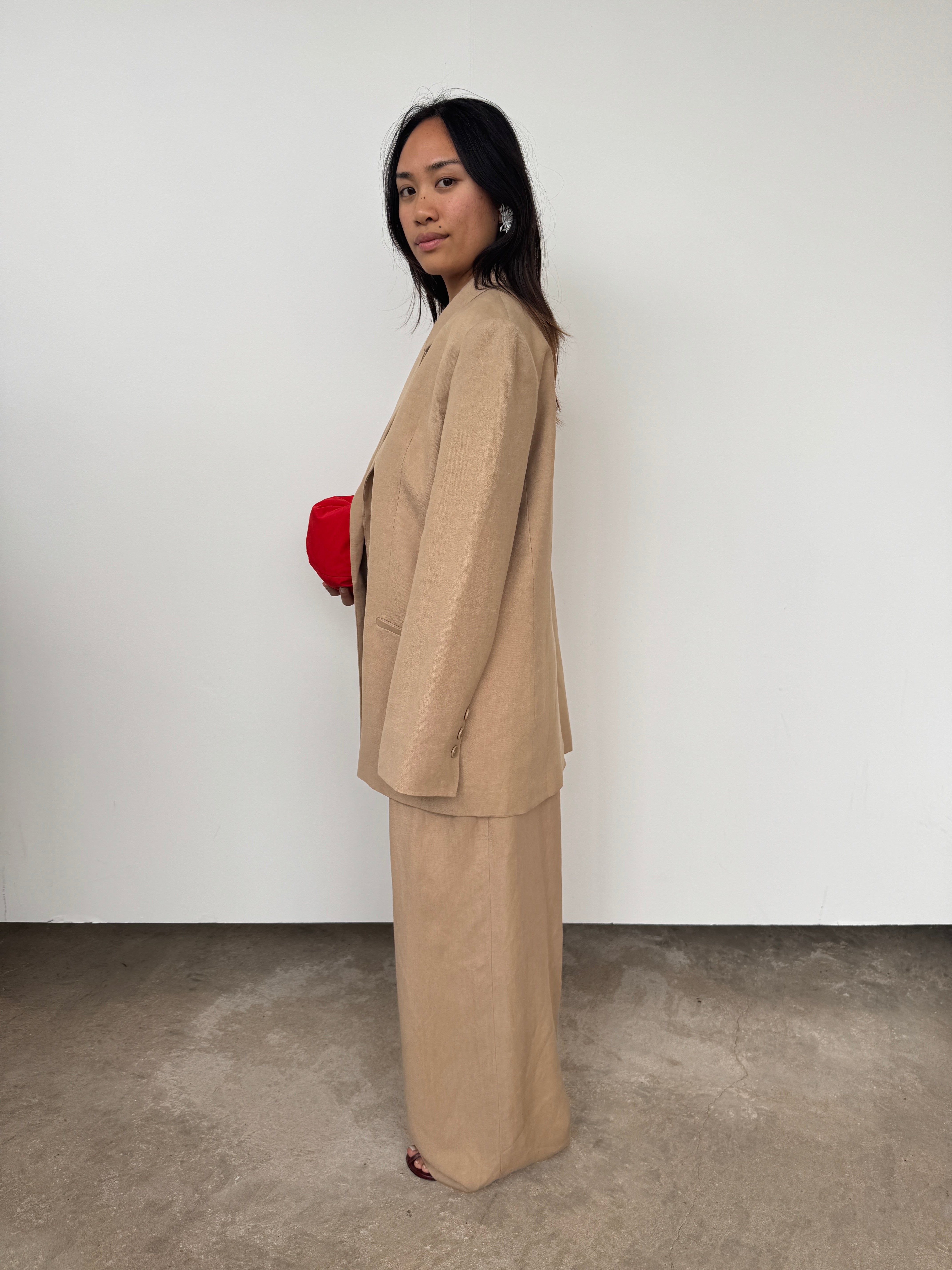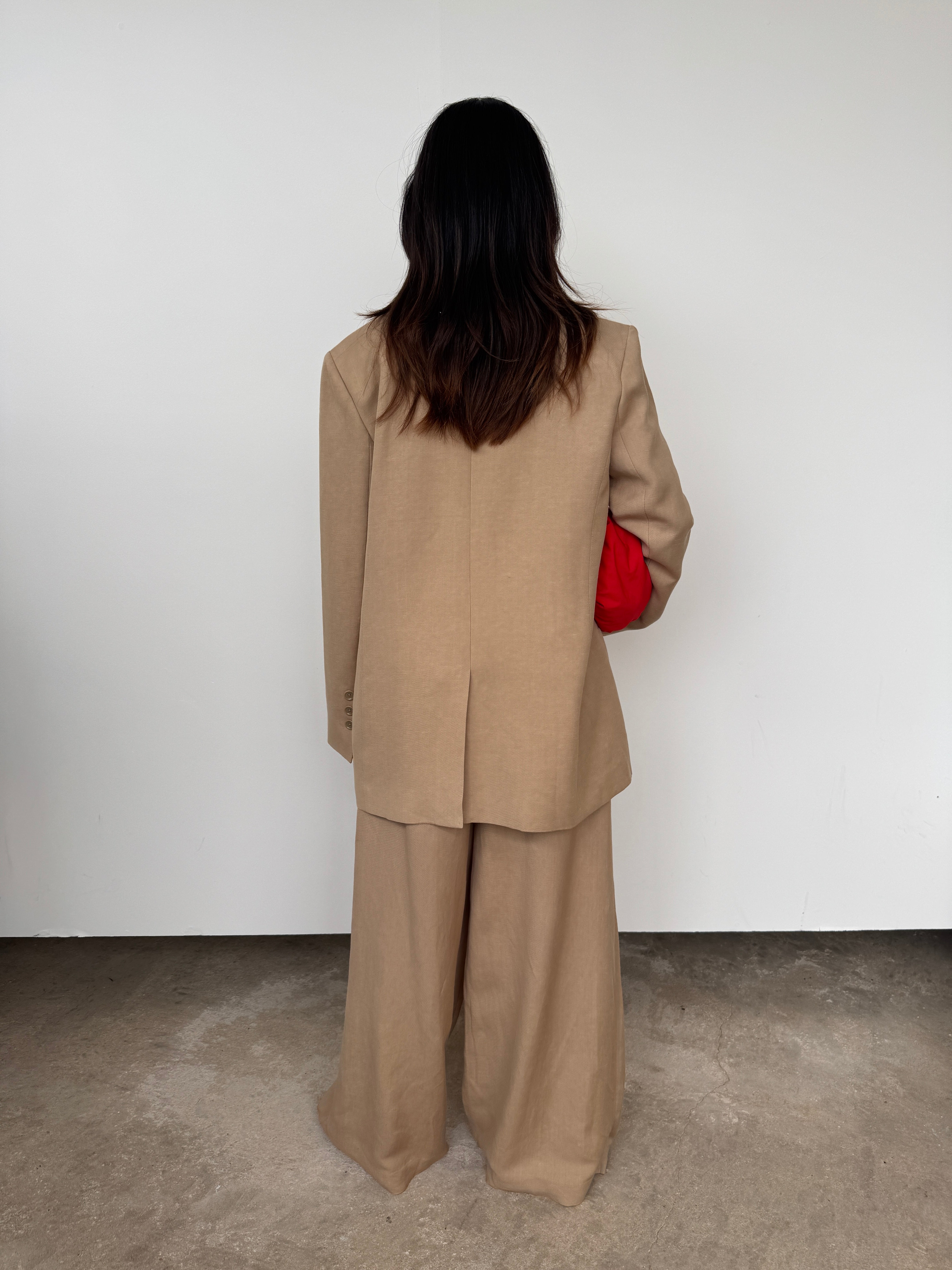 A relaxed yet refined boyfriend-style blazer with a classic V-neckline and lapel. Intended to be oversized for an effortless throw-on fit, it has long sleeves and side pockets as well as a straight silhouette that crops long on the body. Designed from an ultra soft blend of viscose, rayon and a signature 100% European Flax® linen fabrication in a warm desert shade.