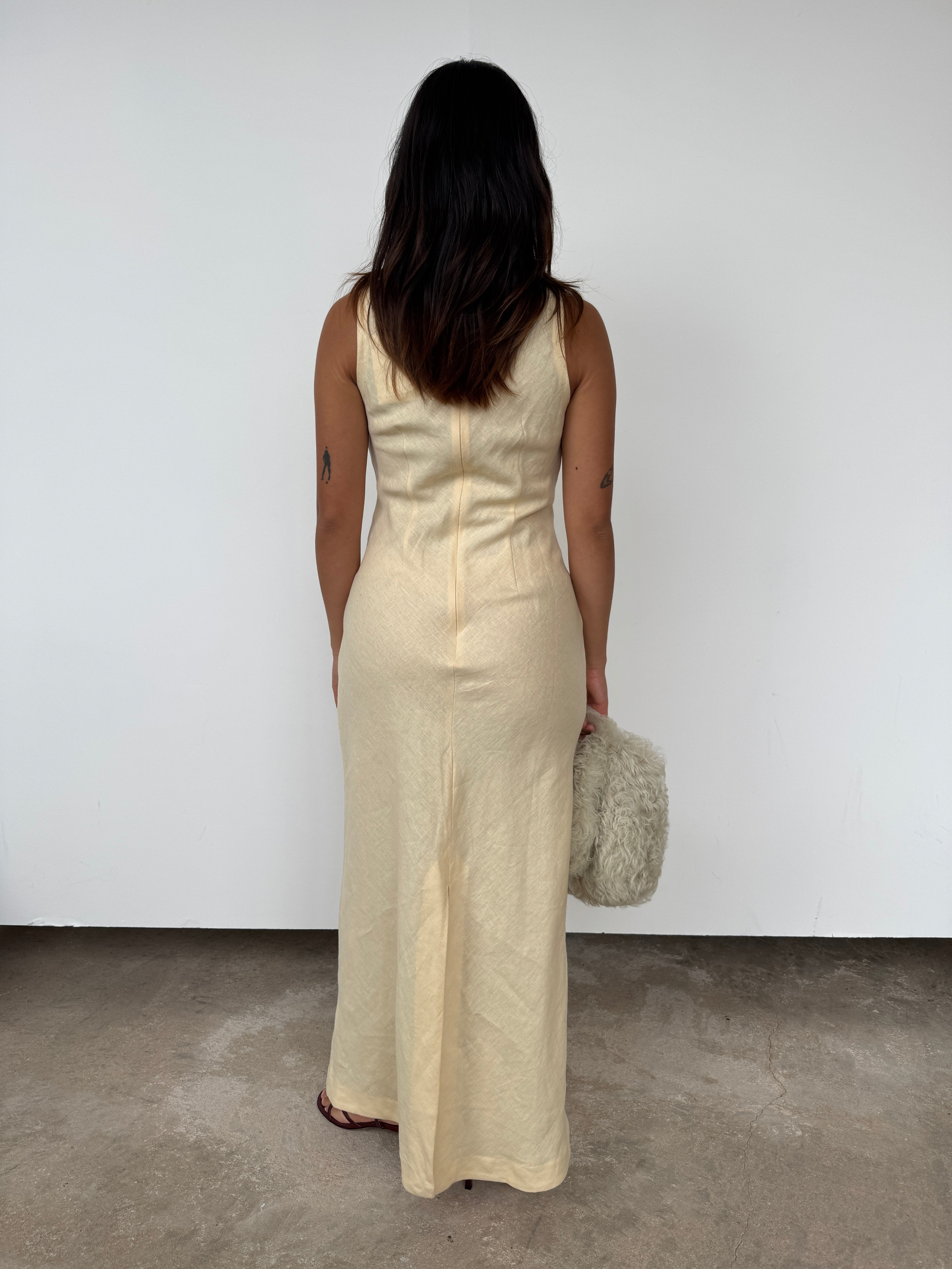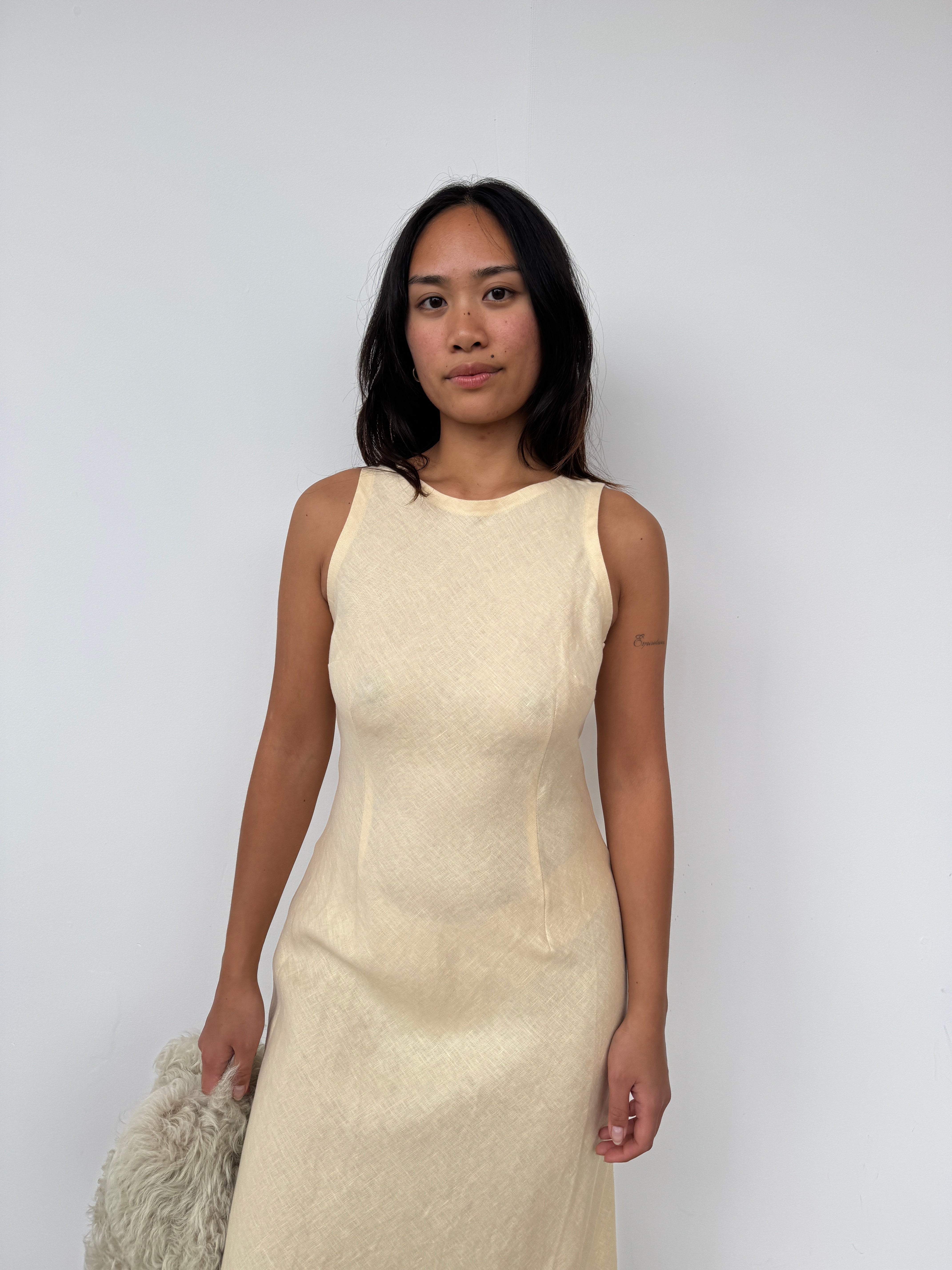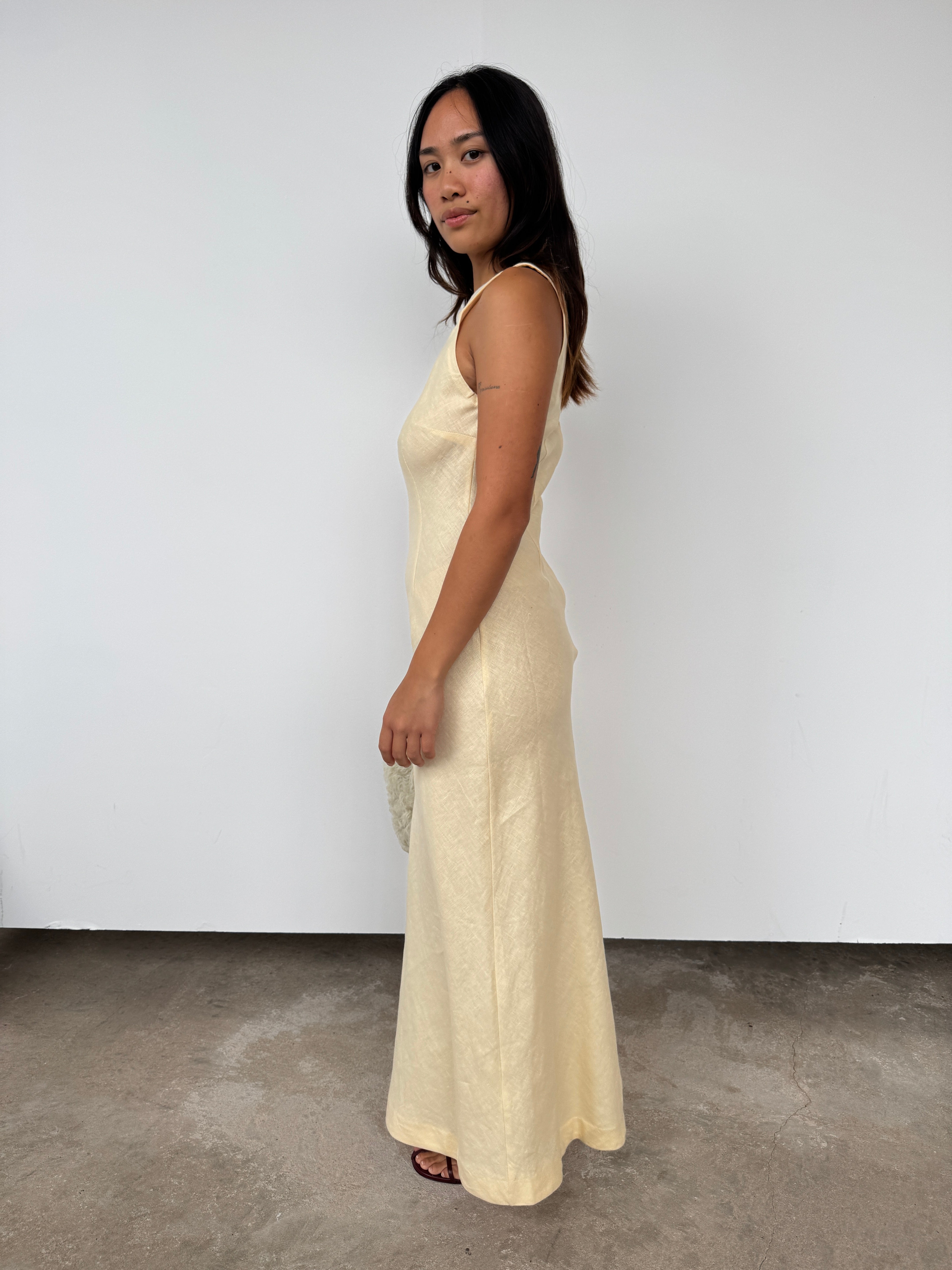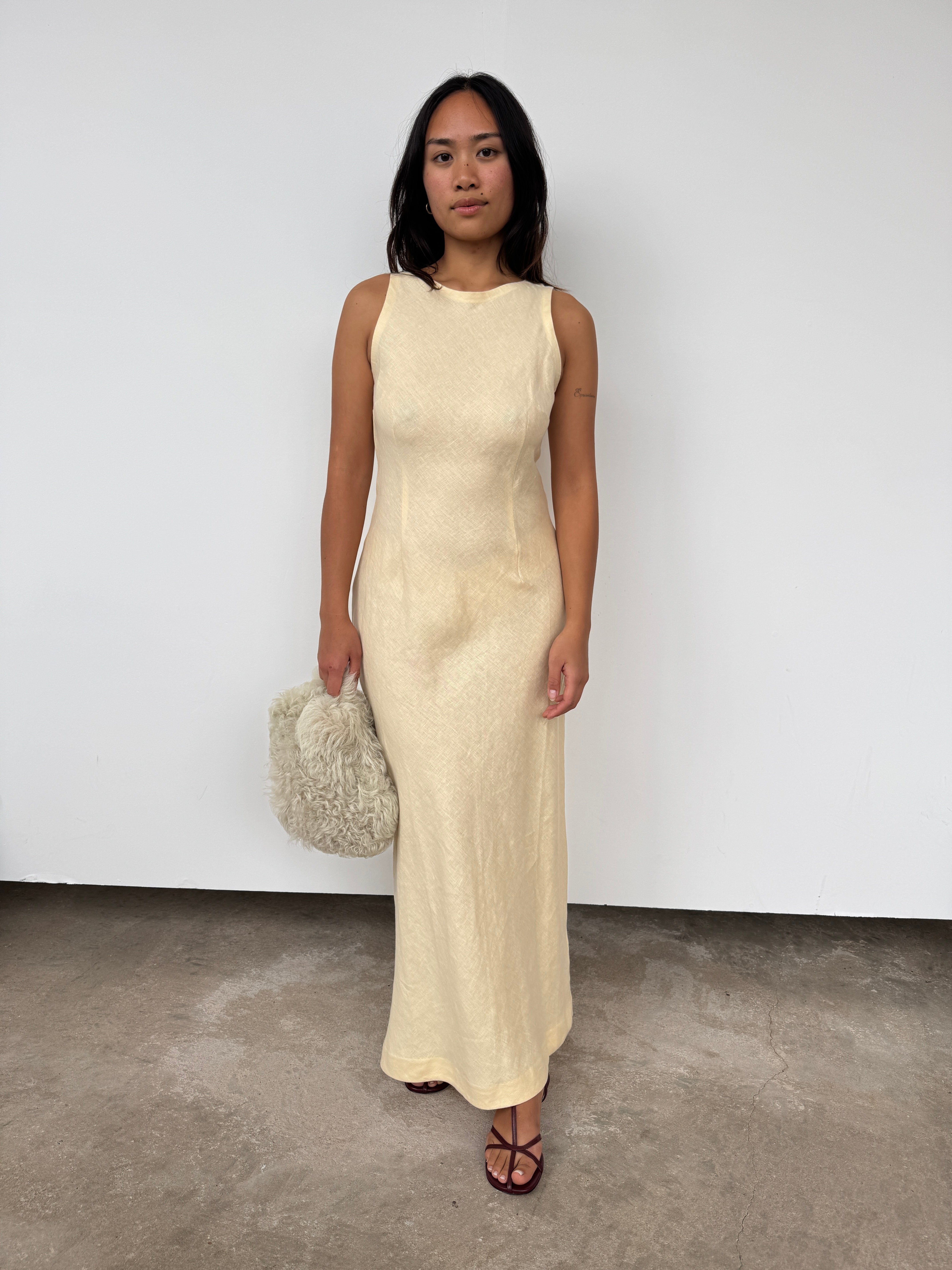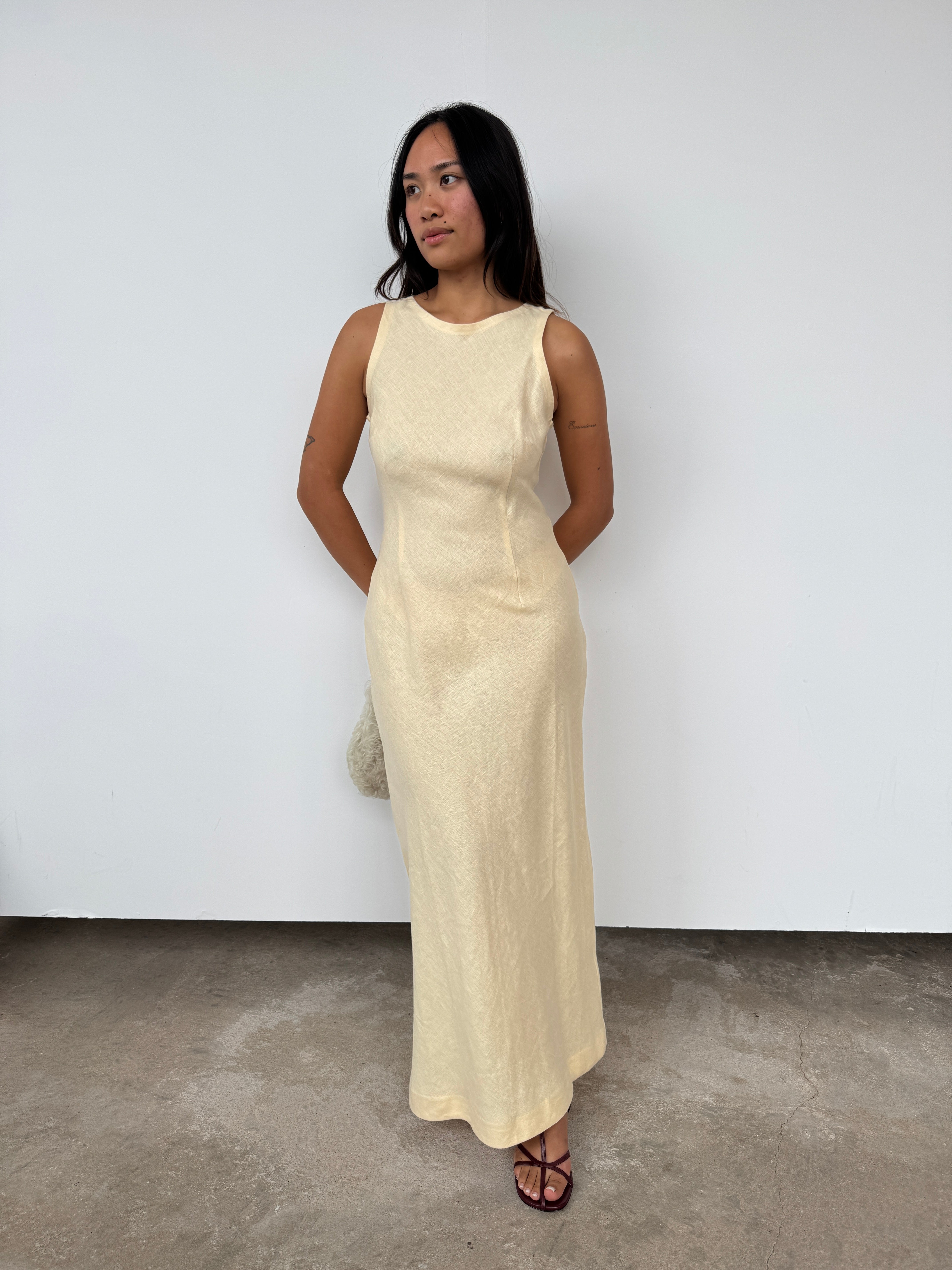 A sleeveless maxi dress with a boat-style neckline. It is softly fitted through the body with a smooth finish that falls into a slight A-line skirt. It is designed from a signature 100% European Flax® linen fabrication in a soft buttery yellow.