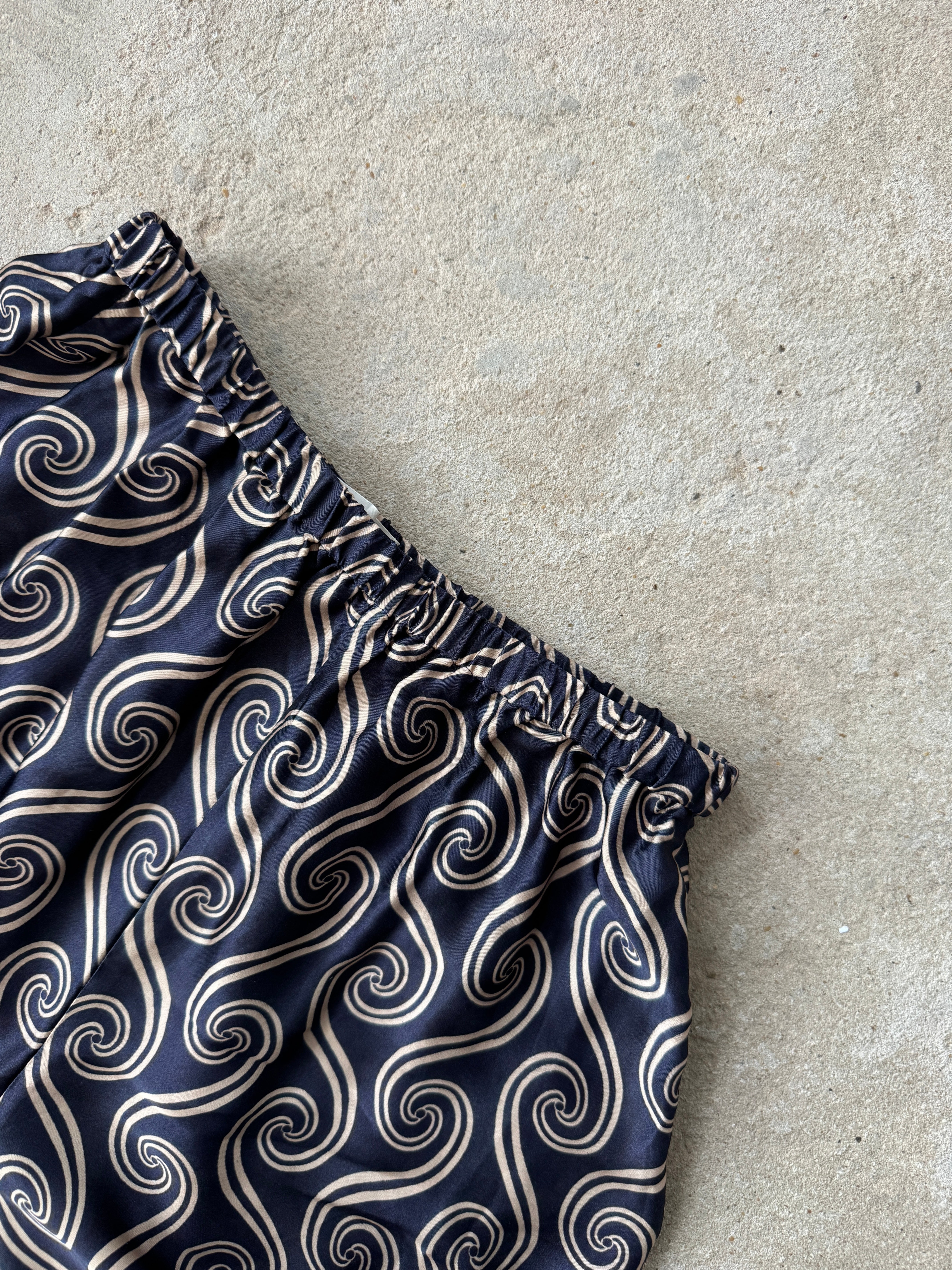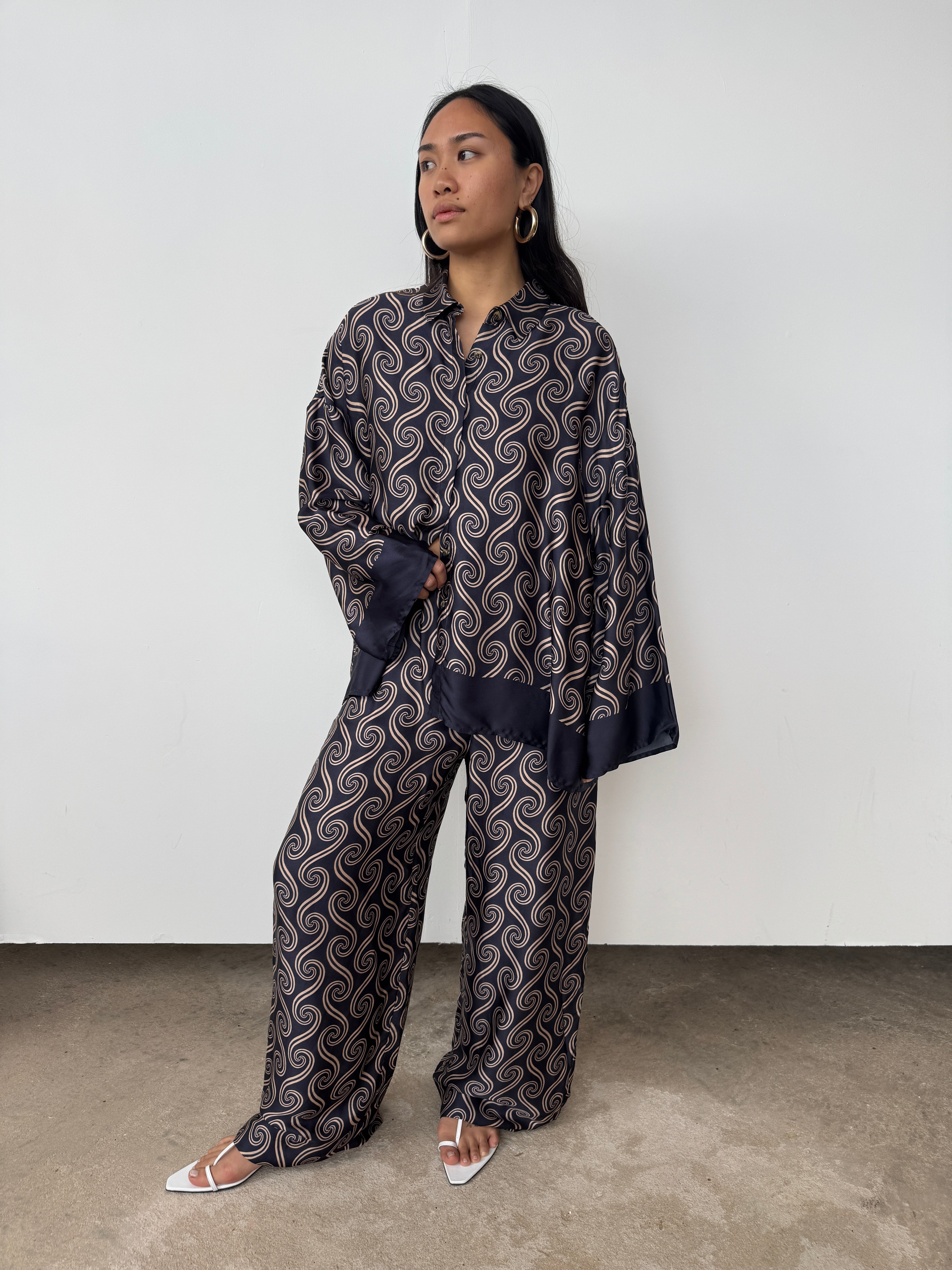 "Faithfull's 'Jensen' pants are printed with swirls that resemble an optical illusion. Made from fluid satin, they have a comfortable elasticated waistband and fall to wide legs with floor-skimming hems."