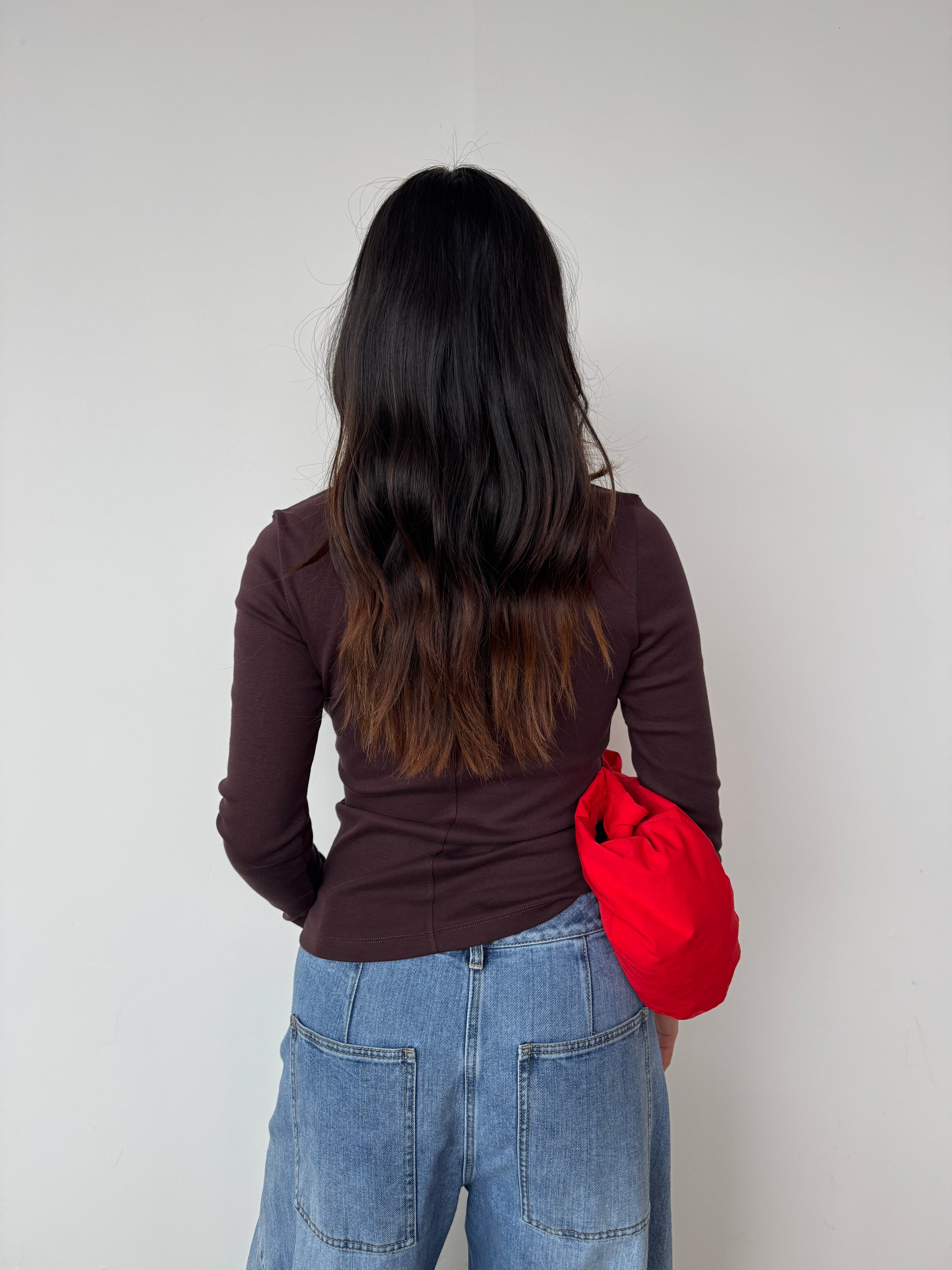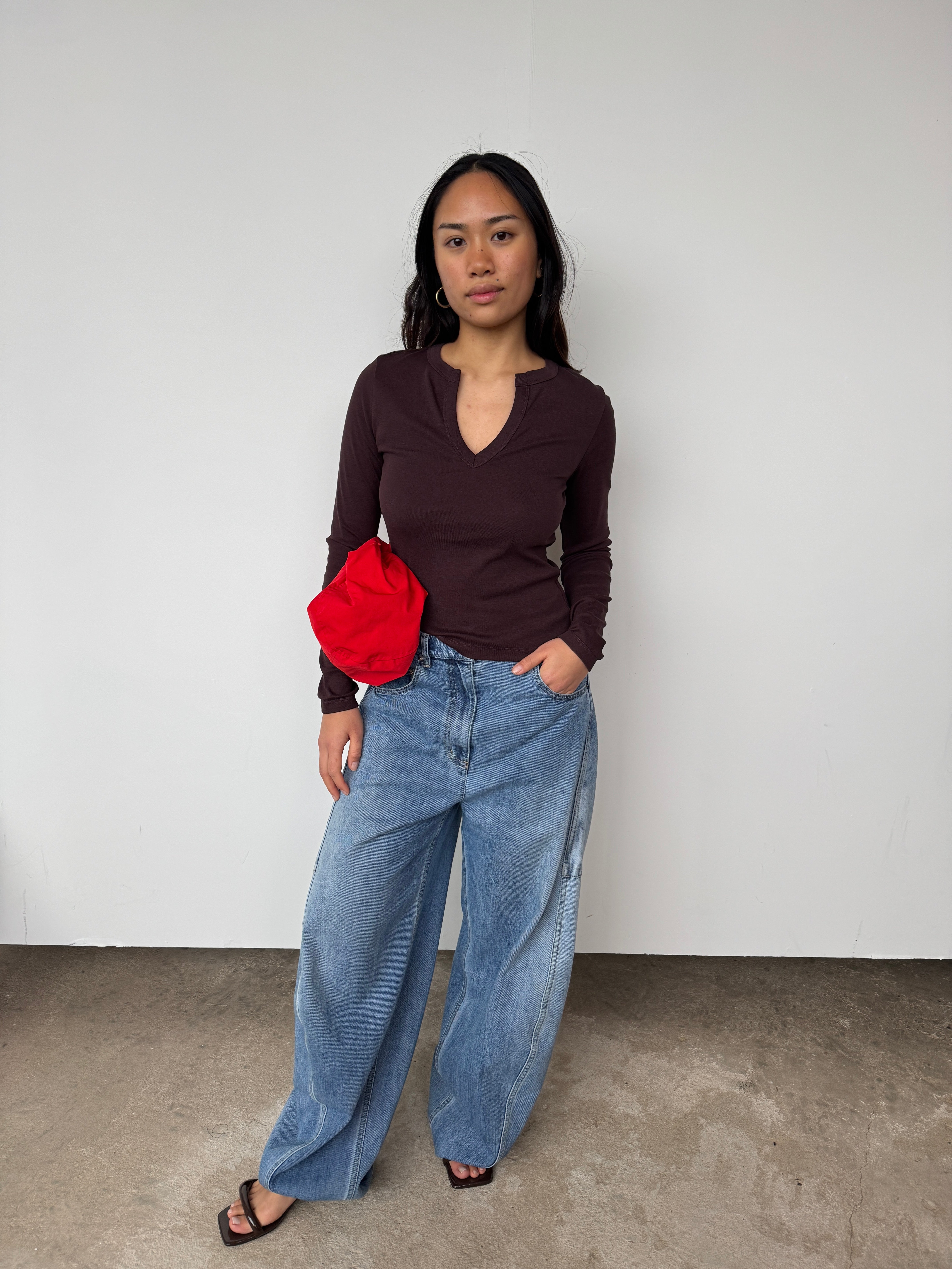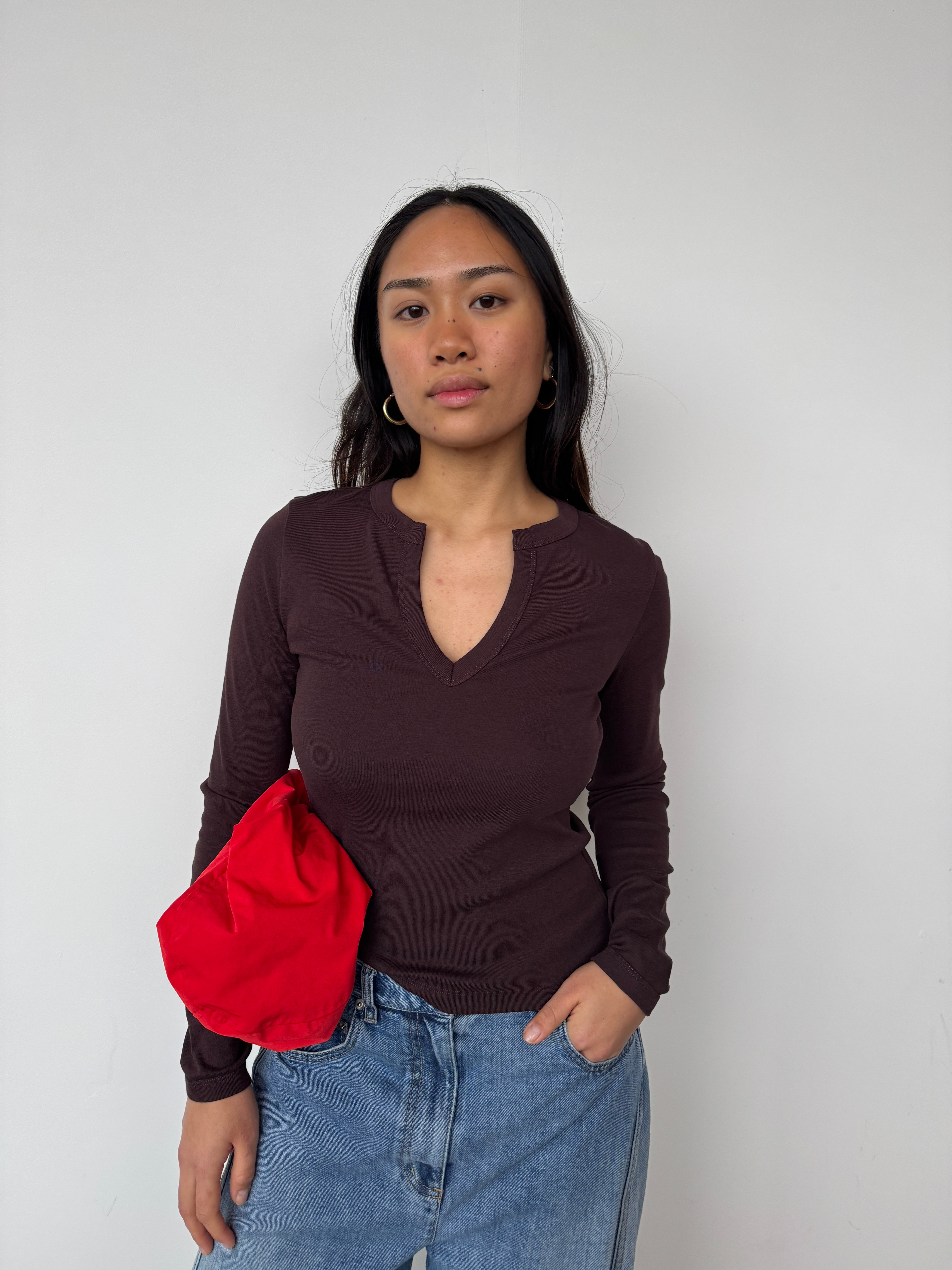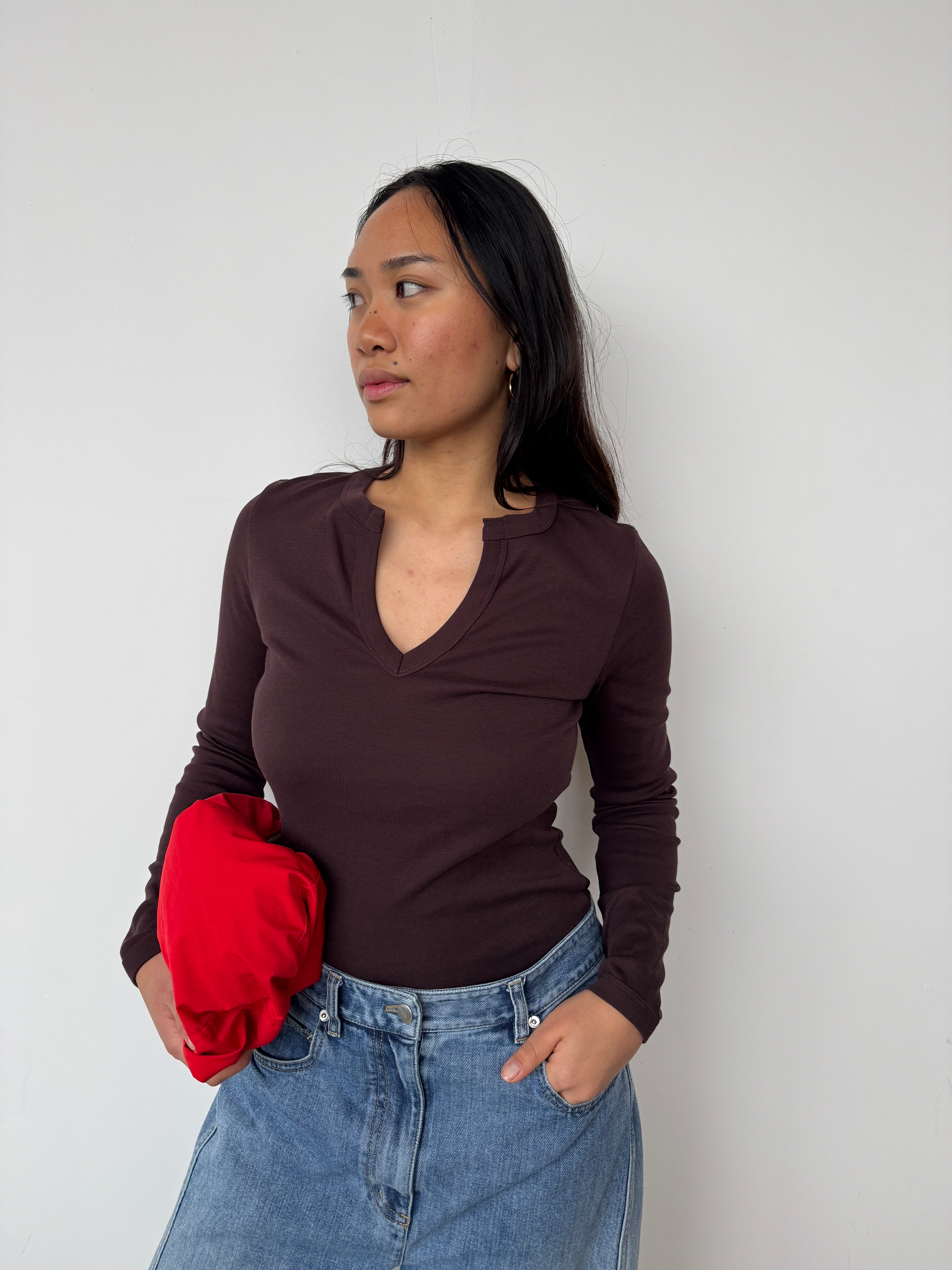 A relaxed v-neck long sleeve tee with a double-stitched cut-off seam on the back, made from 100% organic cotton. The perfect layering piece.