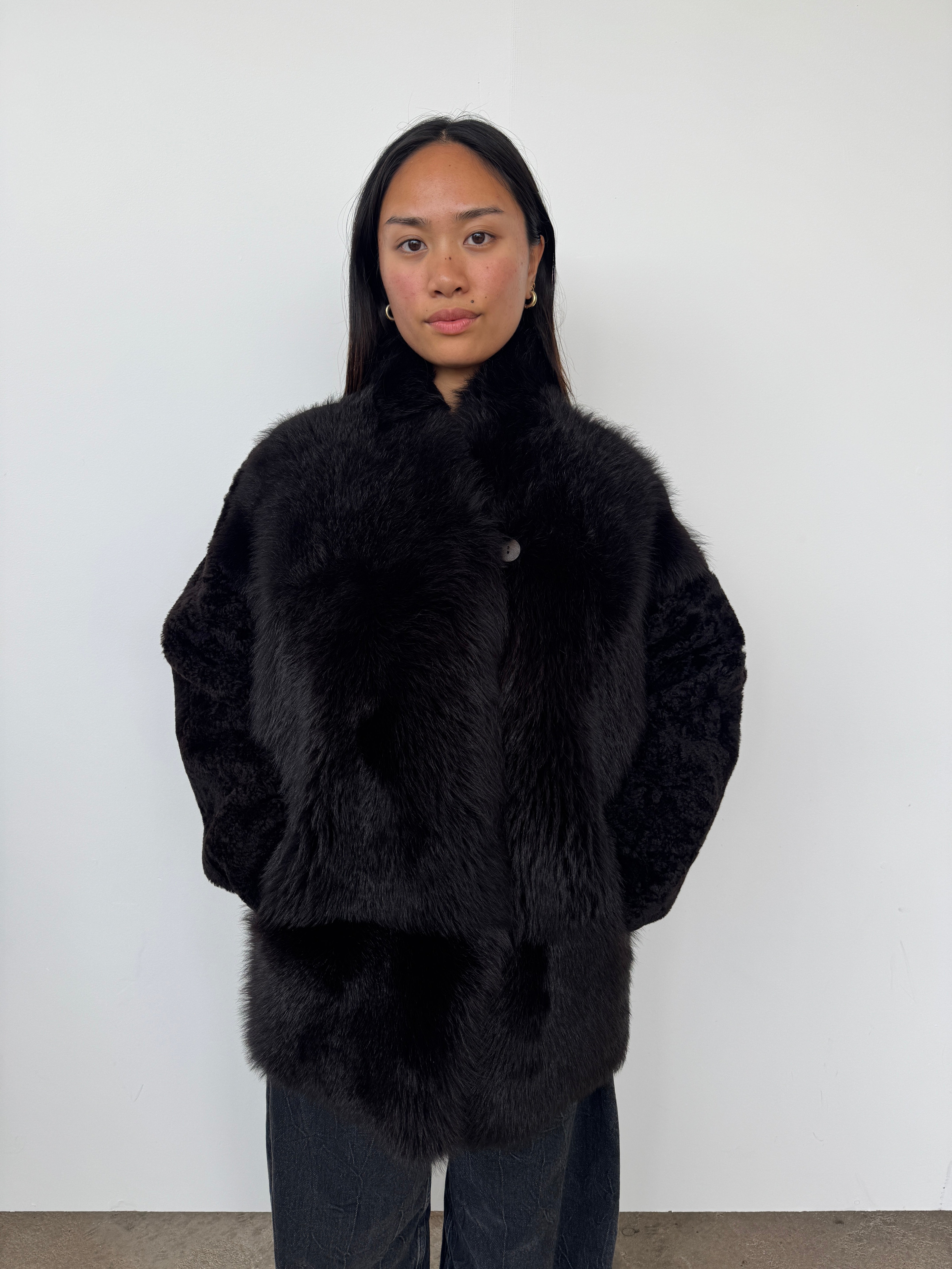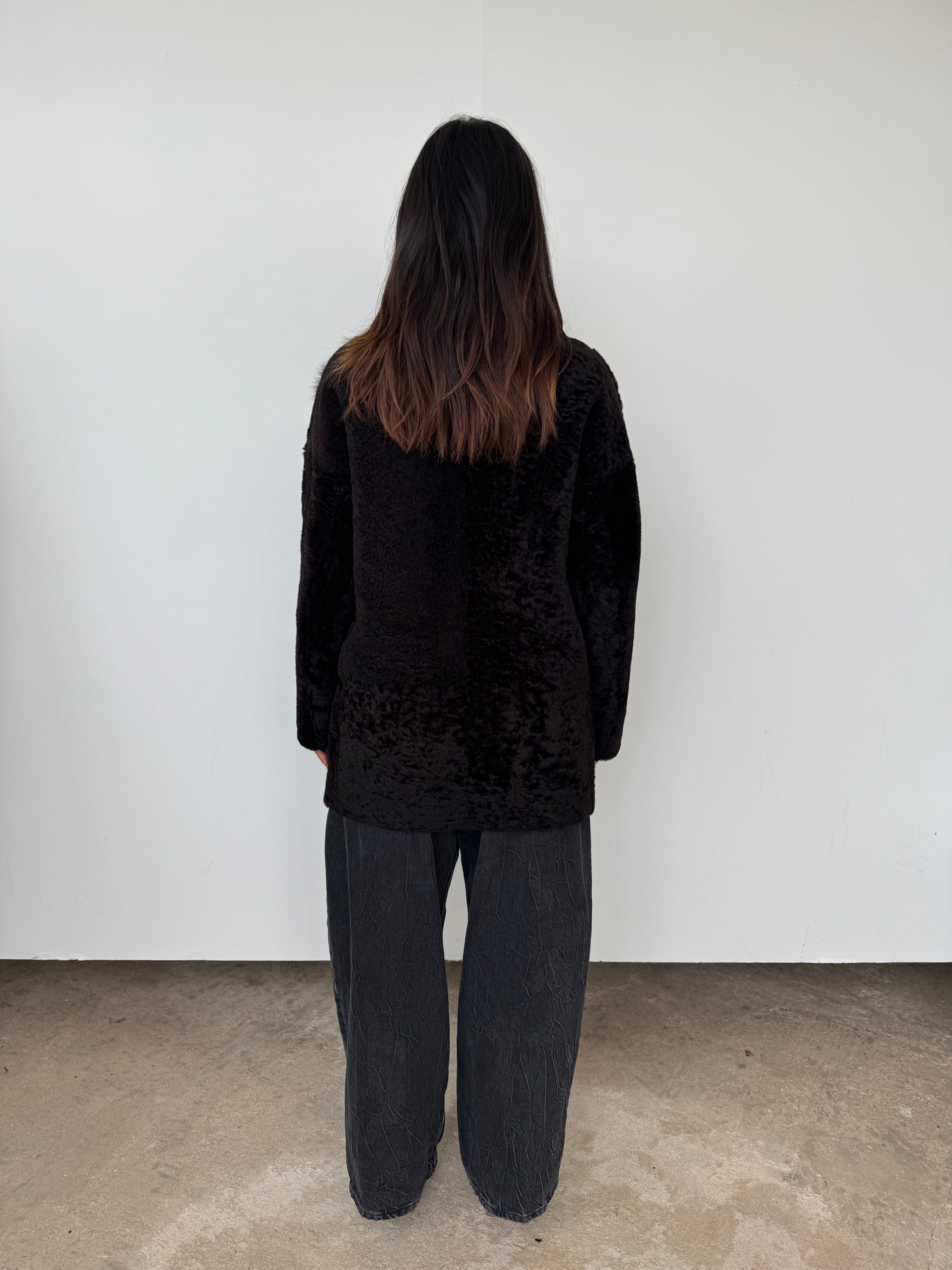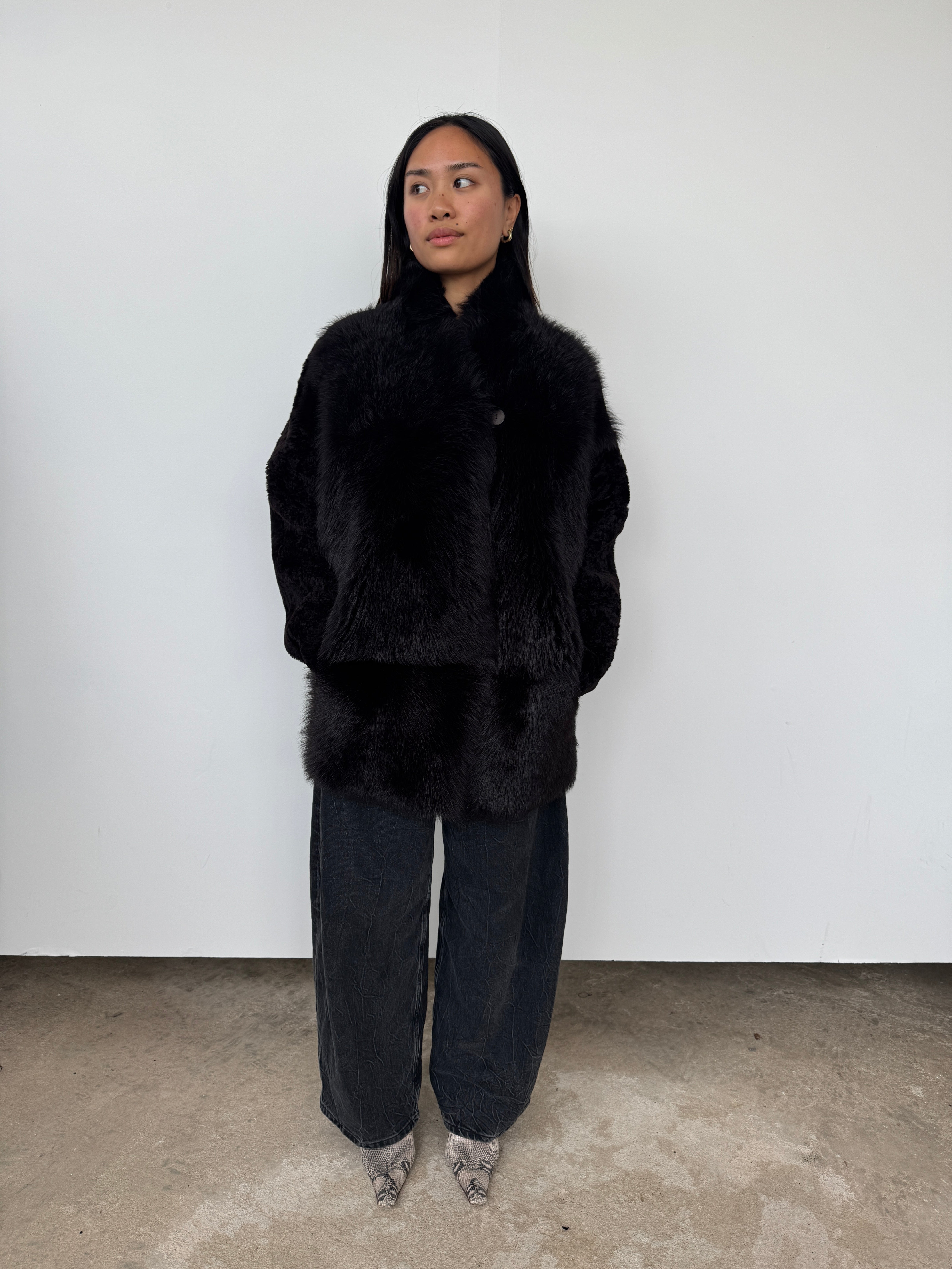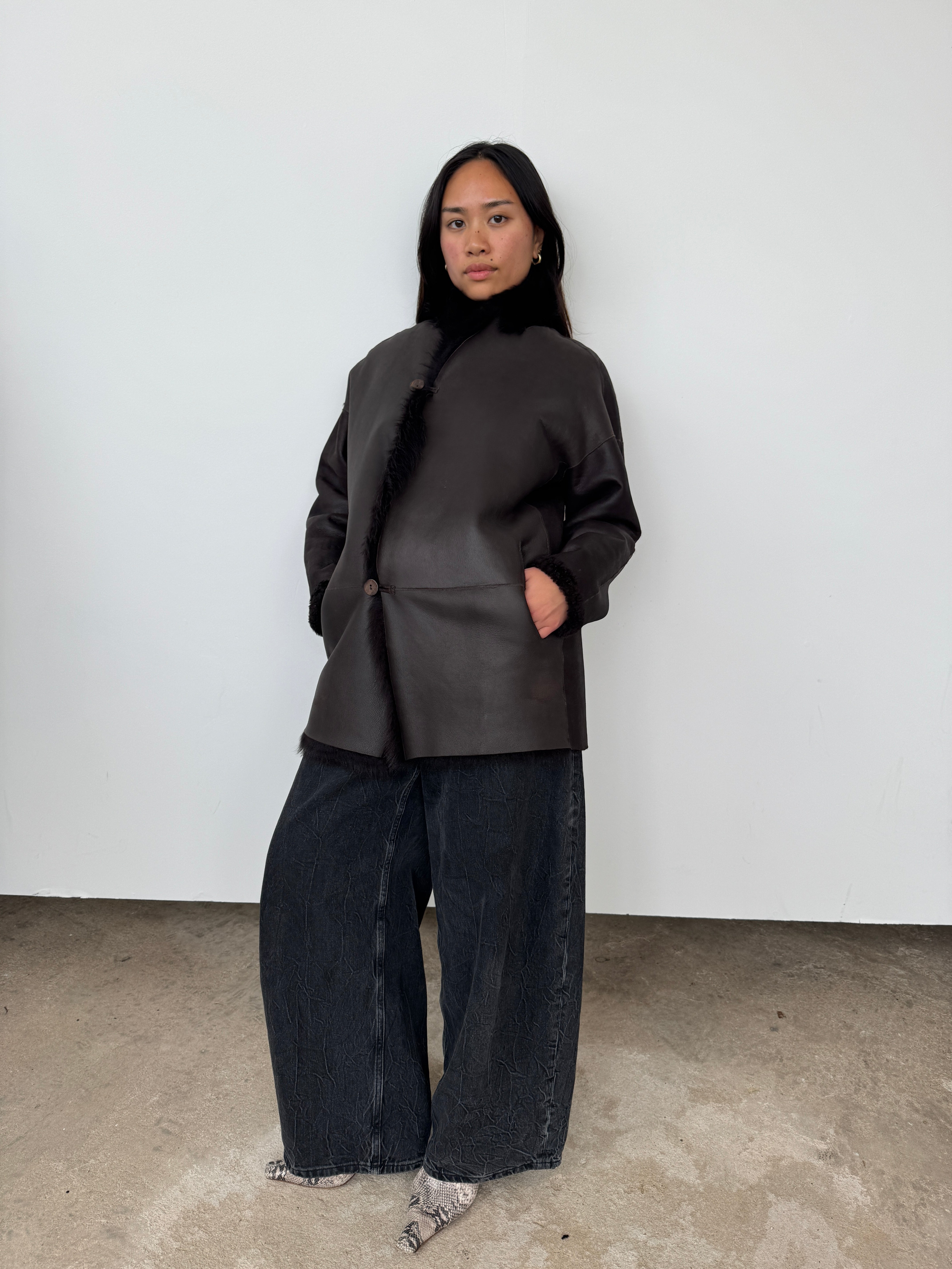 Crafted from responsibly sourced shearling, this cocoon coat represents a thoughtful choice for the conscious consumer. As a natural by-product of food production, the material offers an eco-friendly alternative to synthetic fabrics derived from fossil fuels. Entirely biodegradable and authentically natural, the shearling is both environmentally accredited and reversible, providing versatile styling options whilst maintaining its commitment to sustainability. Please note: when worn with the wool side inside, the fit will feel slightly smaller, though we recommend taking your usual size.