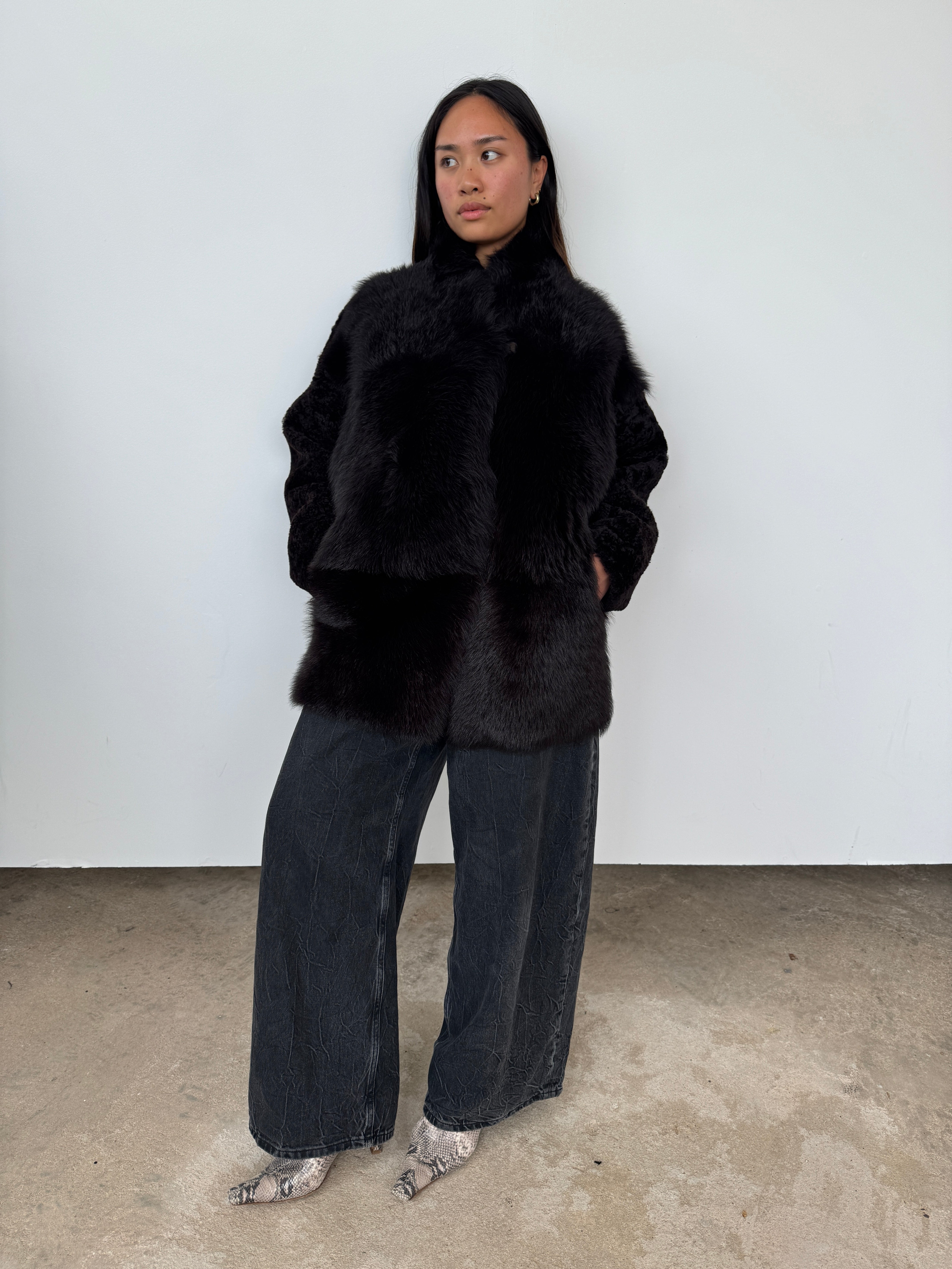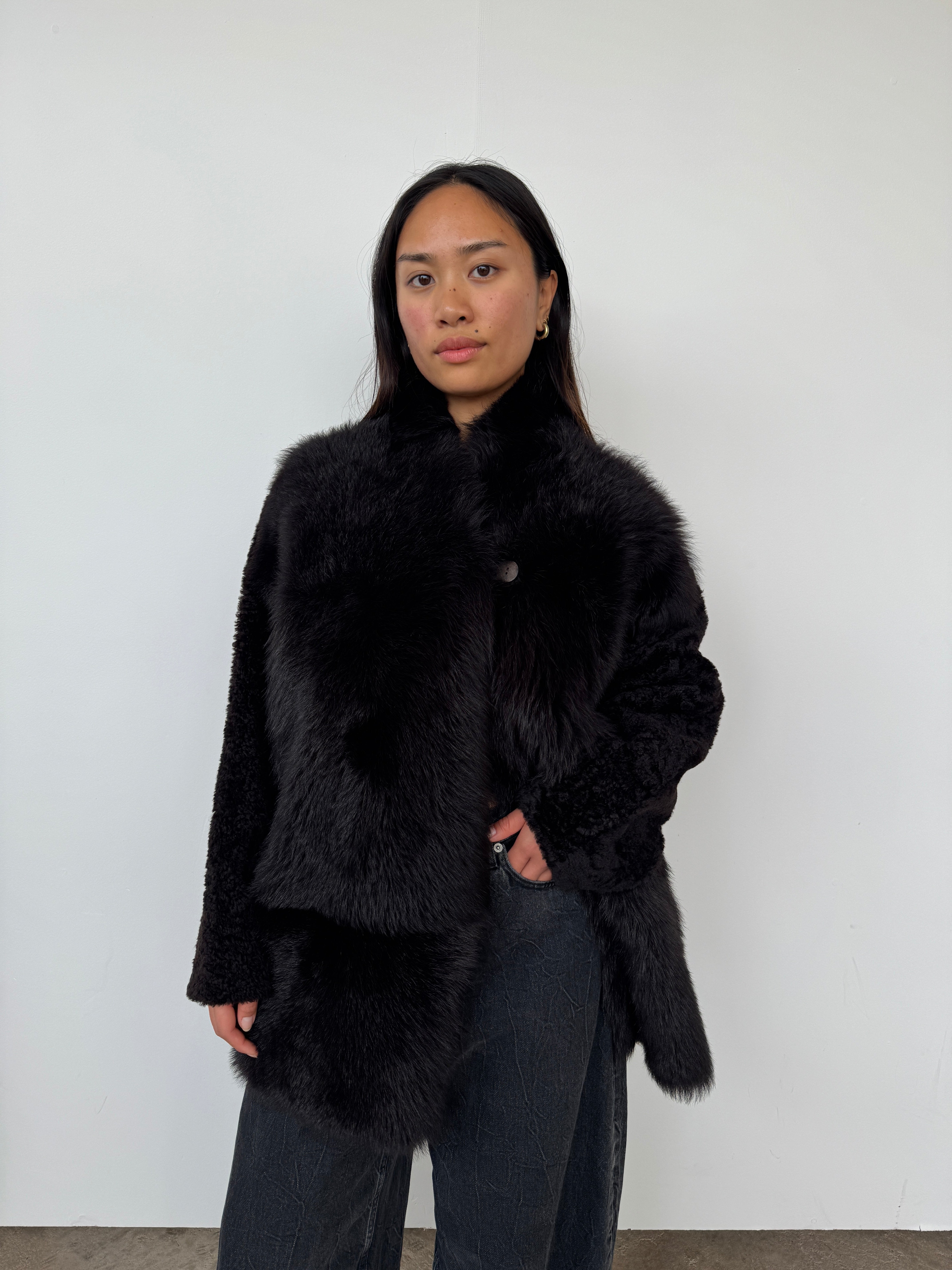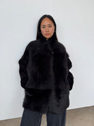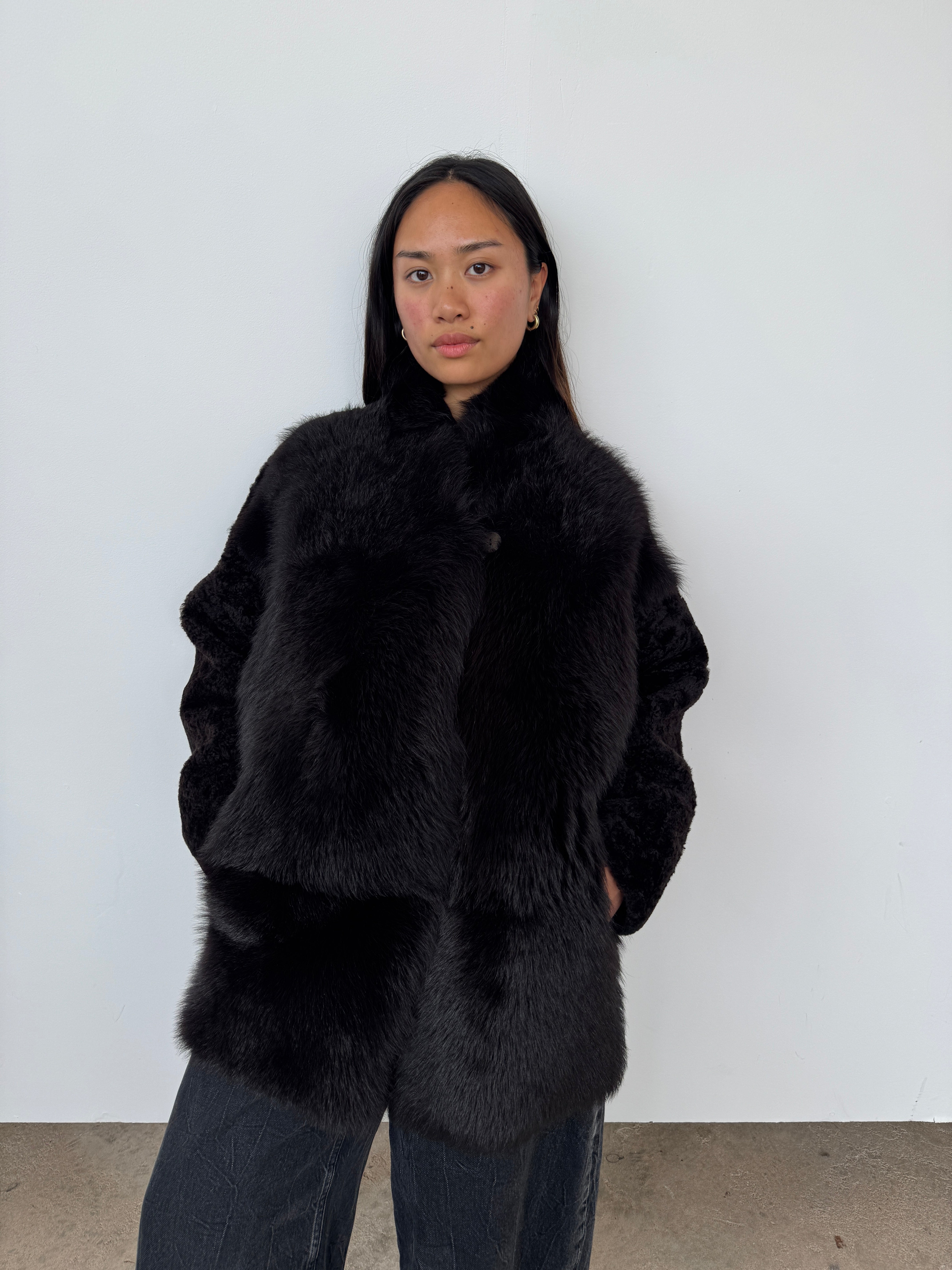 Crafted from responsibly sourced shearling, this cocoon coat represents a thoughtful choice for the conscious consumer. As a natural by-product of food production, the material offers an eco-friendly alternative to synthetic fabrics derived from fossil fuels. Entirely biodegradable and authentically natural, the shearling is both environmentally accredited and reversible, providing versatile styling options whilst maintaining its commitment to sustainability. Please note: when worn with the wool side inside, the fit will feel slightly smaller, though we recommend taking your usual size.
