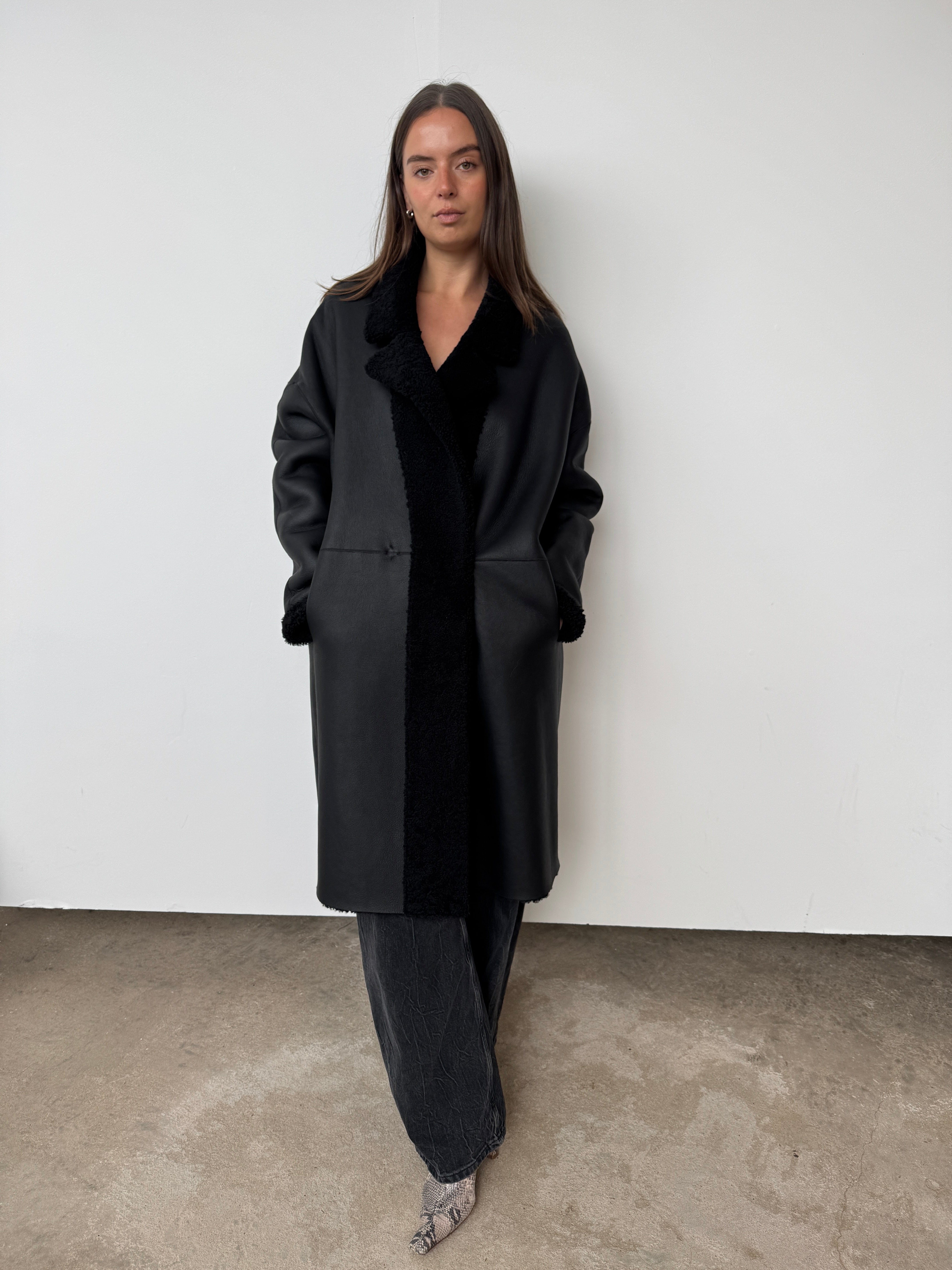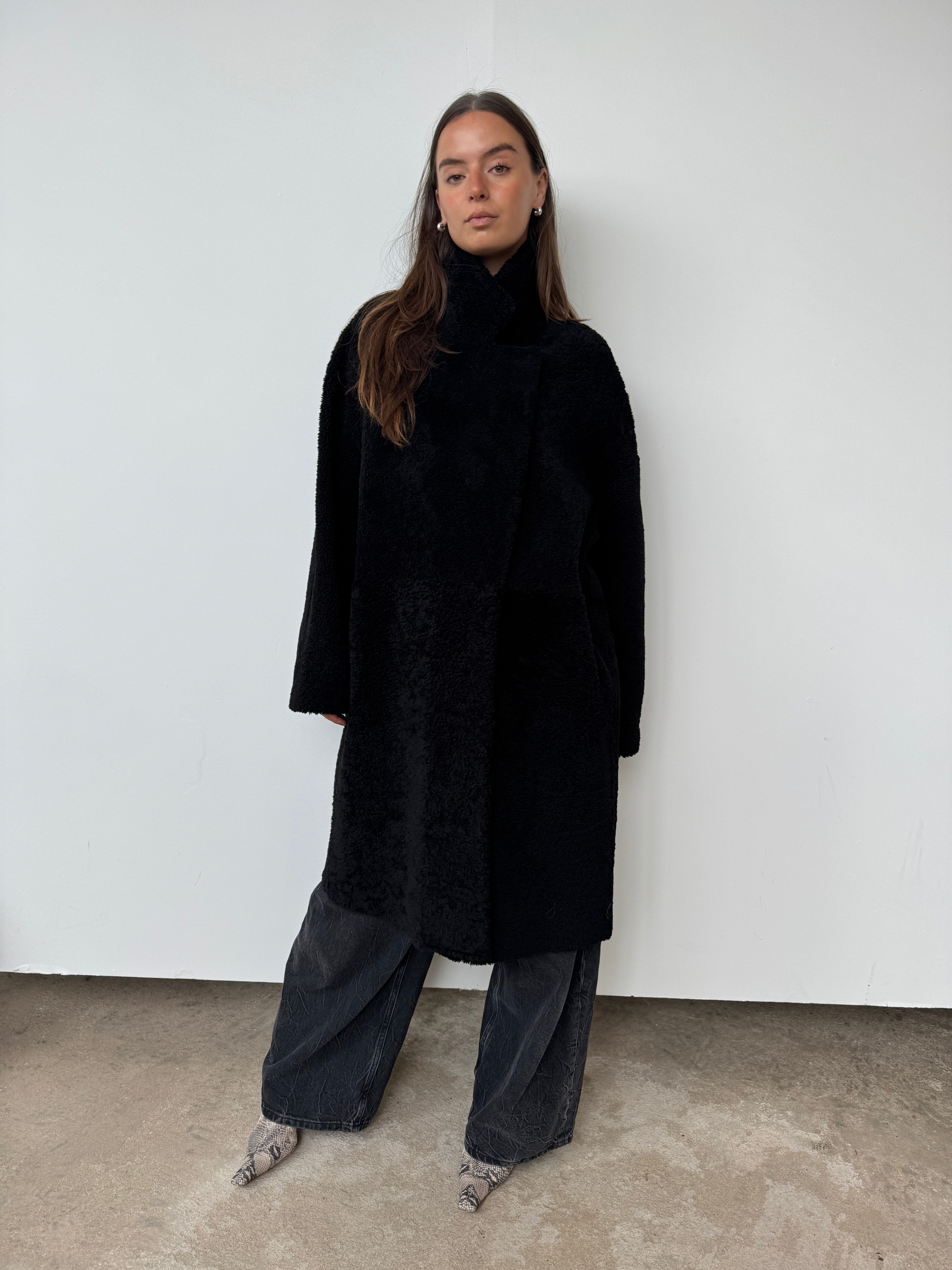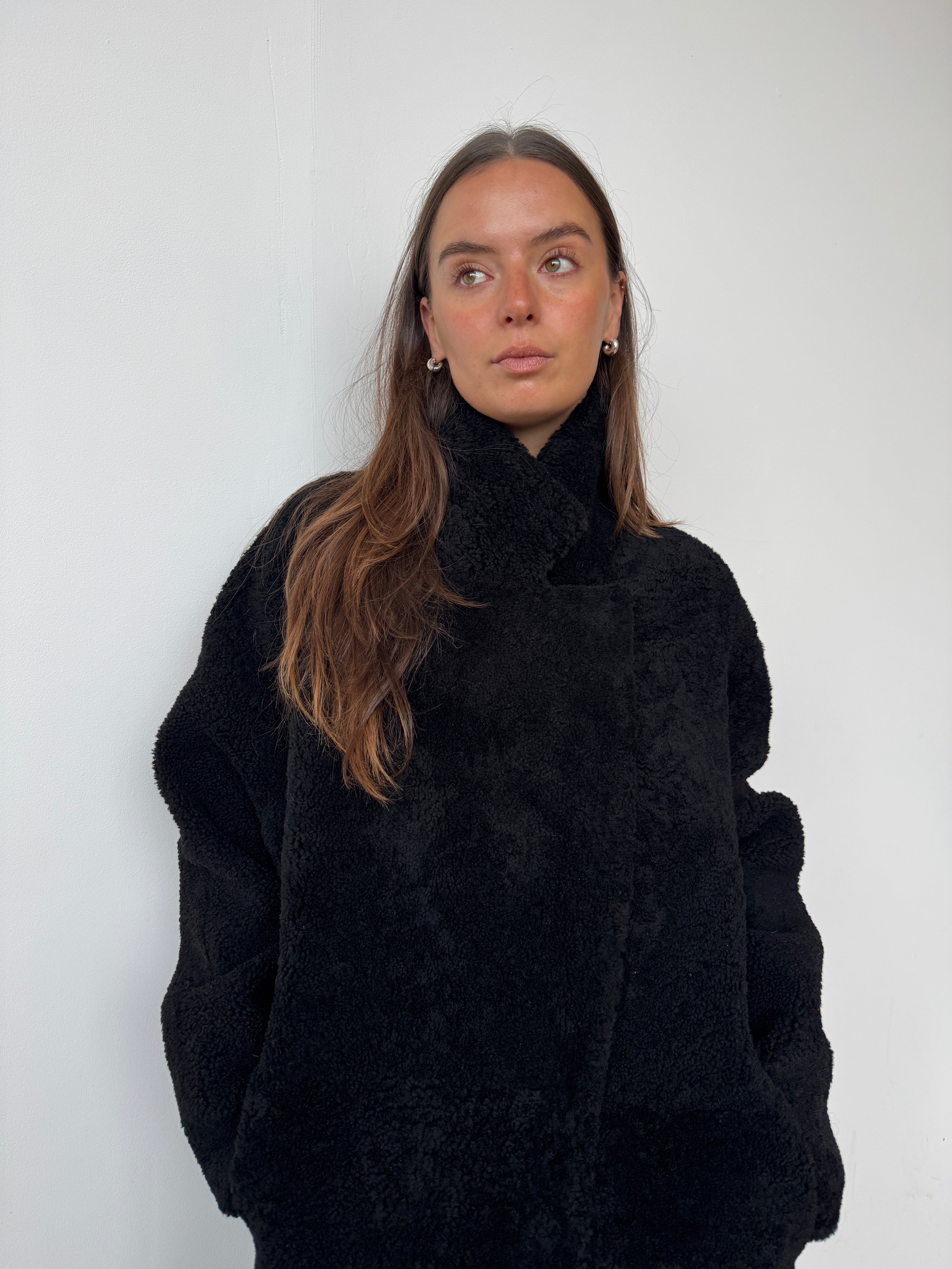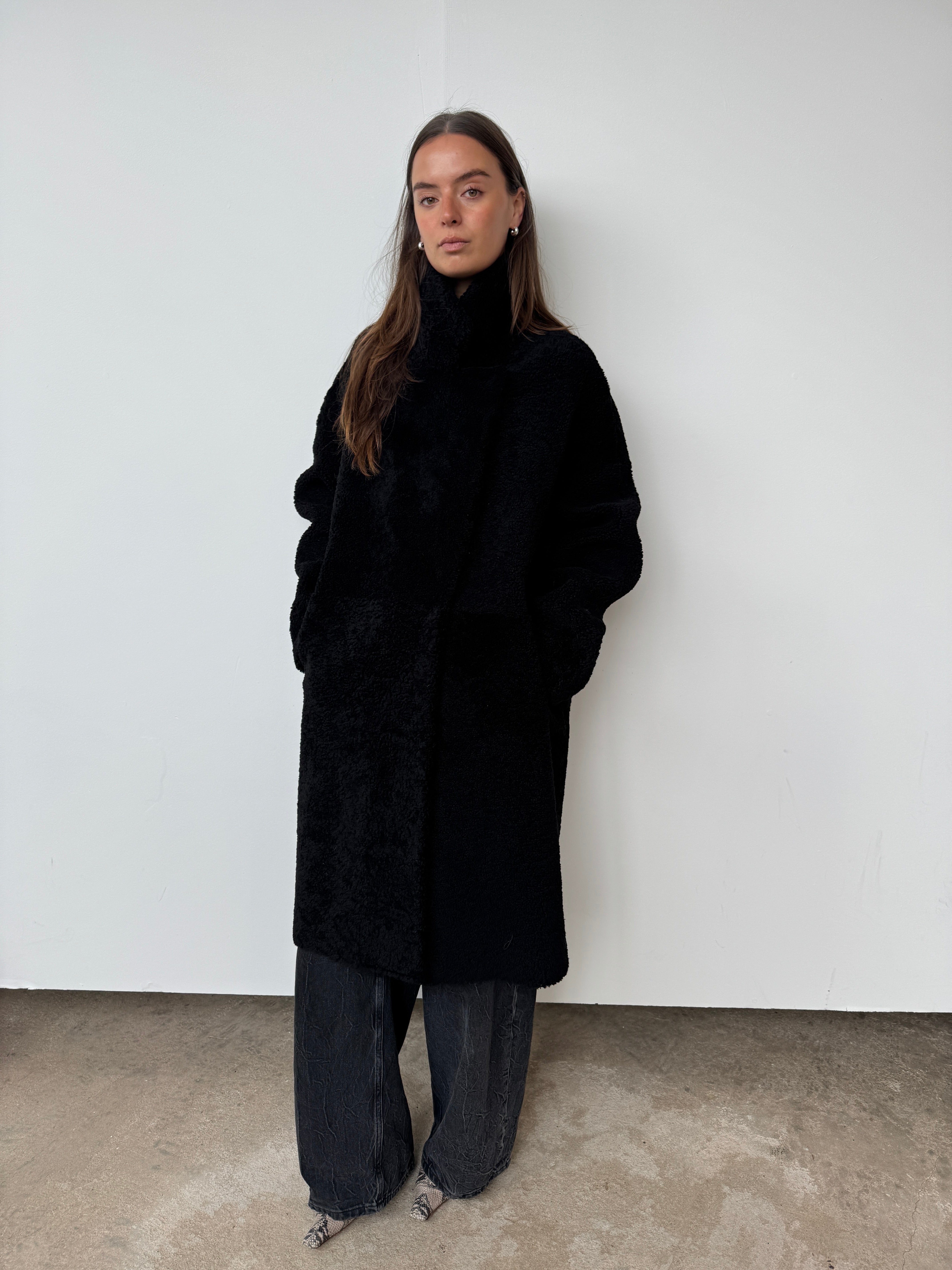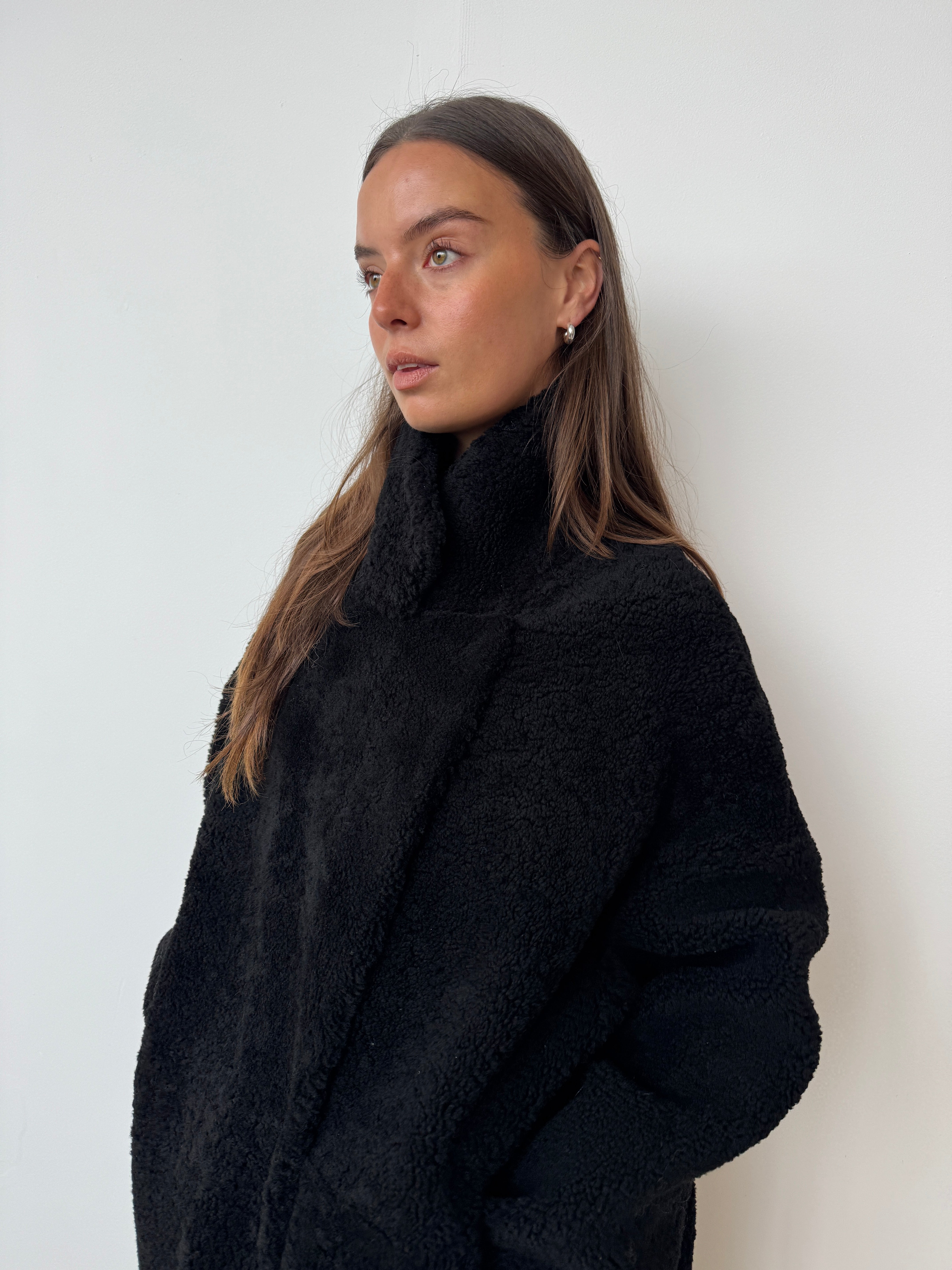 Crafted from sustainably sourced shearling, a natural by-product of food production, this piece offers an eco-conscious alternative to synthetic materials.