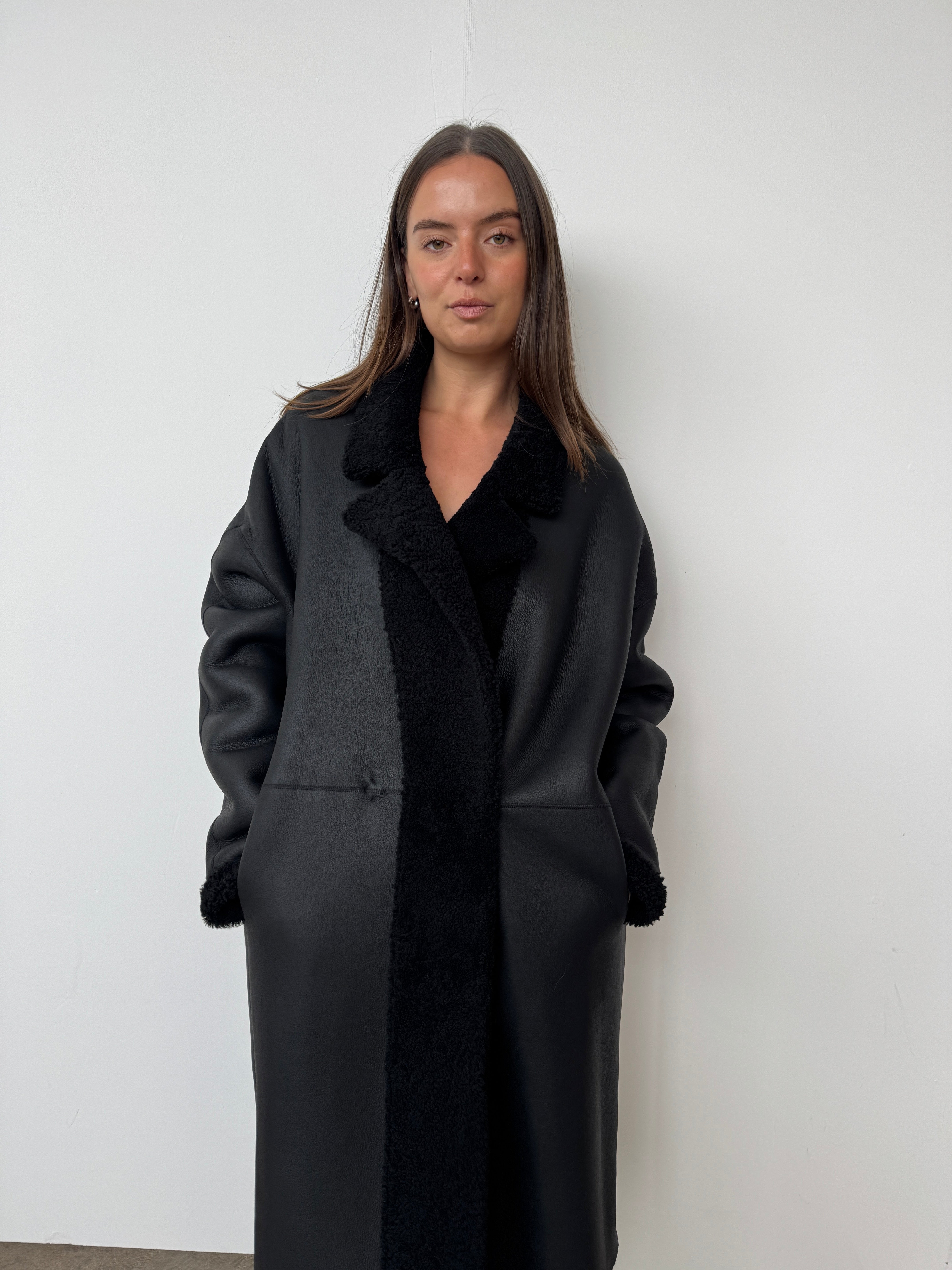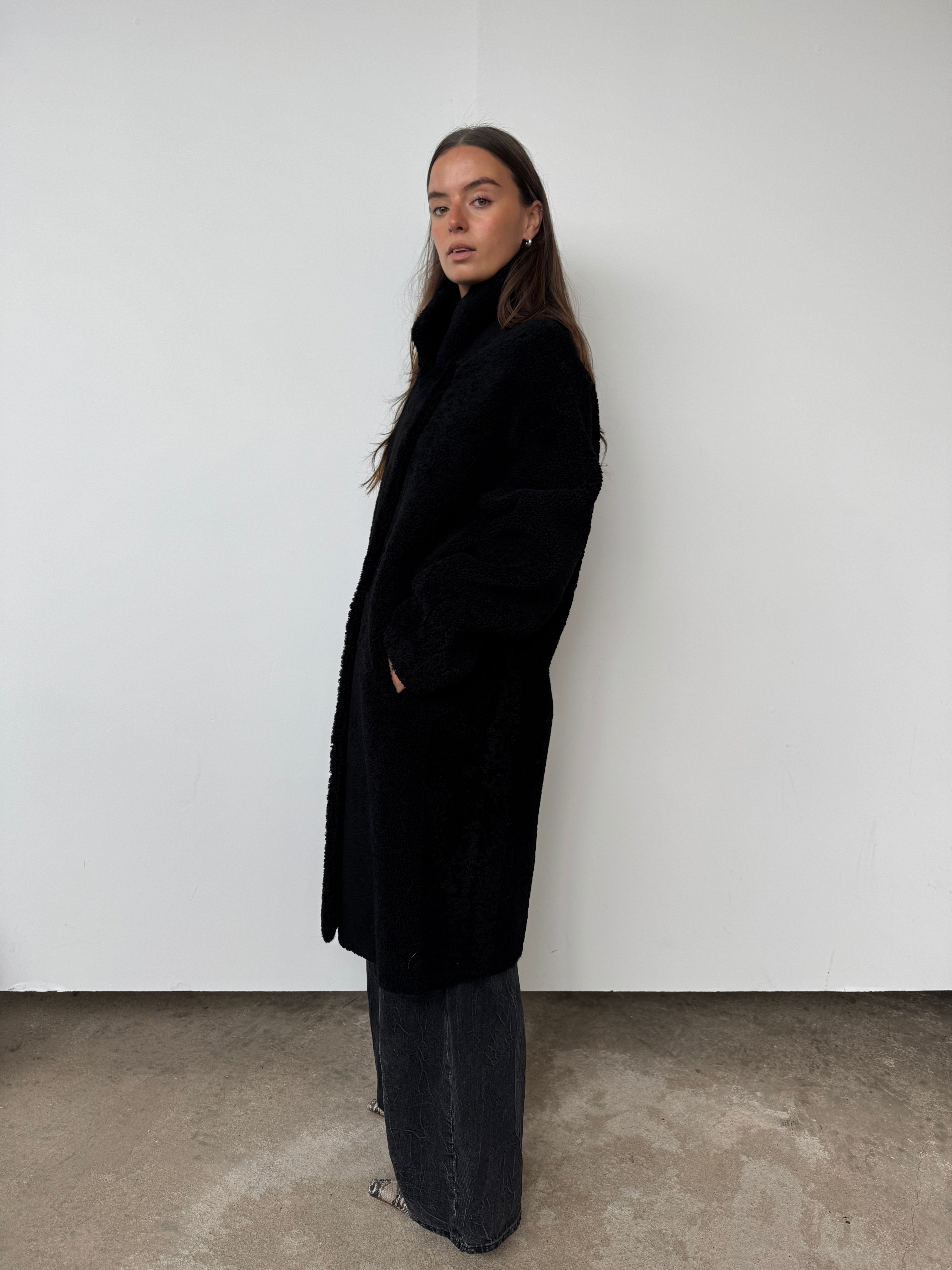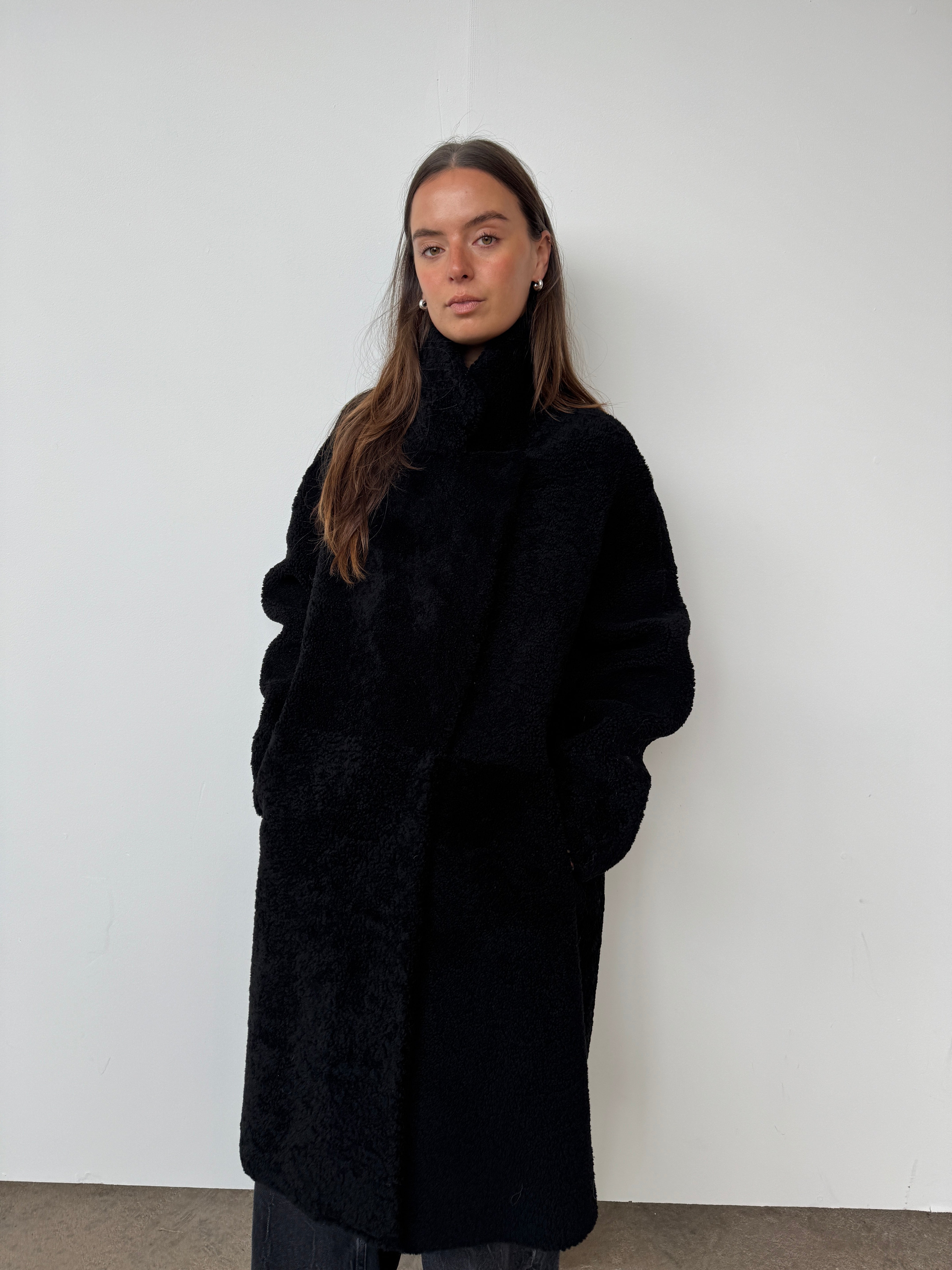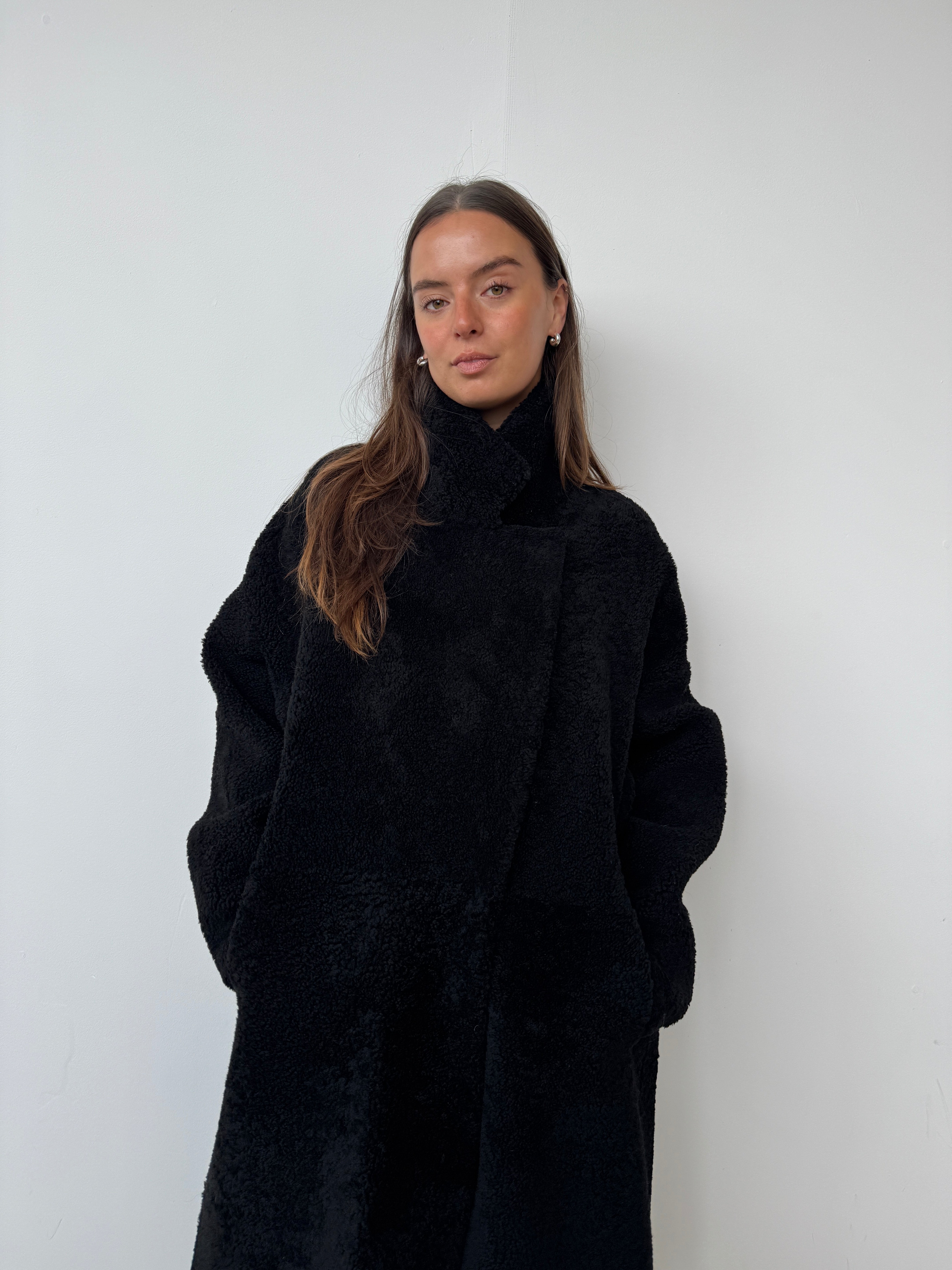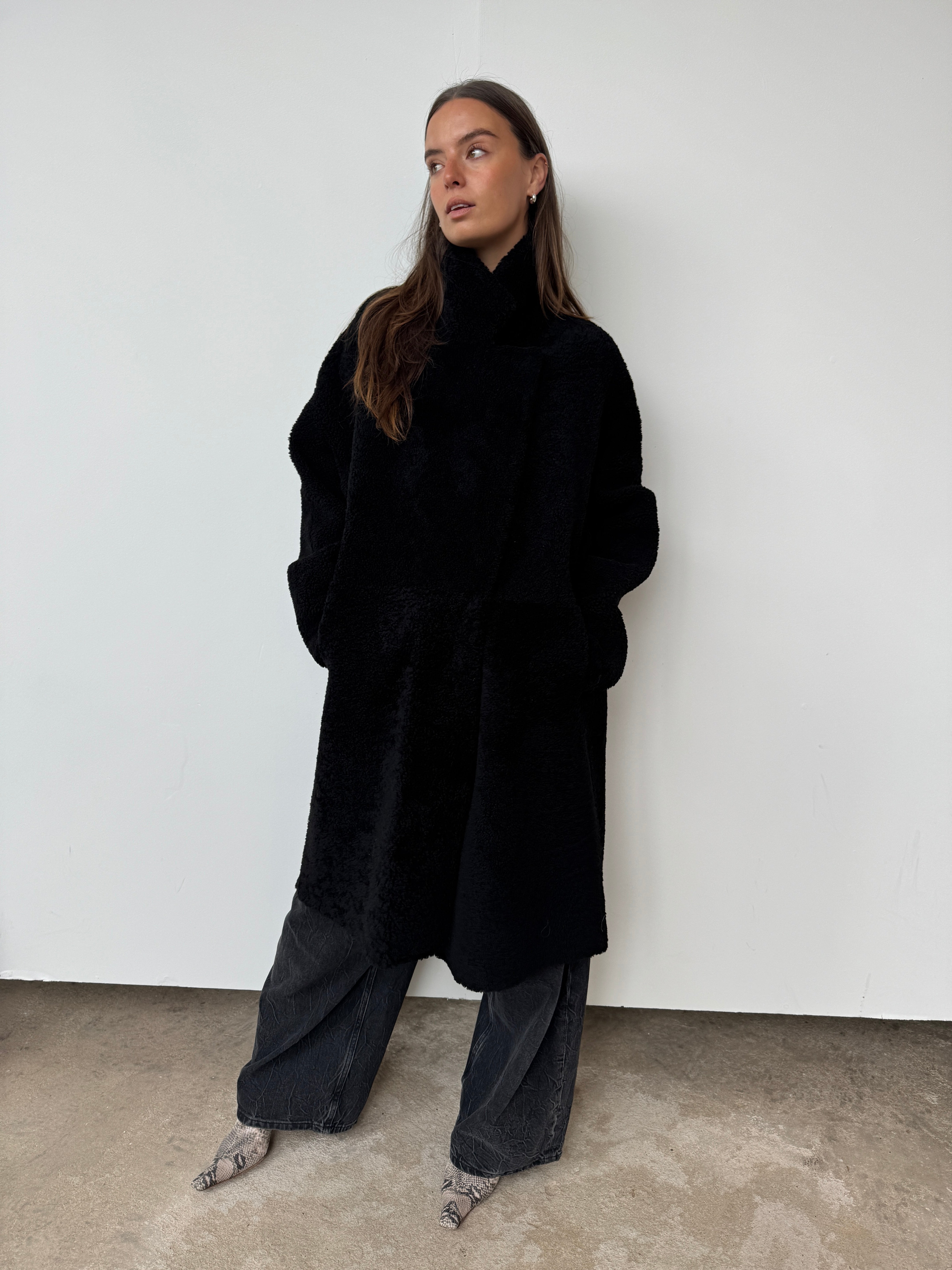 Crafted from sustainably sourced shearling, a natural by-product of food production, this piece offers an eco-conscious alternative to synthetic materials.