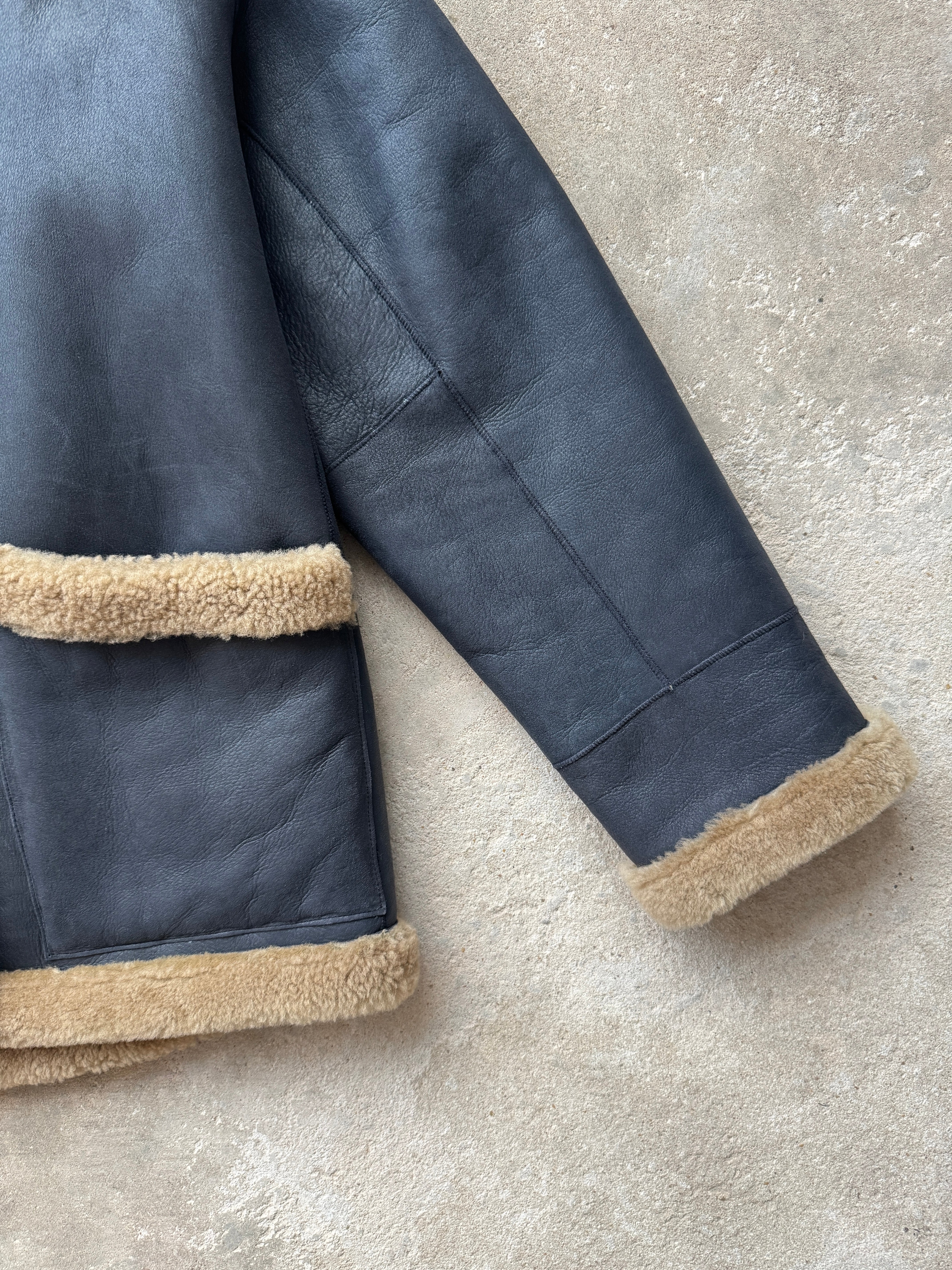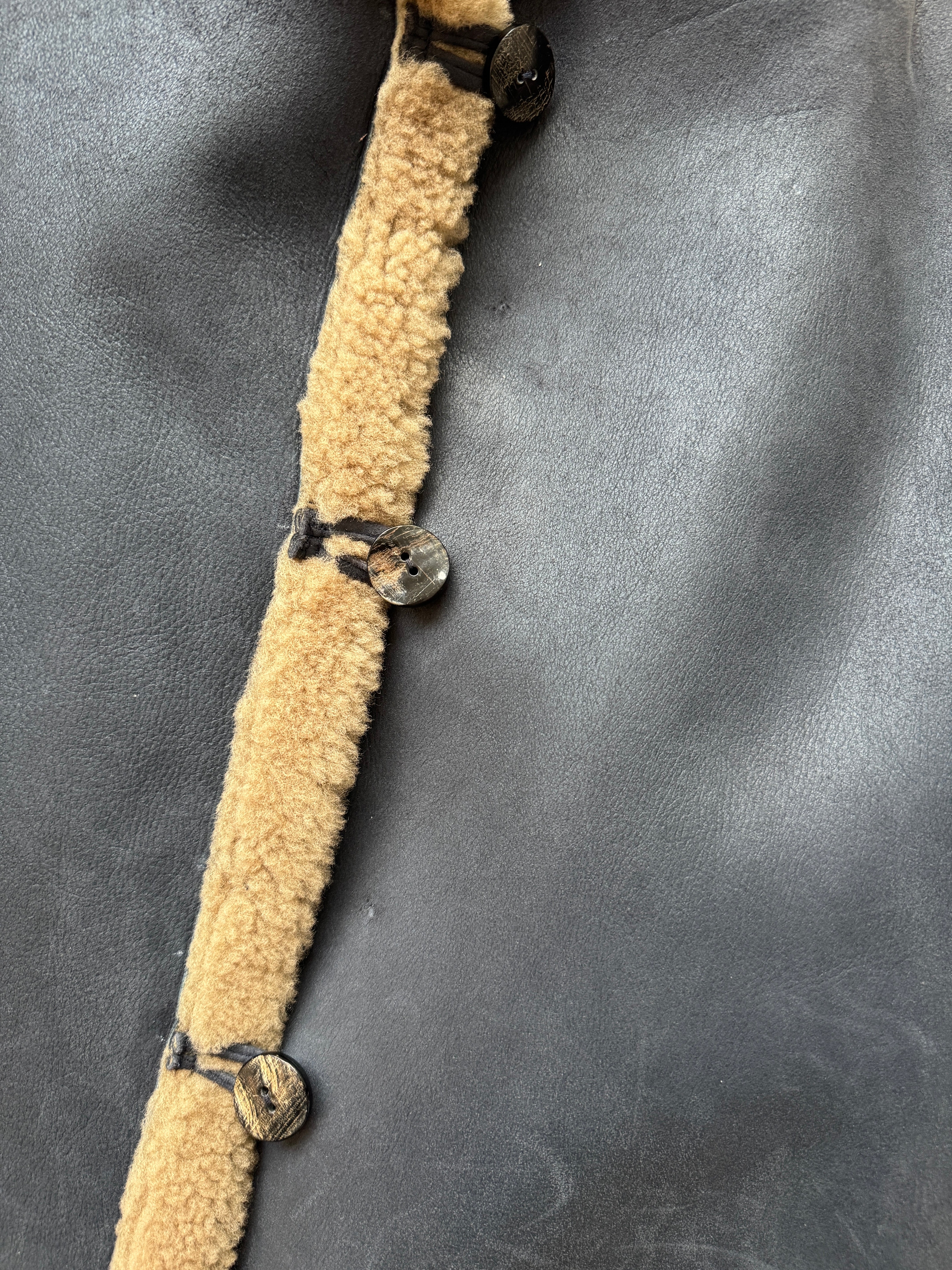 Please note, when worn with the wool on the outside, the back of the buttons are visible, as pictured. There are also a couple of very light marks to the leather near the buttons on navy side, also pictured.