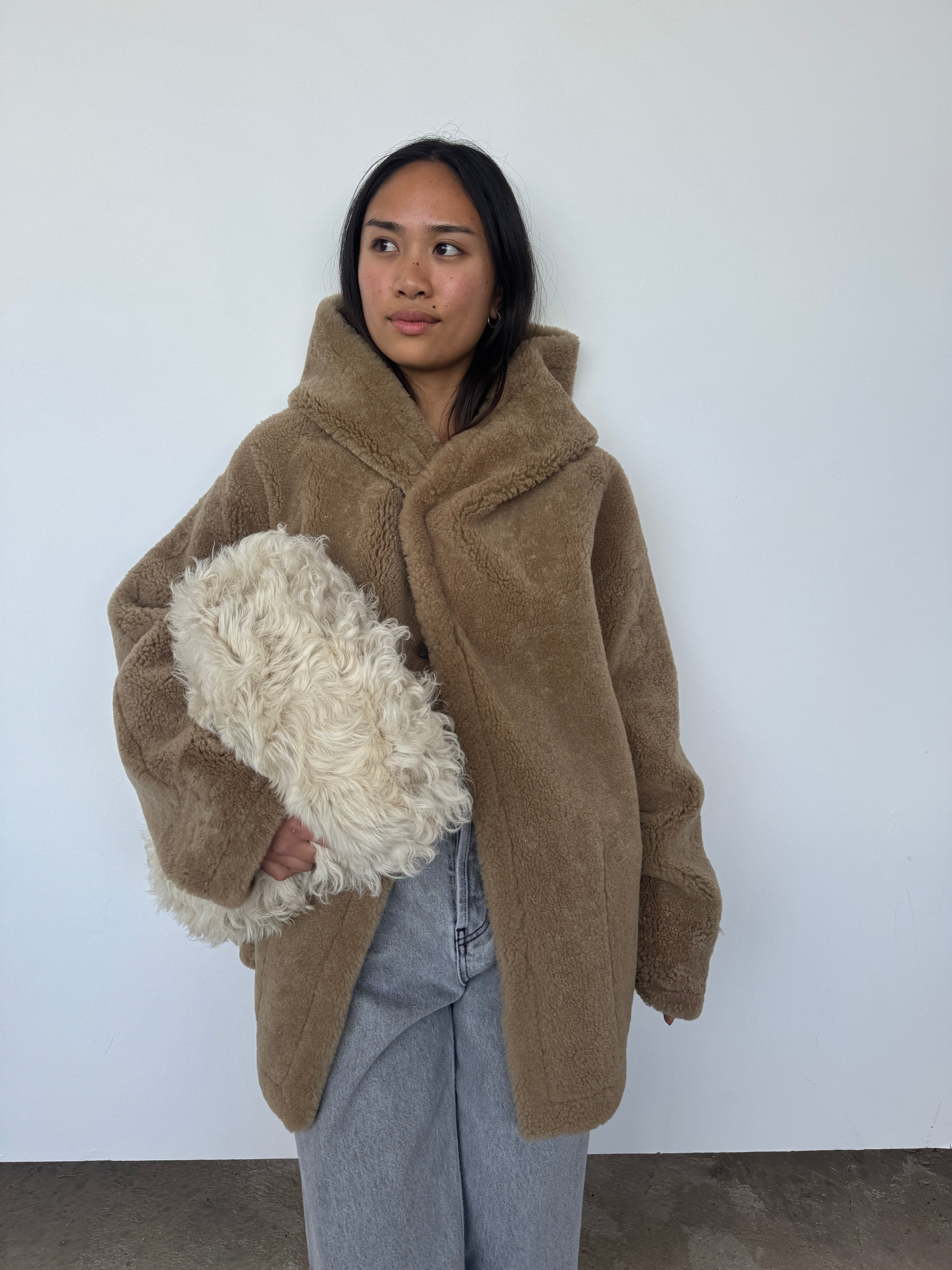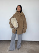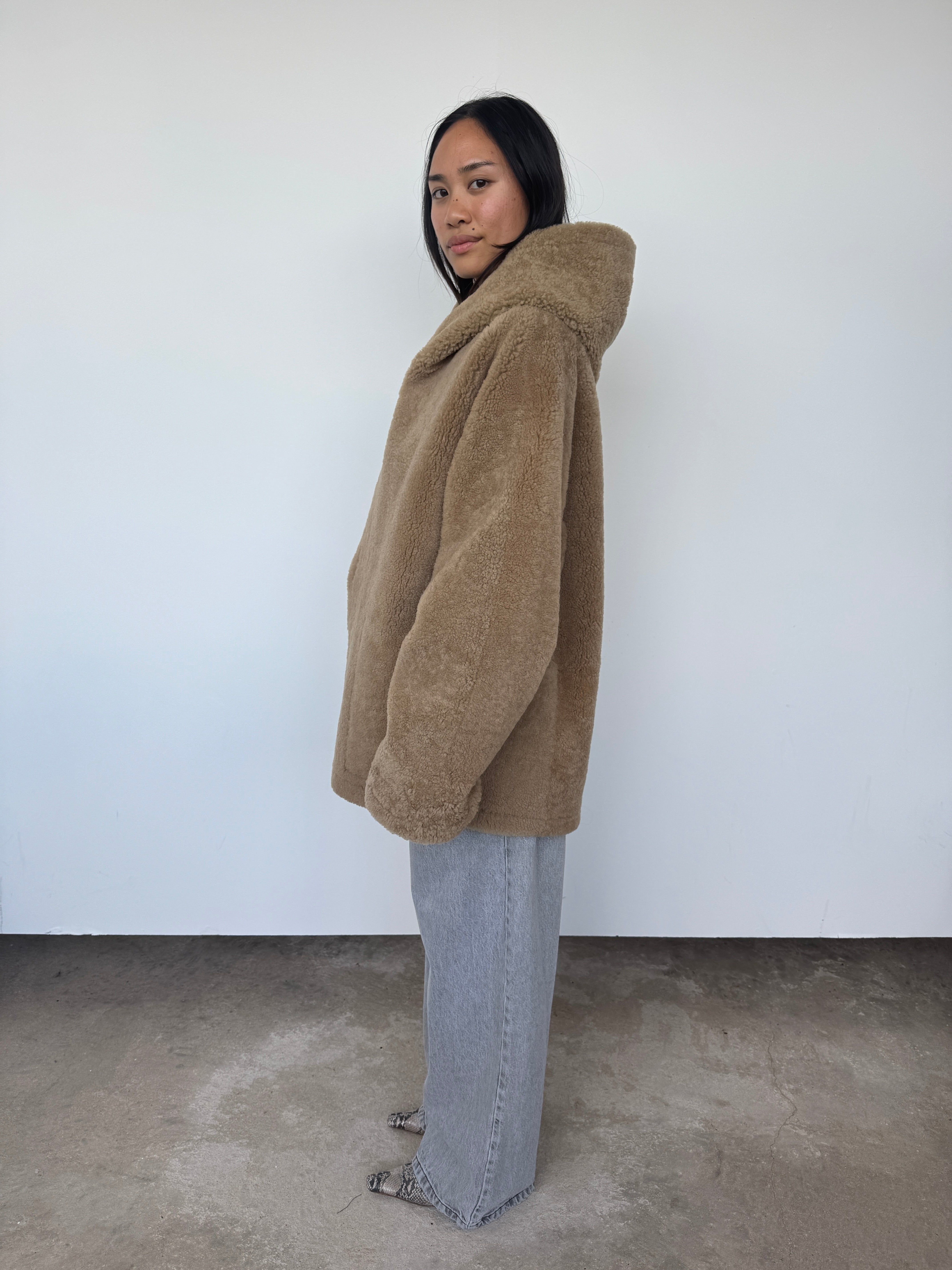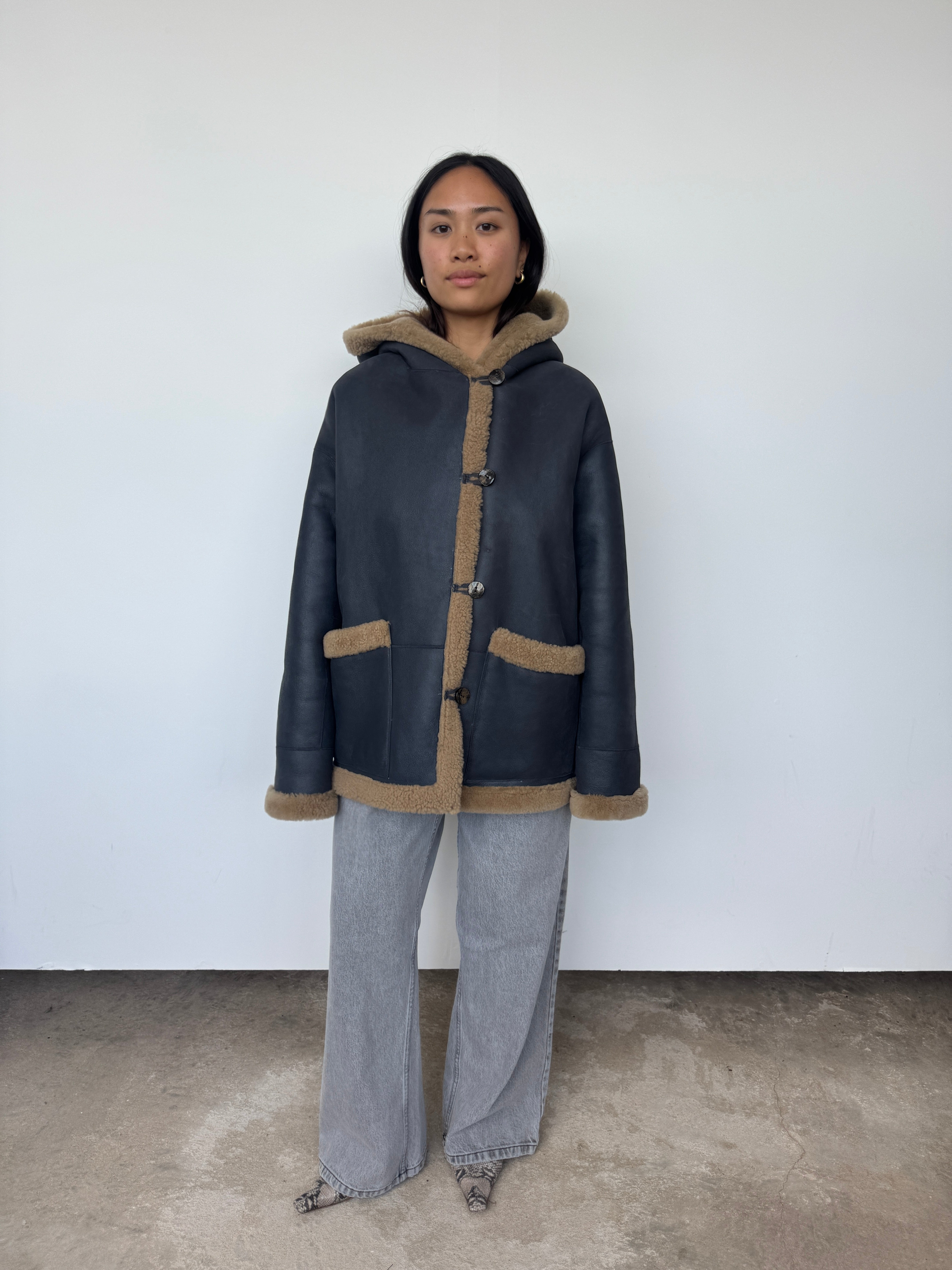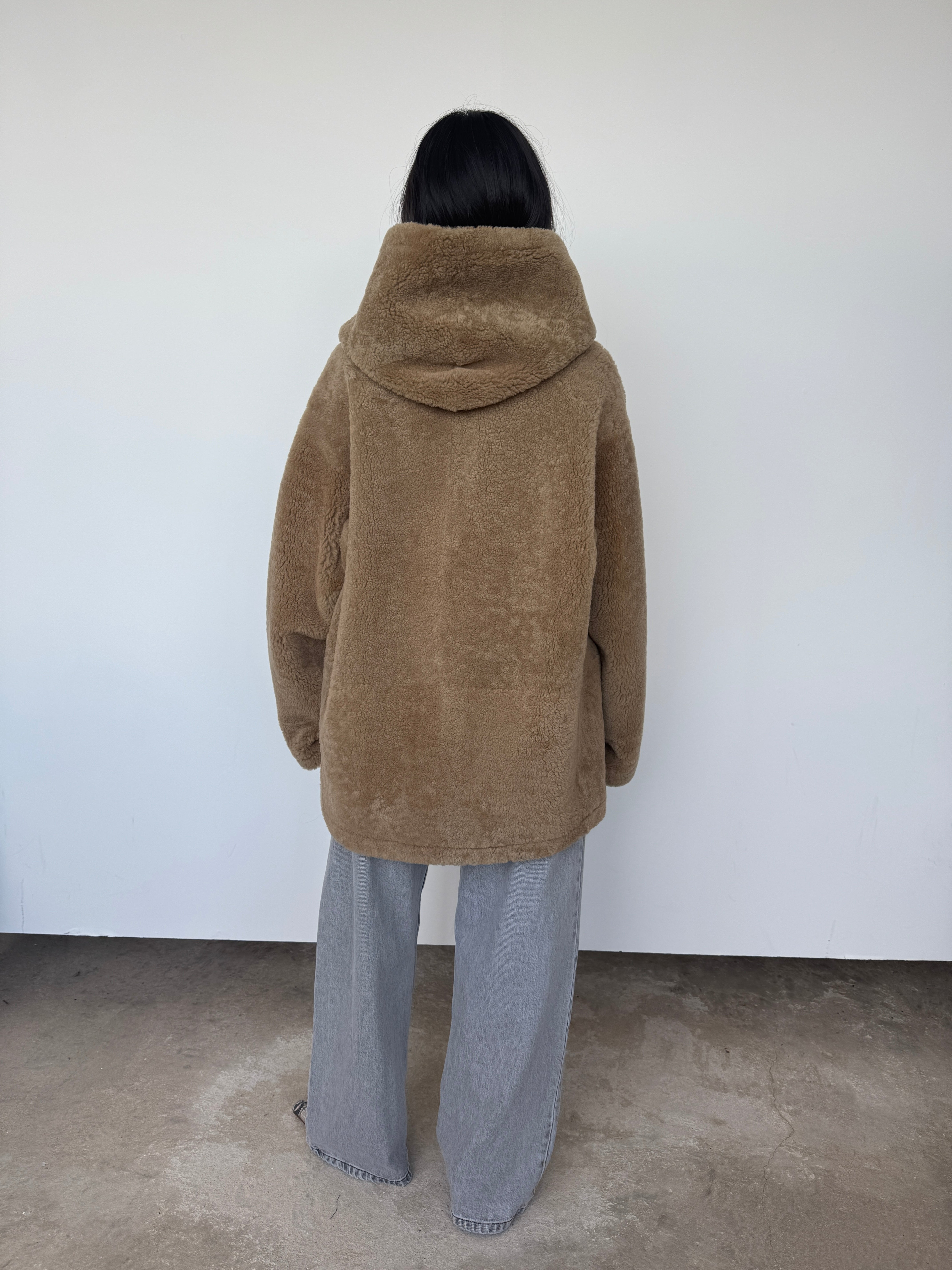 This oversized hooded jacket from Gushlow & Cole combines effortless style with conscious craftsmanship. Featuring a mid-length silhouette and practical patch pockets, it's designed for relaxed elegance. Made in the UK from responsible shearling. This piece is reversible. Please note: When worn with the wool side inside, the fit will feel slightly smaller, though we recommend taking your usual size.