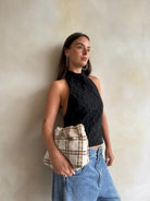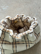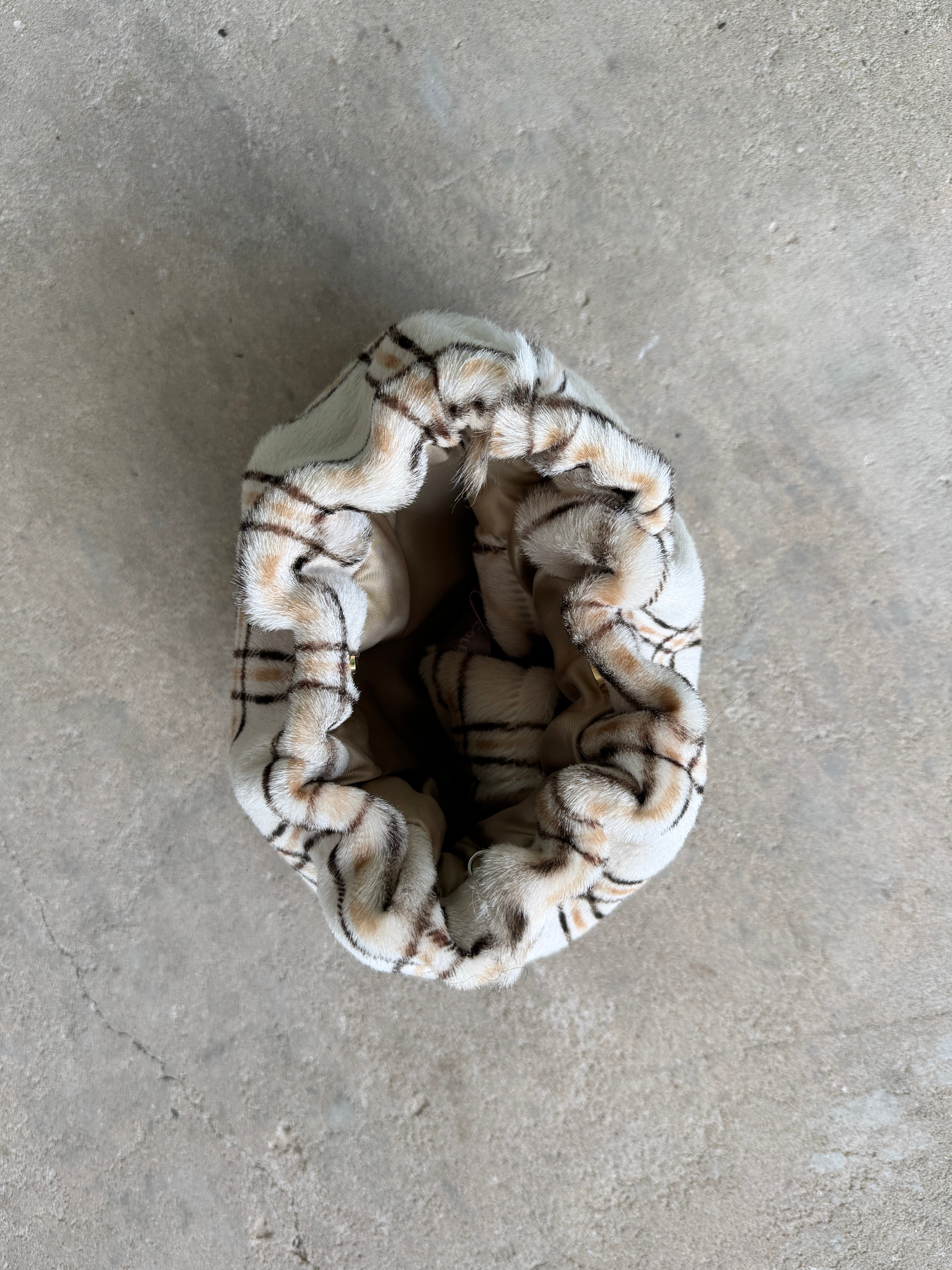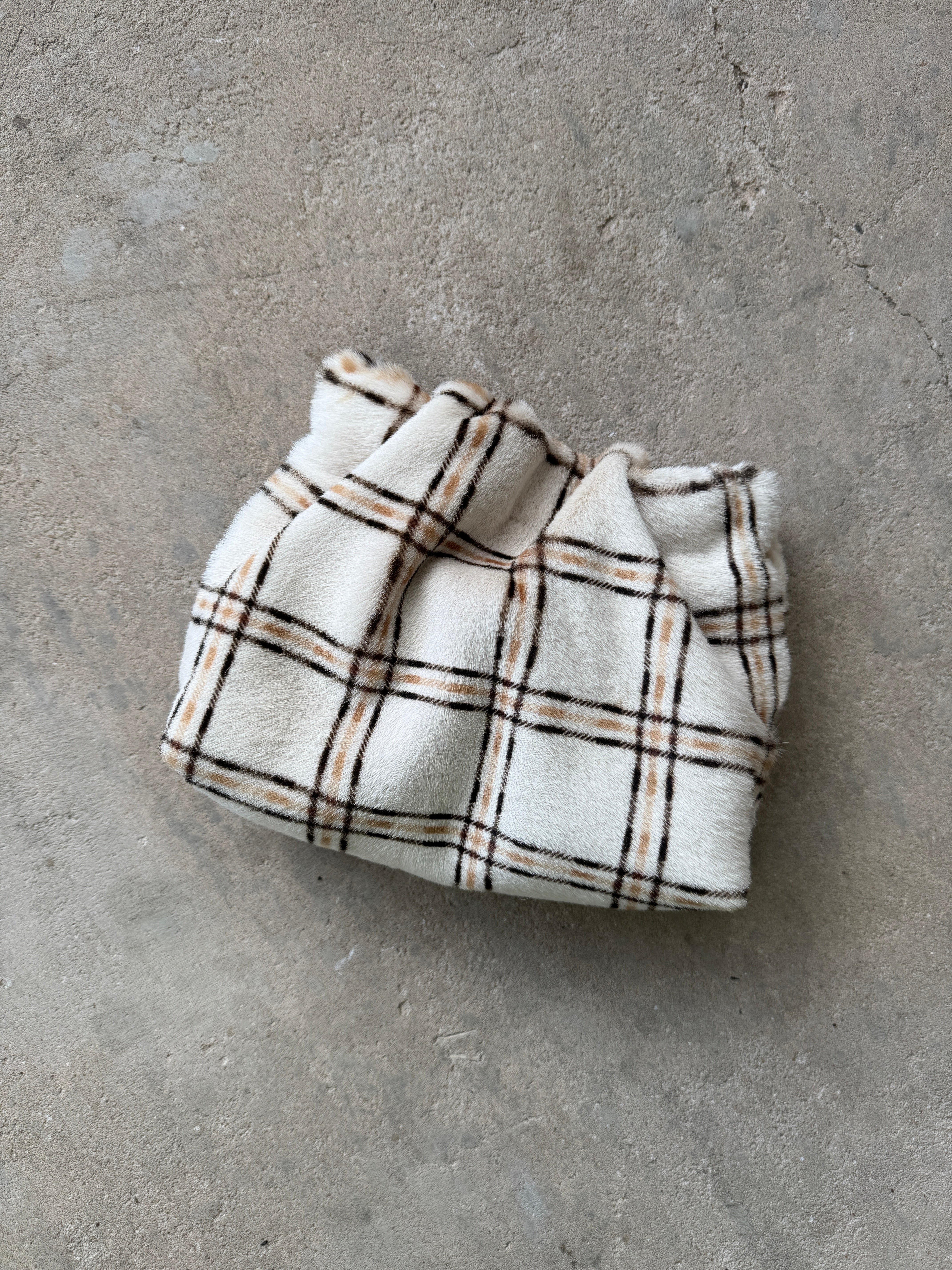 The Soft Shearling Clutch Bag in heritage check print shearling is handmade in the Gushlow and Cole workshop from a limited run of vintage shearling. With a shorn Toscana outer, the softly padded lining and elasticated opening form the unstructured silhouette of this pouch-style bag. Use the magnetic clip to close the top.
