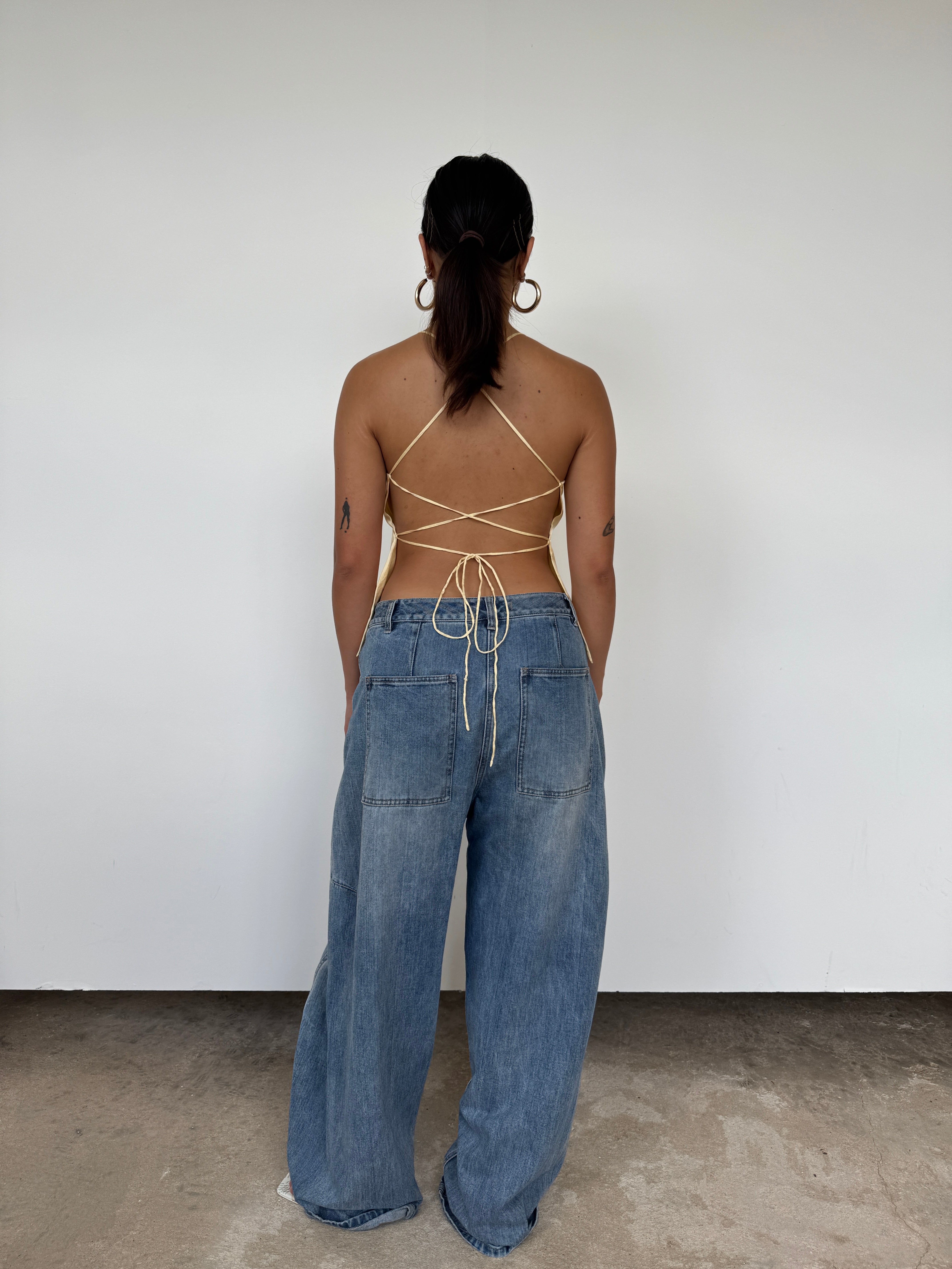 This piece features a tie-back closure, which can be adjusted to suit