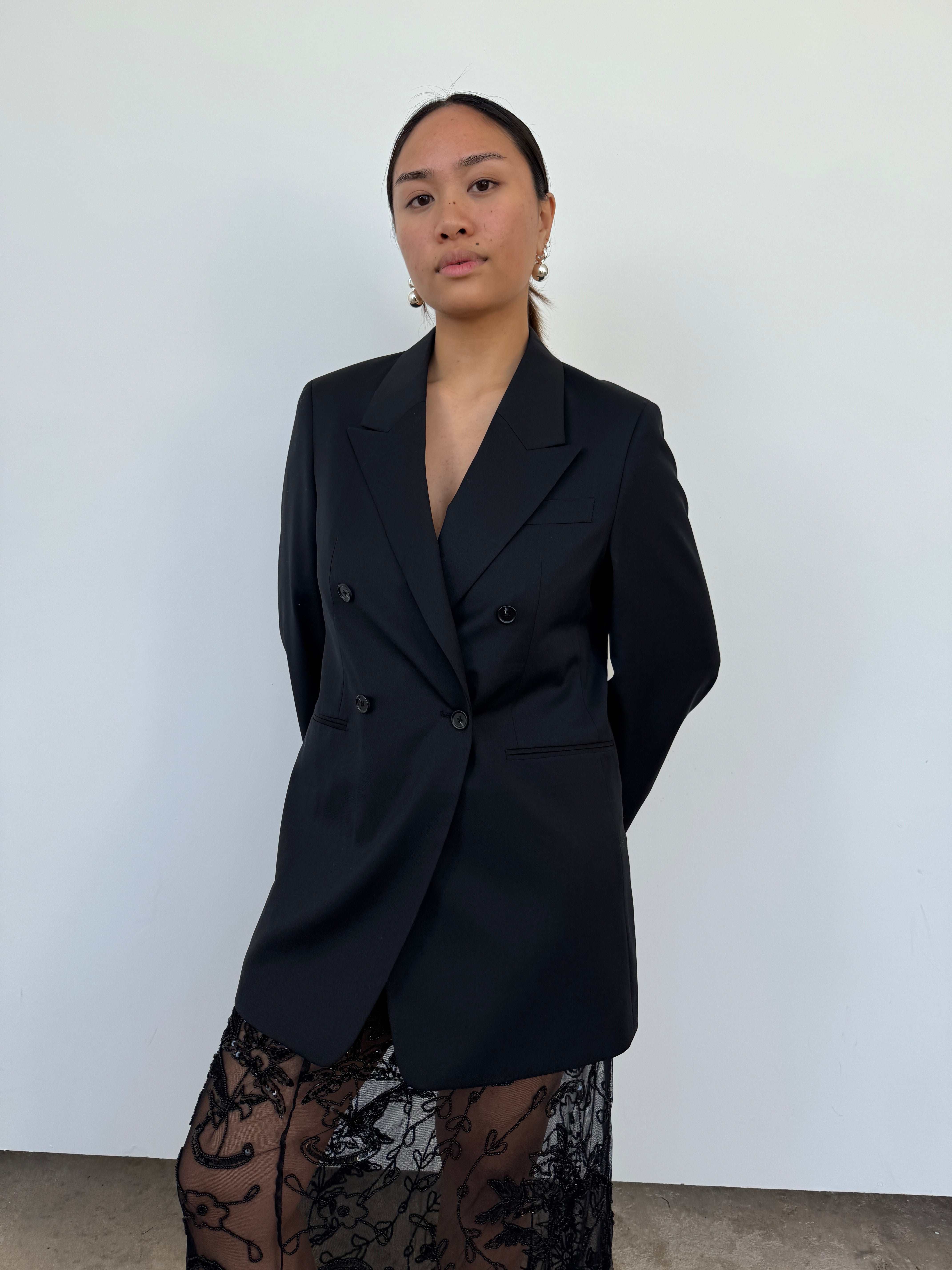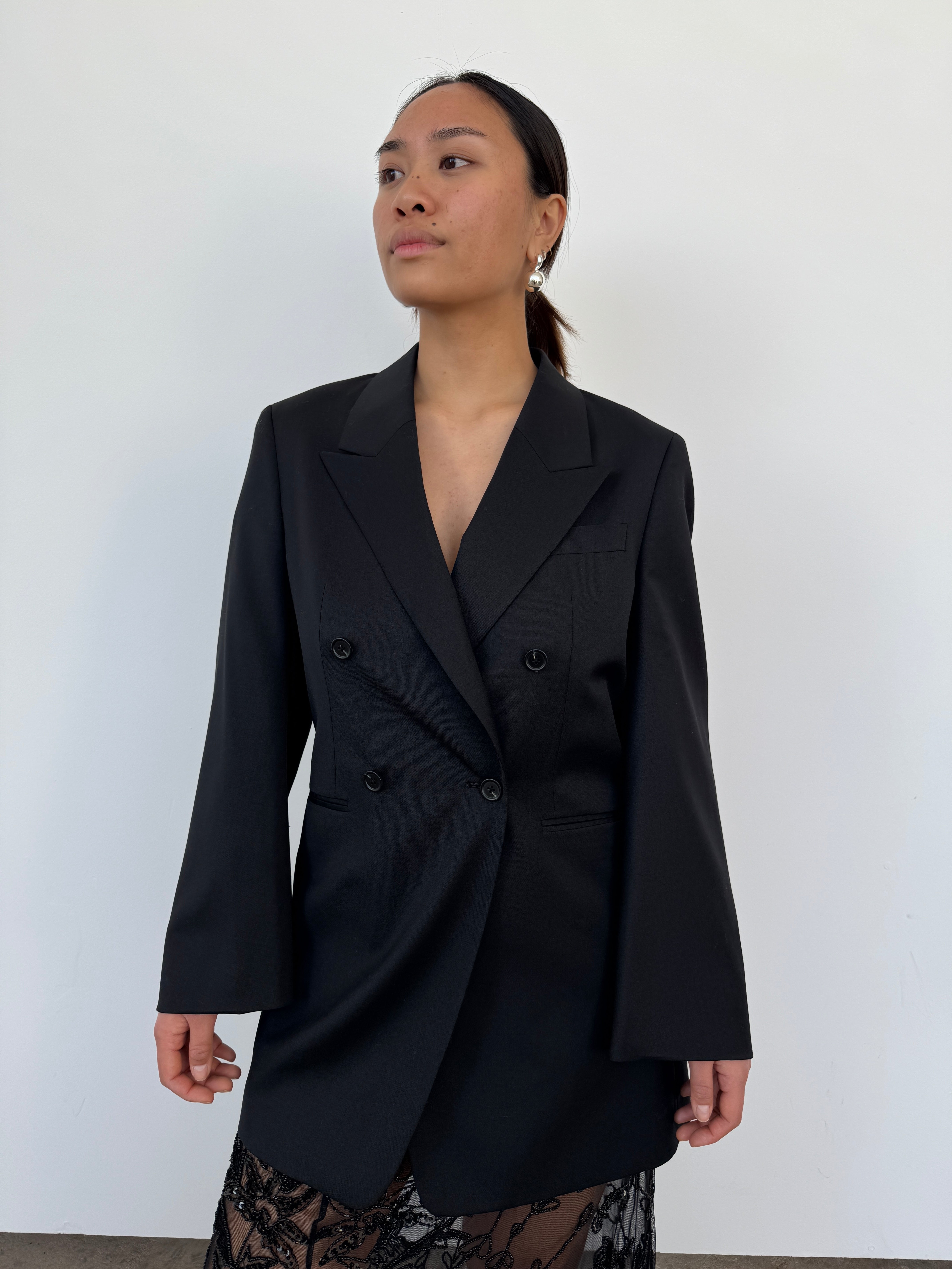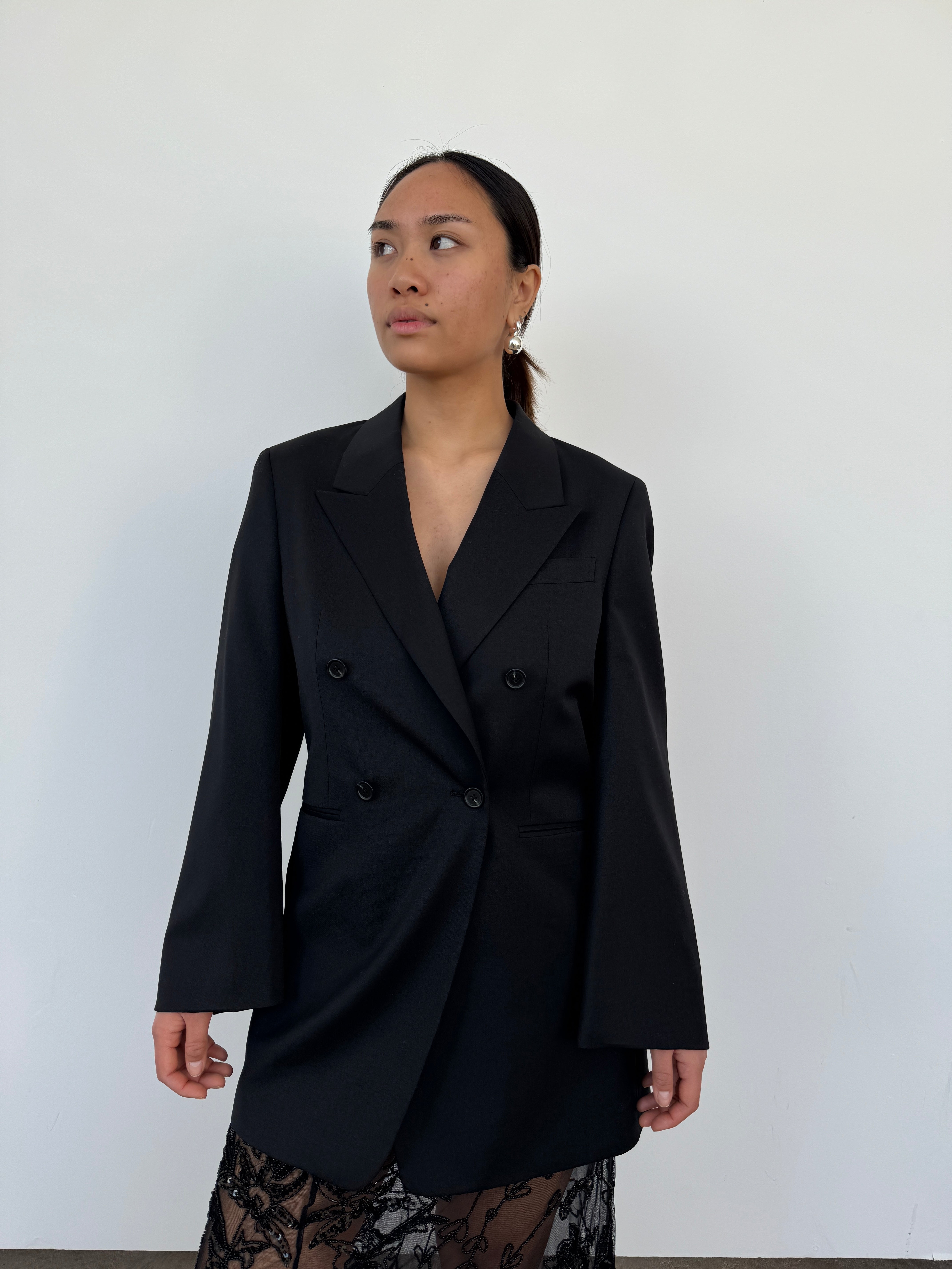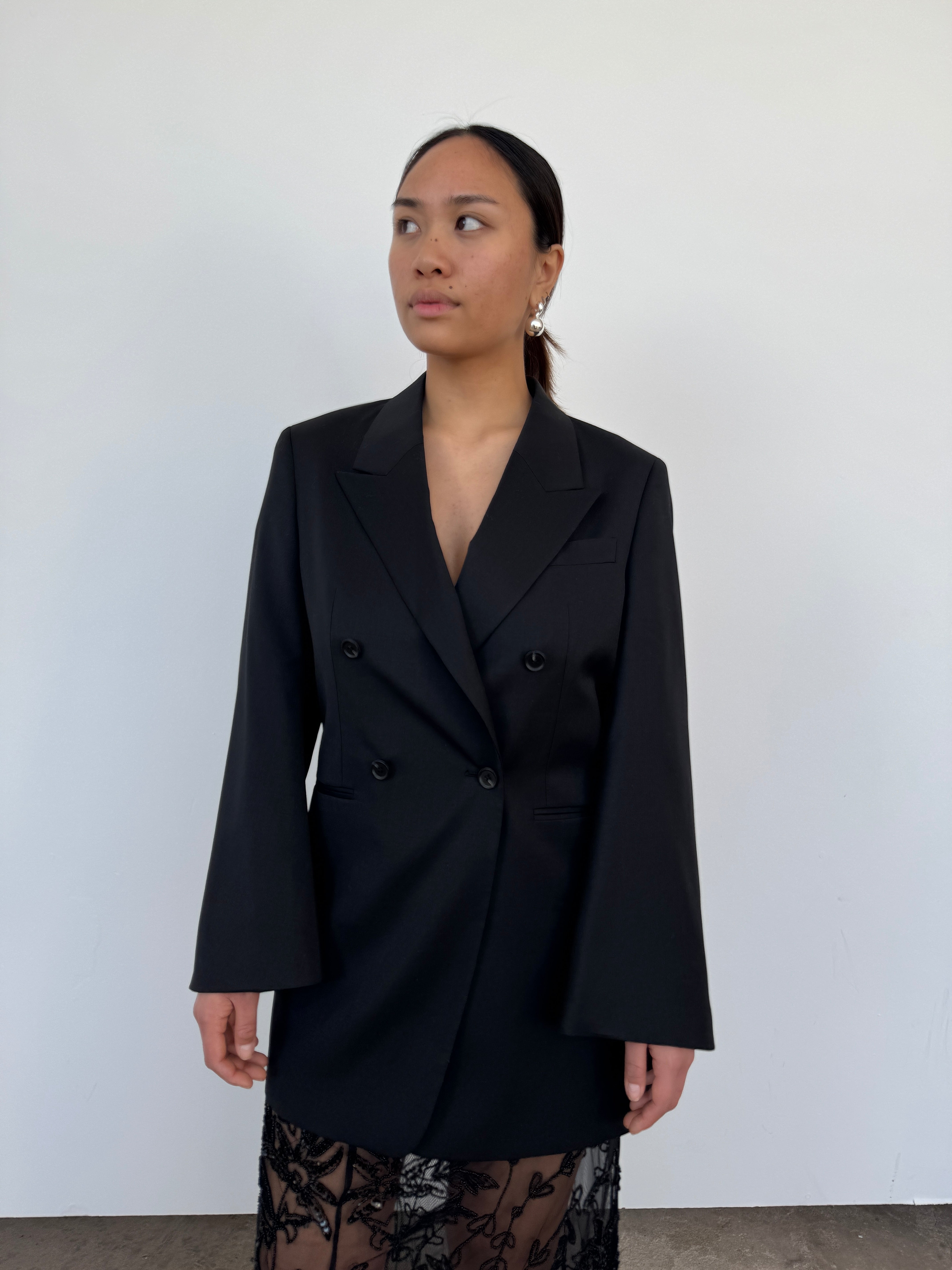 "The Annie blazer is a modern take on tailoring. Made from pure cotton with a full interior lining, it has classic lapels, a double-breasted front, flap pockets, a chest pocket and sculptural sleeves."