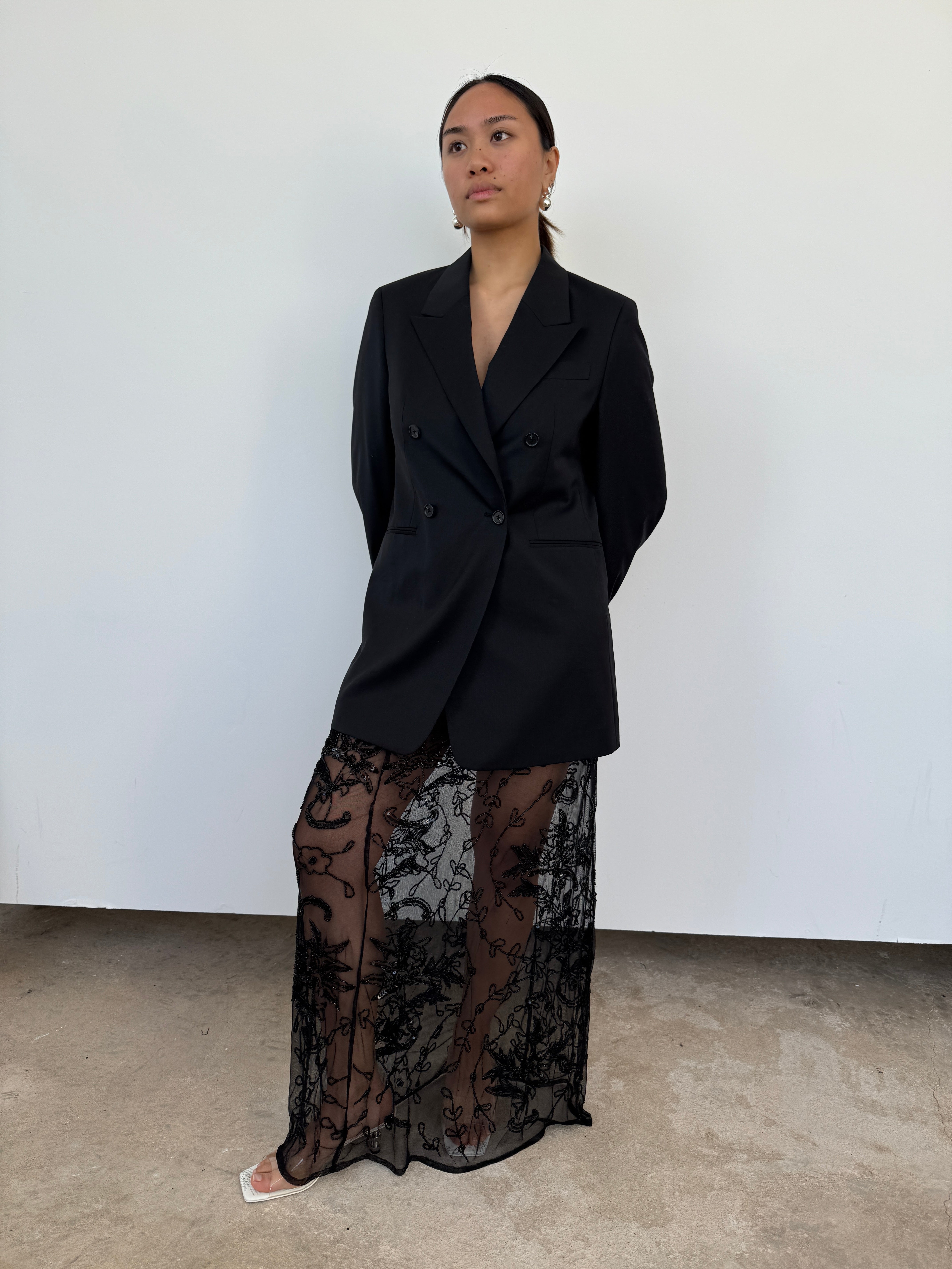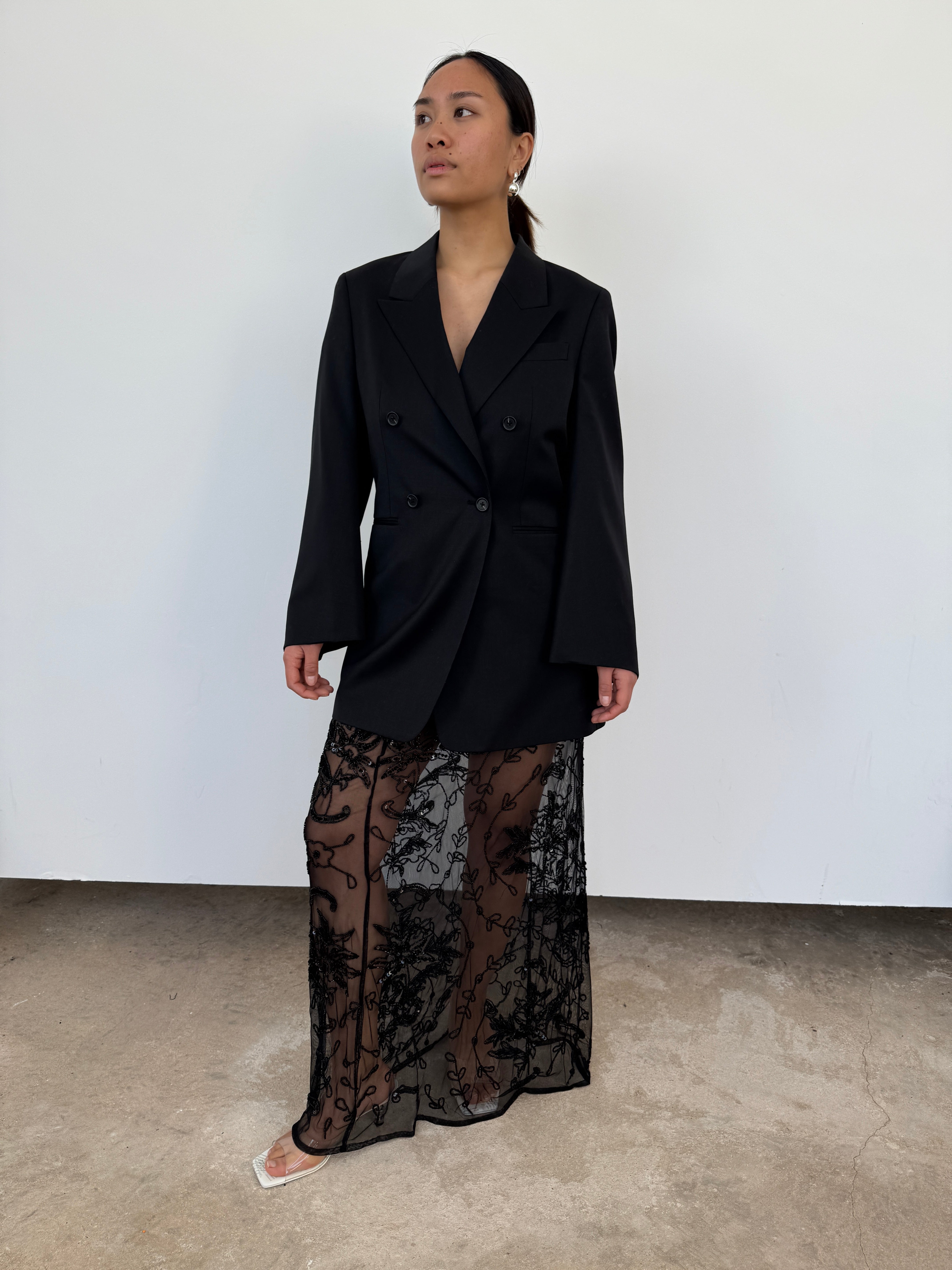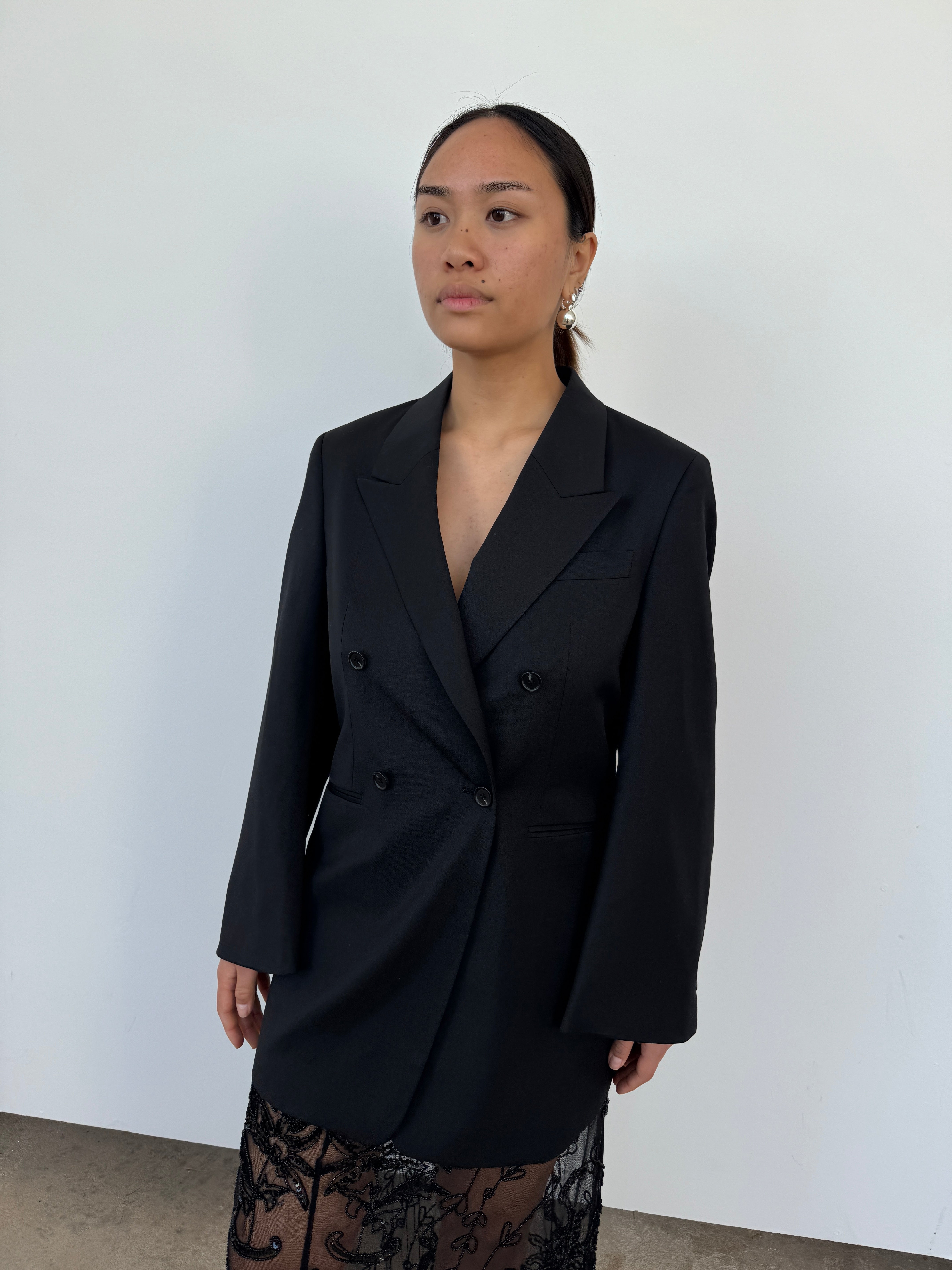 "The Annie blazer is a modern take on tailoring. Made from pure cotton with a full interior lining, it has classic lapels, a double-breasted front, flap pockets, a chest pocket and sculptural sleeves."
