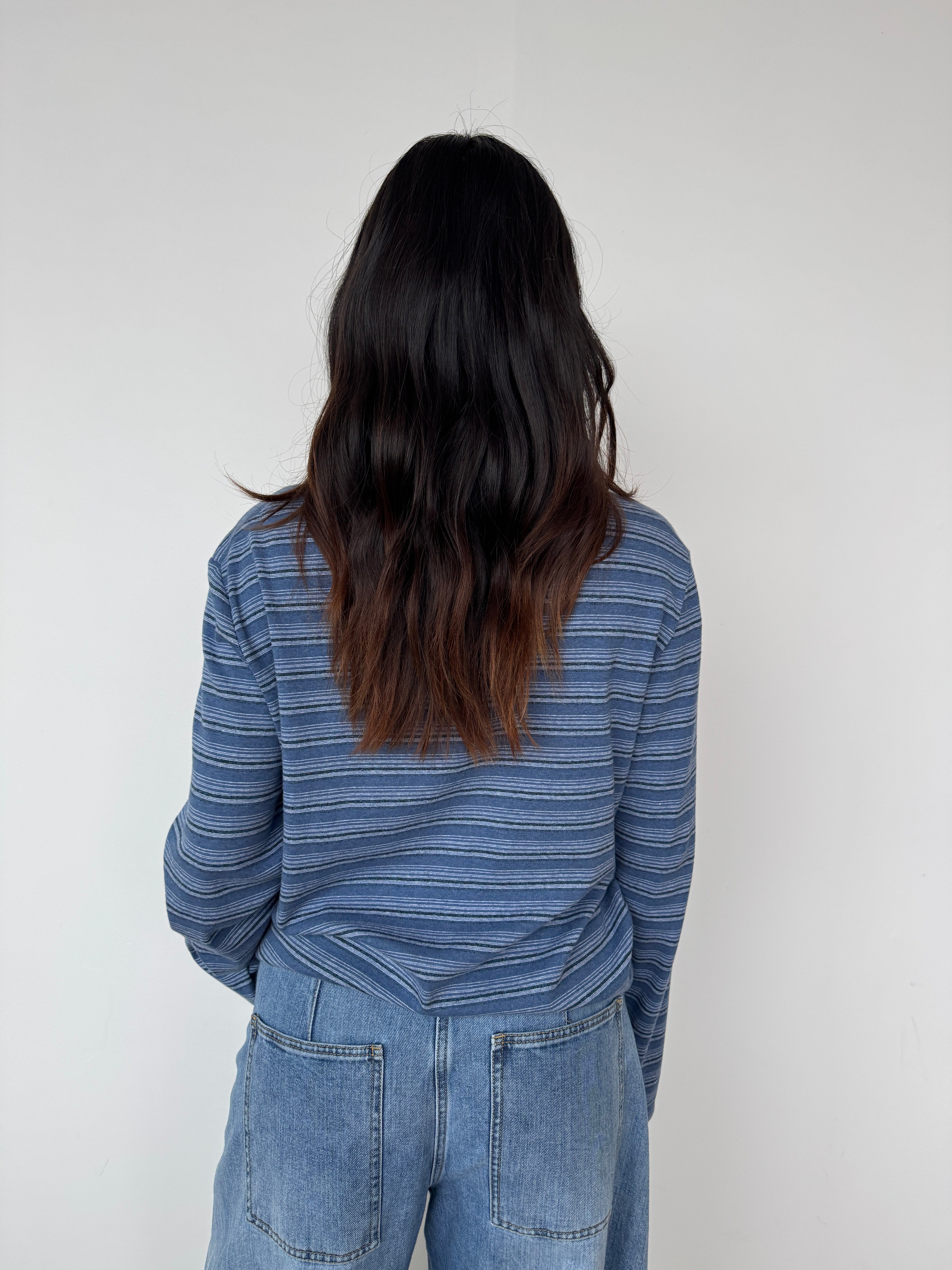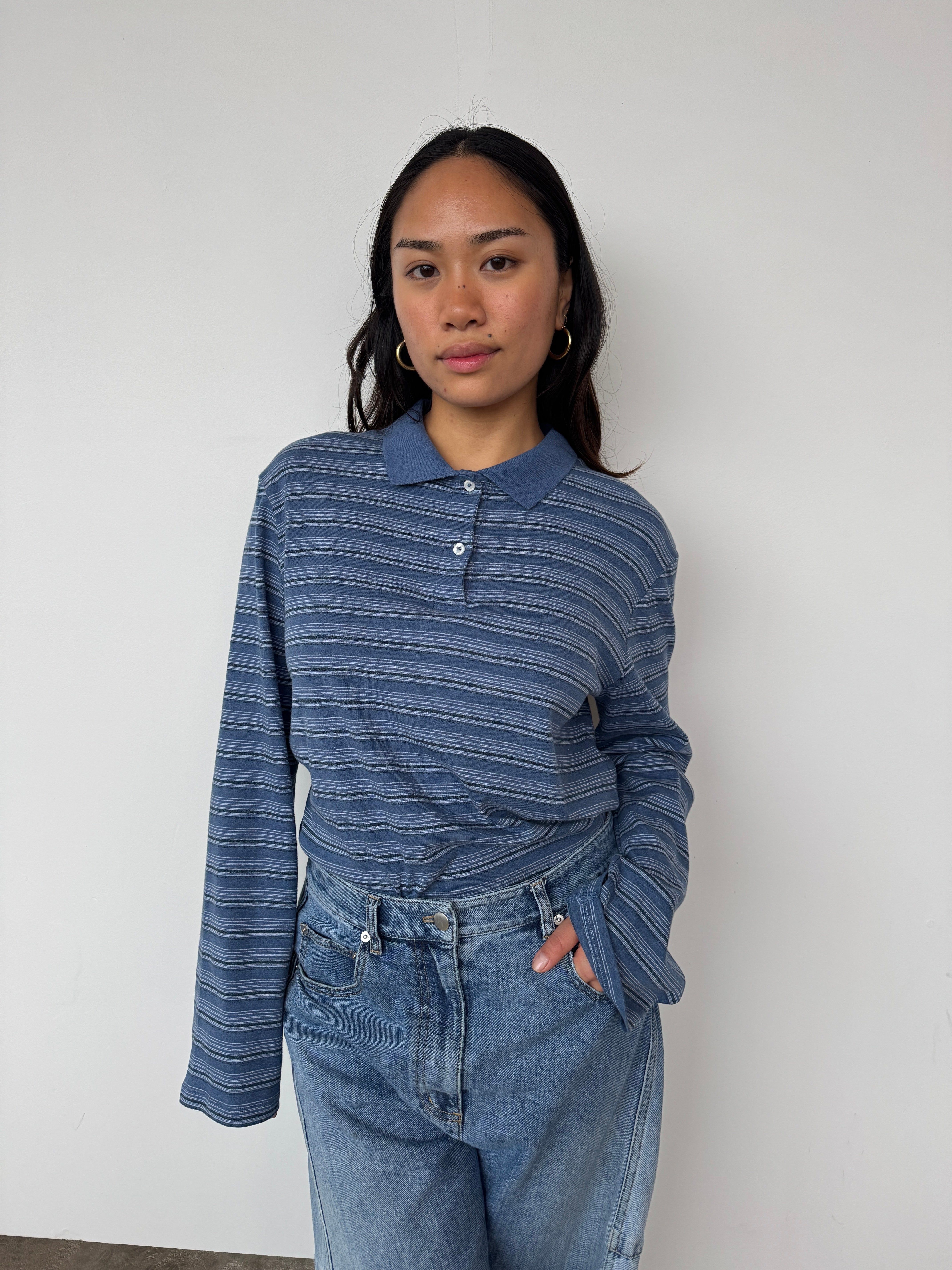 "Made from breathable, striped cotton, the Sunny polo has a relaxed fit that's comfortable in warm weather. It features bell sleeves and a classic buttoned polo collar."