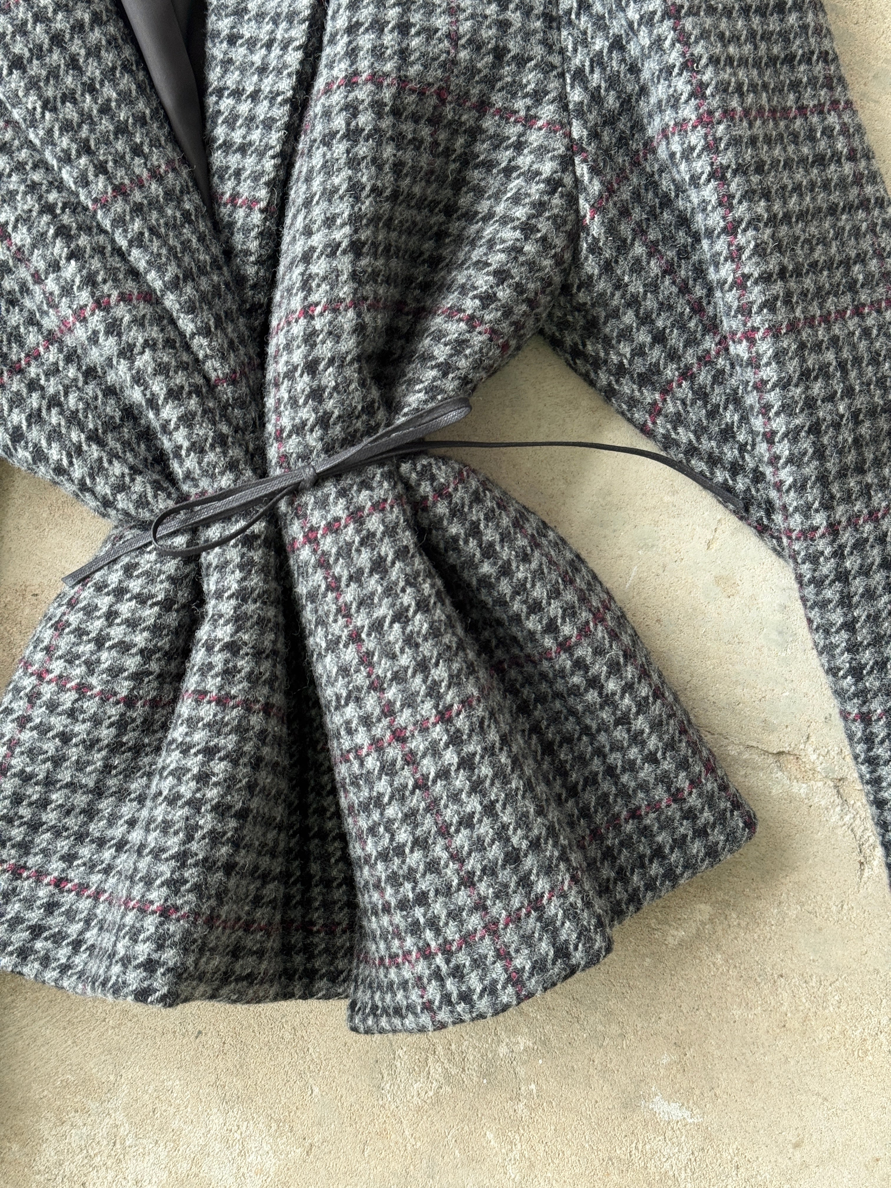 This jacket comes with a belt, which can be used to cinch the waist. Features houndstooth print, shawl lapels, long sleeves and straight hem.