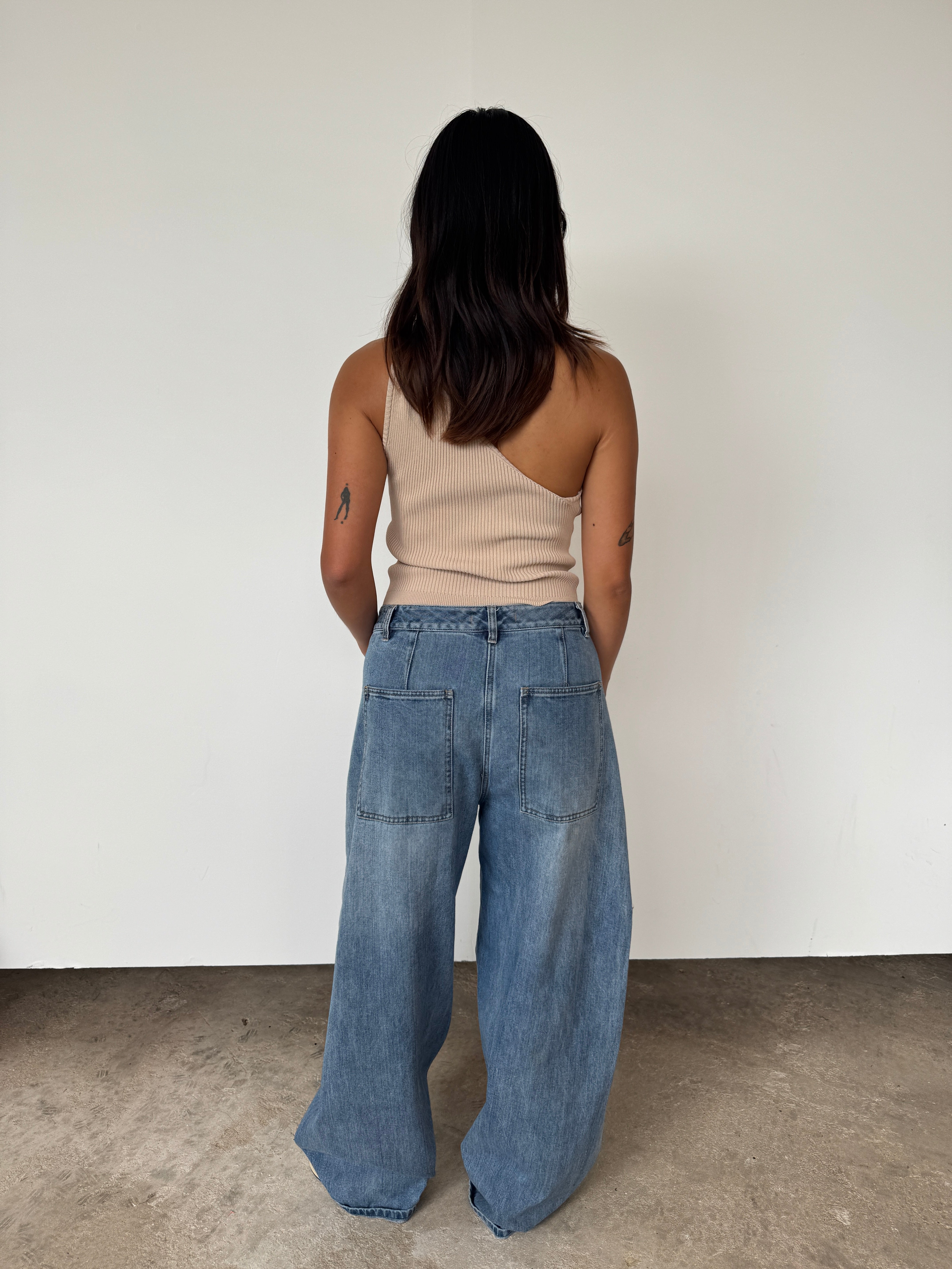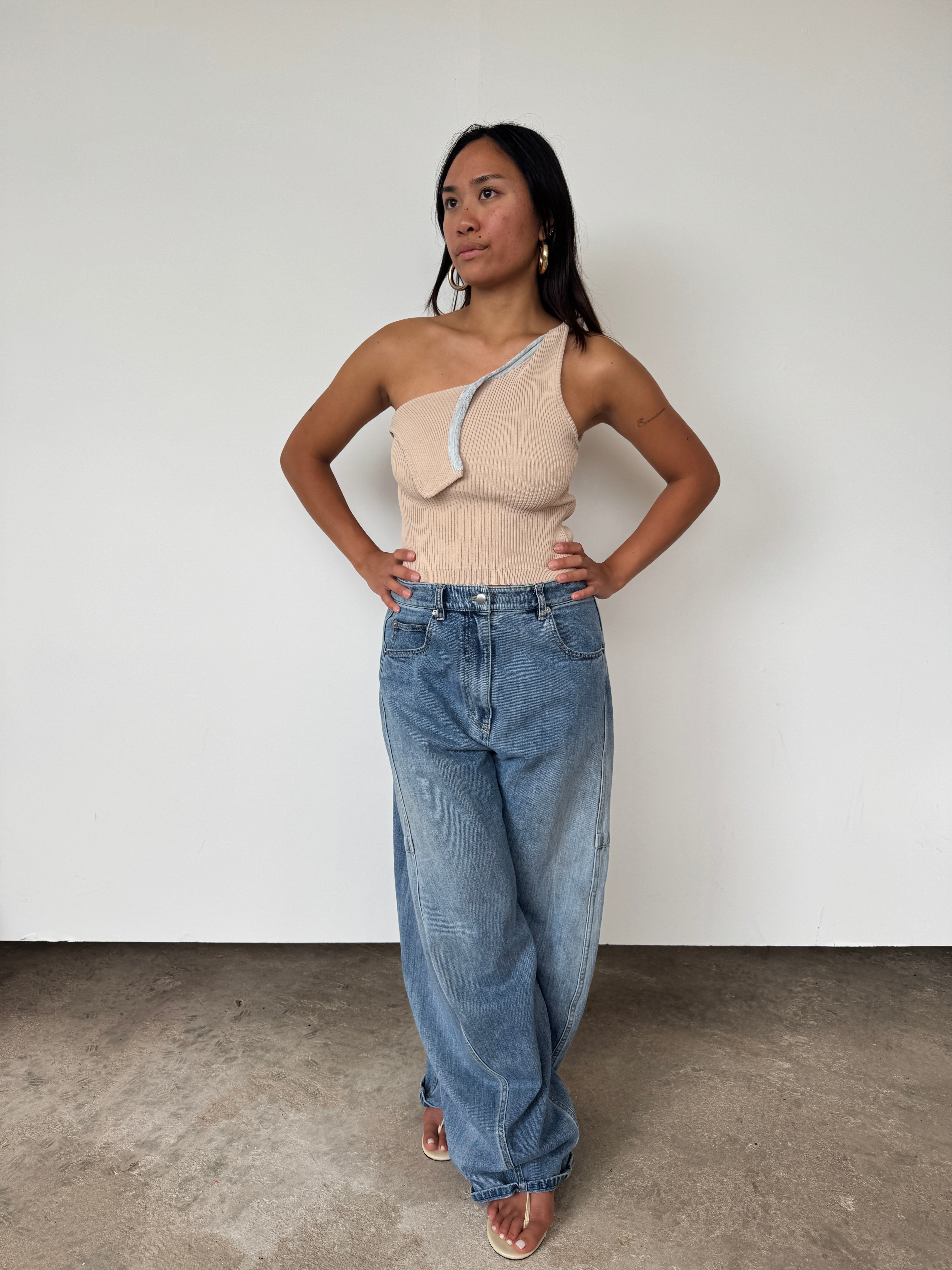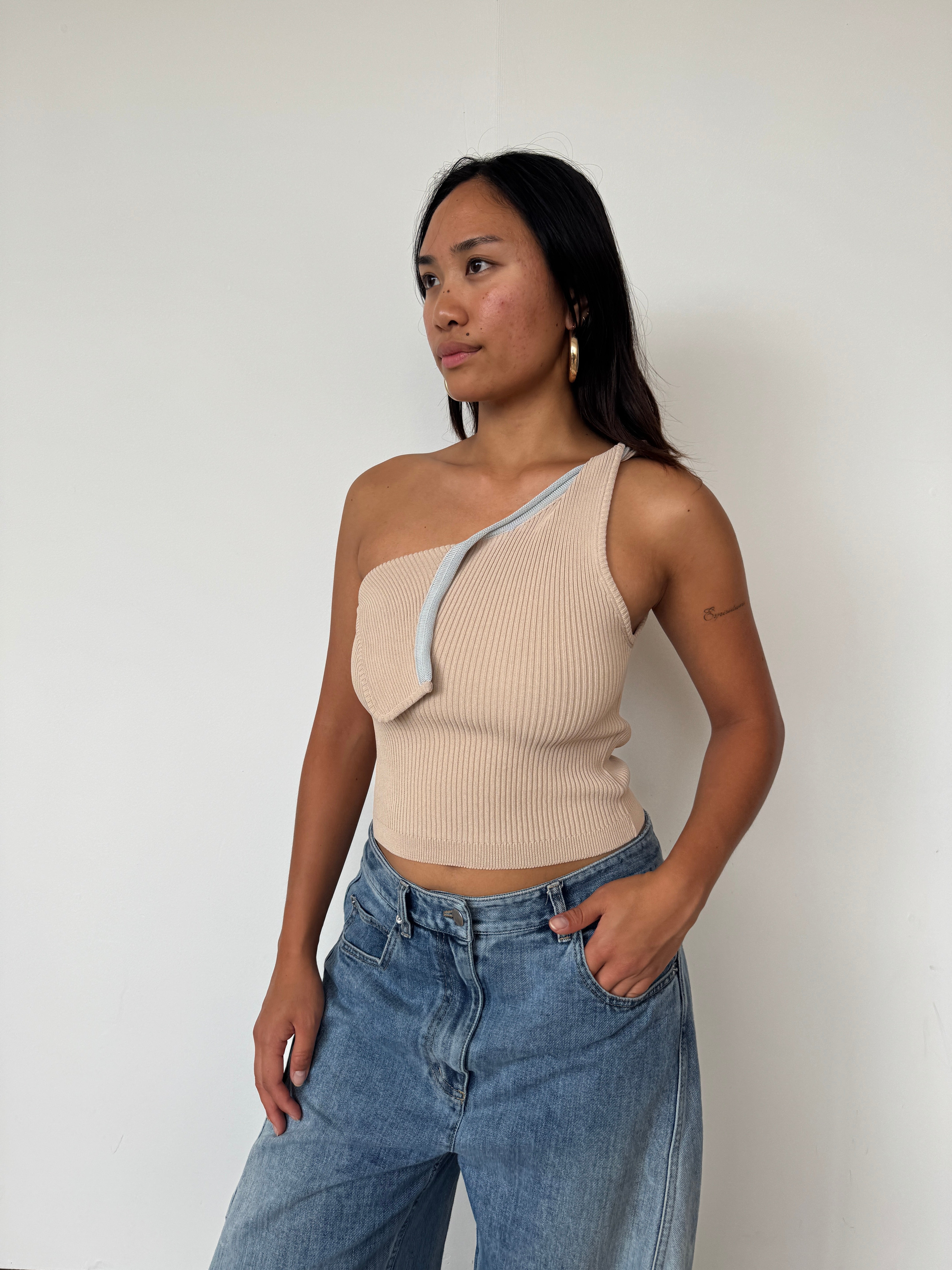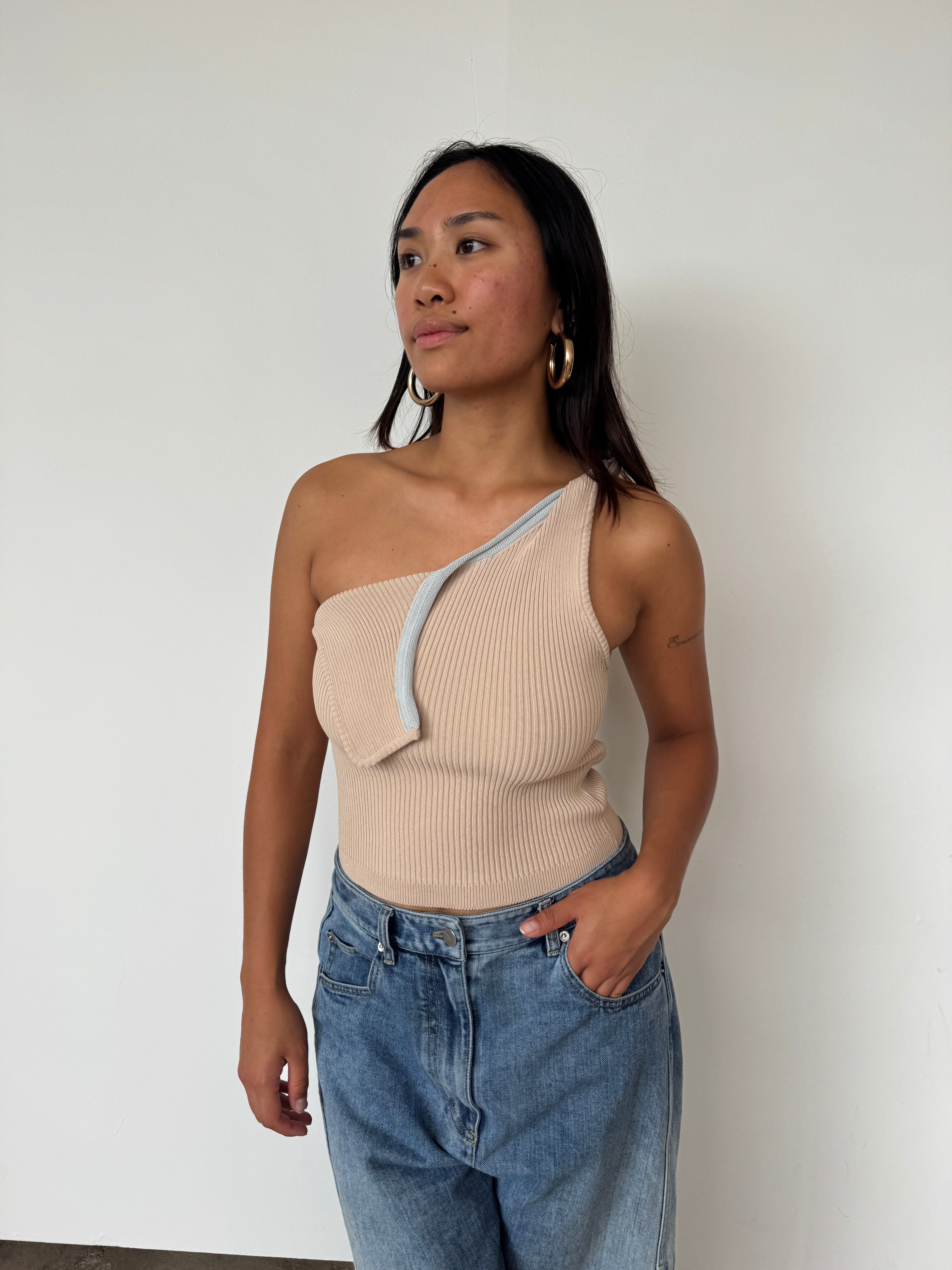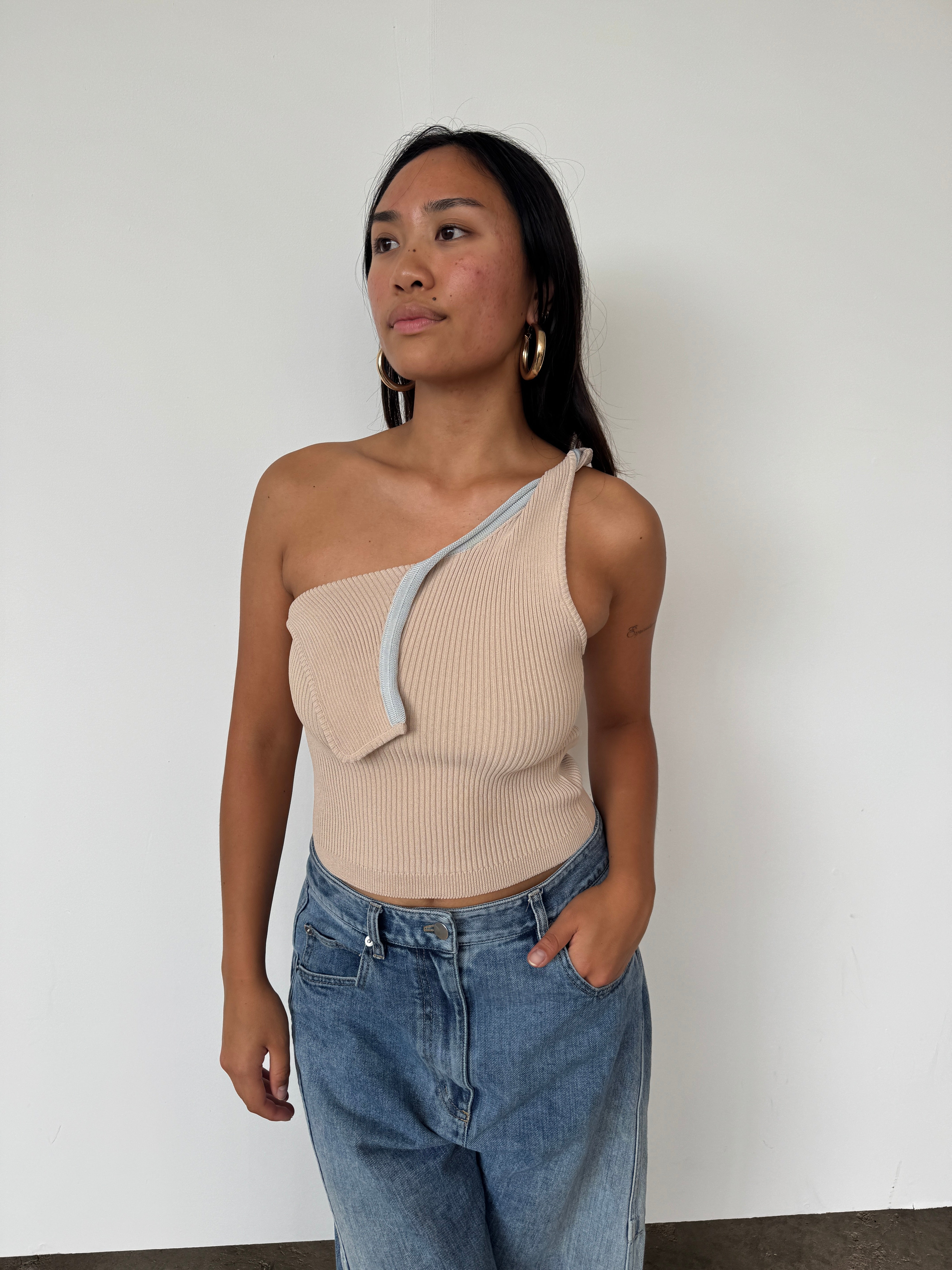 This piece has a rib knit texture and features a twisted one-shoulder strap