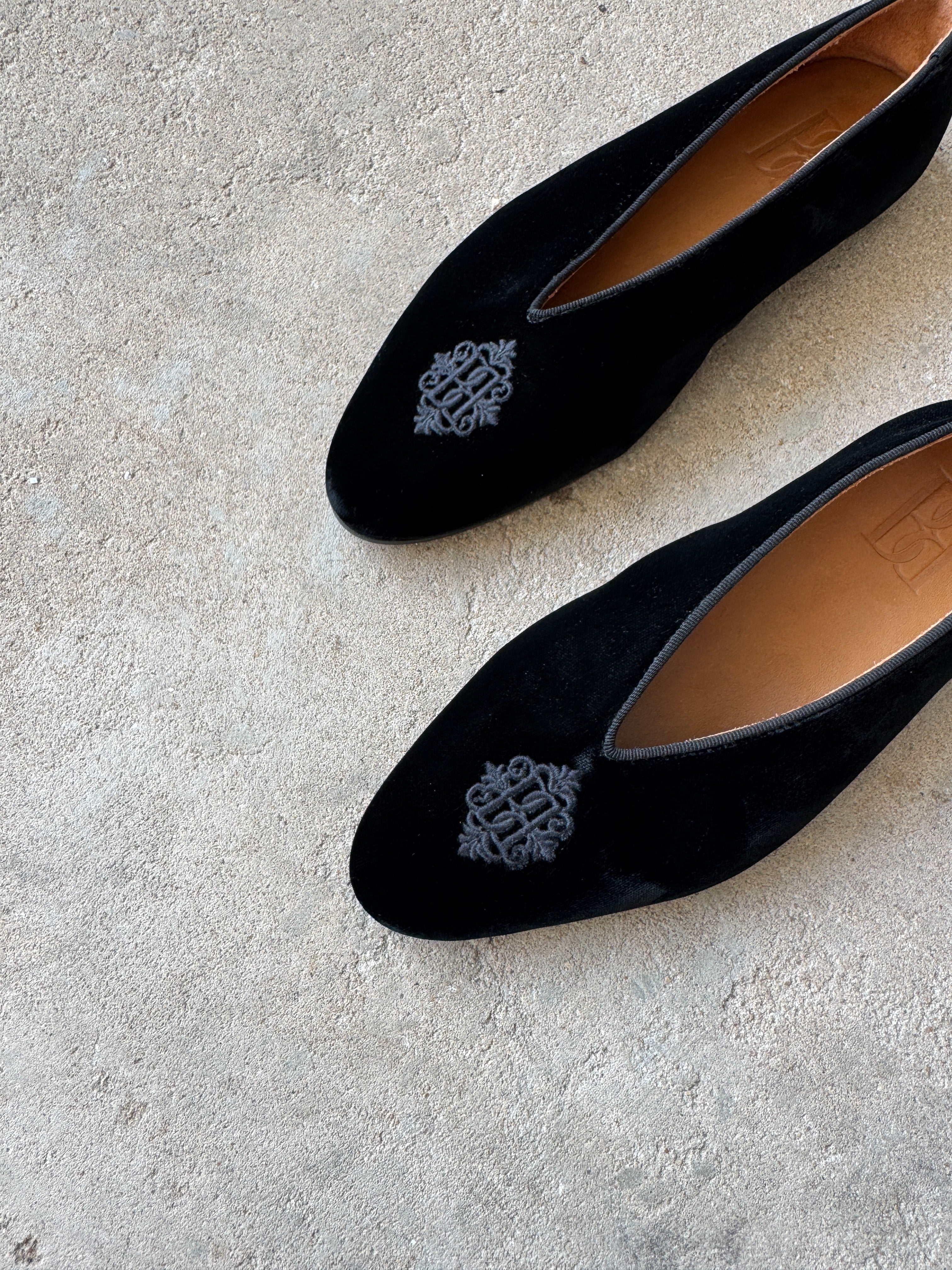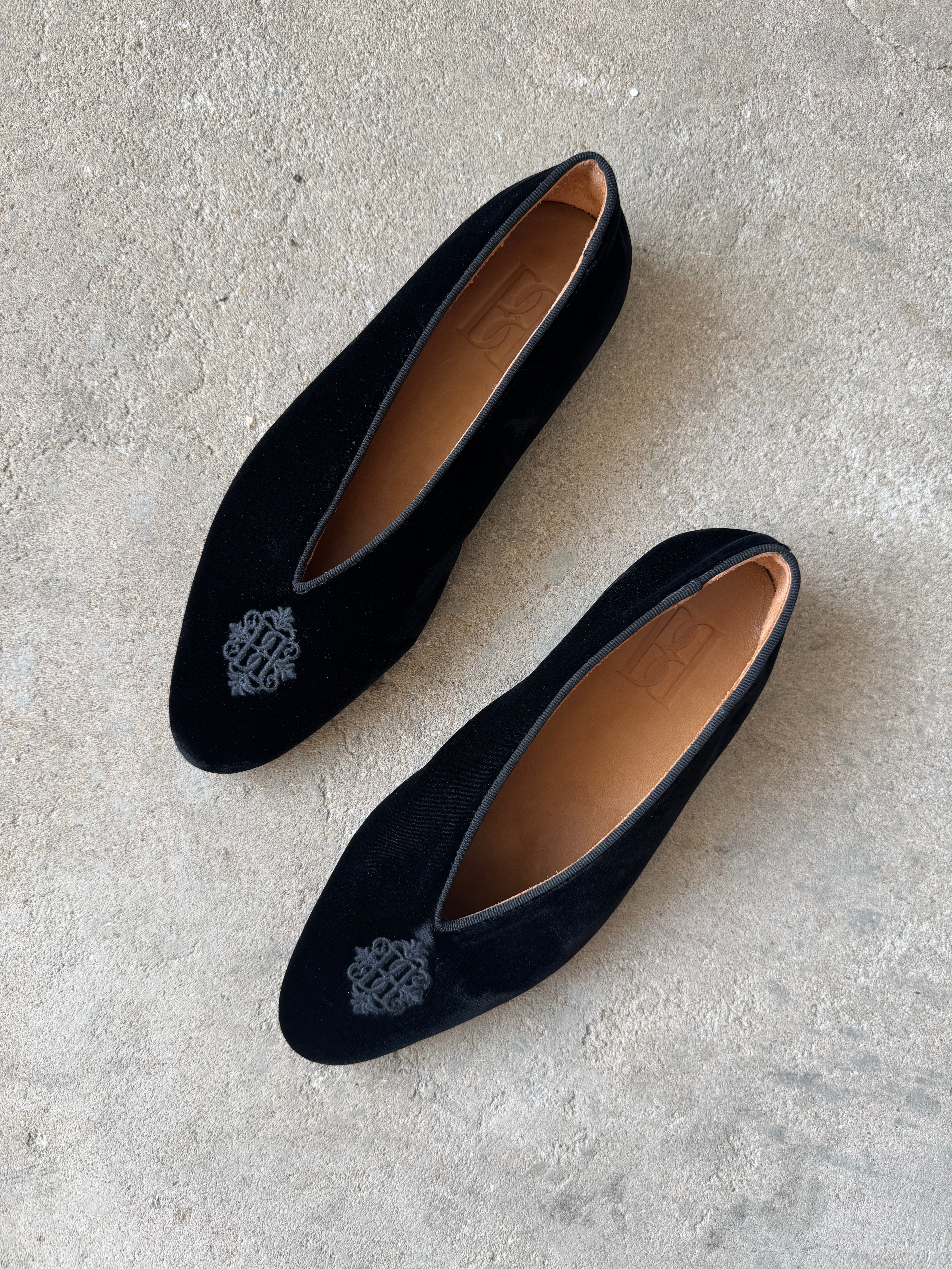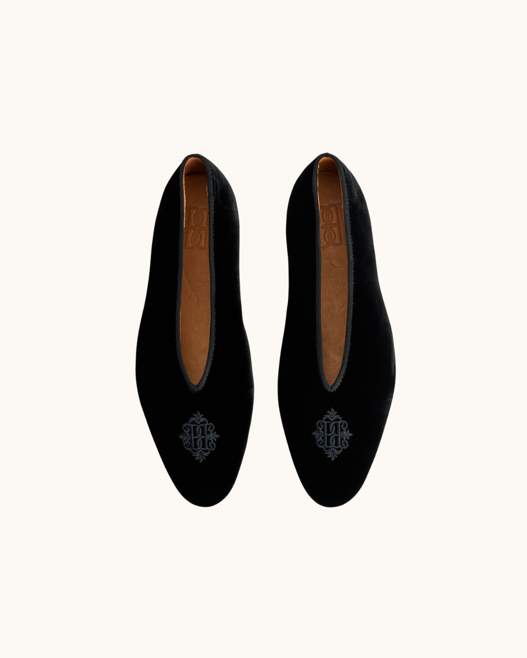 "A new take on the ballerina, the Ayda flats are made from soft velvet with an embroidered monogram on its front. The louche design sits on a flat heel and slips right on."