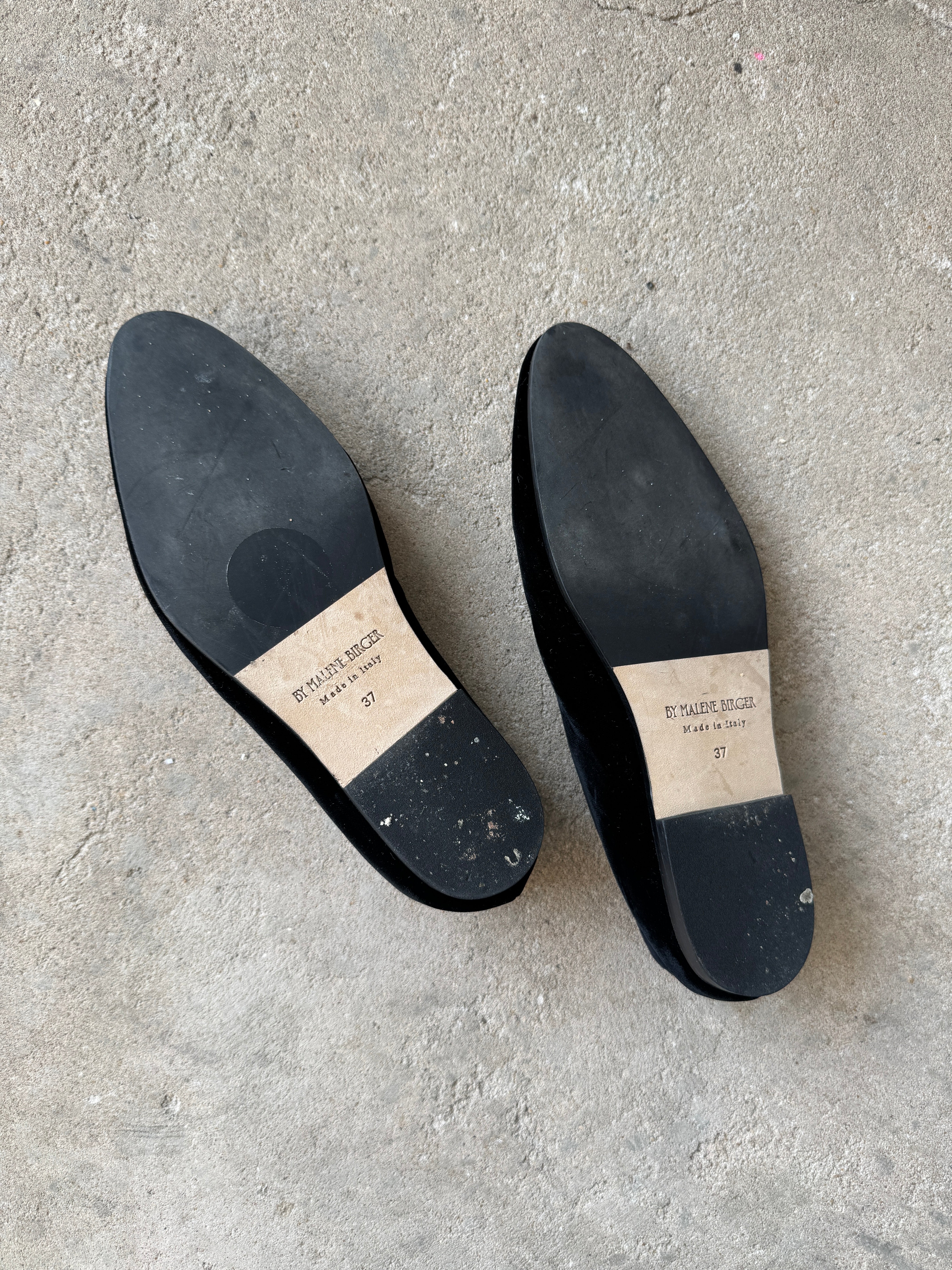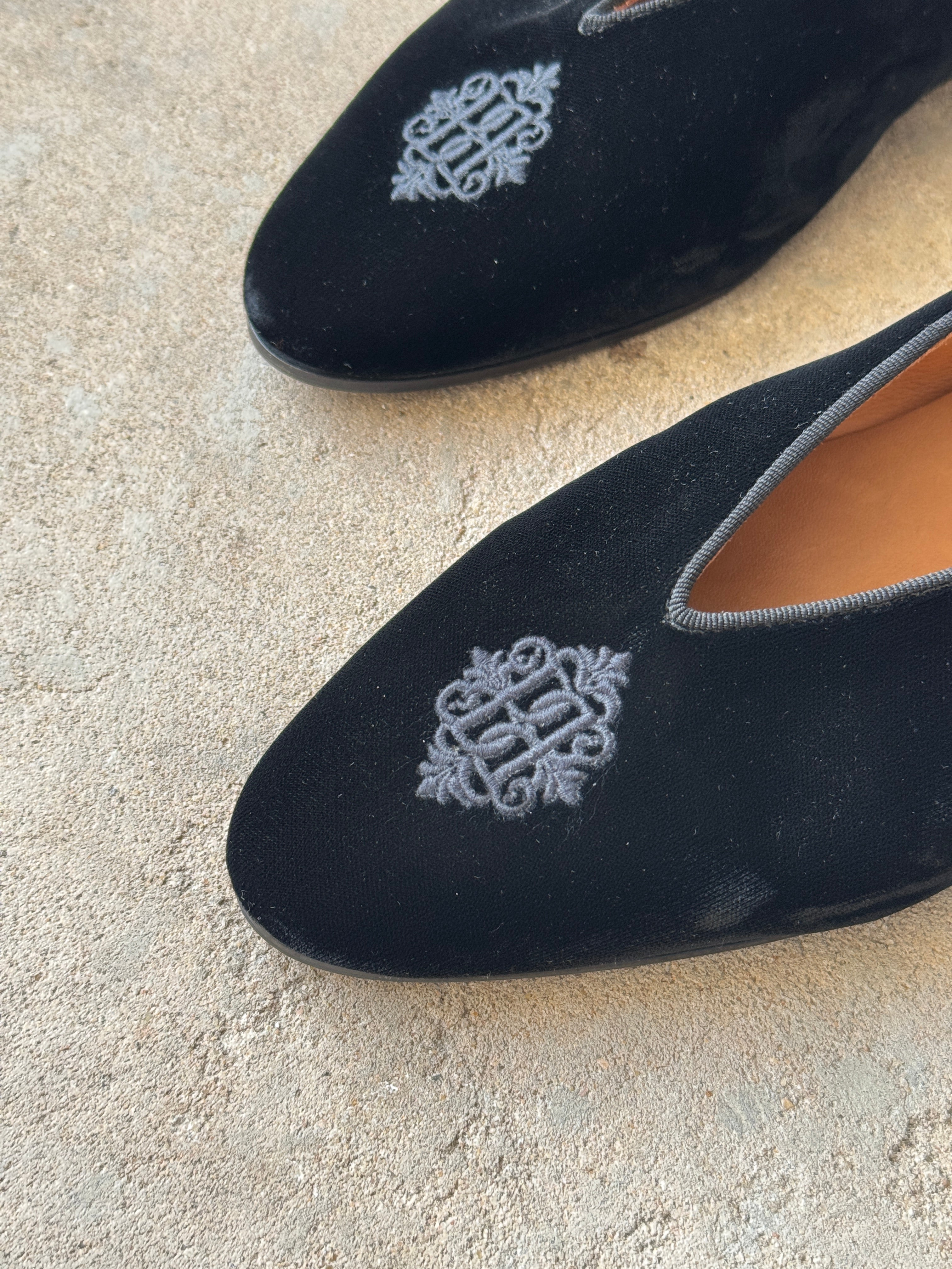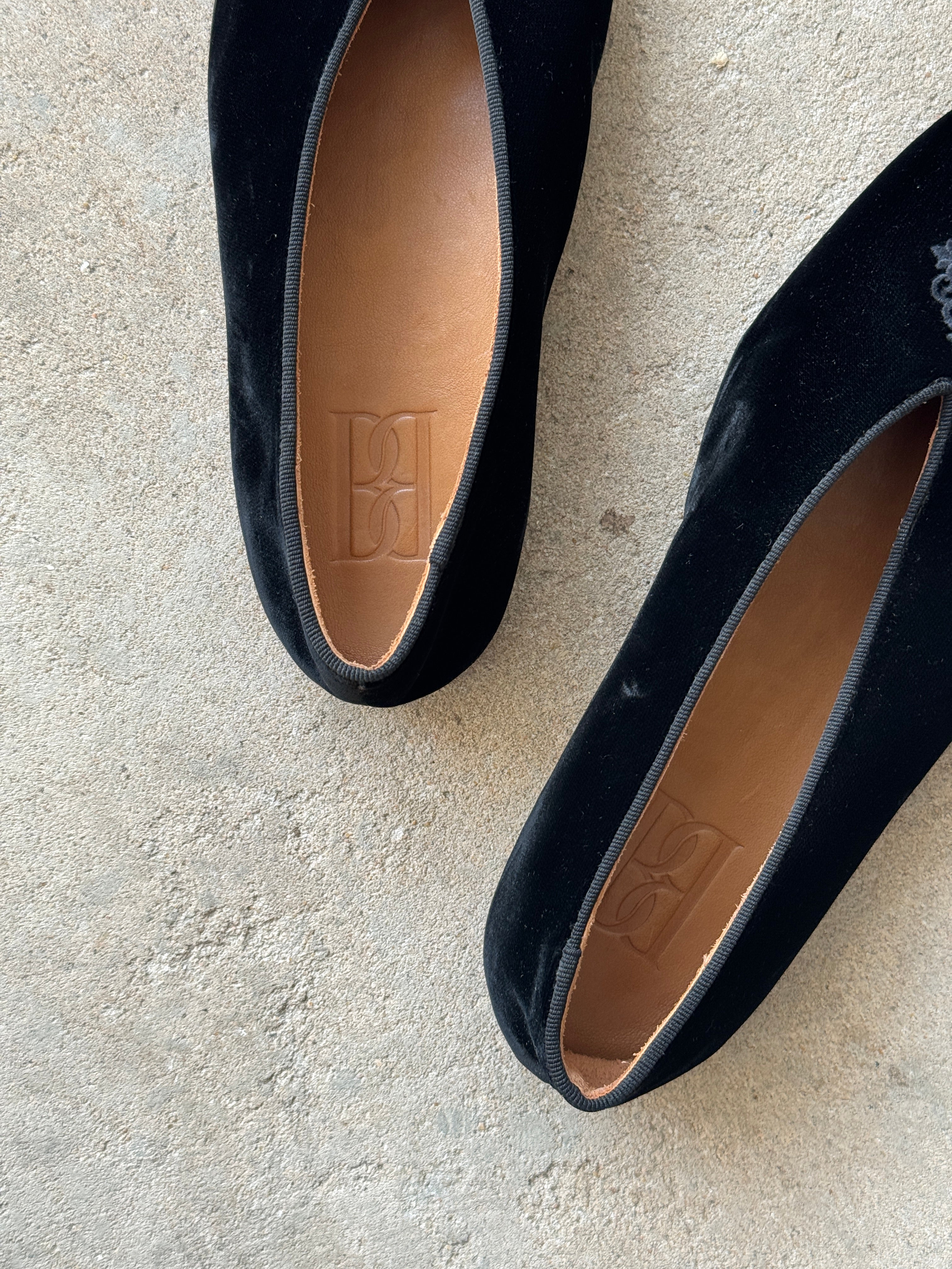 "A new take on the ballerina, the Ayda flats are made from soft velvet with an embroidered monogram on its front. The louche design sits on a flat heel and slips right on."