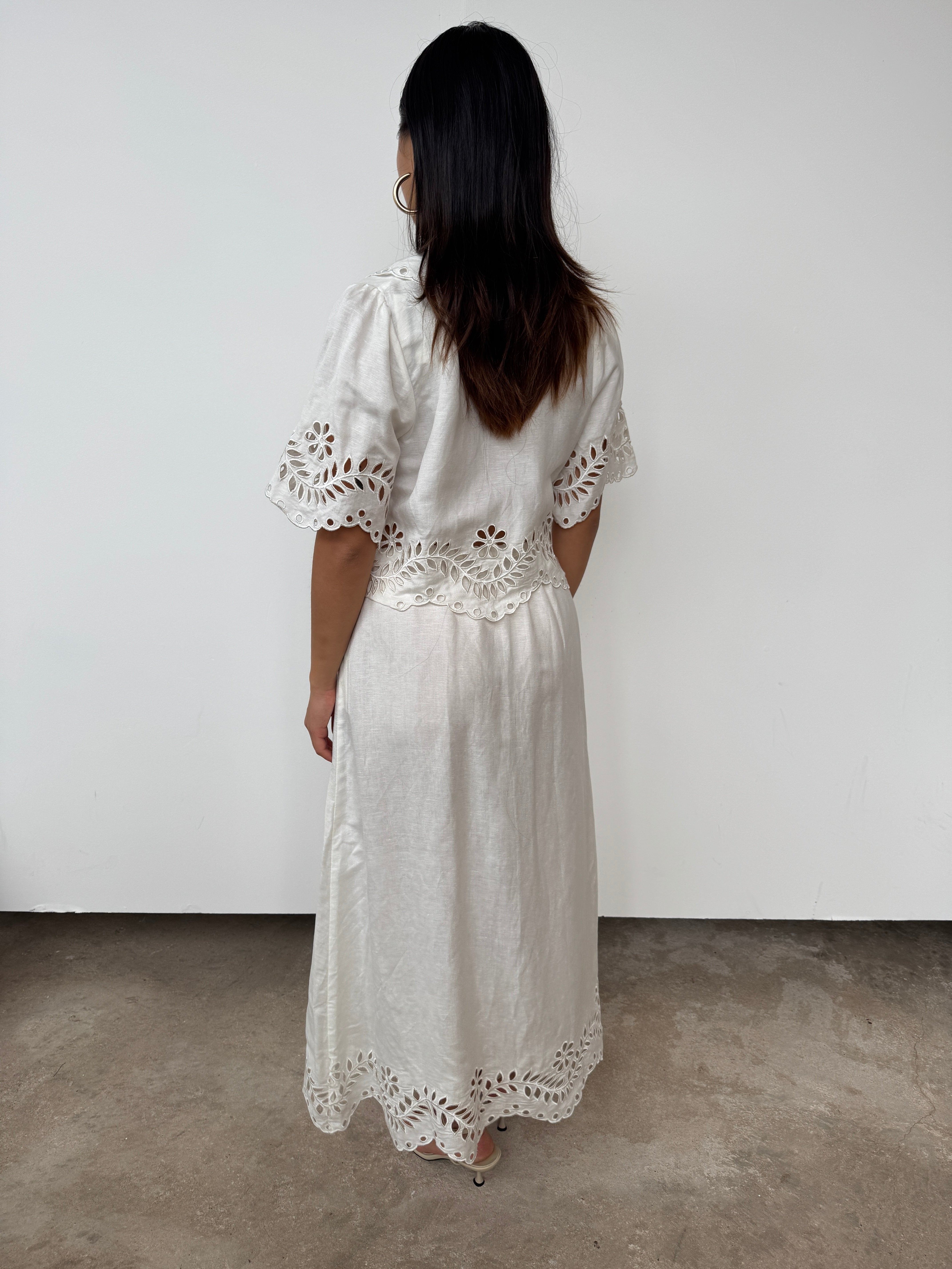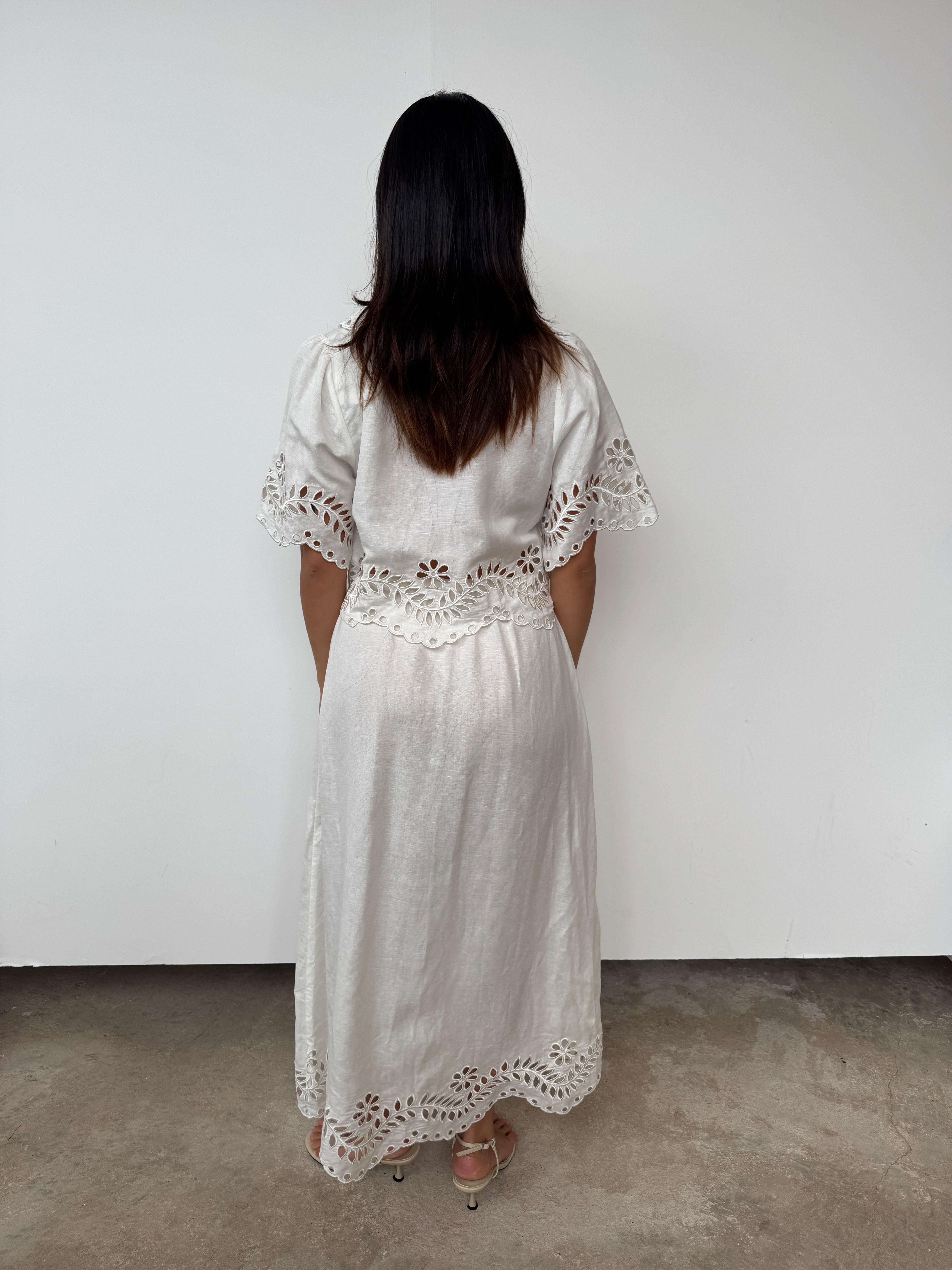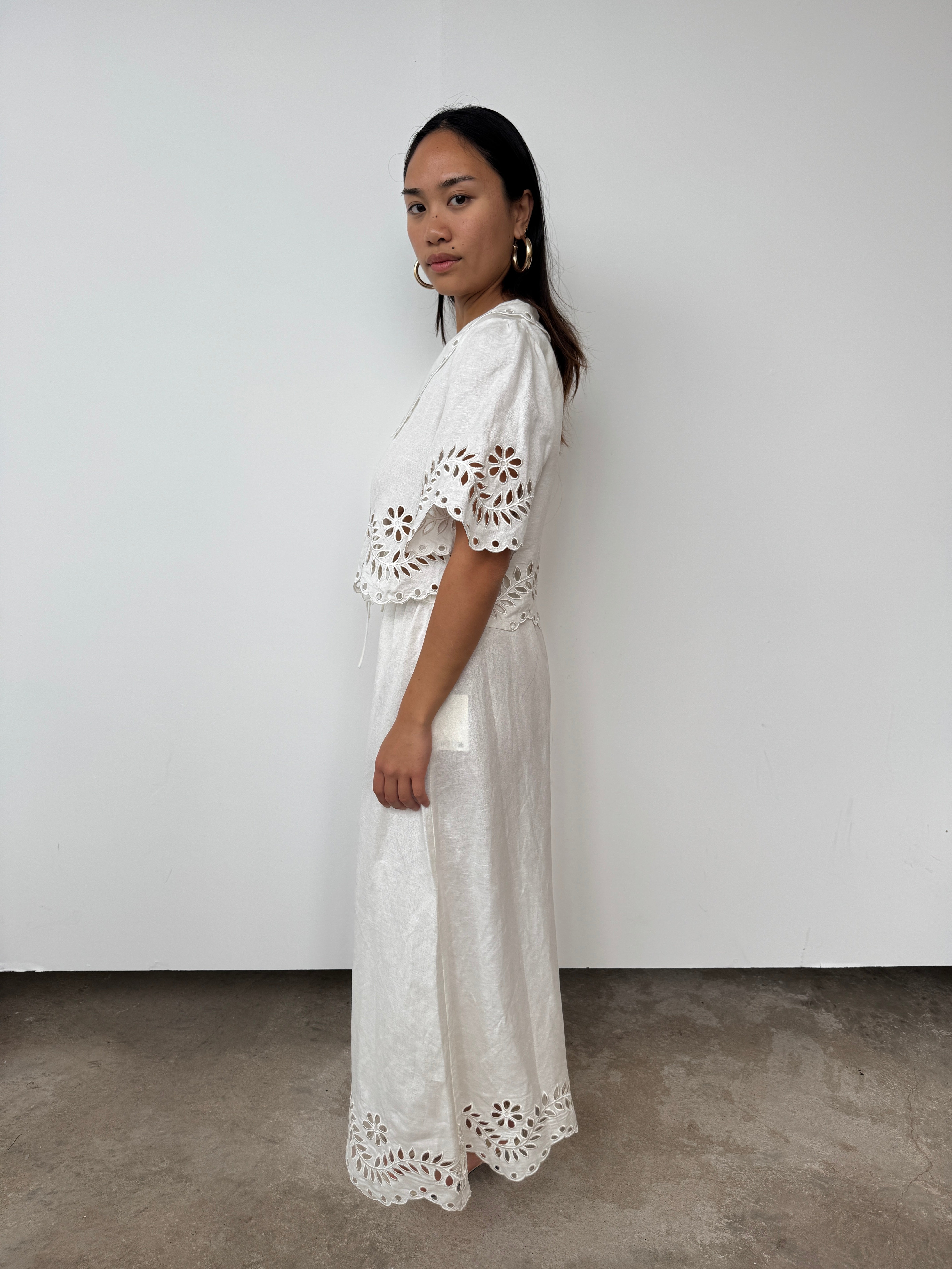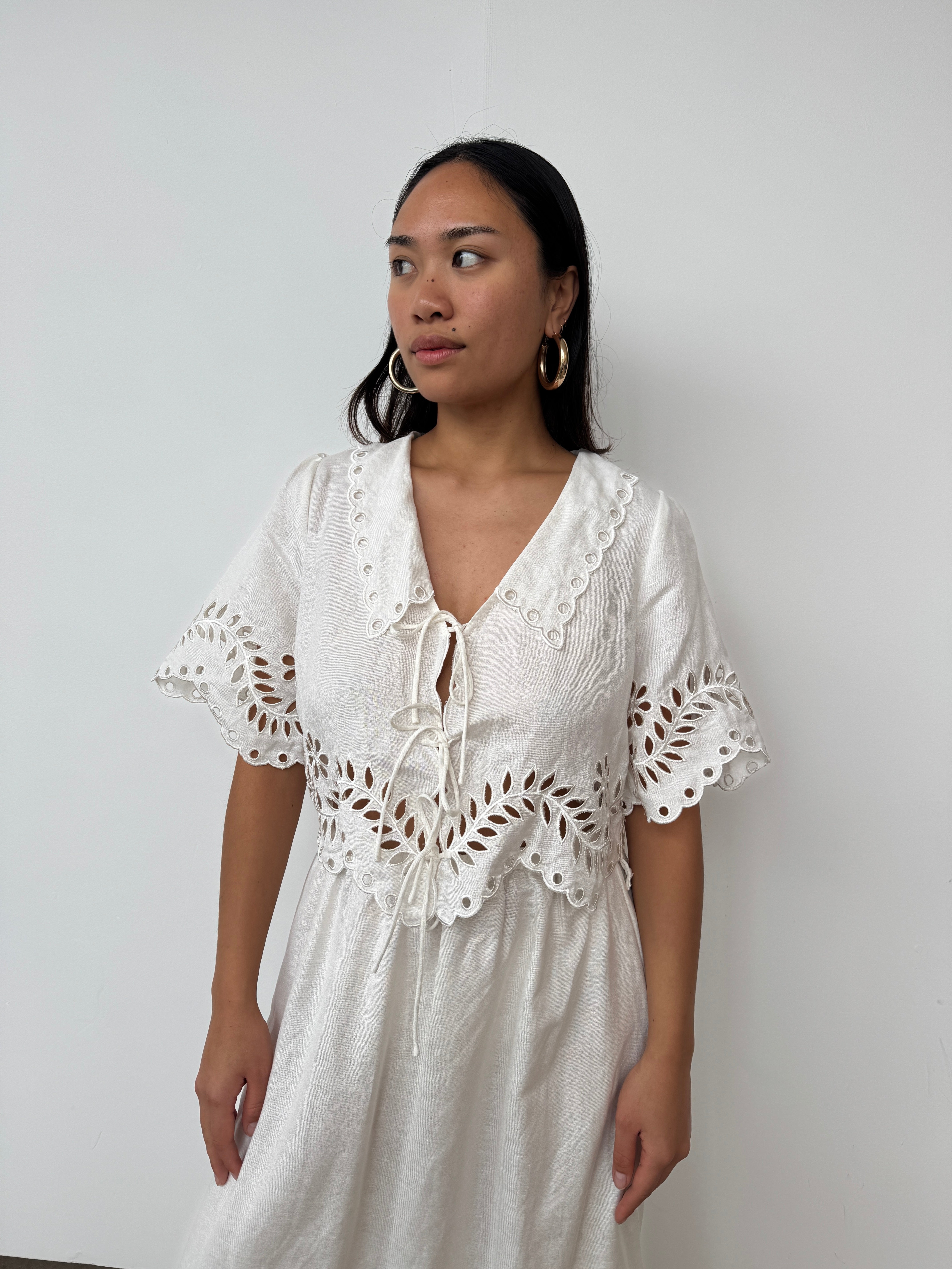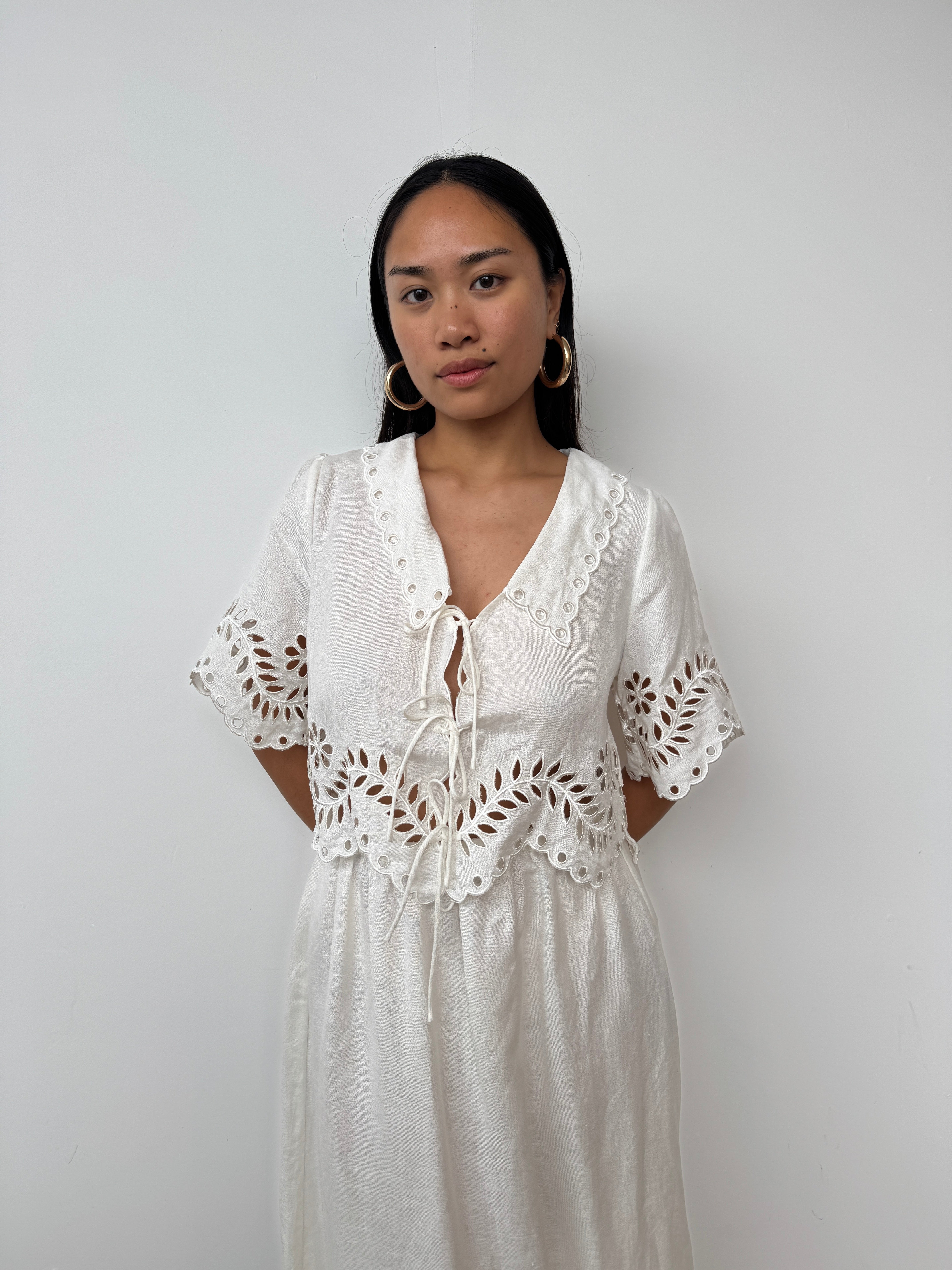 Malina Cream Estela Broderie-Anglaise Short-Sleeve Linen-Blend Blouse | UK10